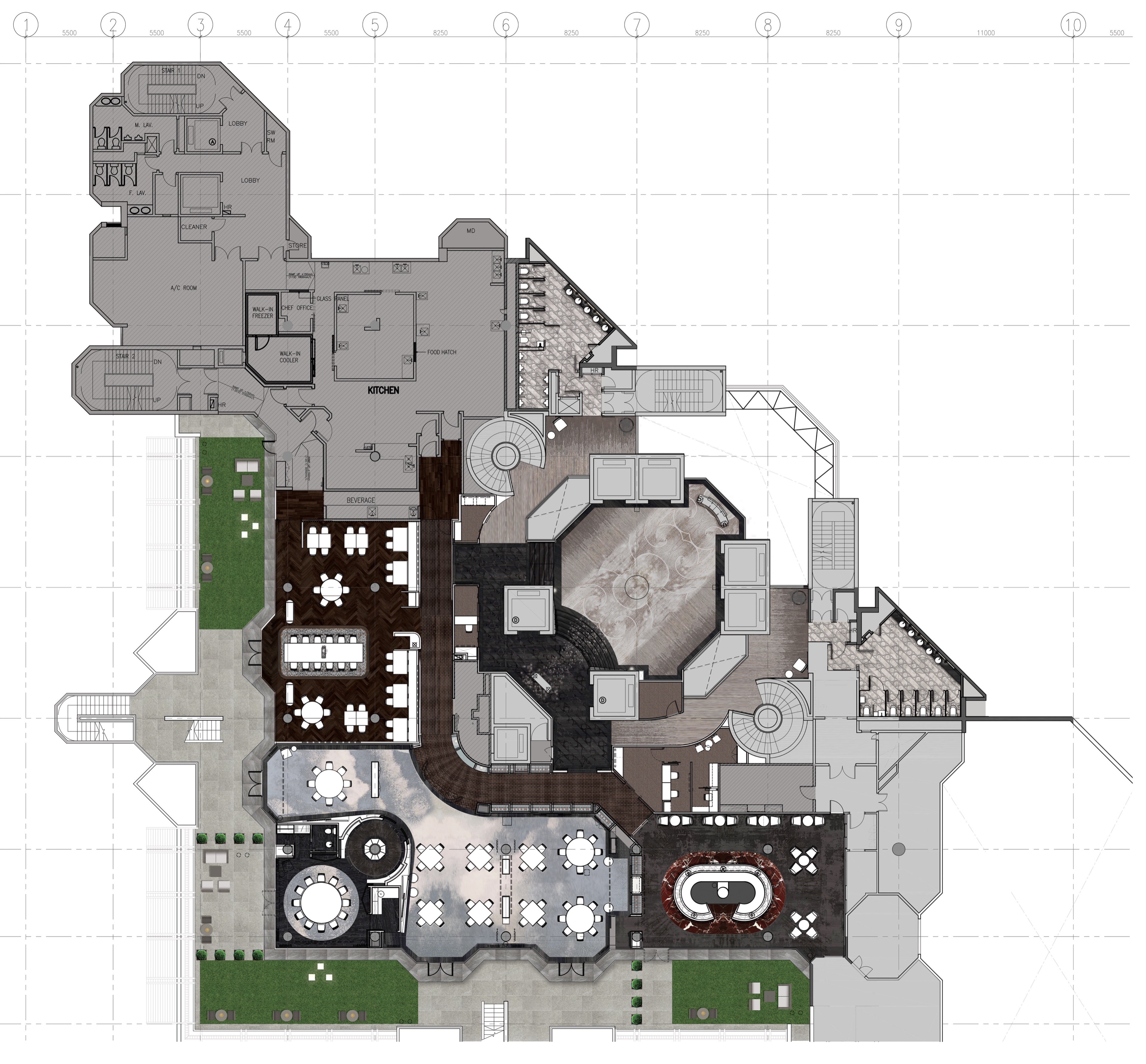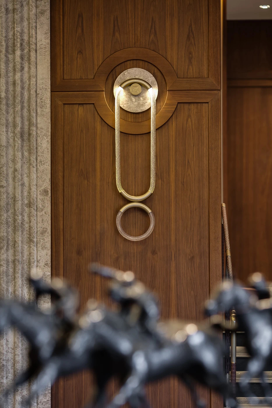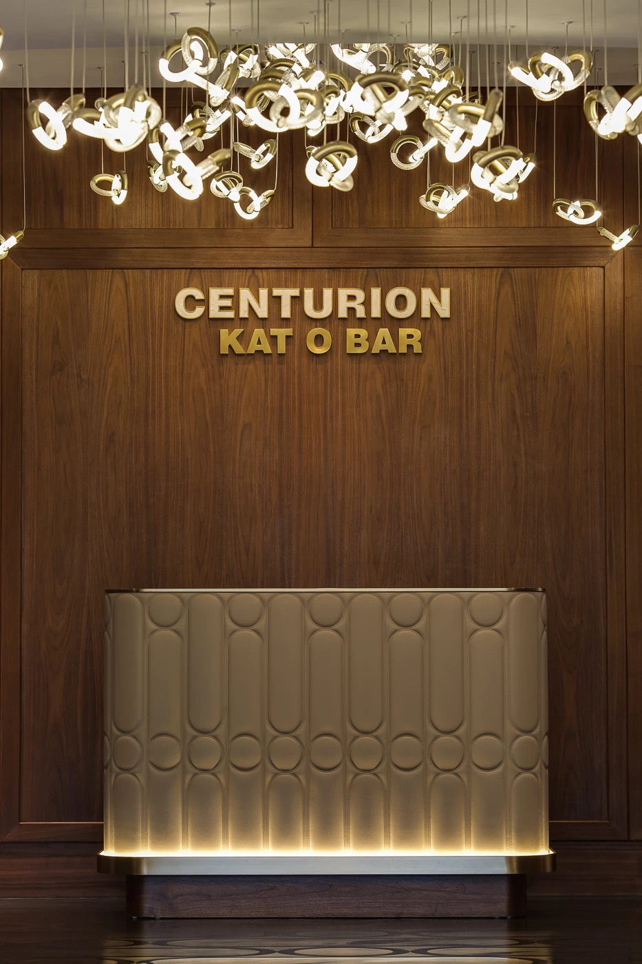 空间意境:1980 年代的傳奇名句駒 Rive Verdon(翠河)的馬主在沙田馬厩上掛上銅錢,以寓意著好運與勝利,而這個傳統幫助到我們的設計師發揮想像力,經過現代化的改造,「銅錢」元素貫穿了所有餐飲和娛樂區的設計—— 包括燈飾、把手,甚至牆壁和地板圖案。