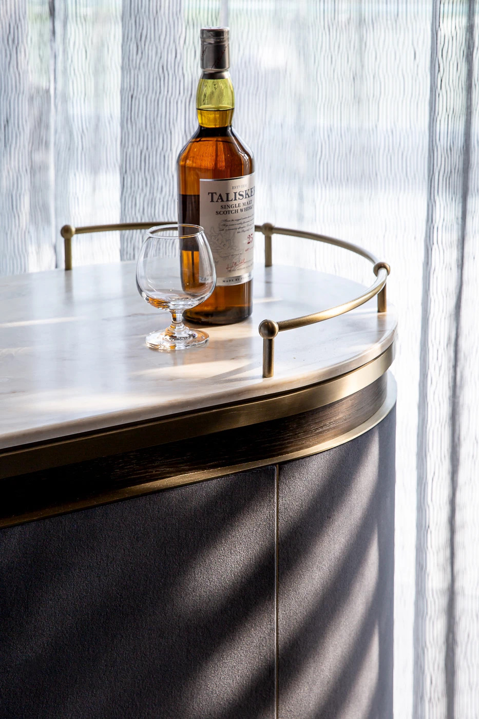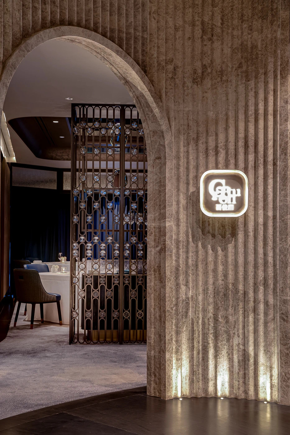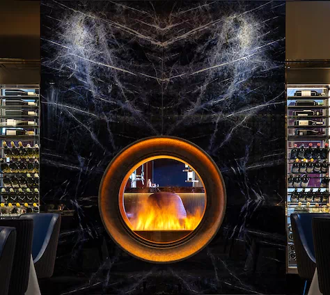 以「景泰藍」大理石襯托的火爐設計,雖然分隔了 “吉澳吧” 與“百俊閣”兩個截然不同的空間,但圓形通透的火爐,又令兩個空間巧妙地連接在了一起,渾然天成。