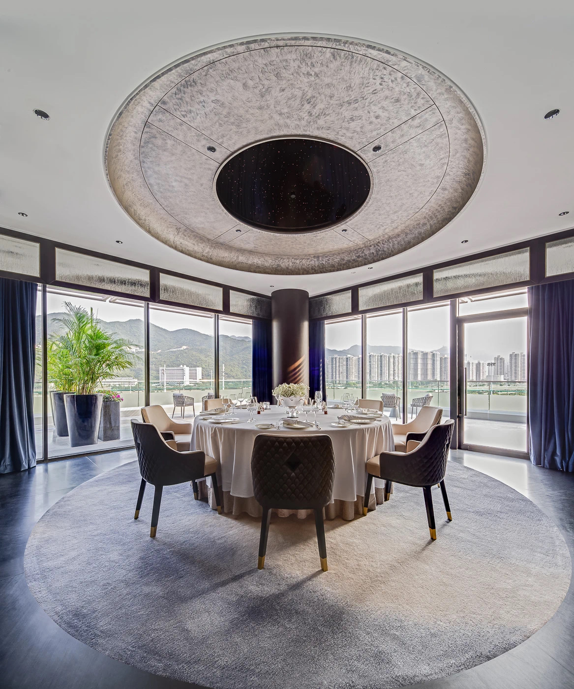 “百俊閣” 主調為藍色,隱藏式頂燈的設計利用了無數光纖與鏡面反射的效果,制造出了猶如星空般燦爛又深邃的天花頂燈。而天花的平頂處又完美隱藏了升降電視——非賽馬日時,這里猶如星空下浪漫又夢幻的世界;而賽馬日時,即便電視下降,天花頂燈的燈光都絕不會影響賓客觀看電視的效果。