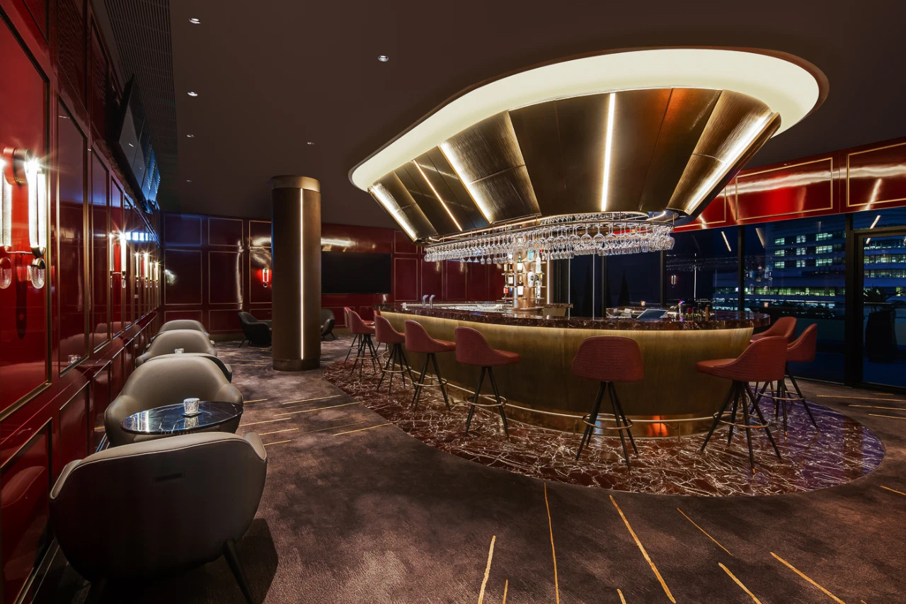 设计选材:设计师从大量吸音材料的运用及其他装饰物料的细节令此空间的回音大幅减小,宾客们无需大声讲话便能非常清晰地听到对方音量,同时亦不会被其他宾客打扰。这里无疑为成为了一处集聚兴奋、期待、而又不失格局的现代又时尚的空间。