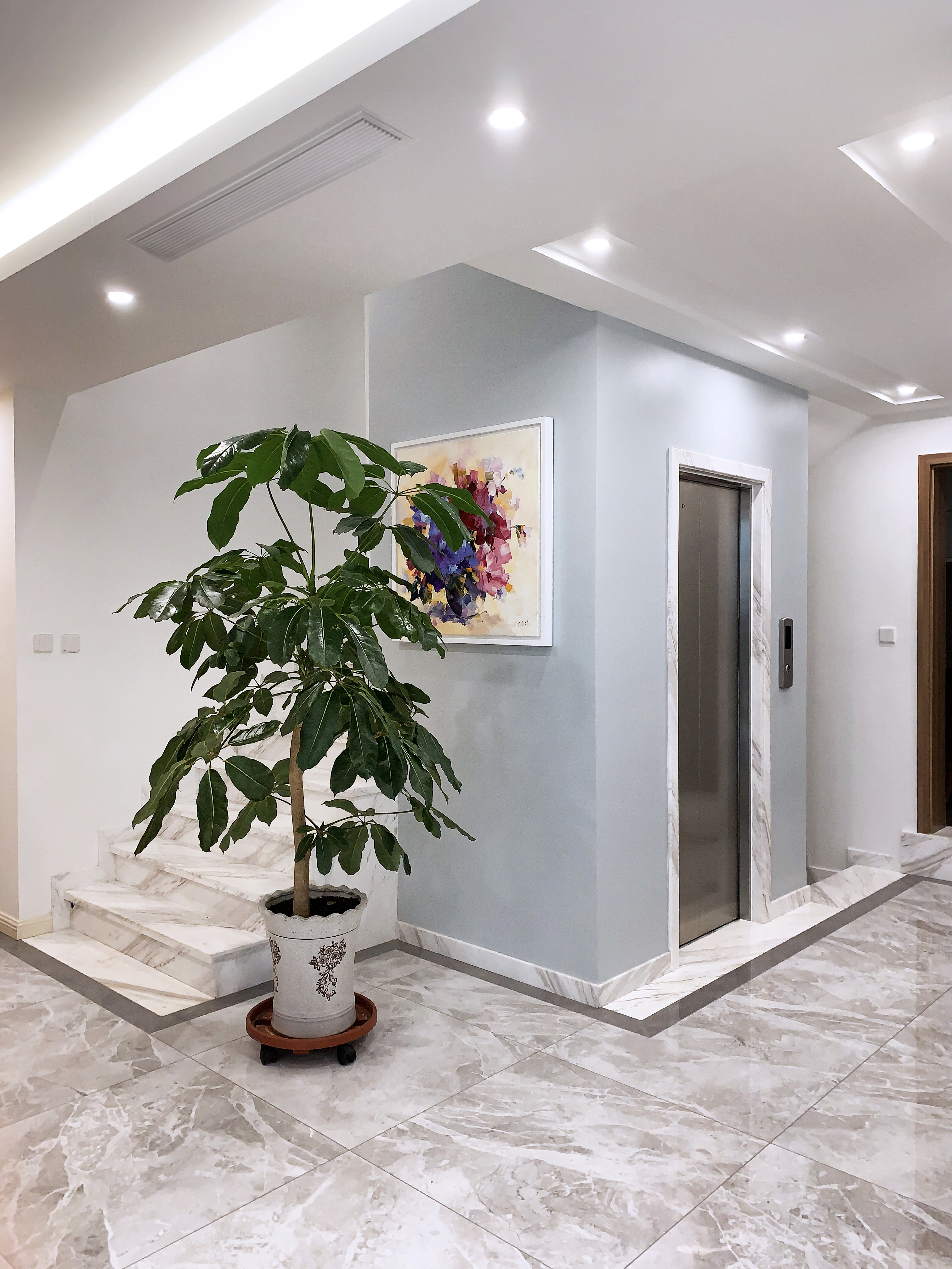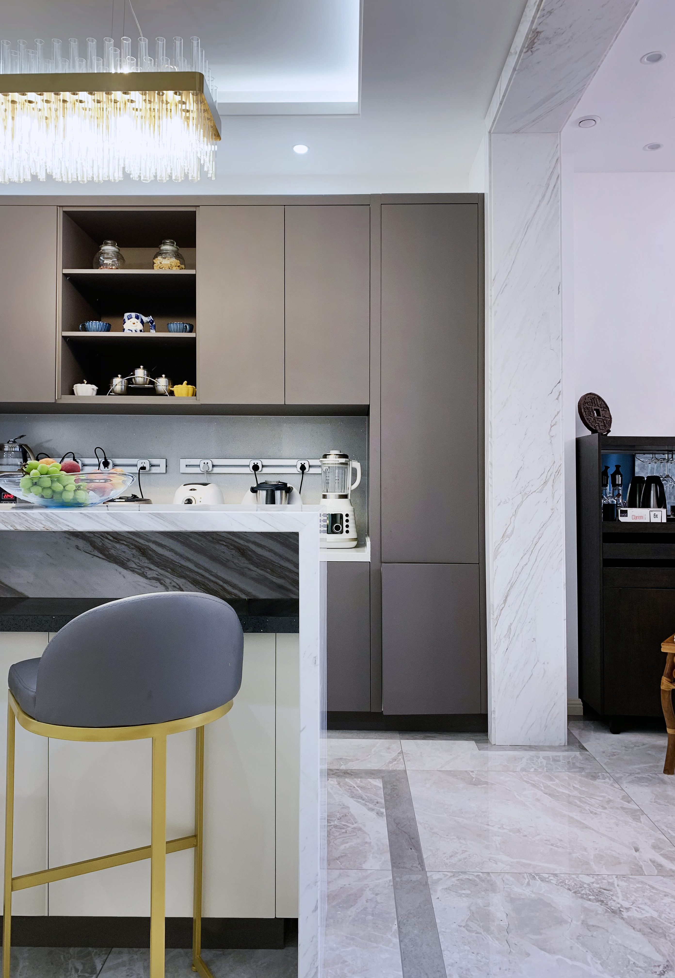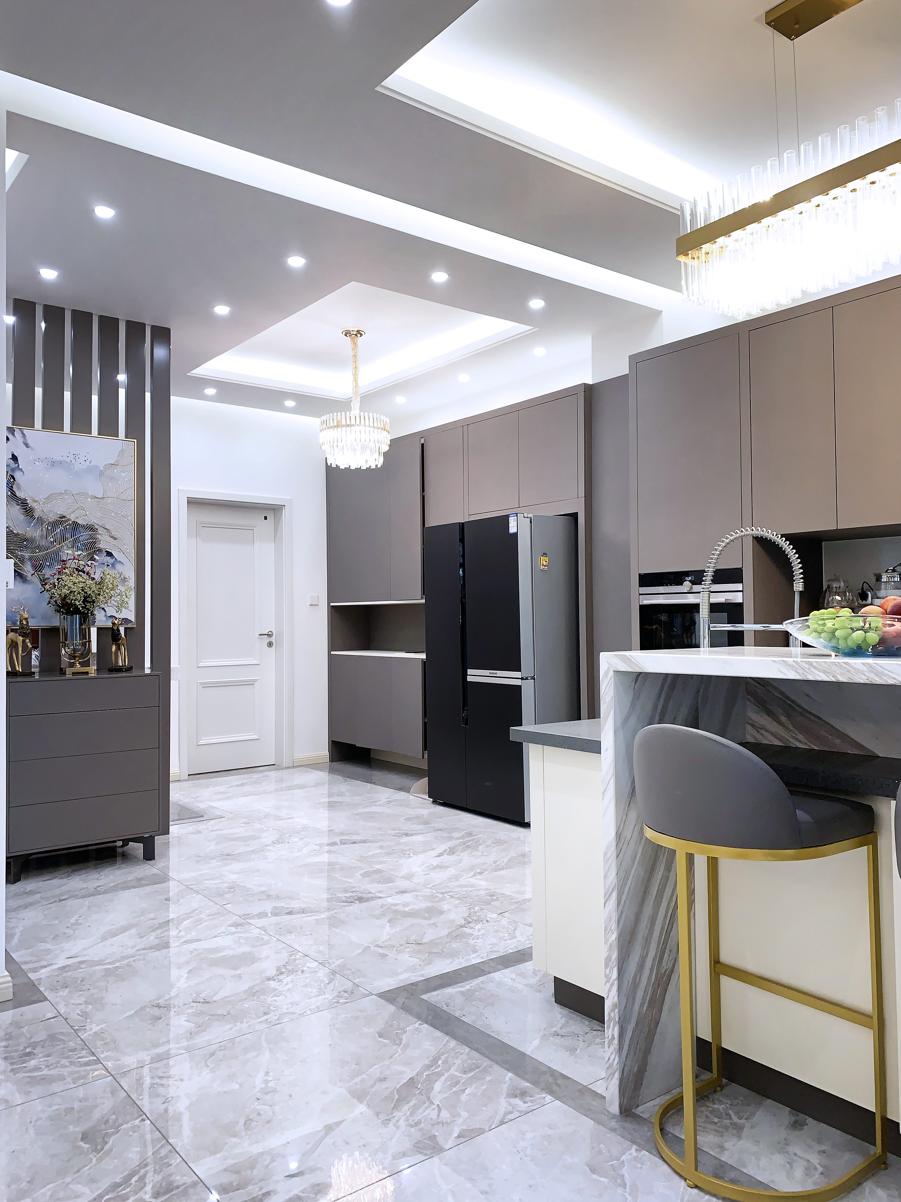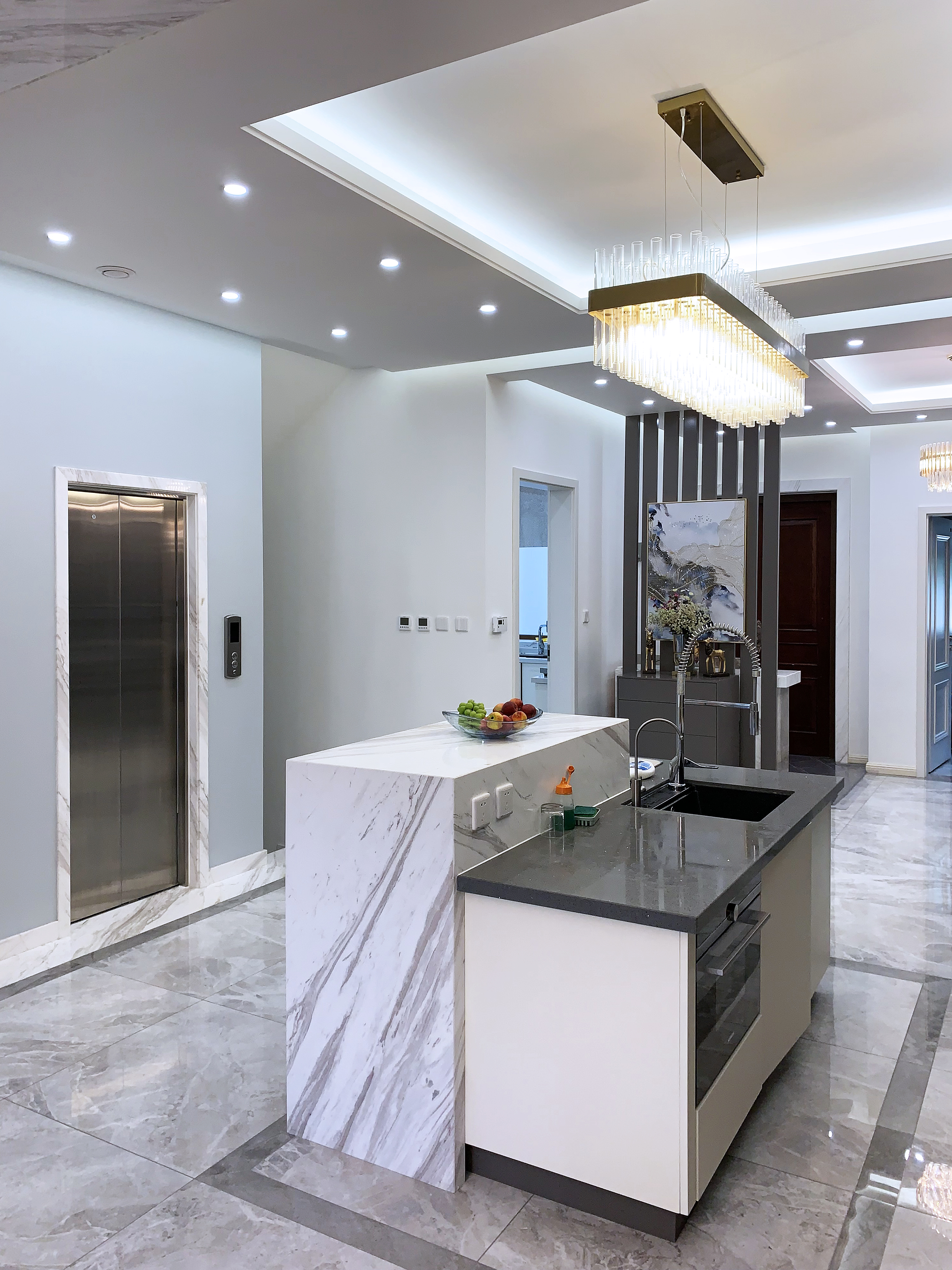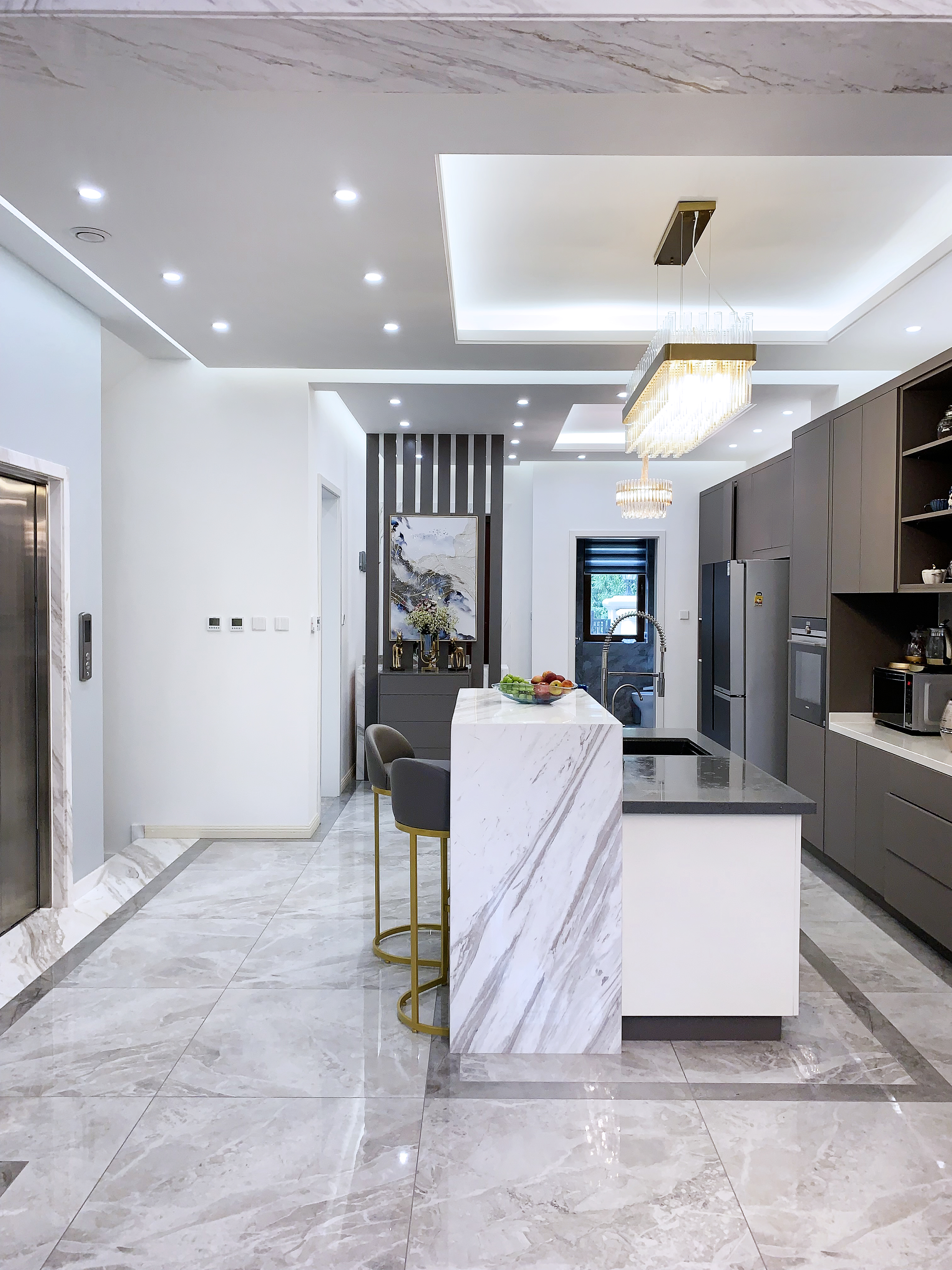 空间意境:风格上采用“大道至简”的意向,色彩上仅用白色的石材,灰色的家具,木色的空间分割出生活区和会客区的层次。