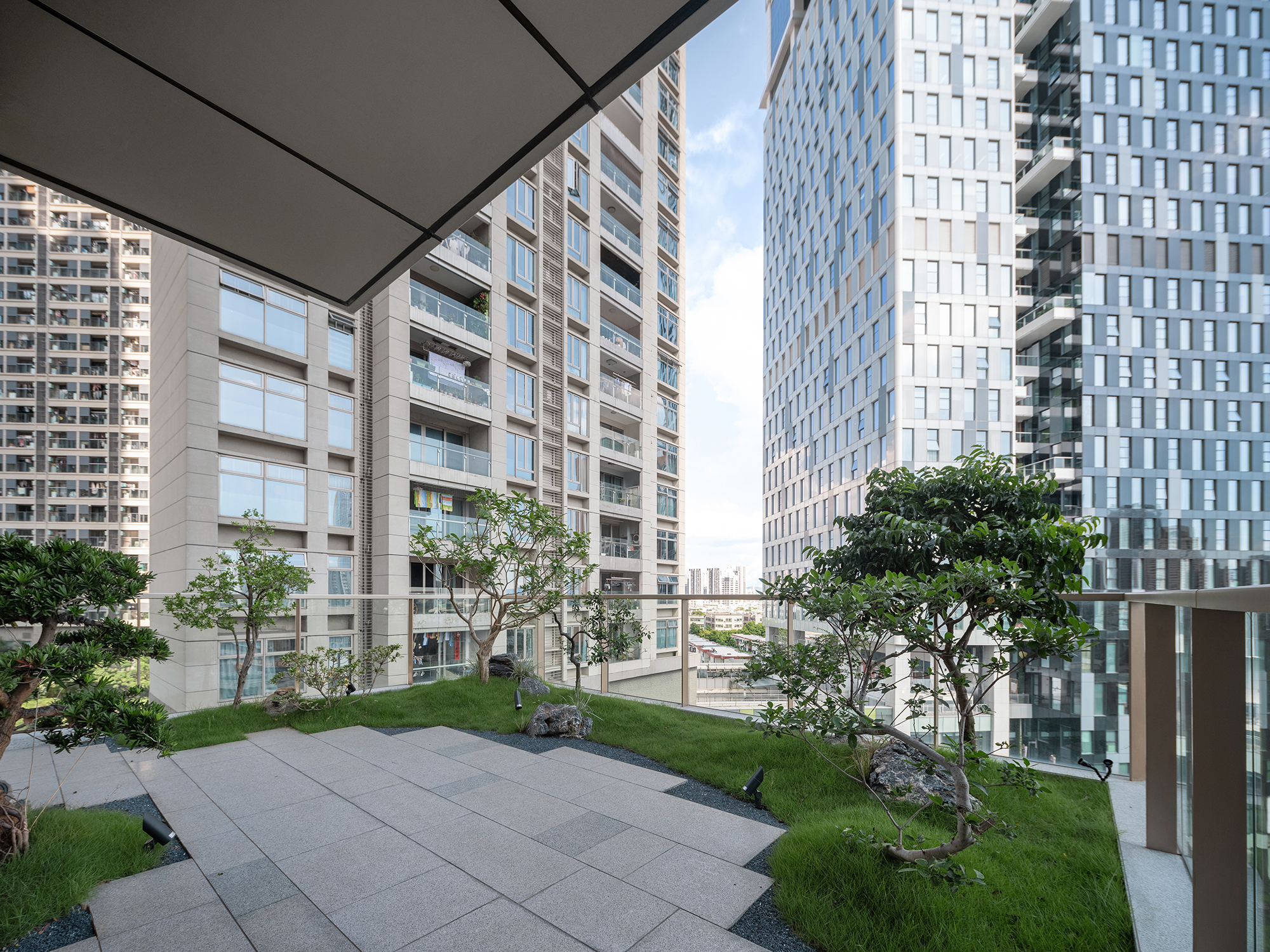 露台是最亲近大自然的部分。硬化的铺设和松散的砾石之间,是「 克制 」与「 自然 」的碰撞。
