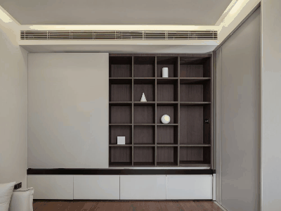从客厅一直延伸至玄关、西厨、走廊的一体式背景墙隐藏了多个秘密——一个书房空间、几处小物品收纳柜、步入式玄关鞋帽间等等,特别是隐藏式联动升降的观影设备,无疑是技术控的心头好。