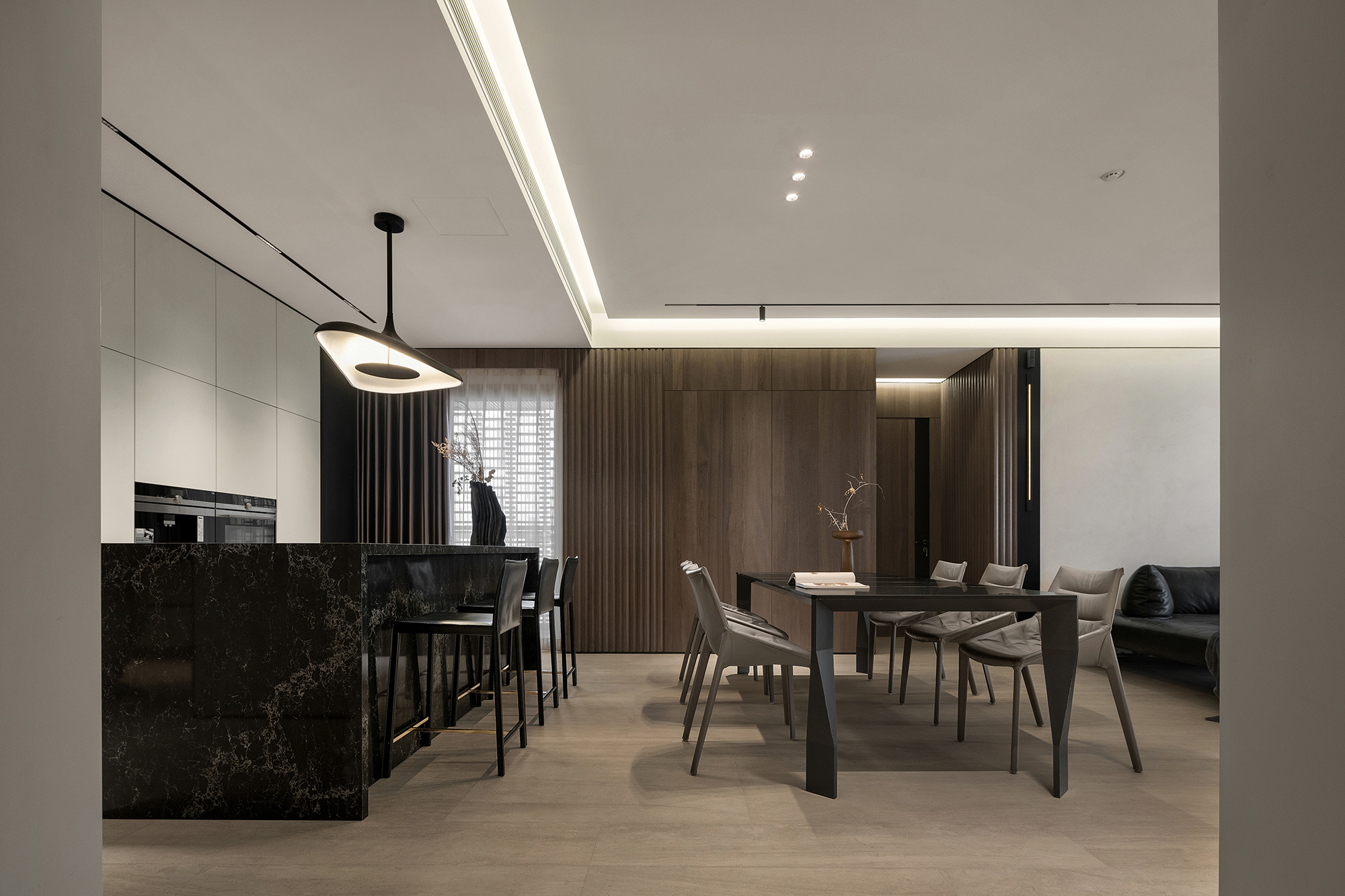 这是我们第二次为这位客户设计他的家。由于客户是建筑学出身,所以他的喜好以及作品都带着严谨的气质。「 克制 」是这个家的设计特质,在严谨的逻辑之下,将木、石、砂等具有自然感的材质、肌理、纹路都揉和在室内外空间中,以此来延续上一个家的「 理性的温馨 」。