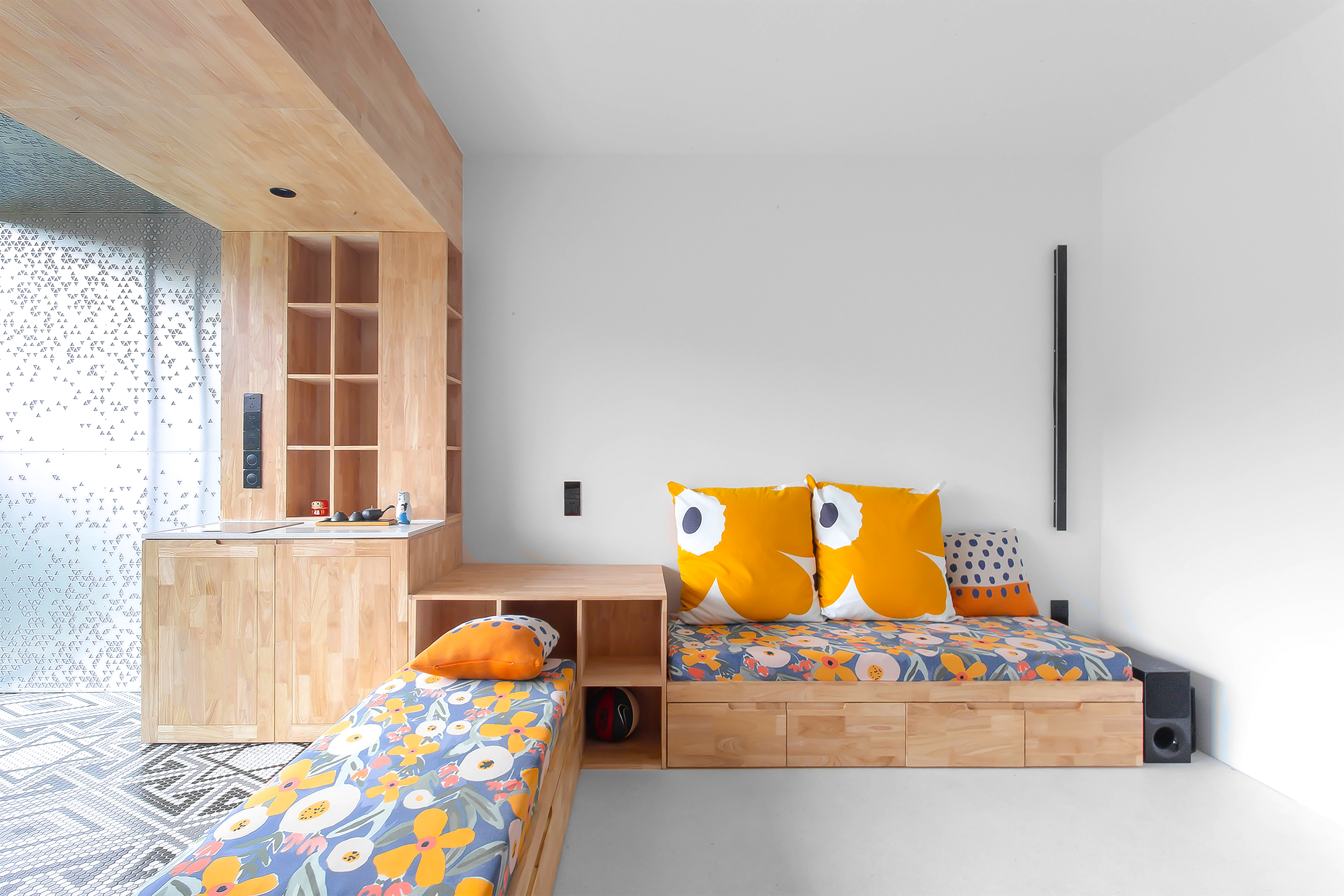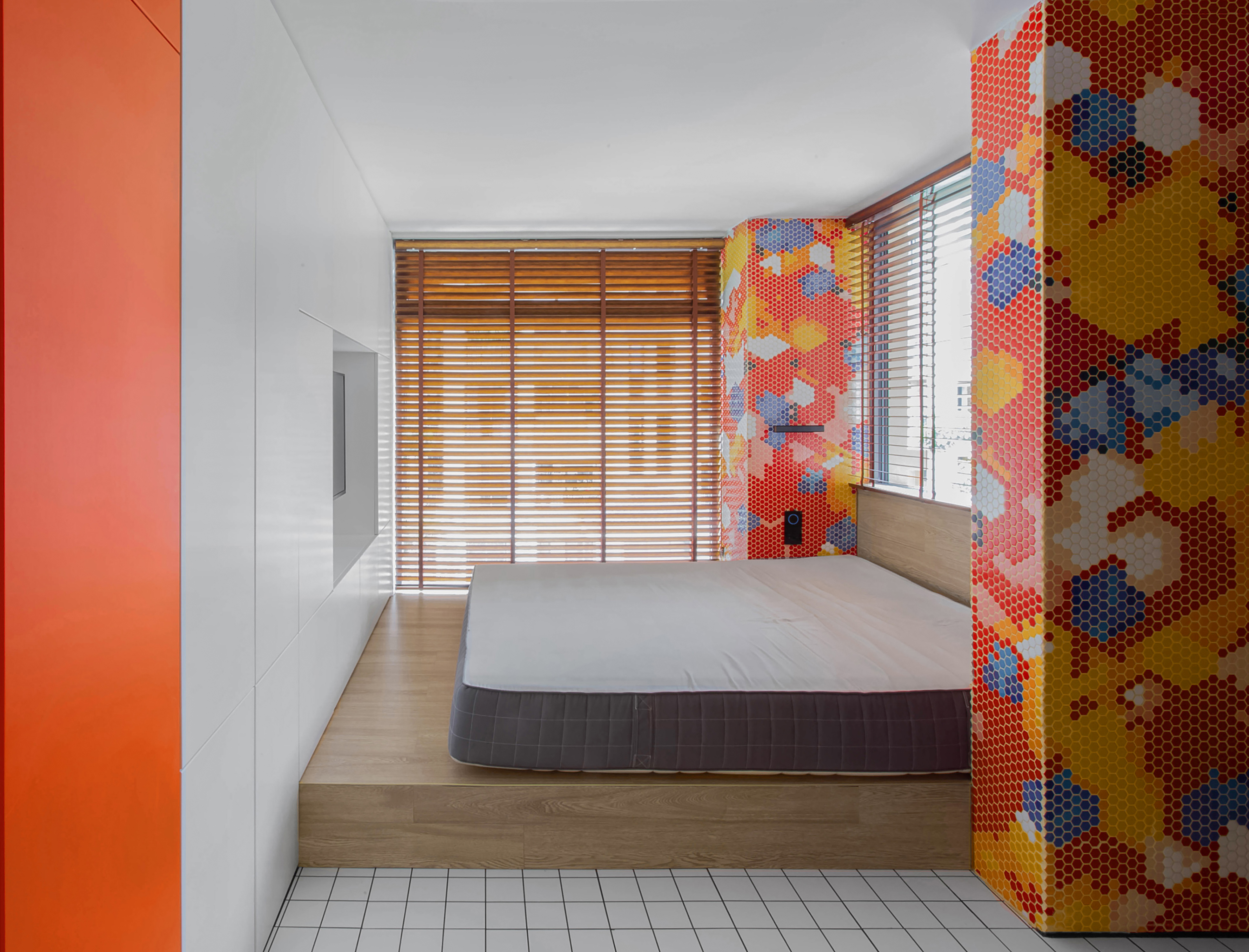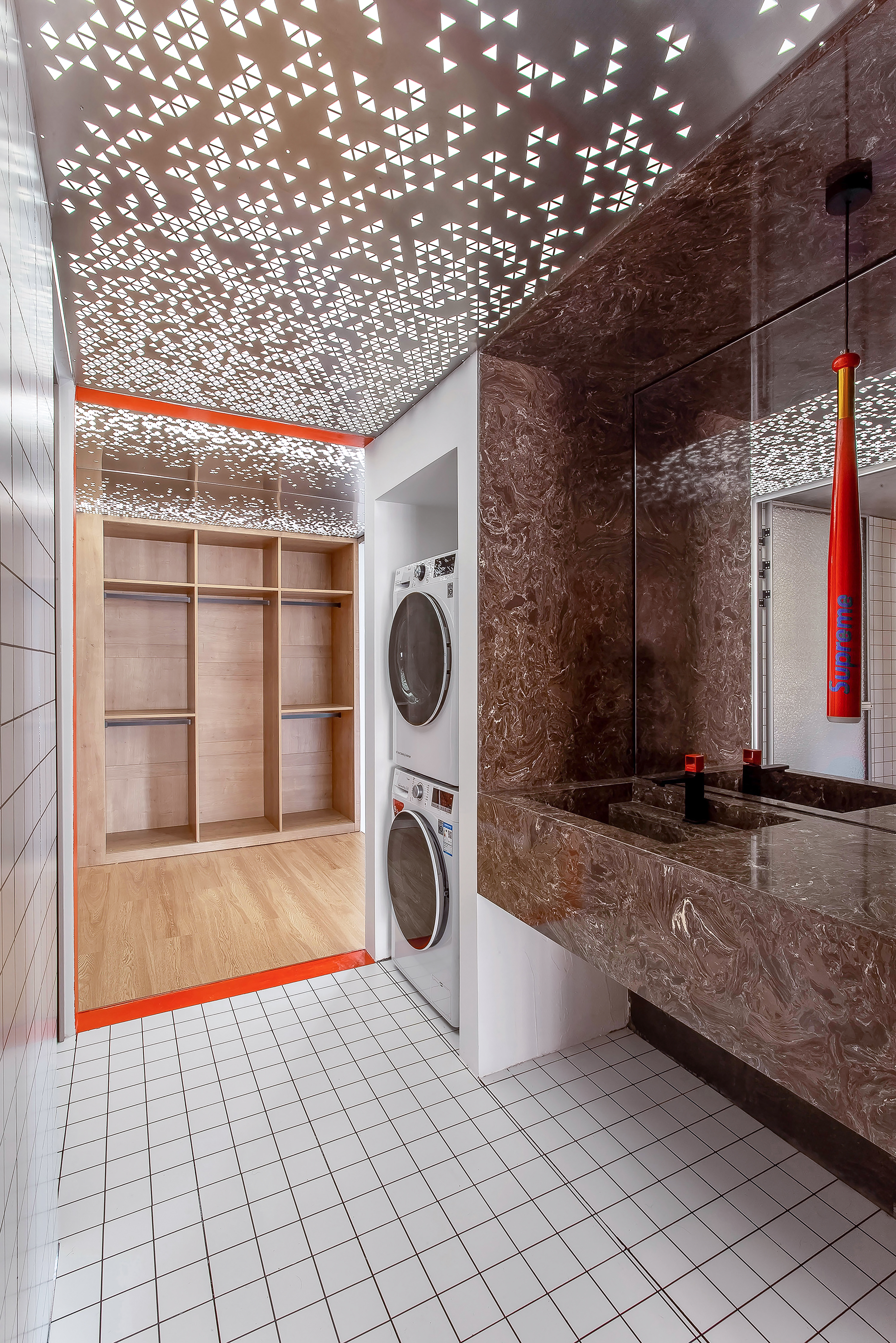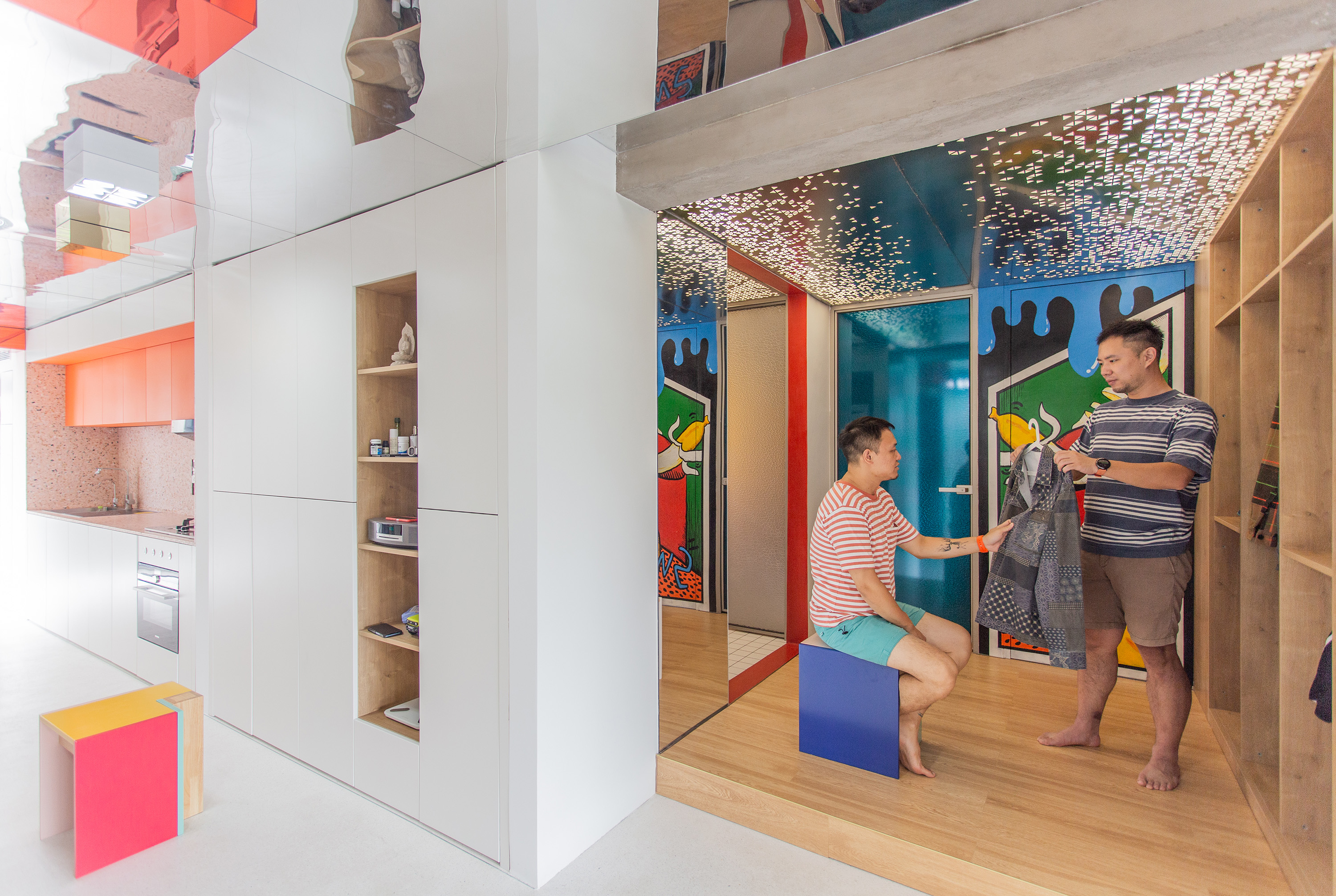 设计选材:运用了大量使用了由不同材质和丰富色彩的搭配成的区块,并配合上波普风格的彩绘,这些活泼和醒目的色彩和材质为居住者提供了丰富的视觉素材,与背景的白色形成较为明显的对比,将这些平凡的日常生活功能区域变得更加的有趣味性,让居住者能够在普通的日常活动中有一个更活跃的生活气氛.
