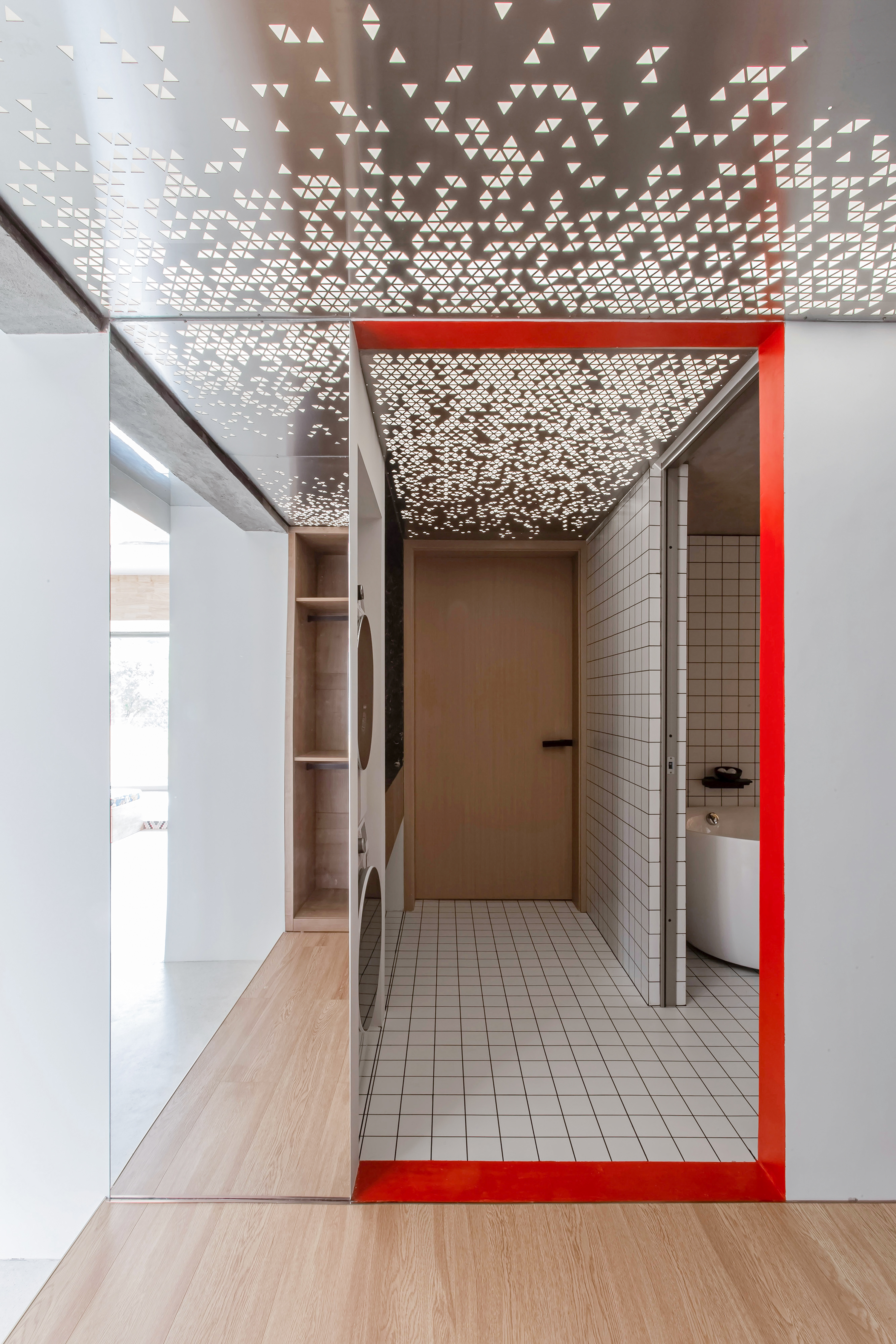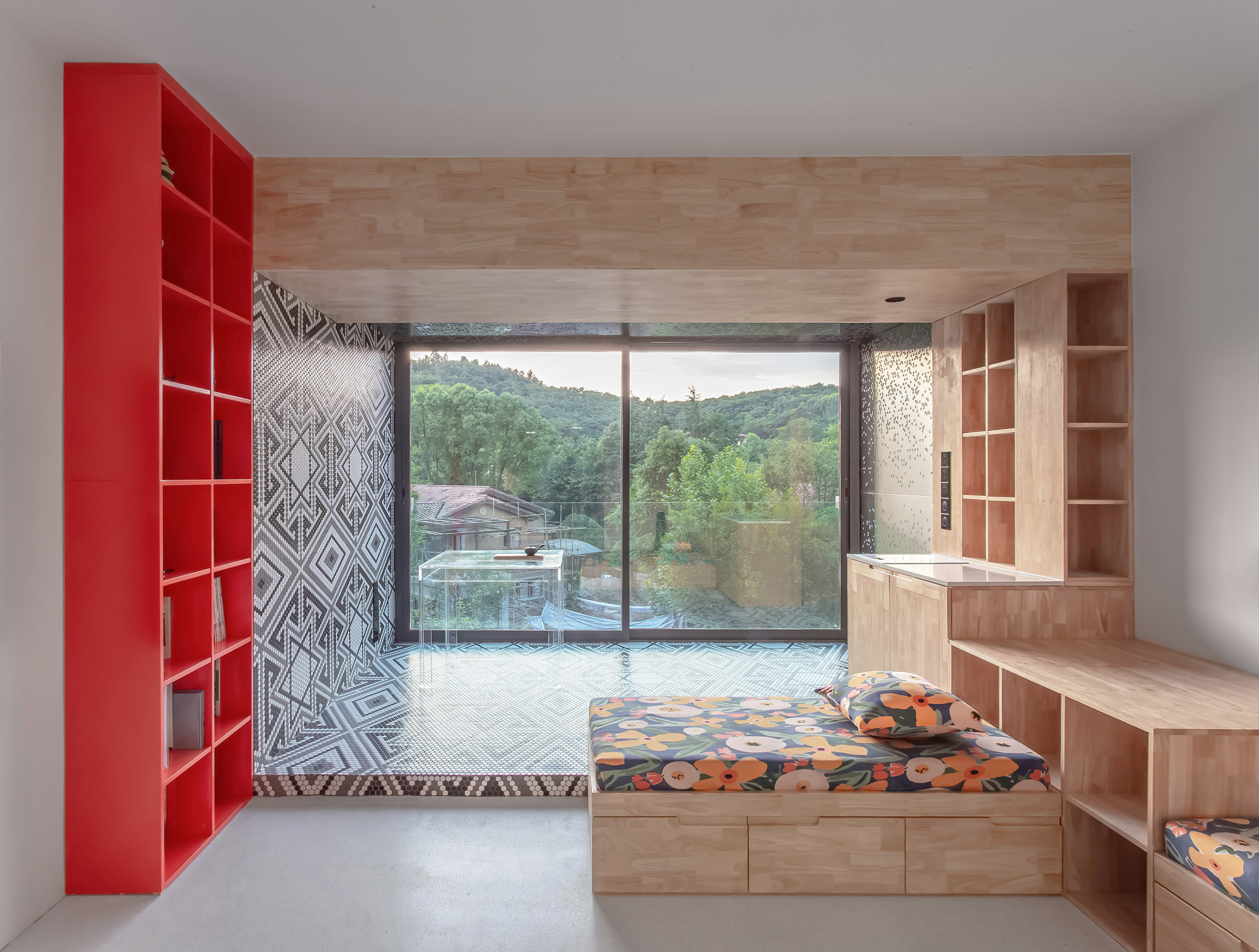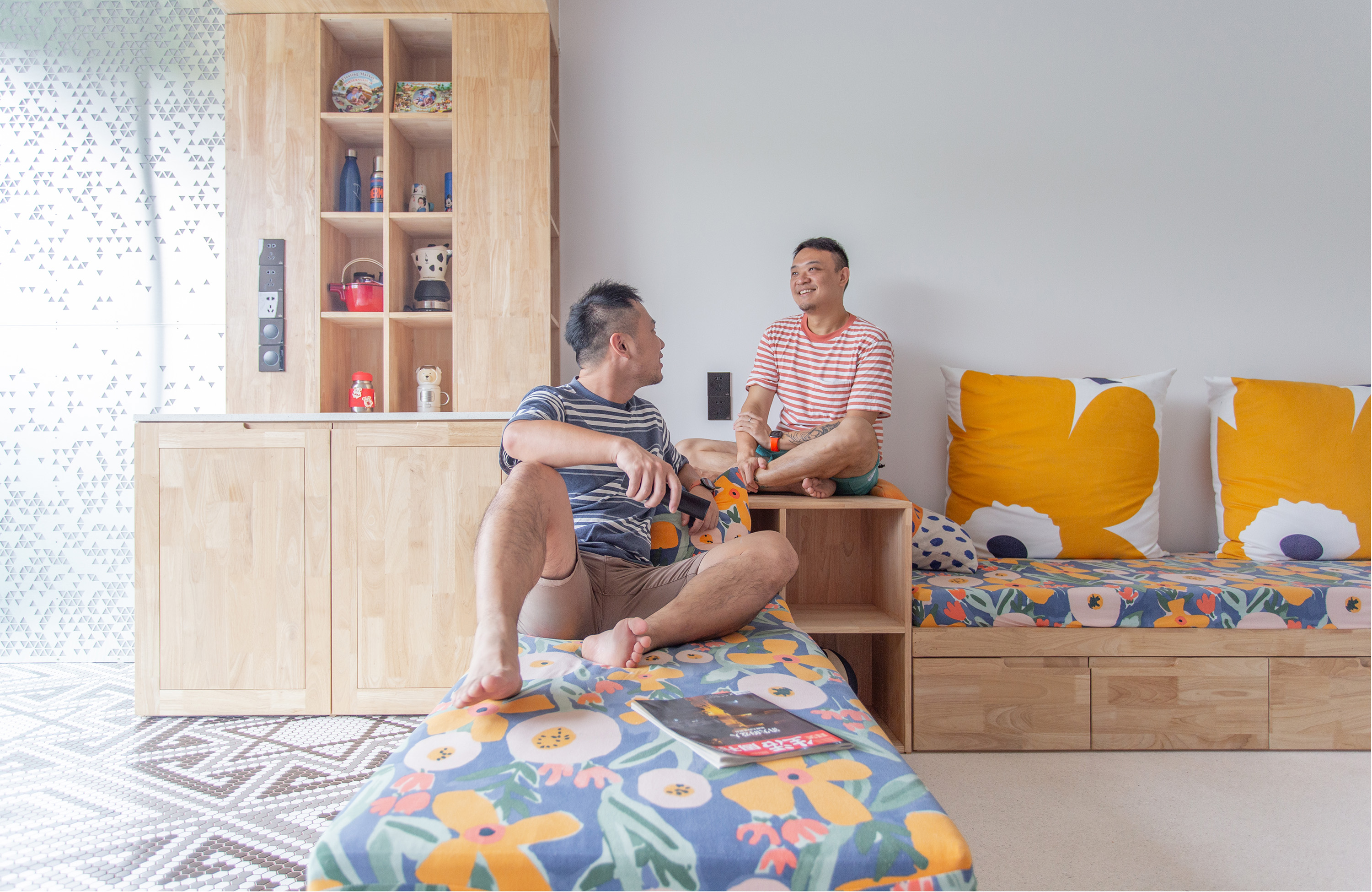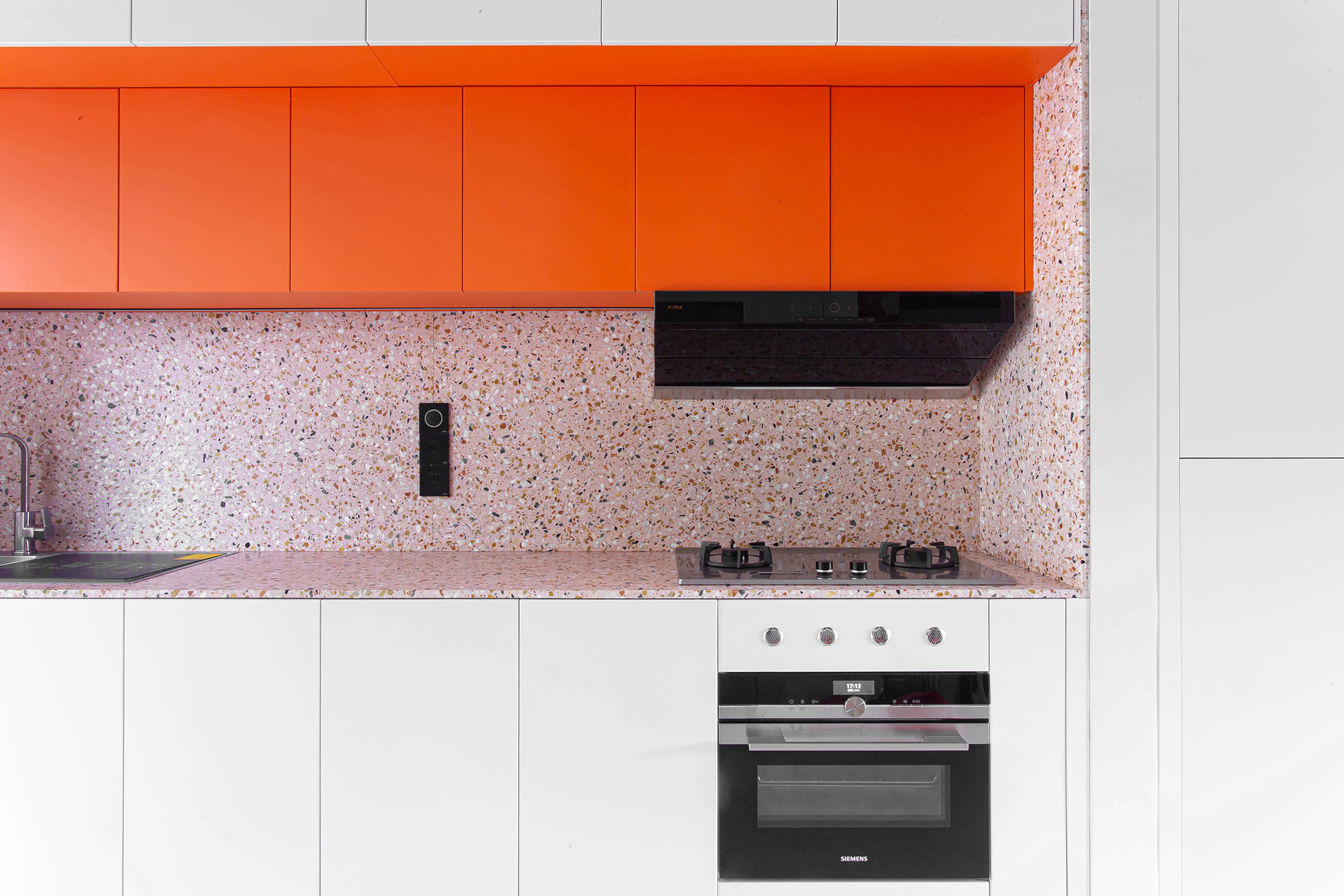 设计选材:运用了大量使用了由不同材质和丰富色彩的搭配成的区块,并配合上波普风格的彩绘,这些活泼和醒目的色彩和材质为居住者提供了丰富的视觉素材,与背景的白色形成较为明显的对比,将这些平凡的日常生活功能区域变得更加的有趣味性,让居住者能够在普通的日常活动中有一个更活跃的生活气氛.