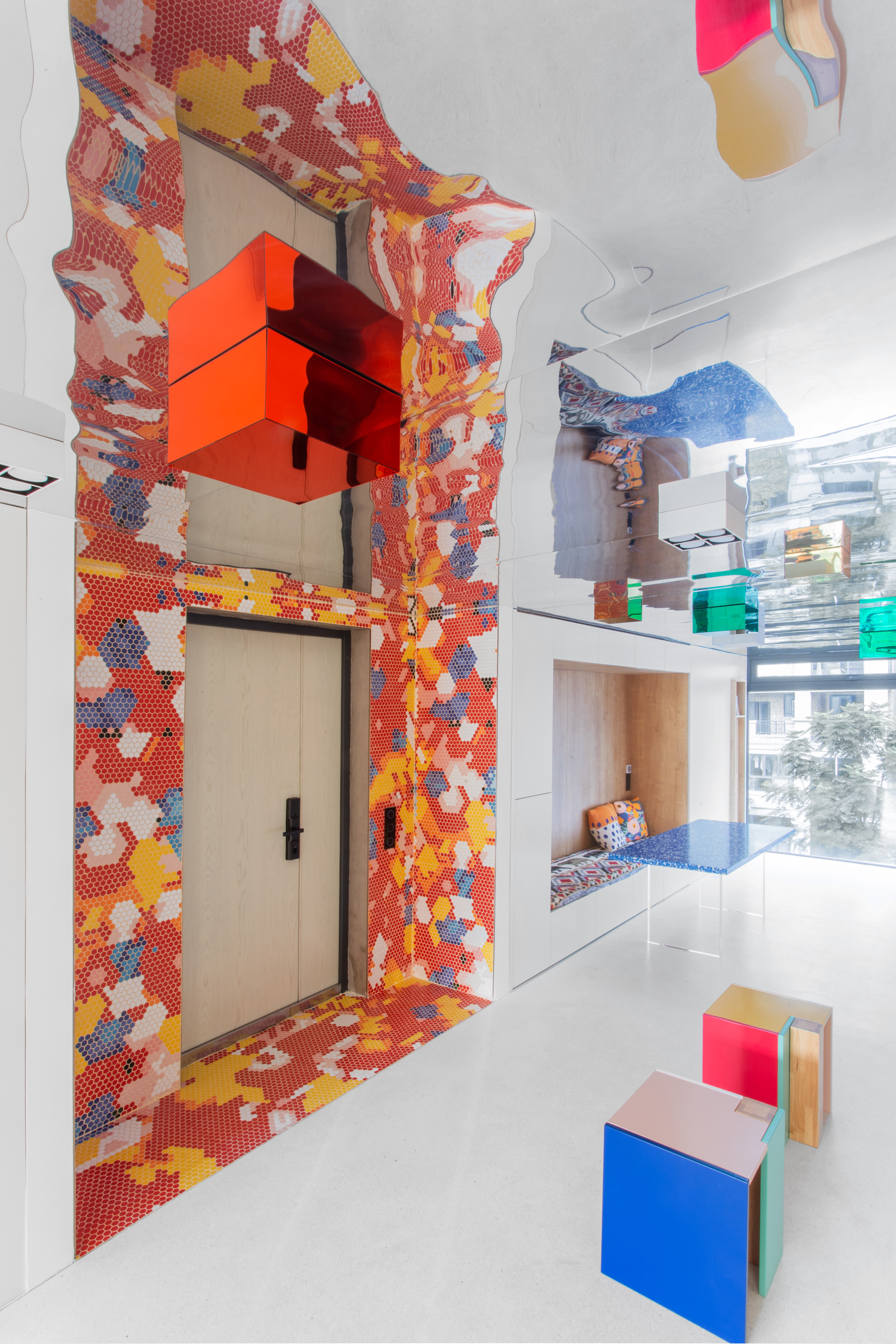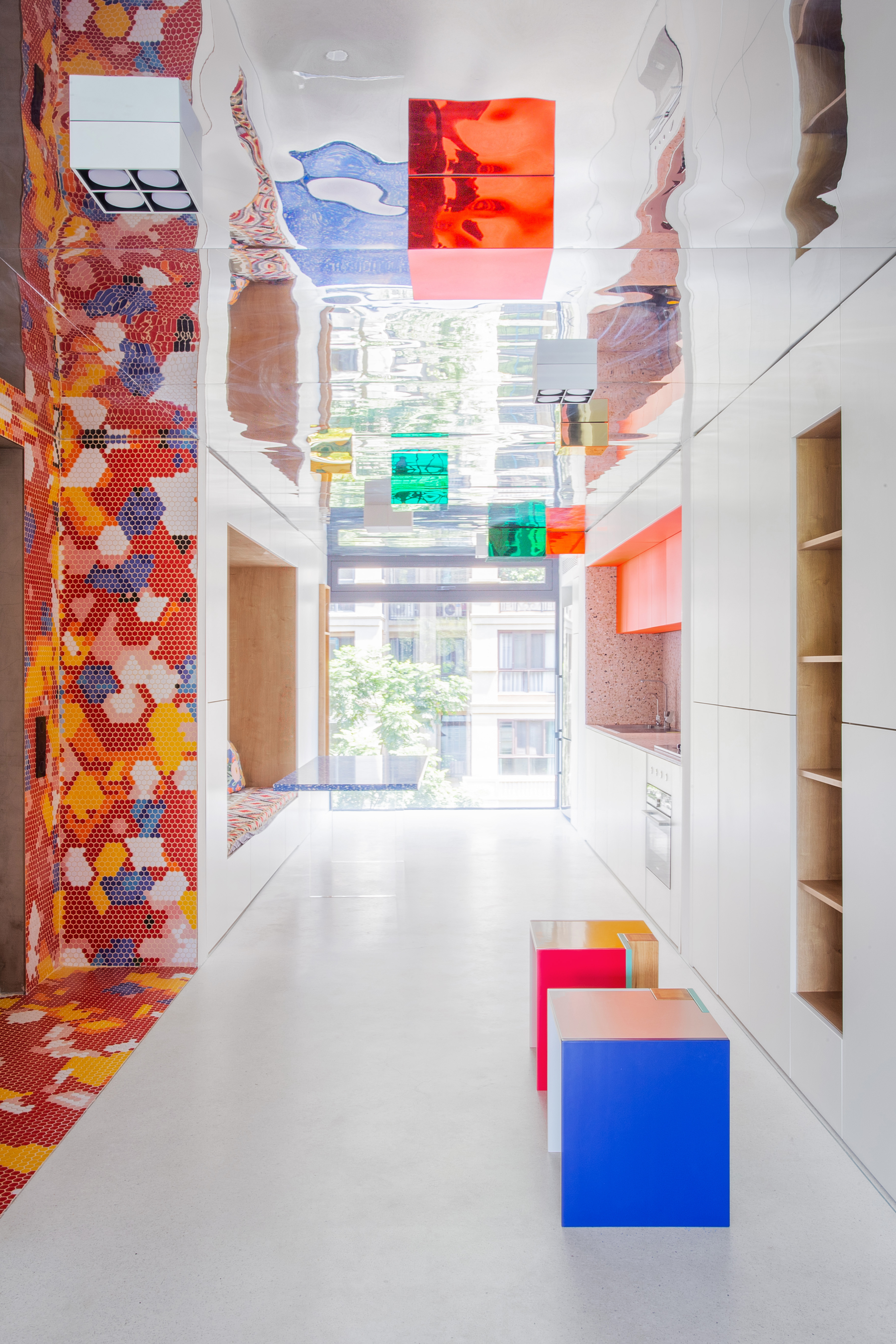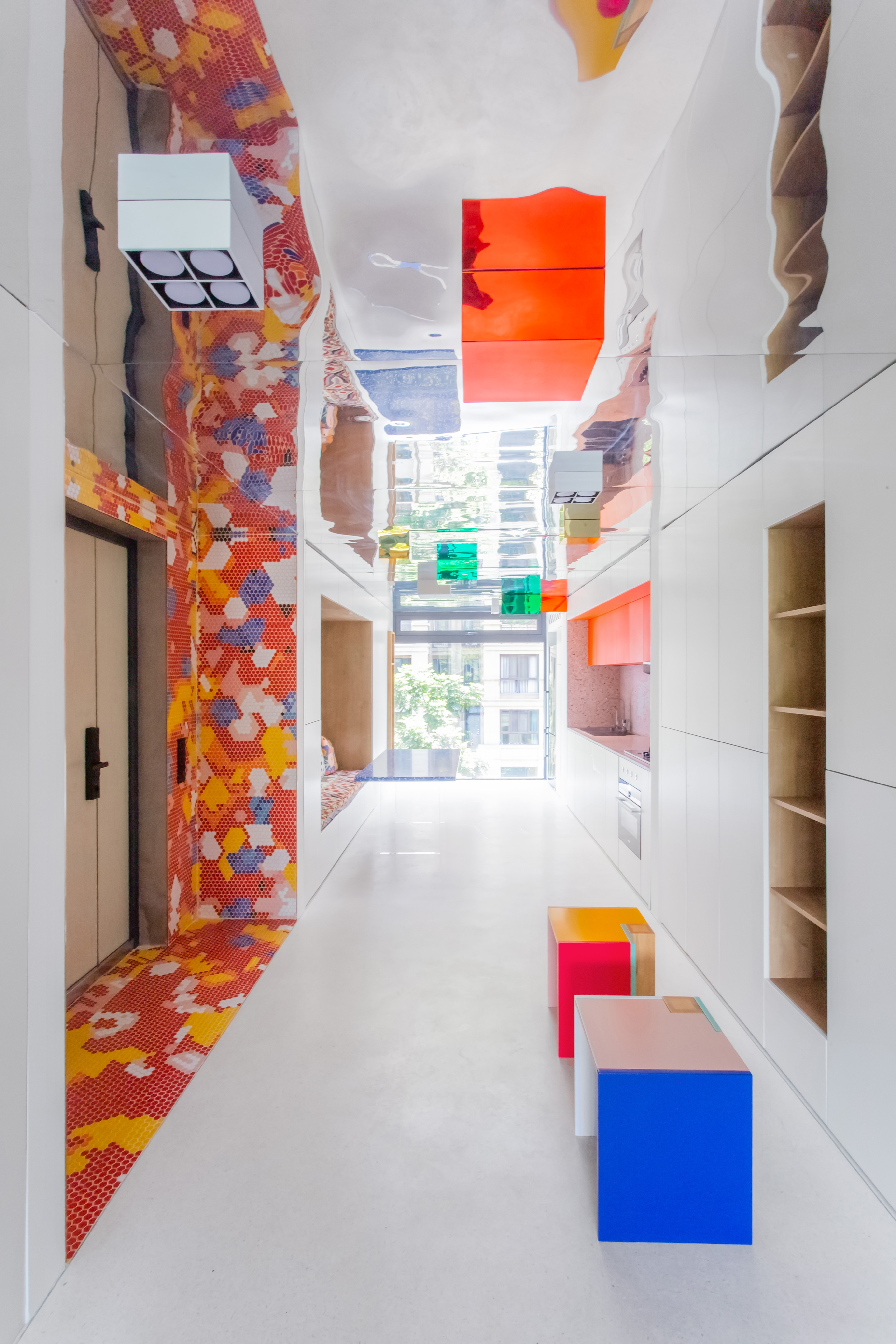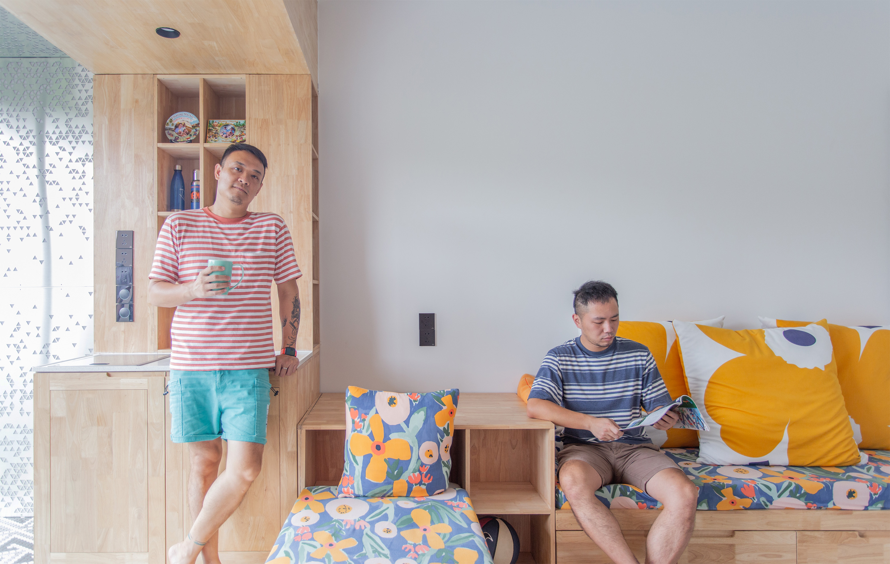 设计选材:运用了大量使用了由不同材质和丰富色彩的搭配成的区块,并配合上波普风格的彩绘,这些活泼和醒目的色彩和材质为居住者提供了丰富的视觉素材,与背景的白色形成较为明显的对比,将这些平凡的日常生活功能区域变得更加的有趣味性,让居住者能够在普通的日常活动中有一个更活跃的生活气氛.