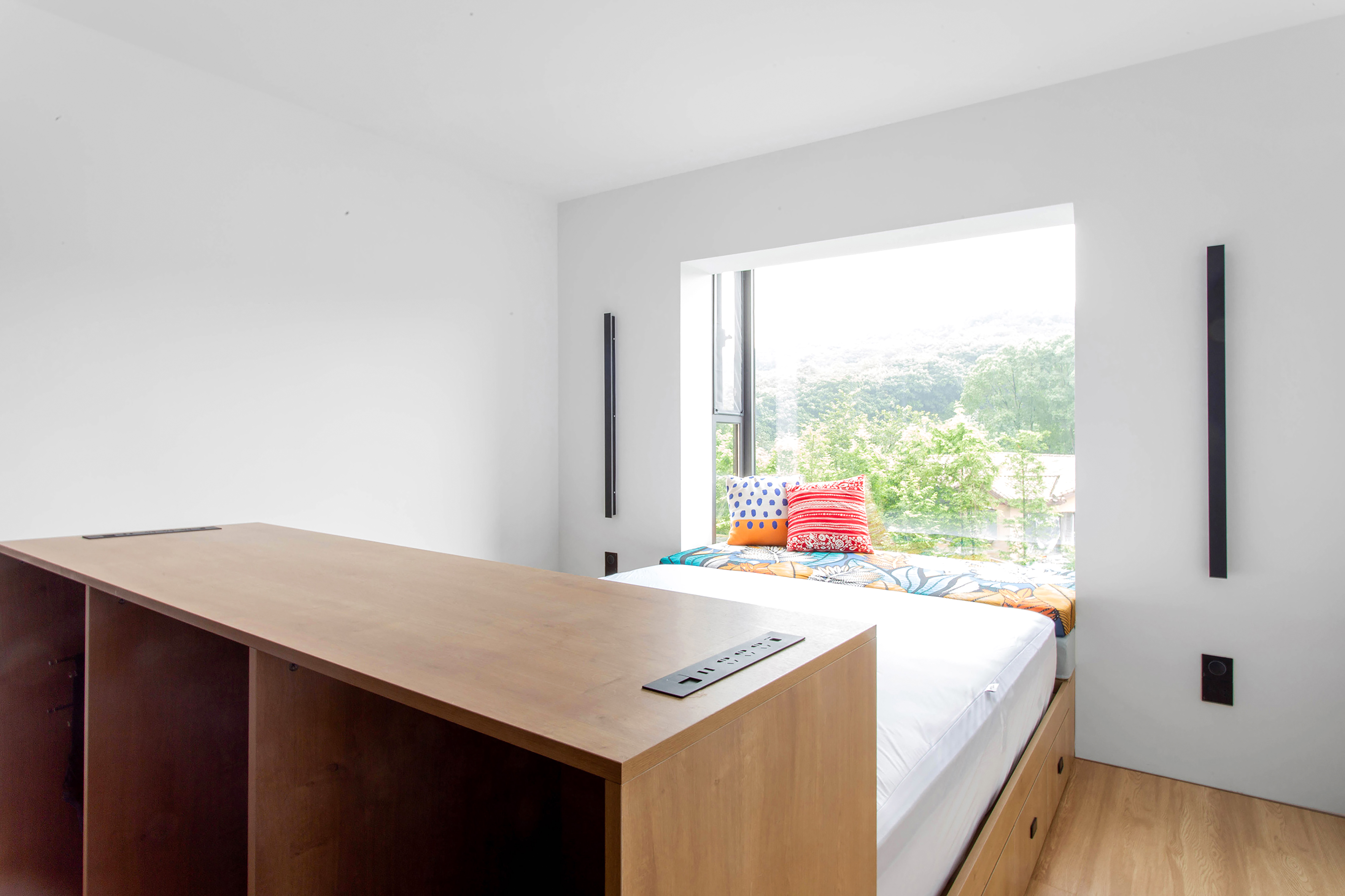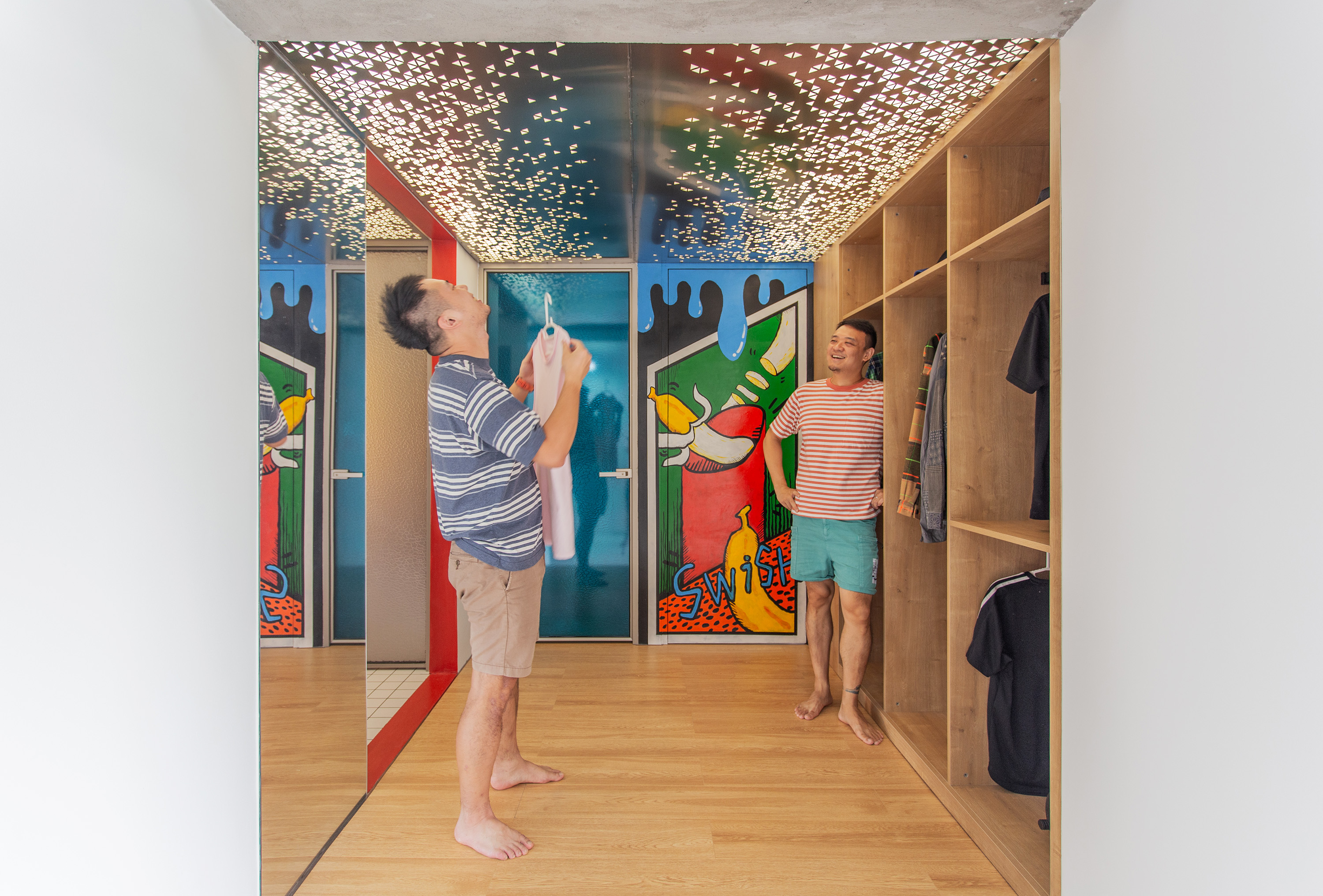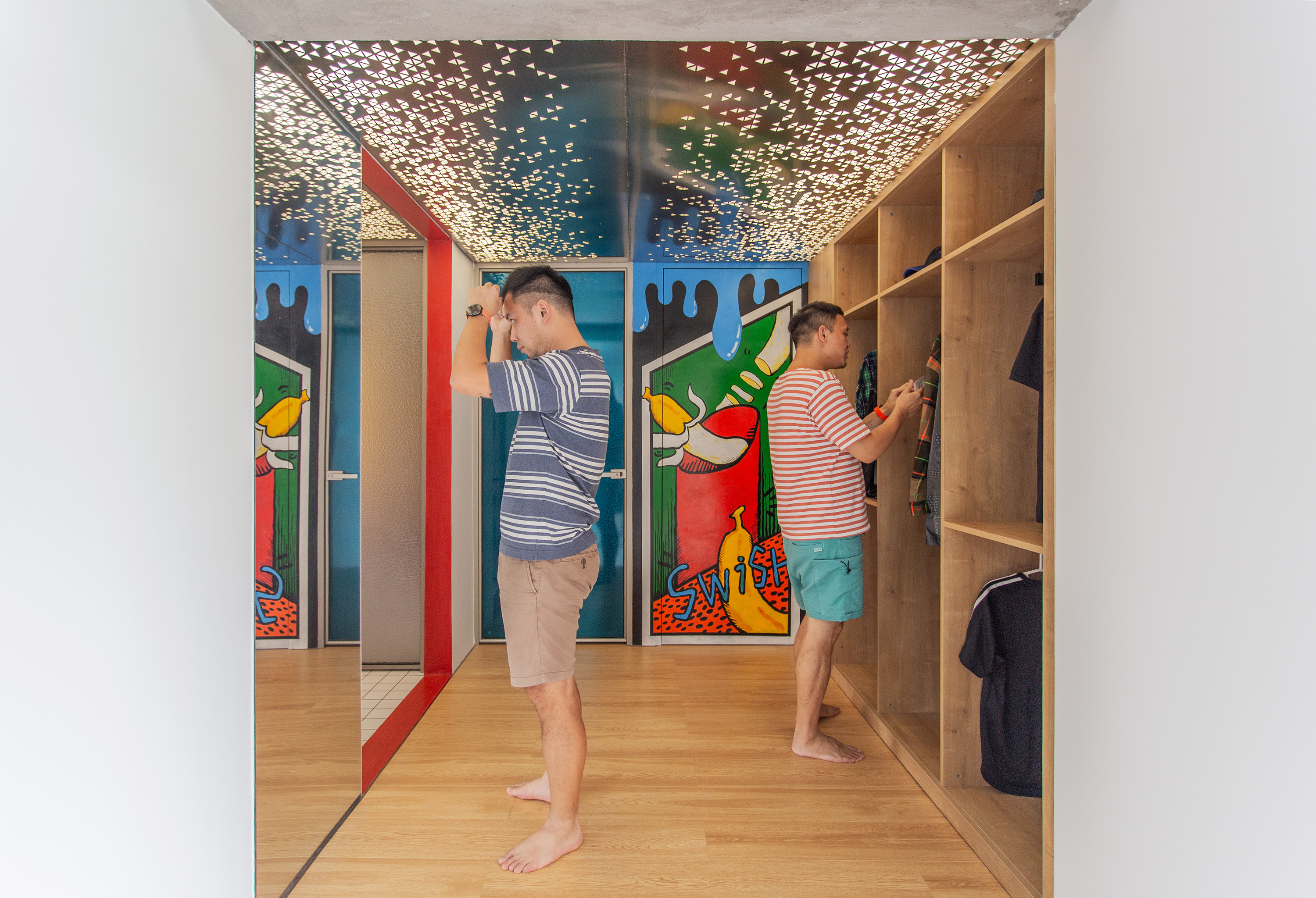 用户体验:两位业主在大学的时候曾经是无话不谈的上下铺好兄弟,他们也曾在年轻的时候幻想过,就算毕业之后,也能够延续这种深厚的友谊。毕业后他们曾经因为各自的前程各奔东西,也曾组建过自己的家庭。而多年后,两人因为自己的梦想,又走到了同一个城市共同创业。他们一起买下了一套不到100平方米的公寓,希望能够像大学一样生活并工作在一起。他们在重庆的这个共同的家更加的年轻时尚,活泼和充满视觉的冲击力,让居住者除了悠闲,放松以外, 更能转换一种生活态度,能充满乐趣的生活和工作在一个像游乐园一般自由的家里。