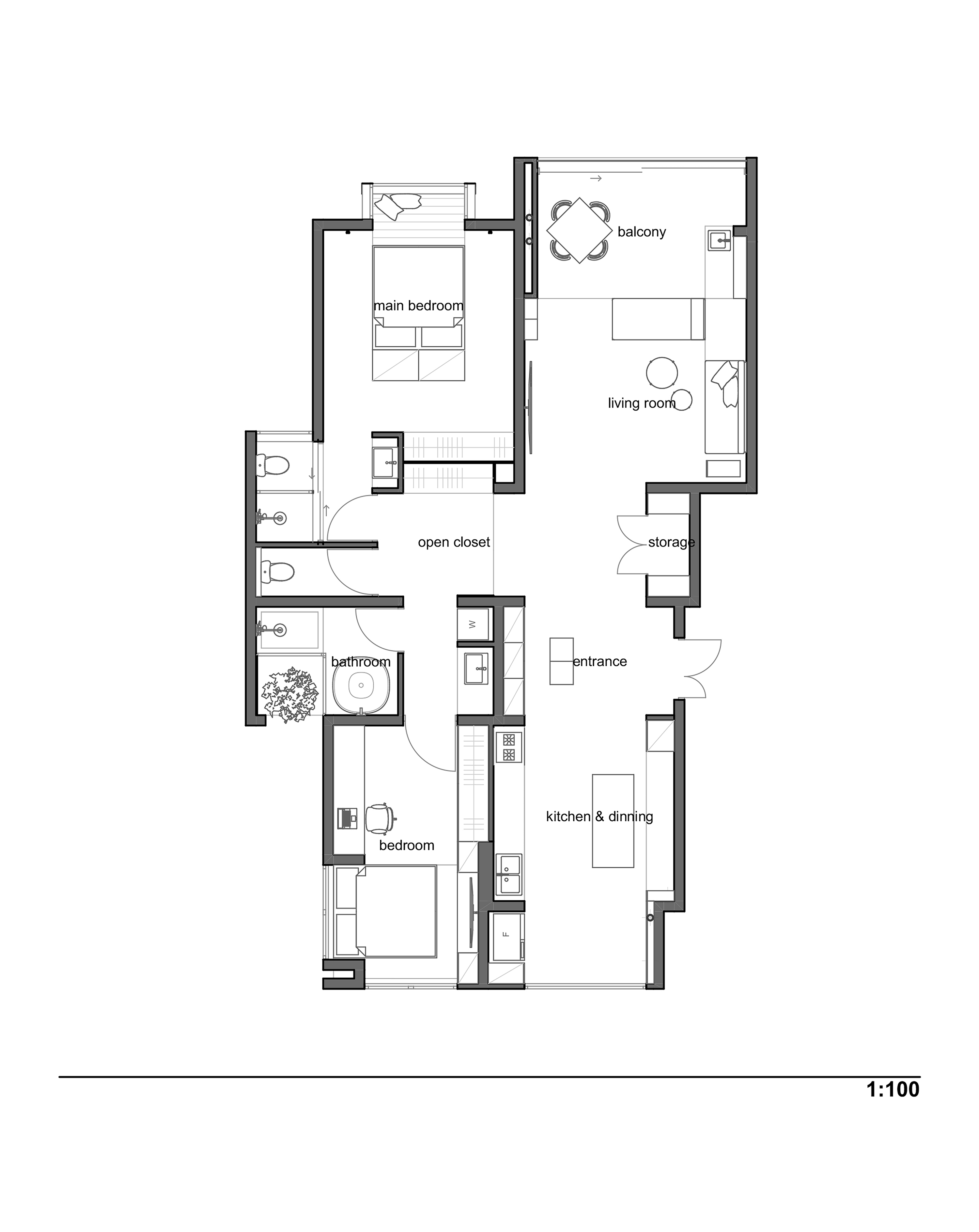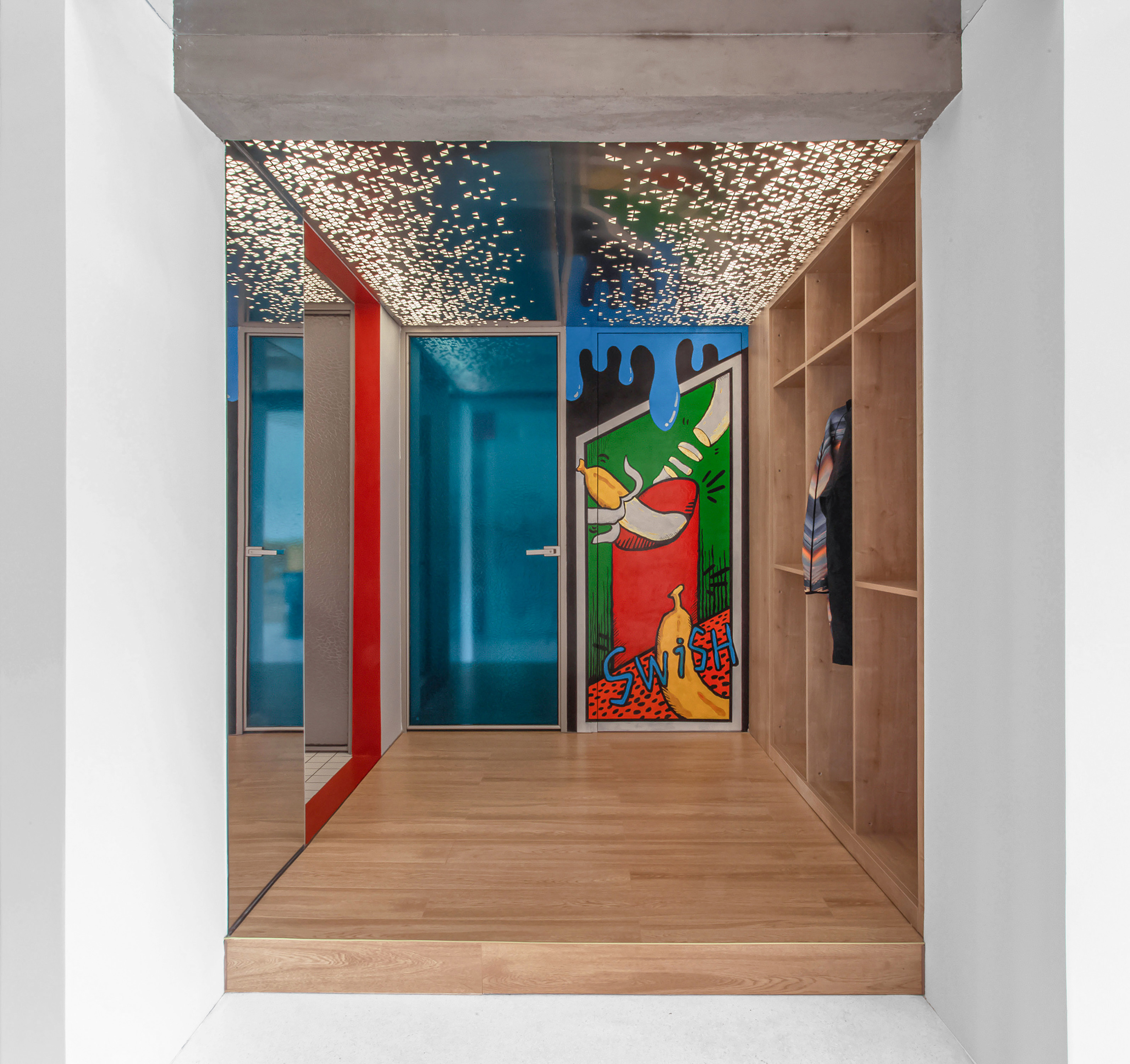 空间布局:我们希望能够模糊公共区域之间的边界, 将其做成一个通透的大空间,在这个大空间中以颜色,材质,和围合关系来区分各种功能区域,让人可以更自由的在这个空间中进行各种活动。而对于私密空间的处理则采取完全相反的思路,与活泼热闹的公共空间不同,主卧的入口隐藏于墙上的彩绘中,次卧的入口则处于在转折通道的尽头,赋予私密空间应有的私密性。