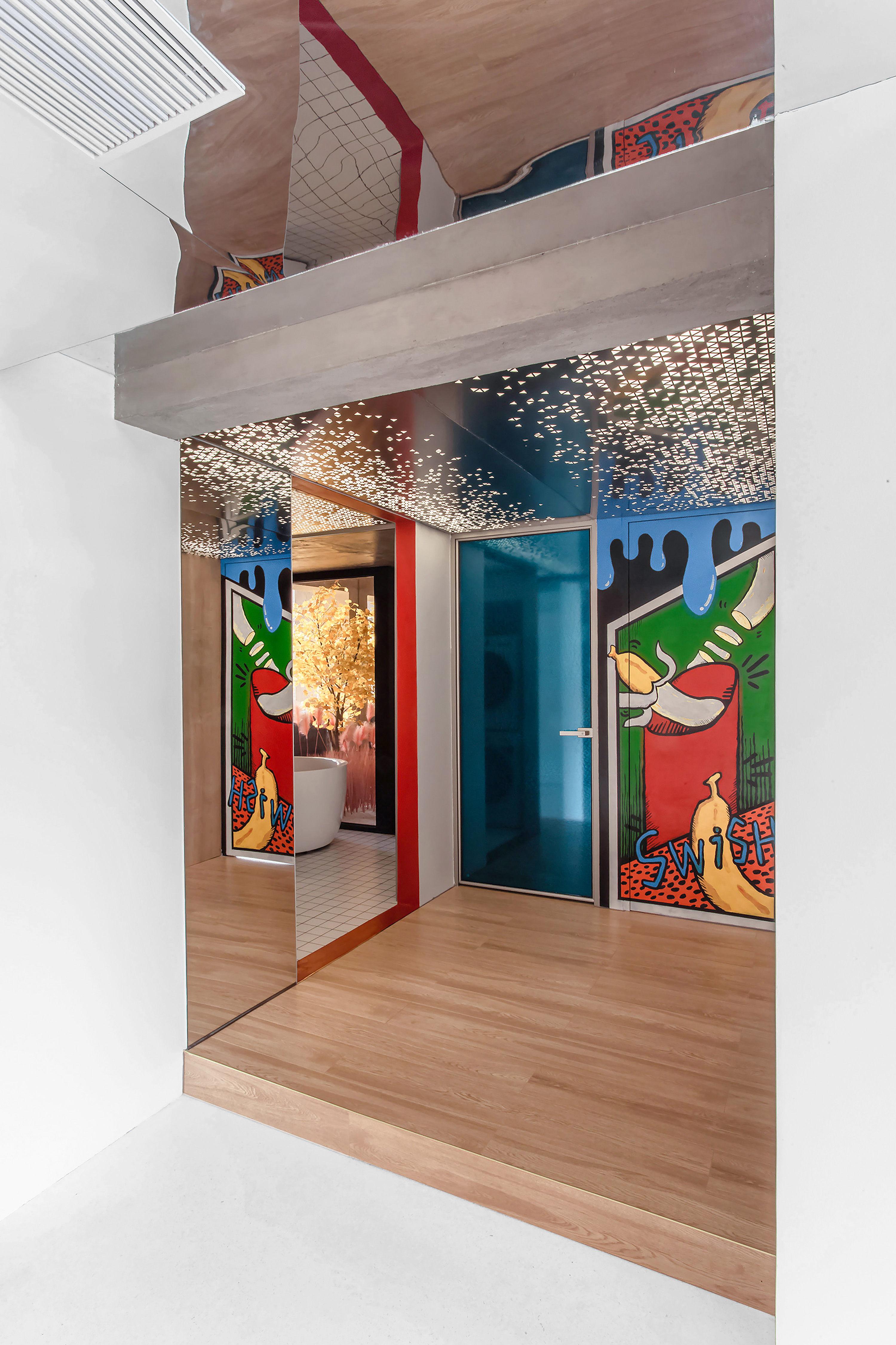 空间意境:更广阔的空间,才能让居住者拥有更加自由和无拘束的感受,因此,我们大量的利用了镜面材质,其反射效果突破了原本的面积和空间的高度。让使用者在视觉上能够不受原始墙体和天花板所带来的限制。与此同时,镜面材质也为居住者提供了新的角度来审视这个具有丰富元素的空间,从而获得更加丰富的视觉体验。