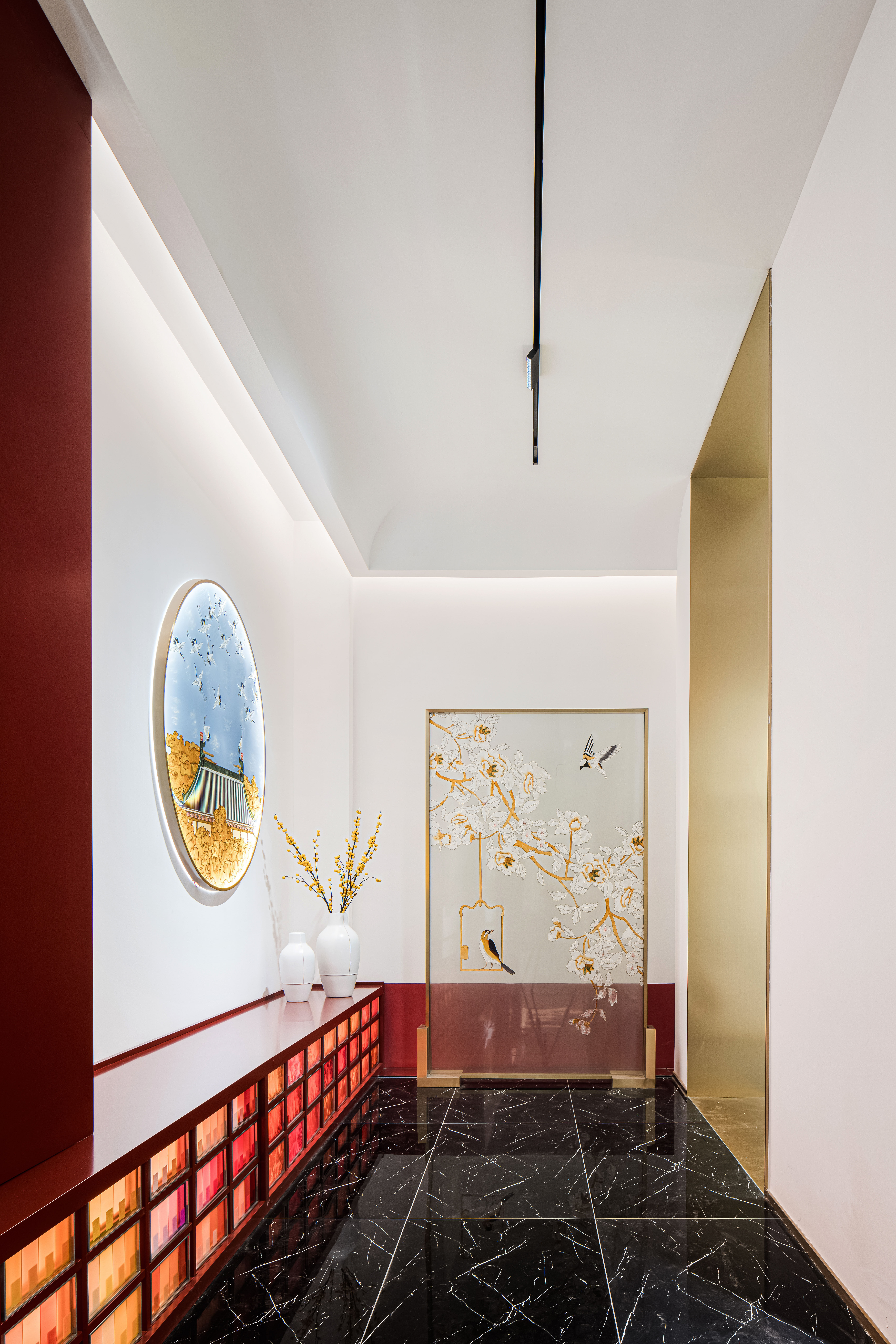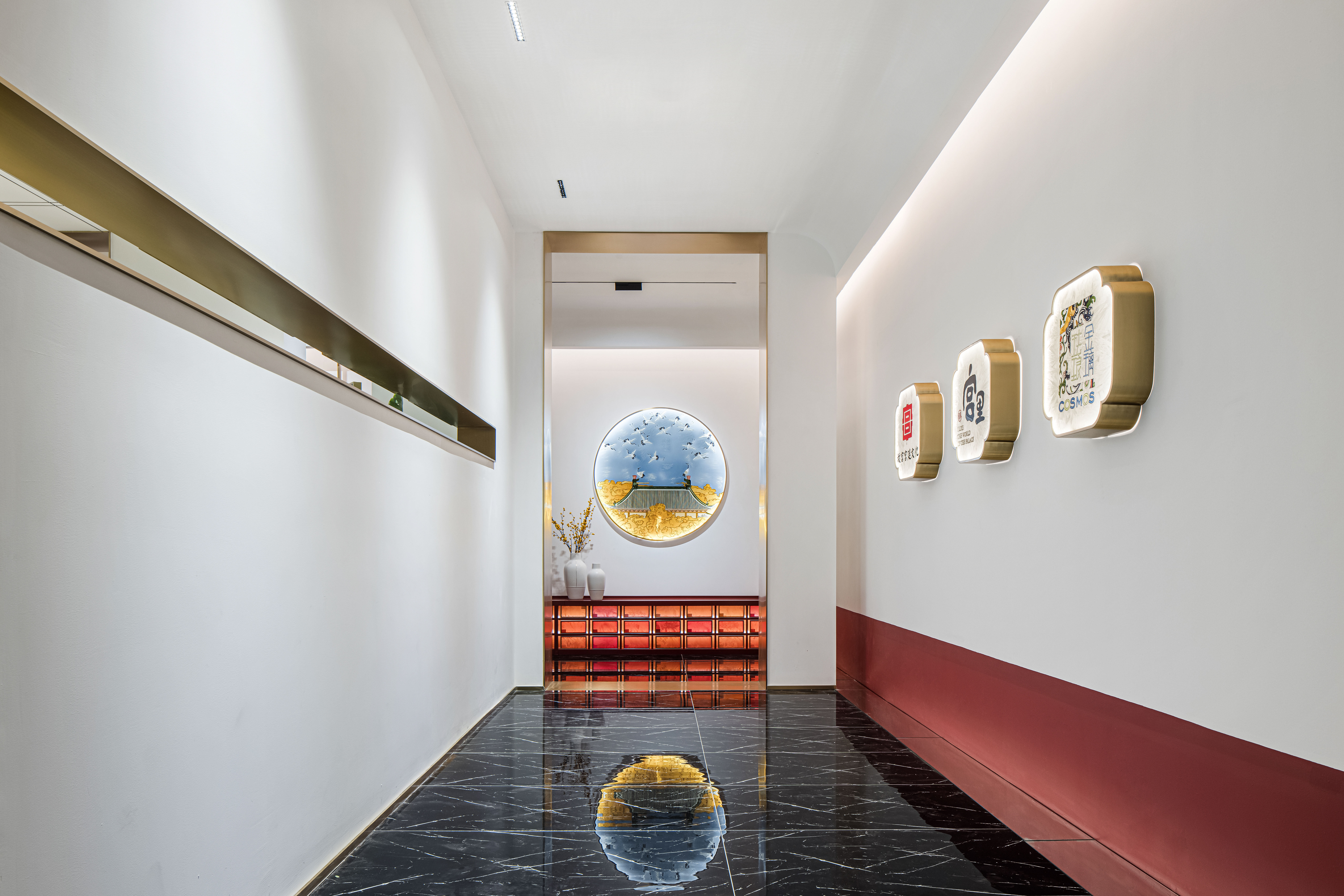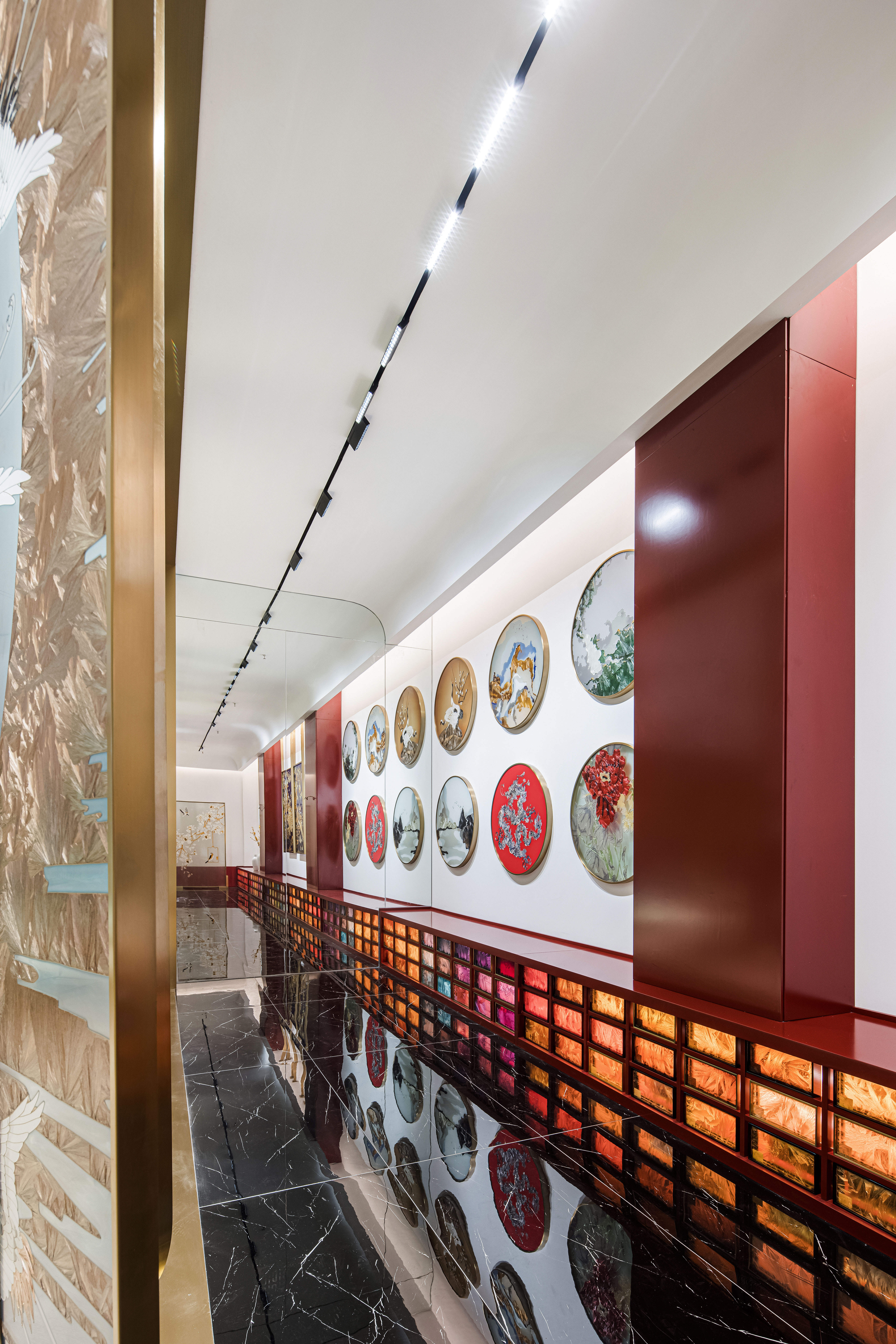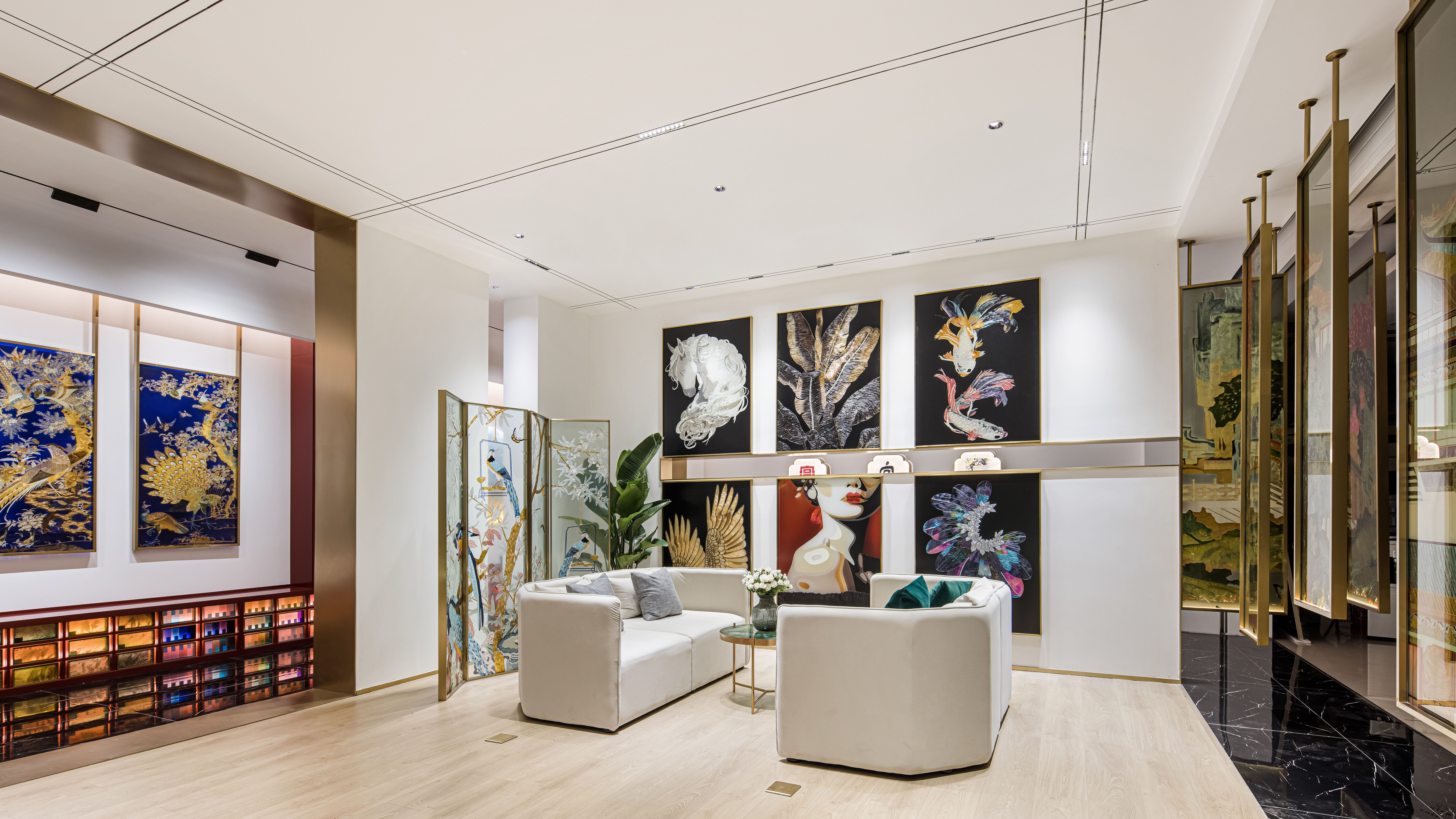 空间布局:先进入一个小门厅,然后进入一个仪式感极强的长廊,再进入一个大的洽谈体验功能区。让120平方的展厅展现出200平方以上的效果