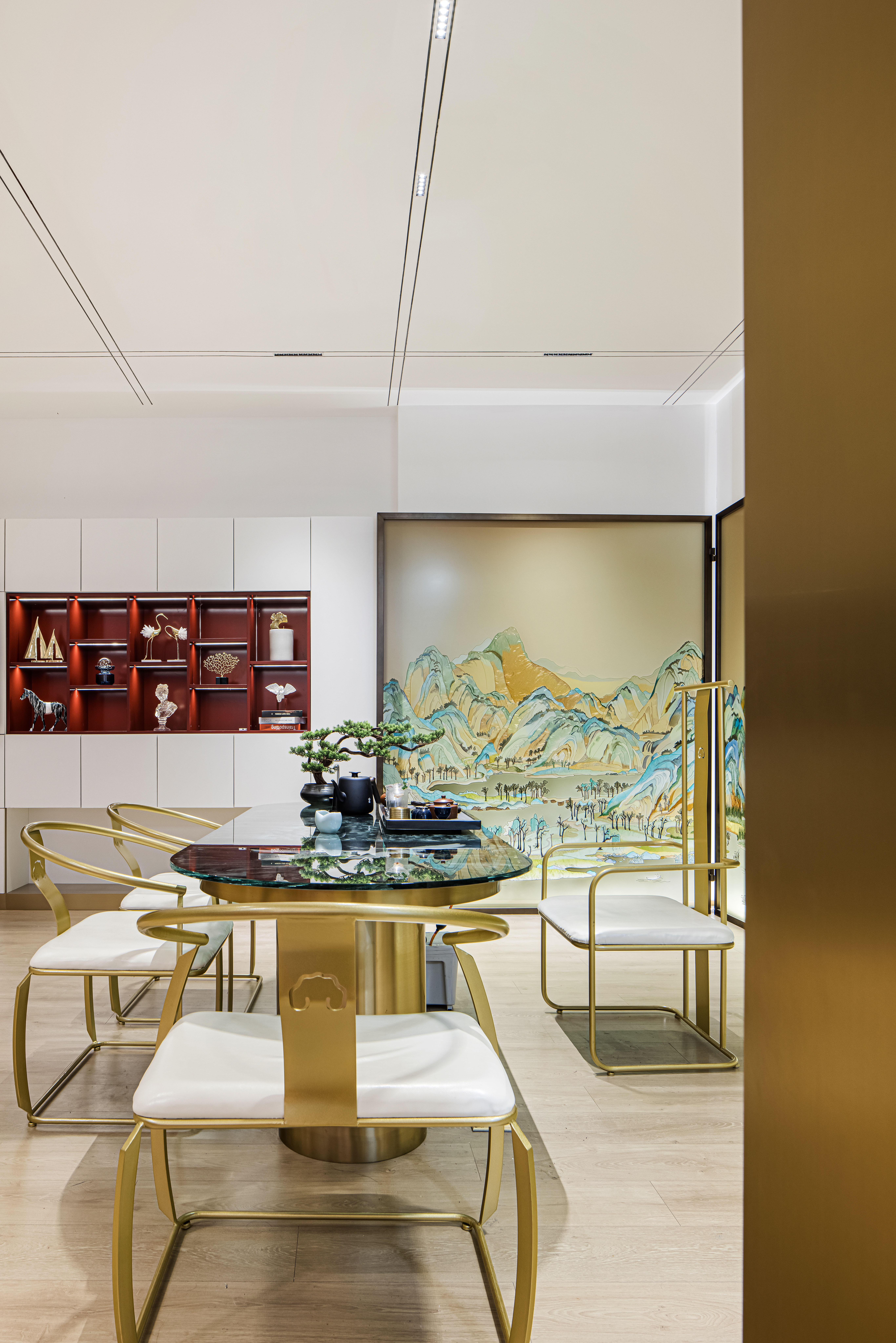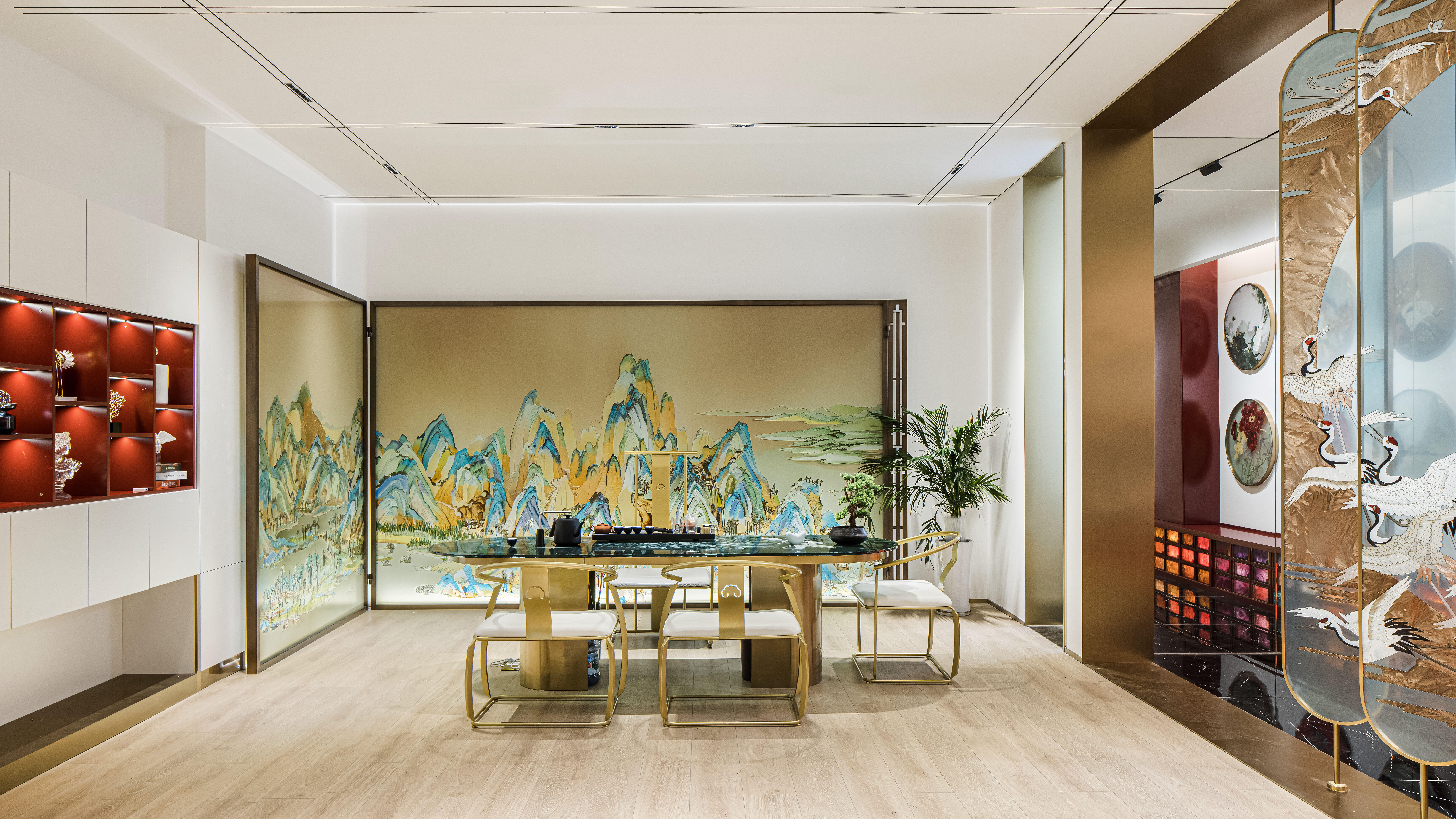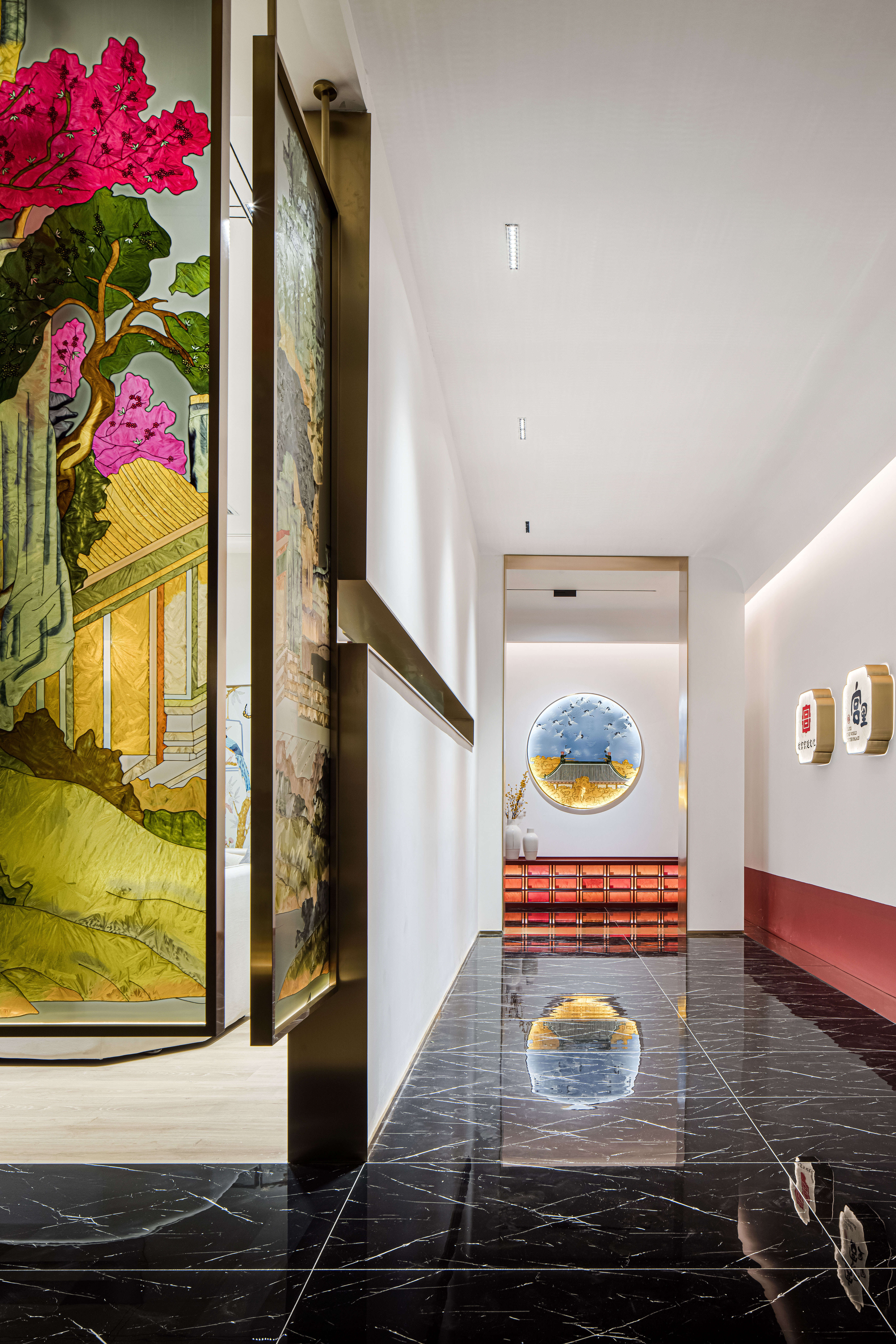 空间布局:先进入一个小门厅,然后进入一个仪式感极强的长廊,再进入一个大的洽谈体验功能区。让120平方的展厅展现出200平方以上的效果