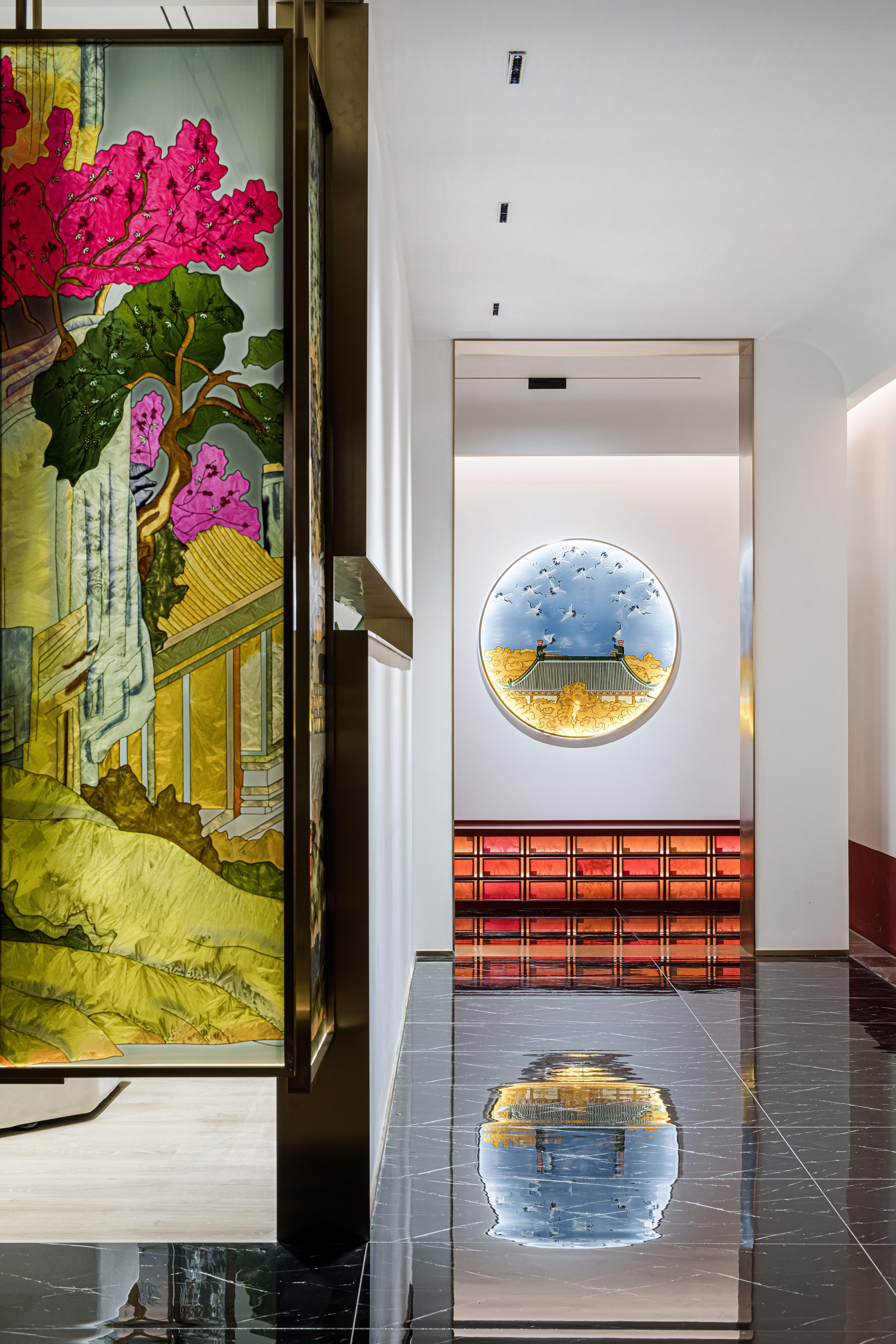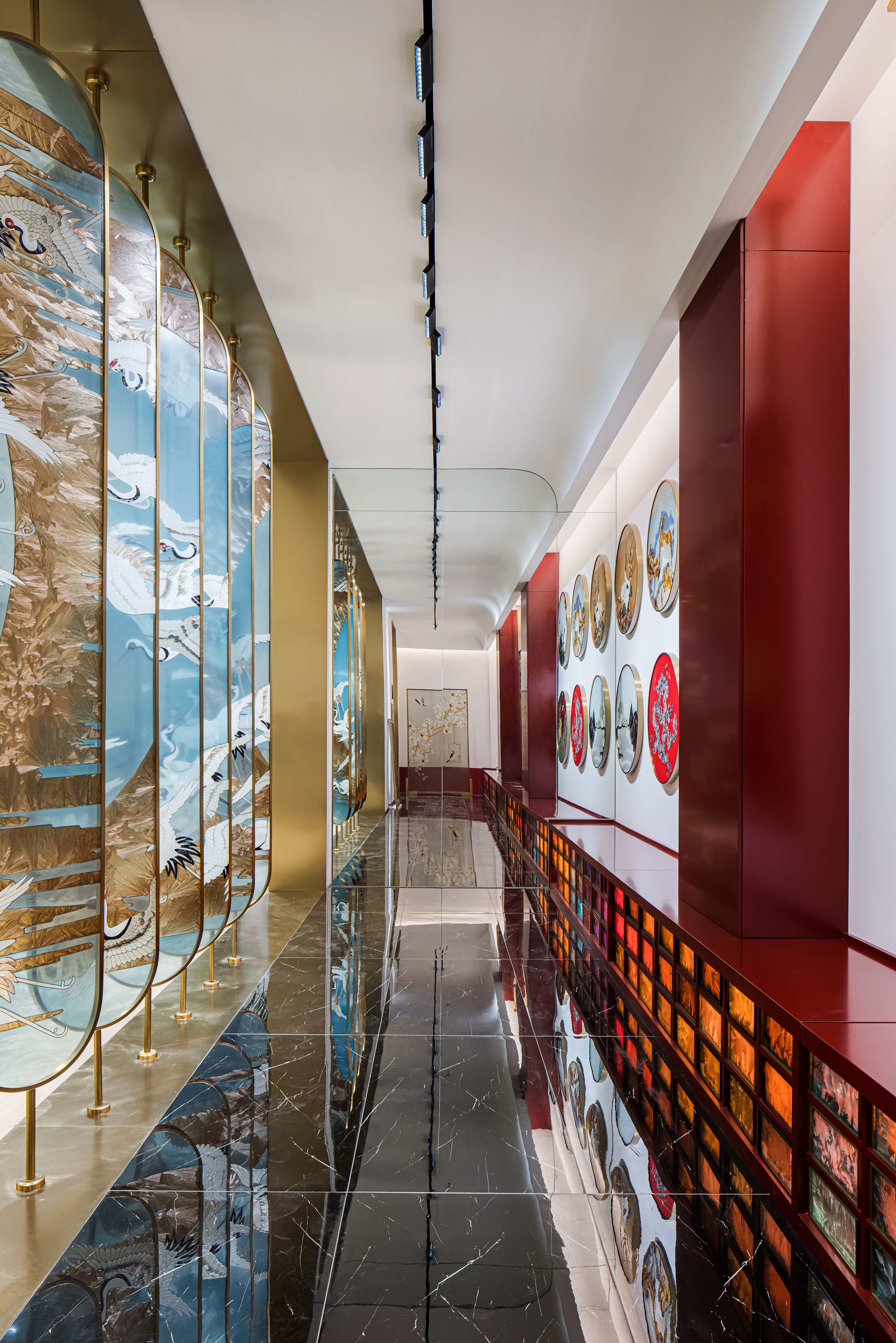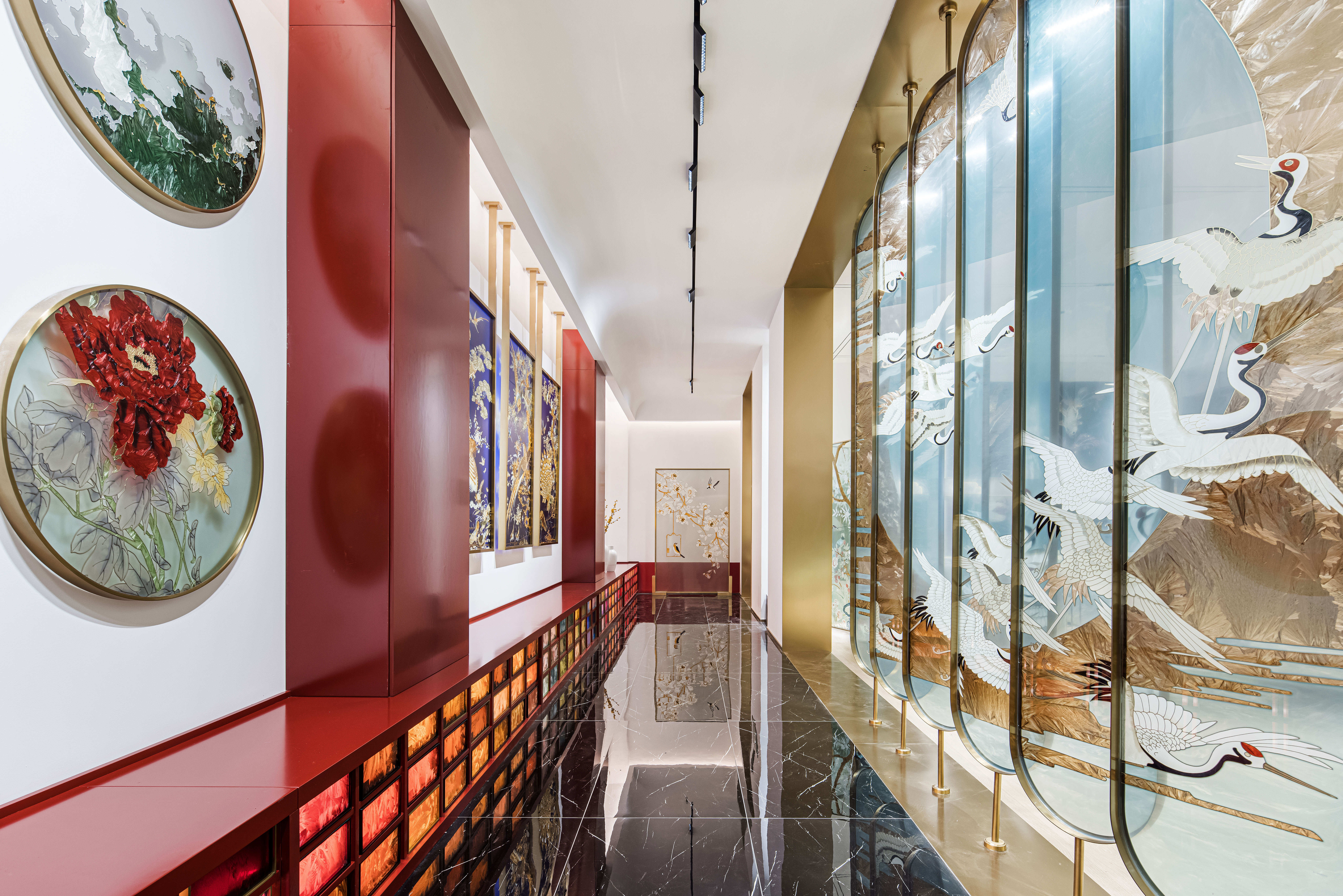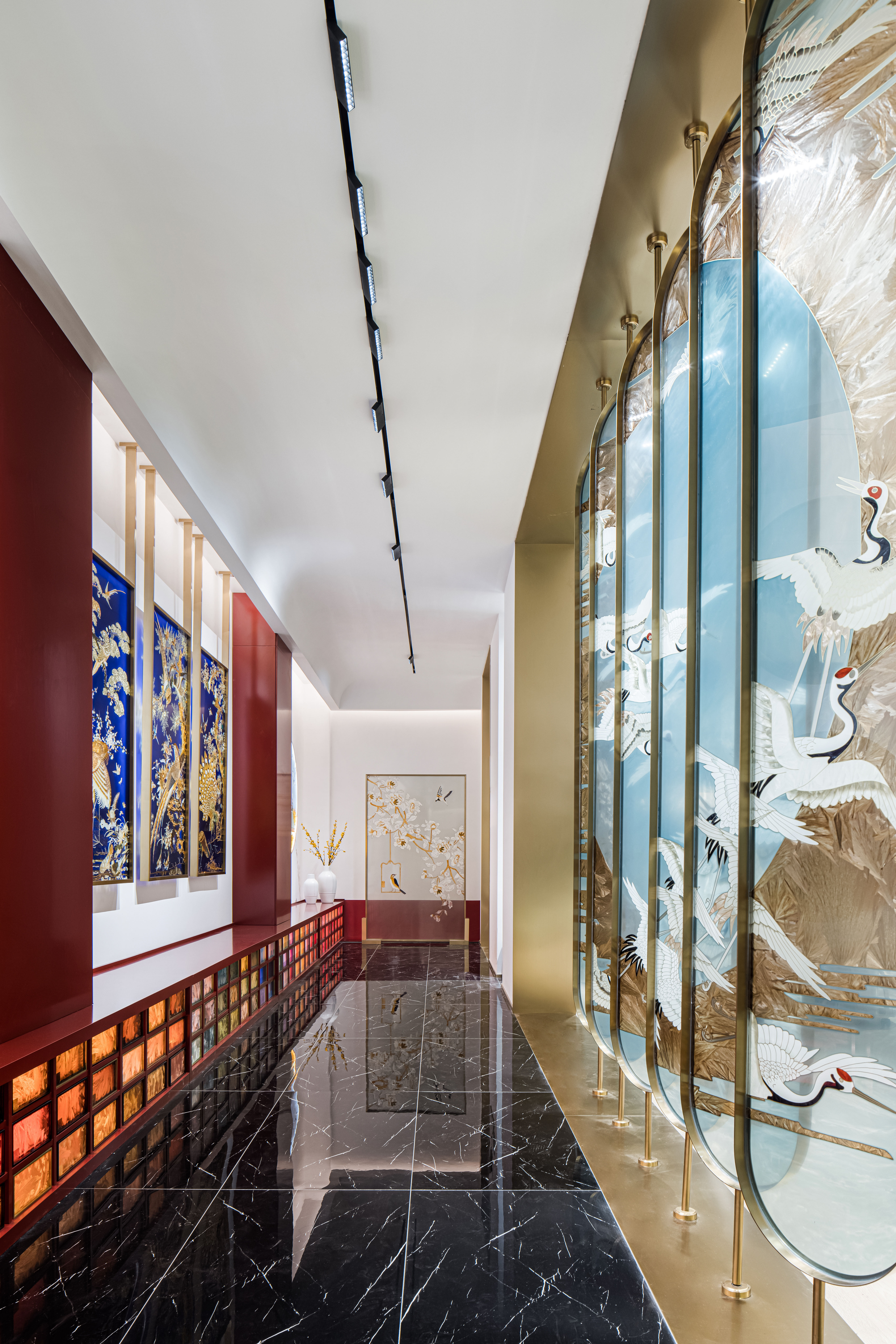 空间布局:先进入一个小门厅,然后进入一个仪式感极强的长廊,再进入一个大的洽谈体验功能区。让120平方的展厅展现出200平方以上的效果