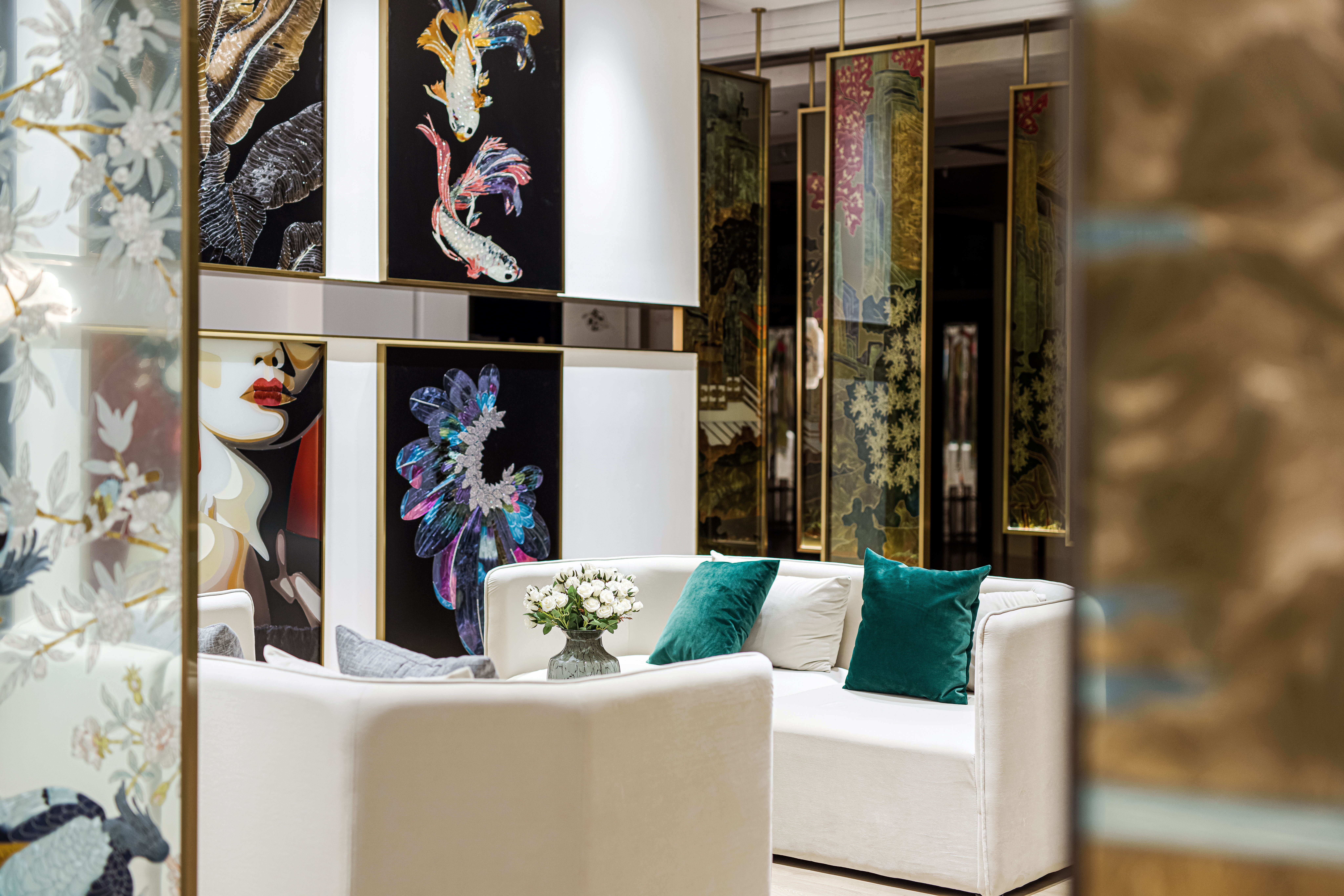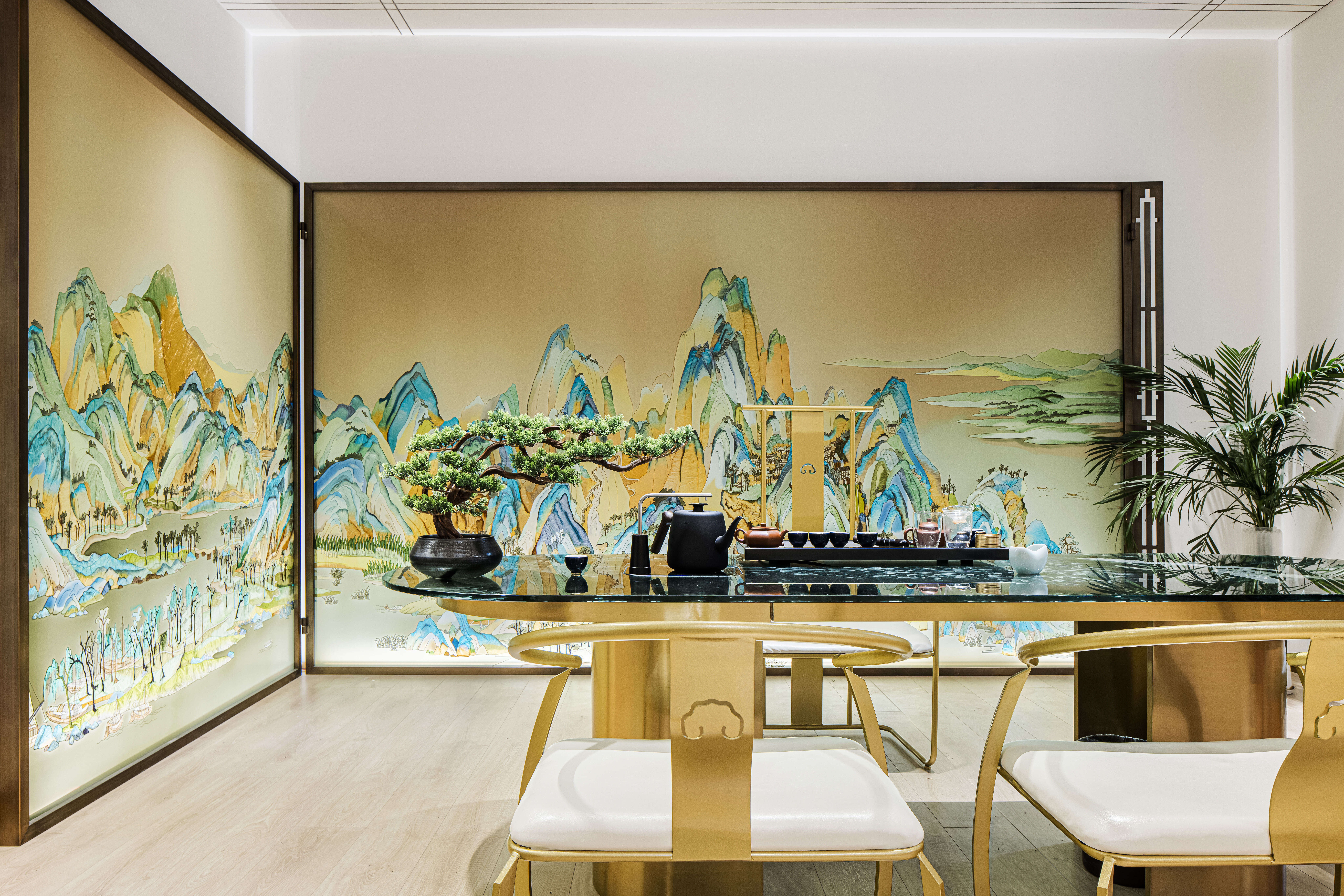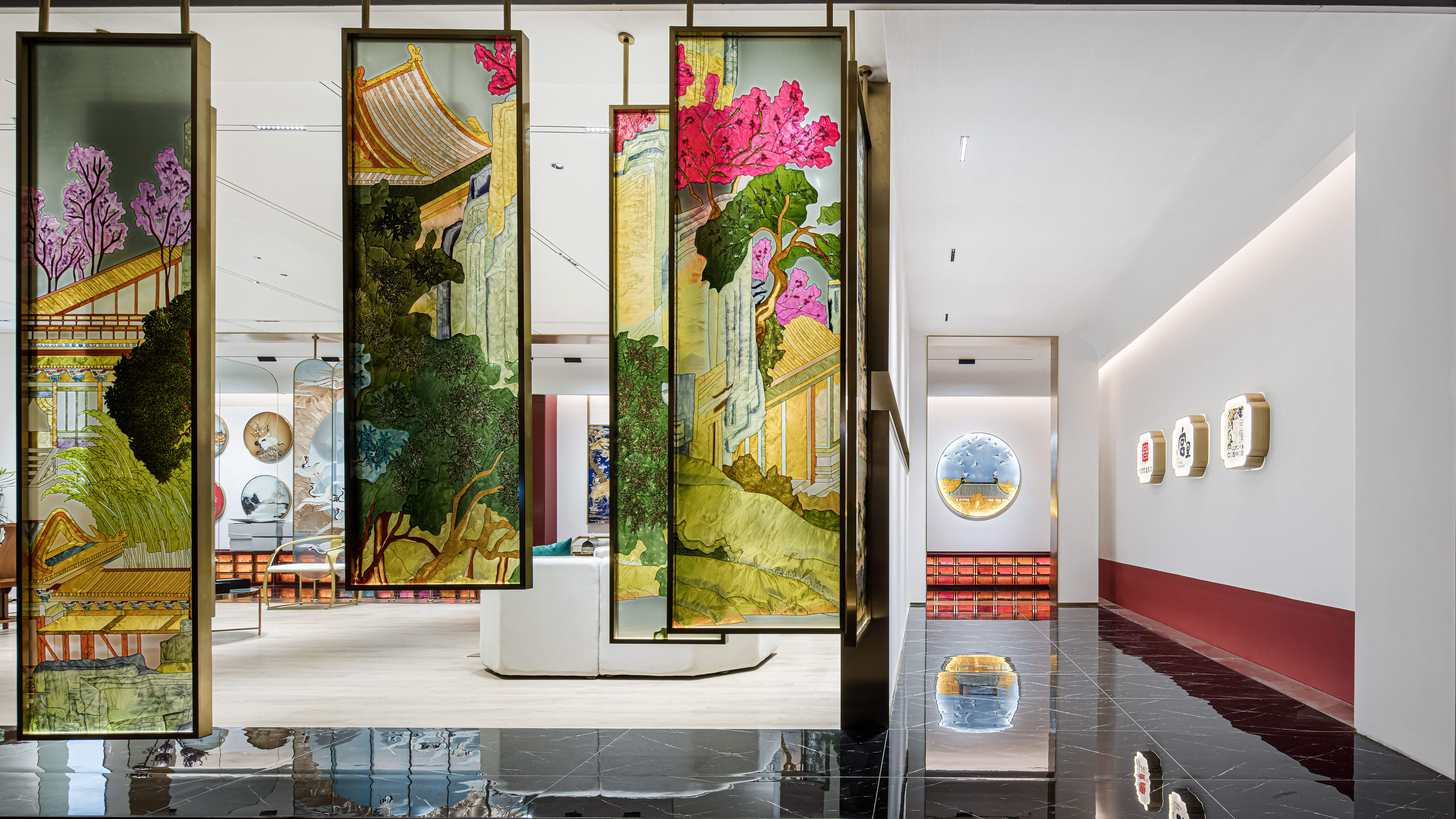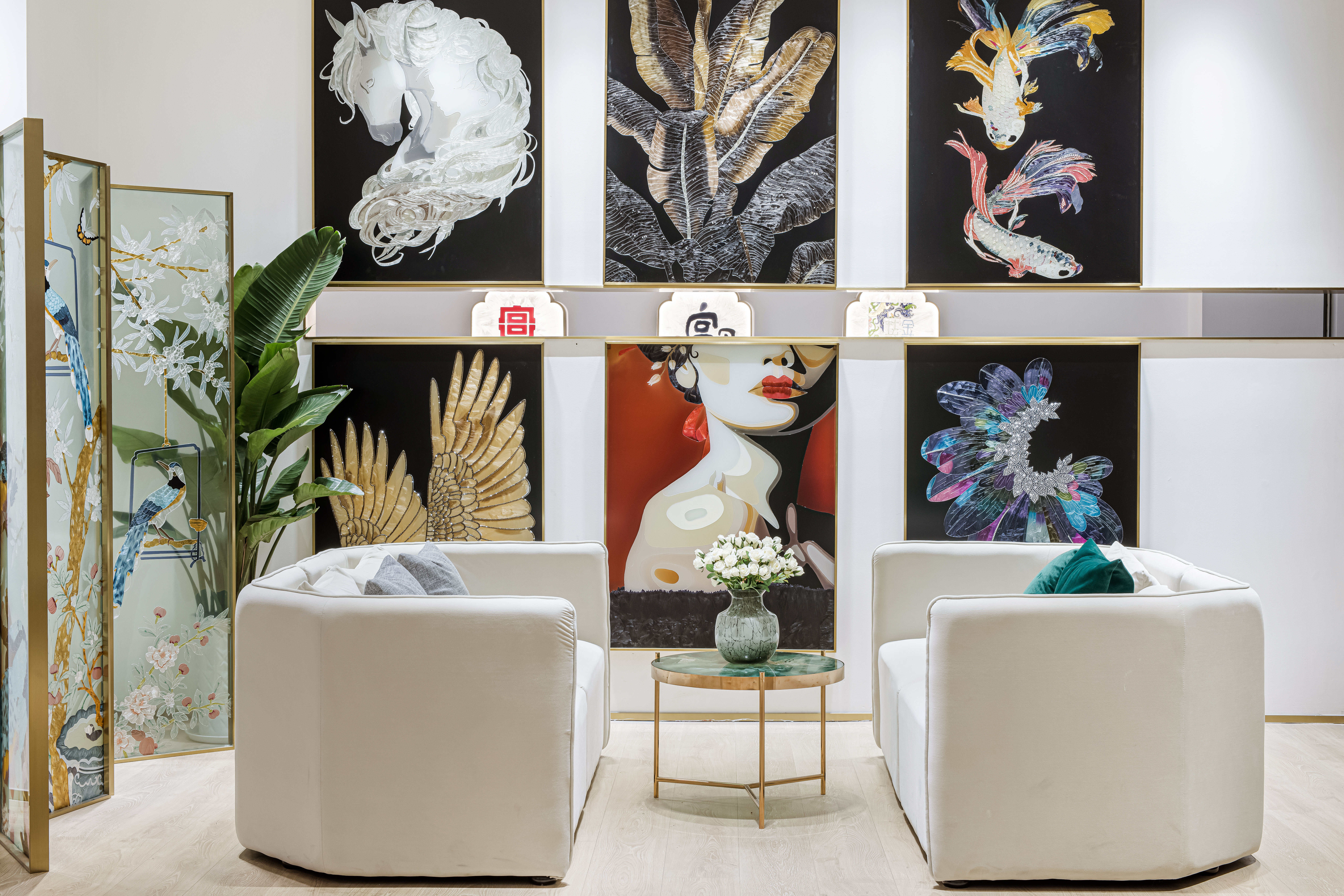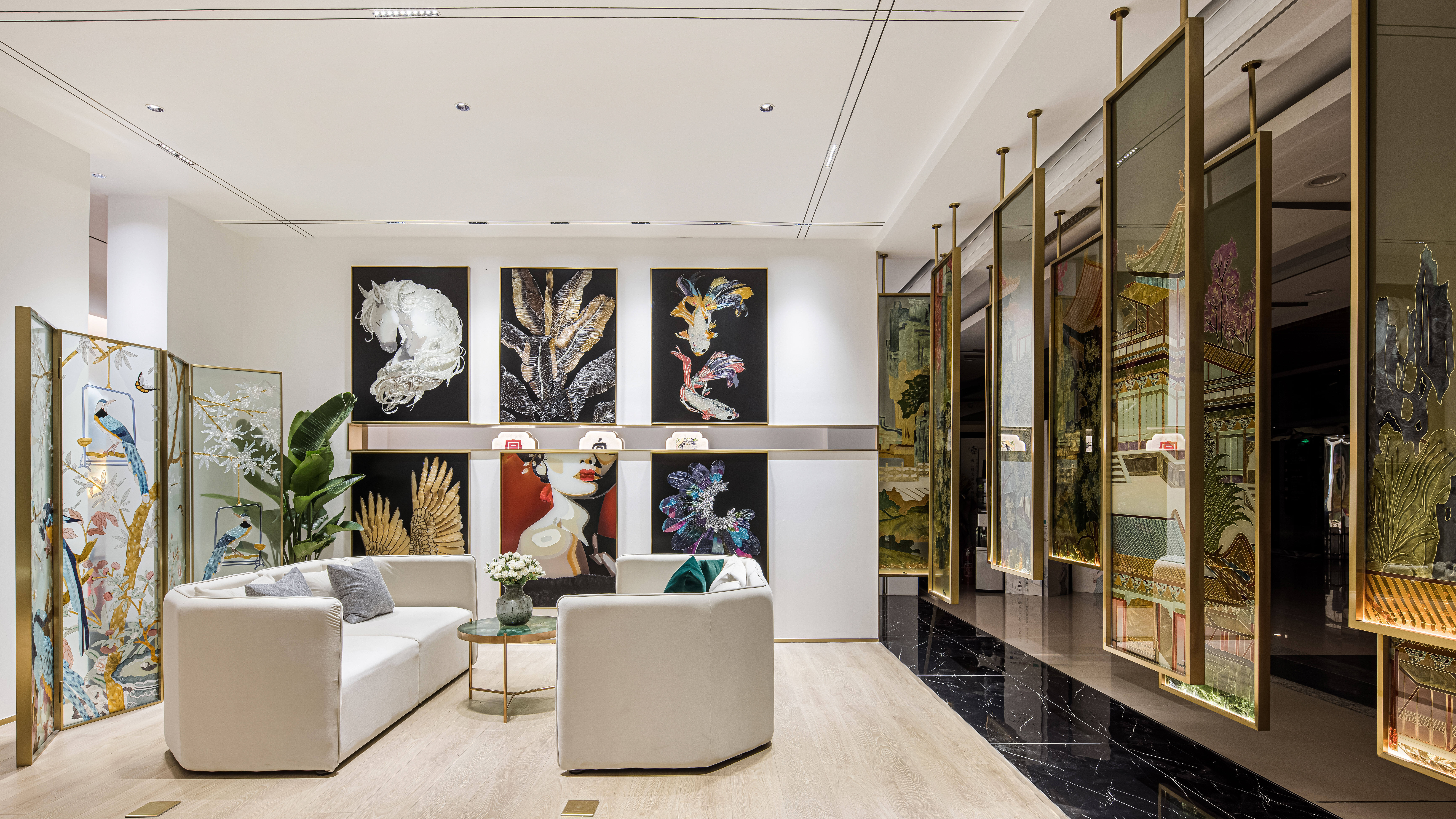 项目定位:摒弃传统的展示,让产品艺术化的融入到空间里,让展厅像个小会所一样,把产品运用到外面的门头广告,里面的桌子,屏风,茶几,隔断等功能产品上