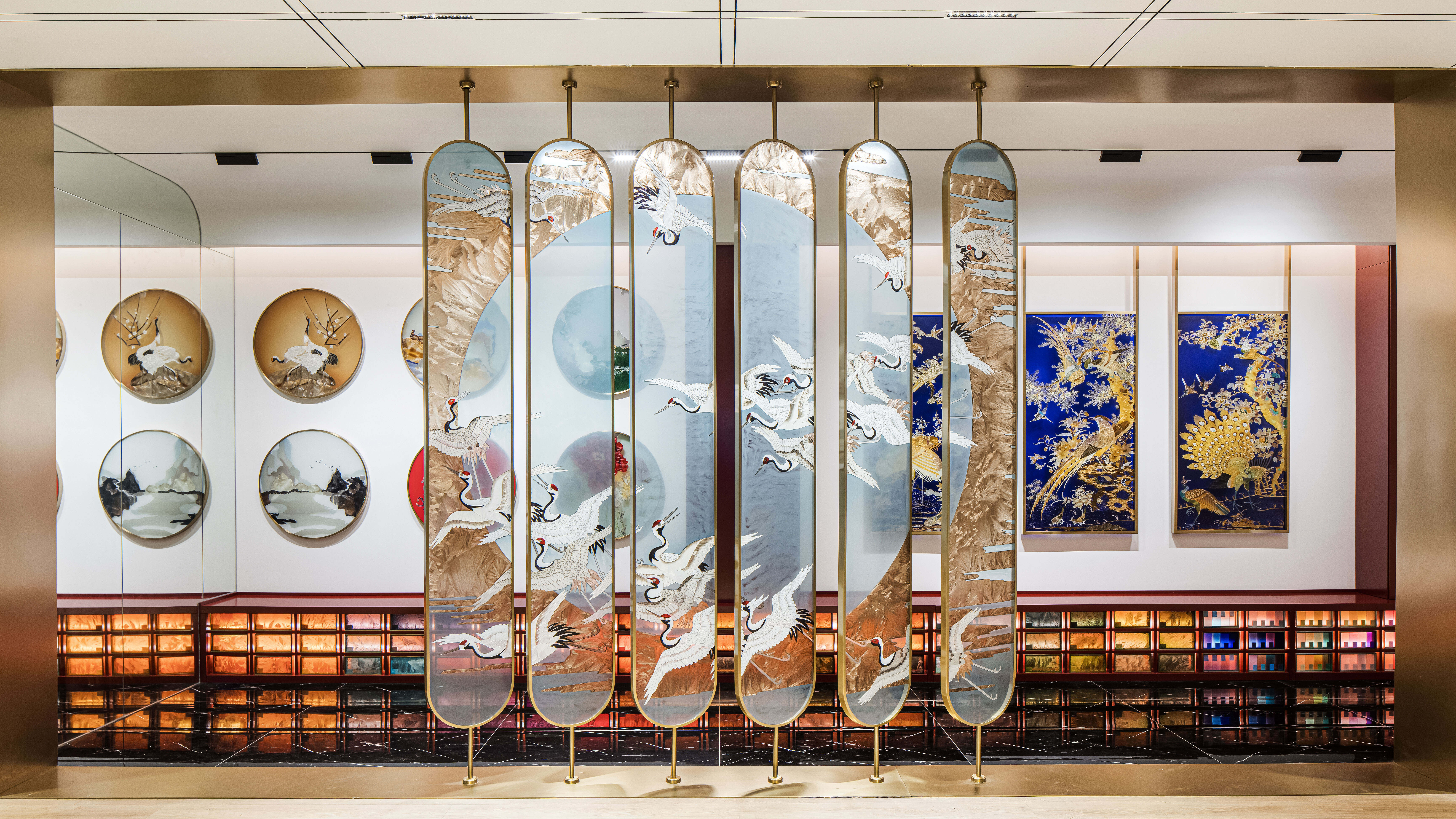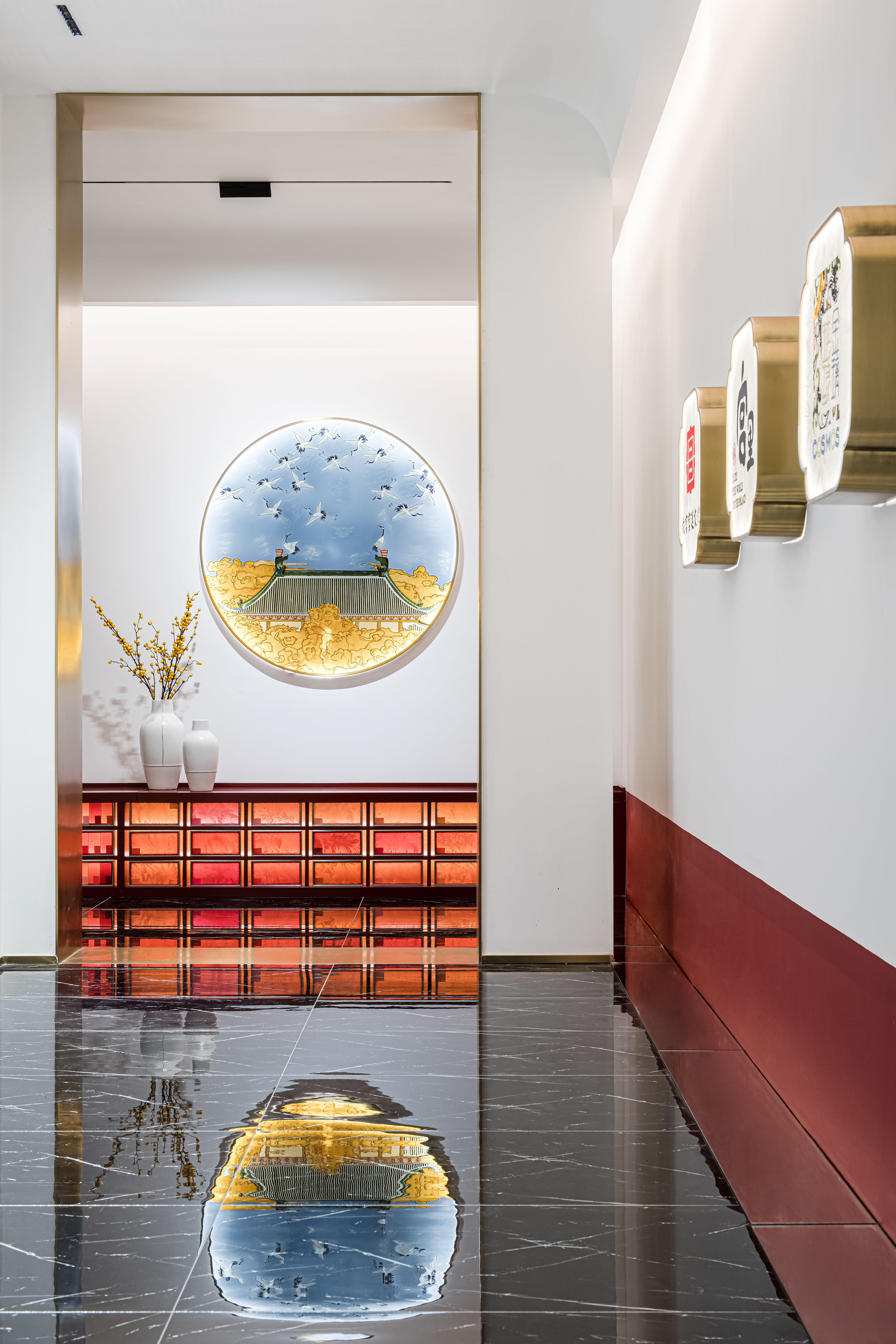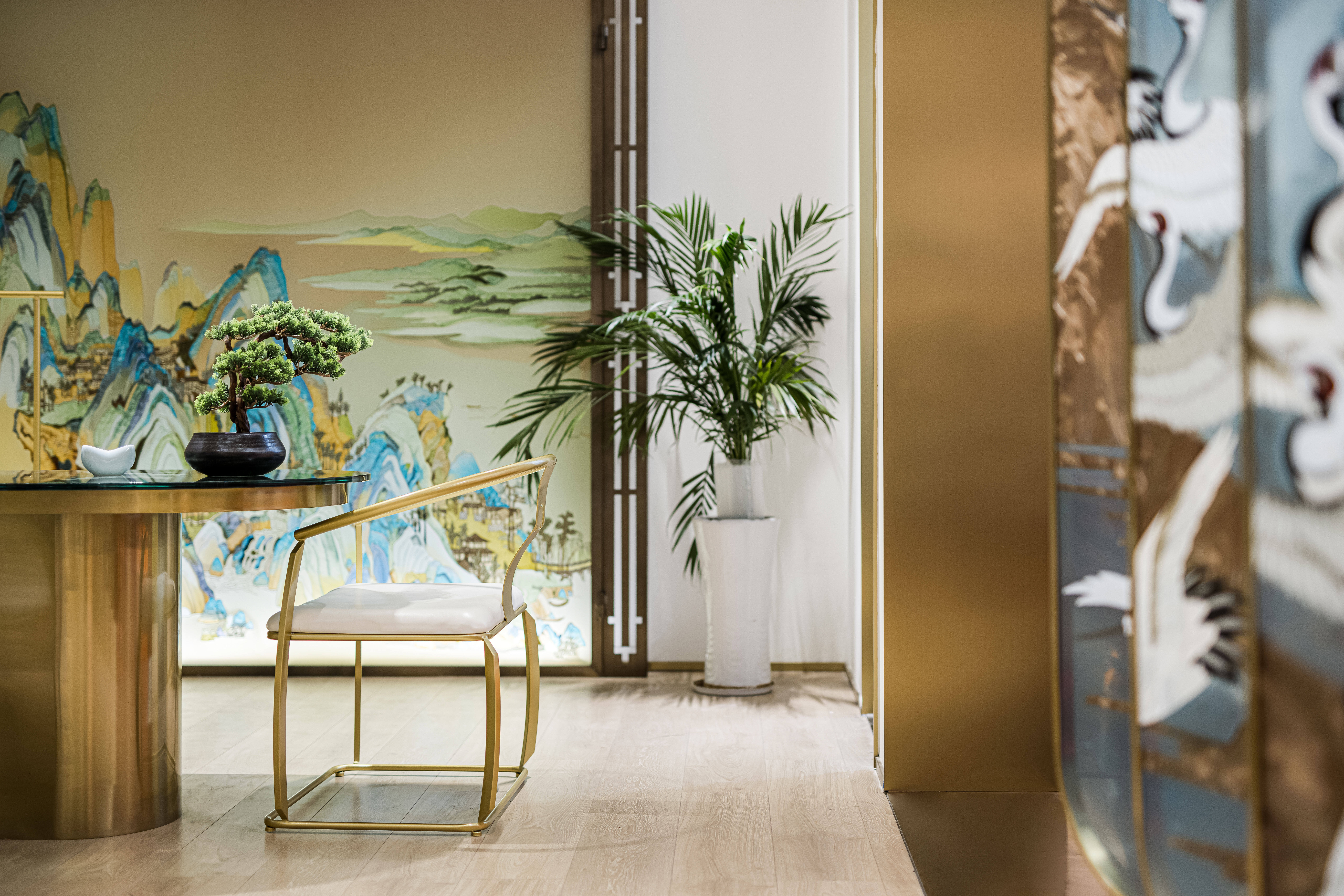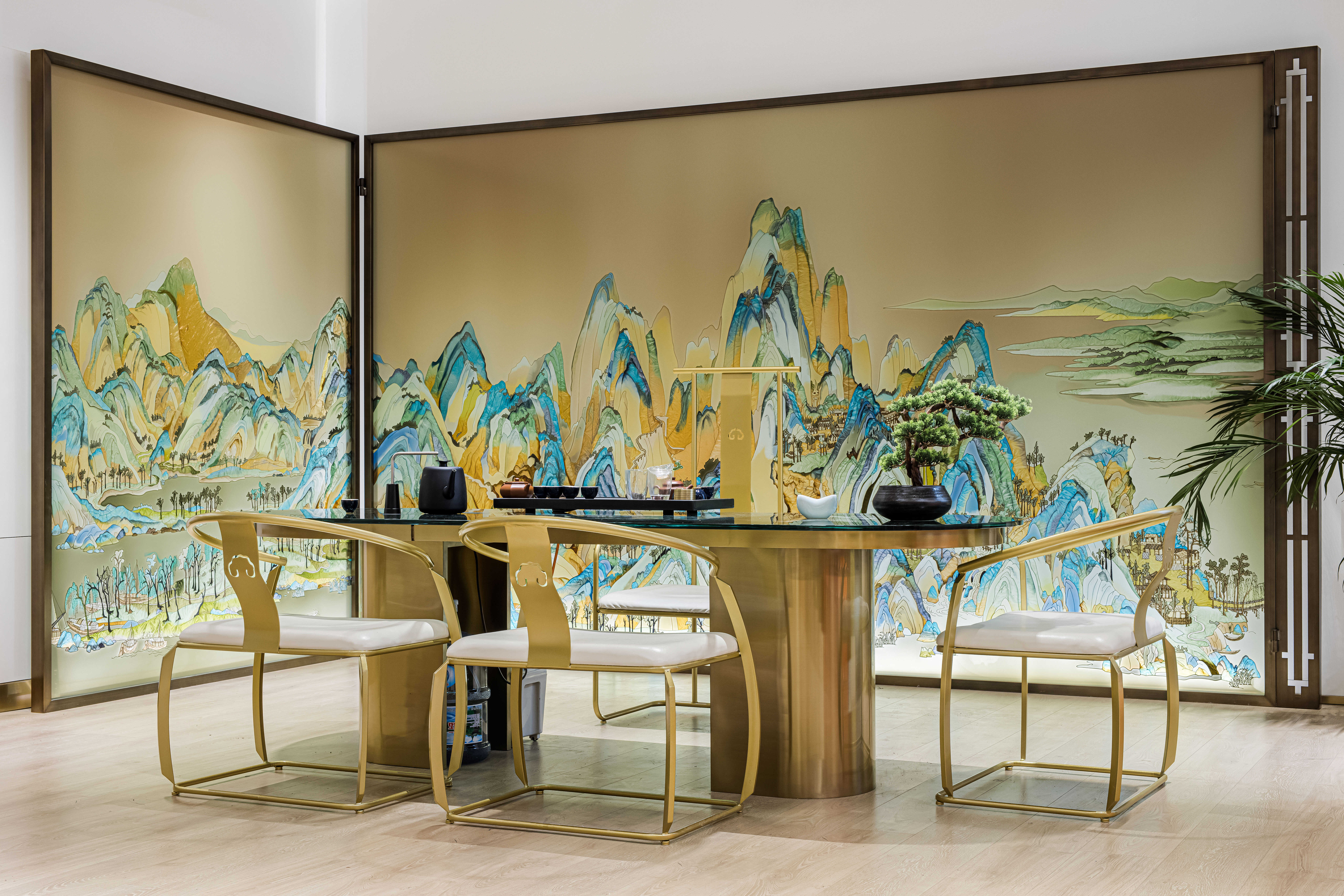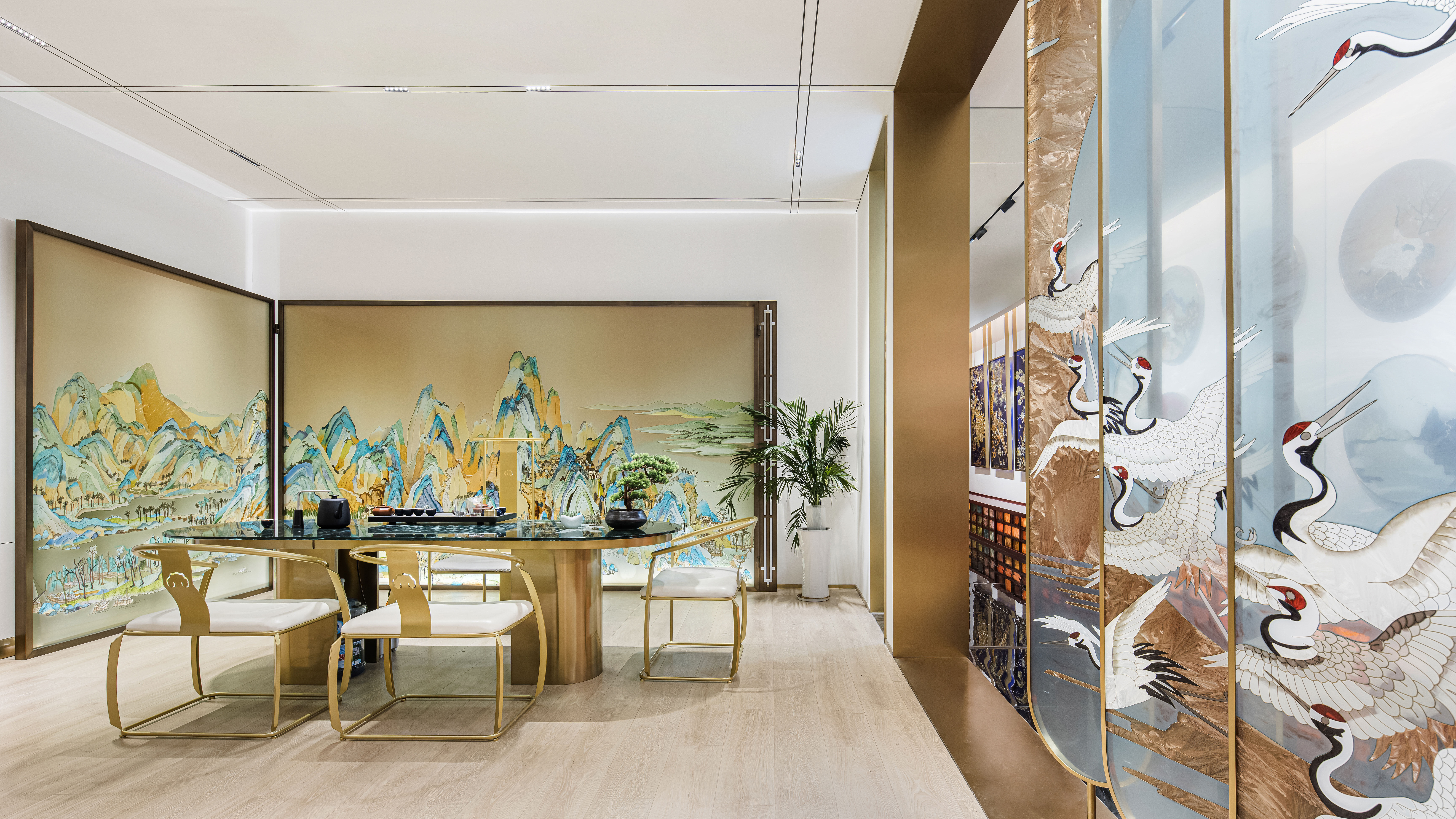 项目定位:摒弃传统的展示,让产品艺术化的融入到空间里,让展厅像个小会所一样,把产品运用到外面的门头广告,里面的桌子,屏风,茶几,隔断等功能产品上