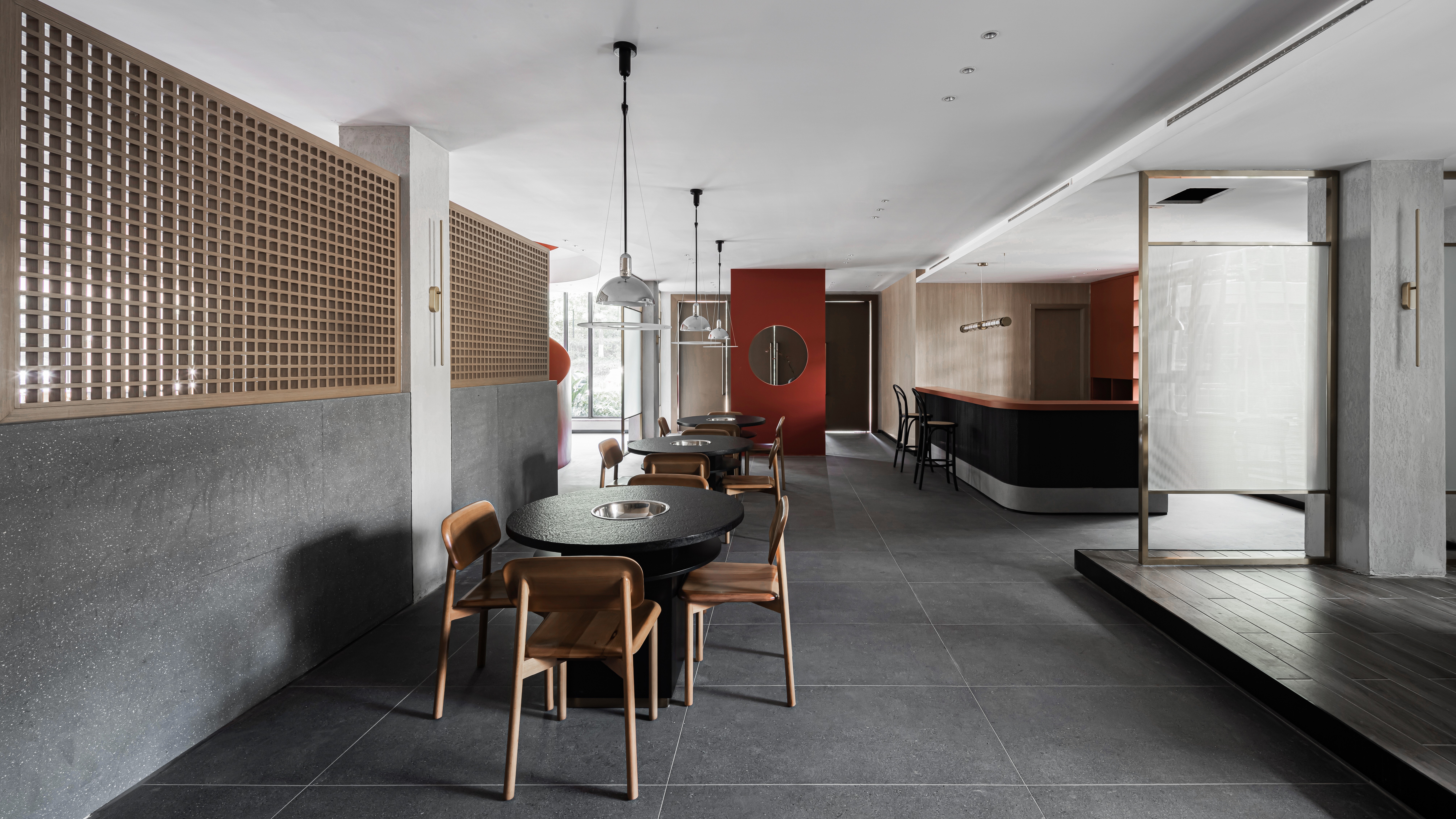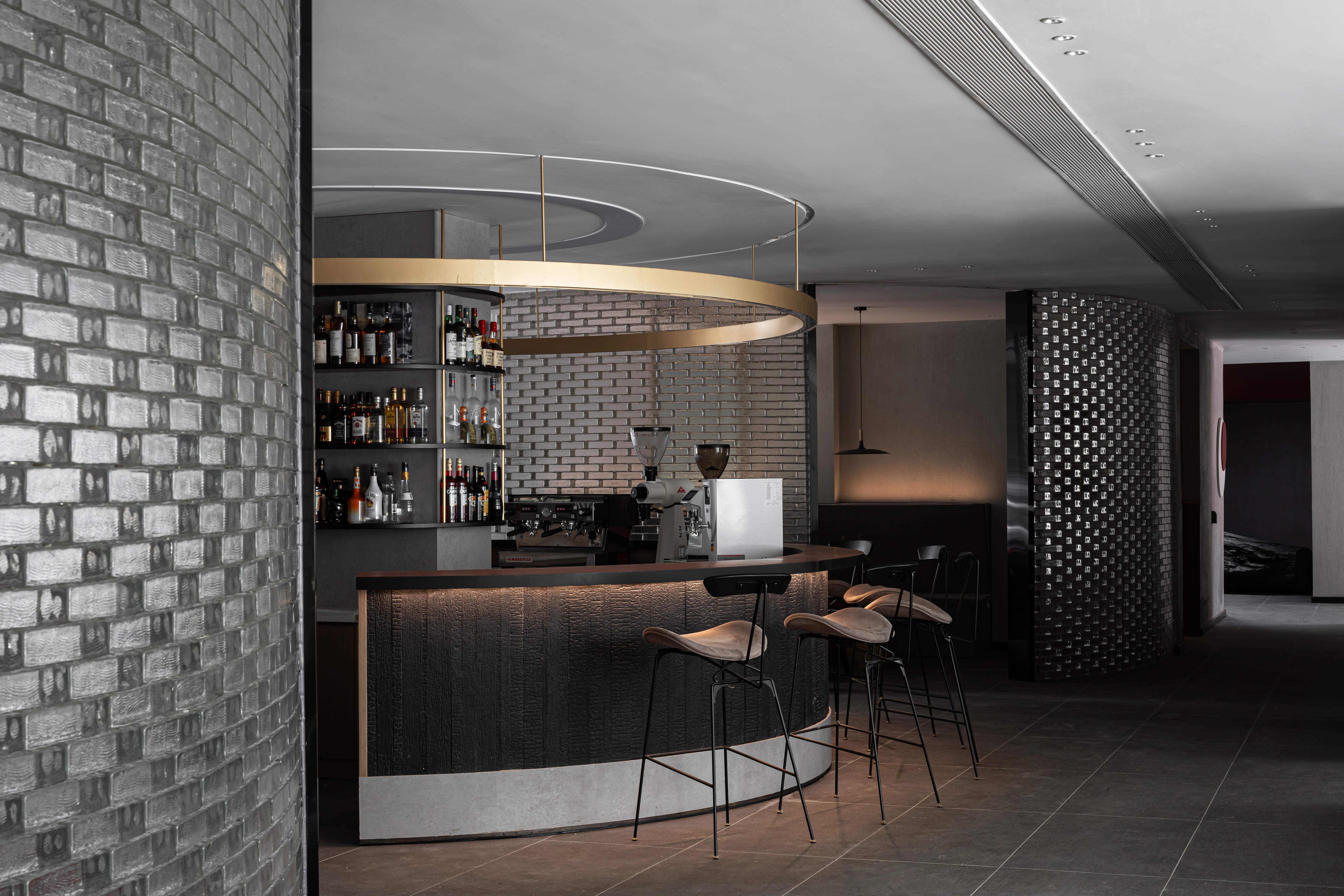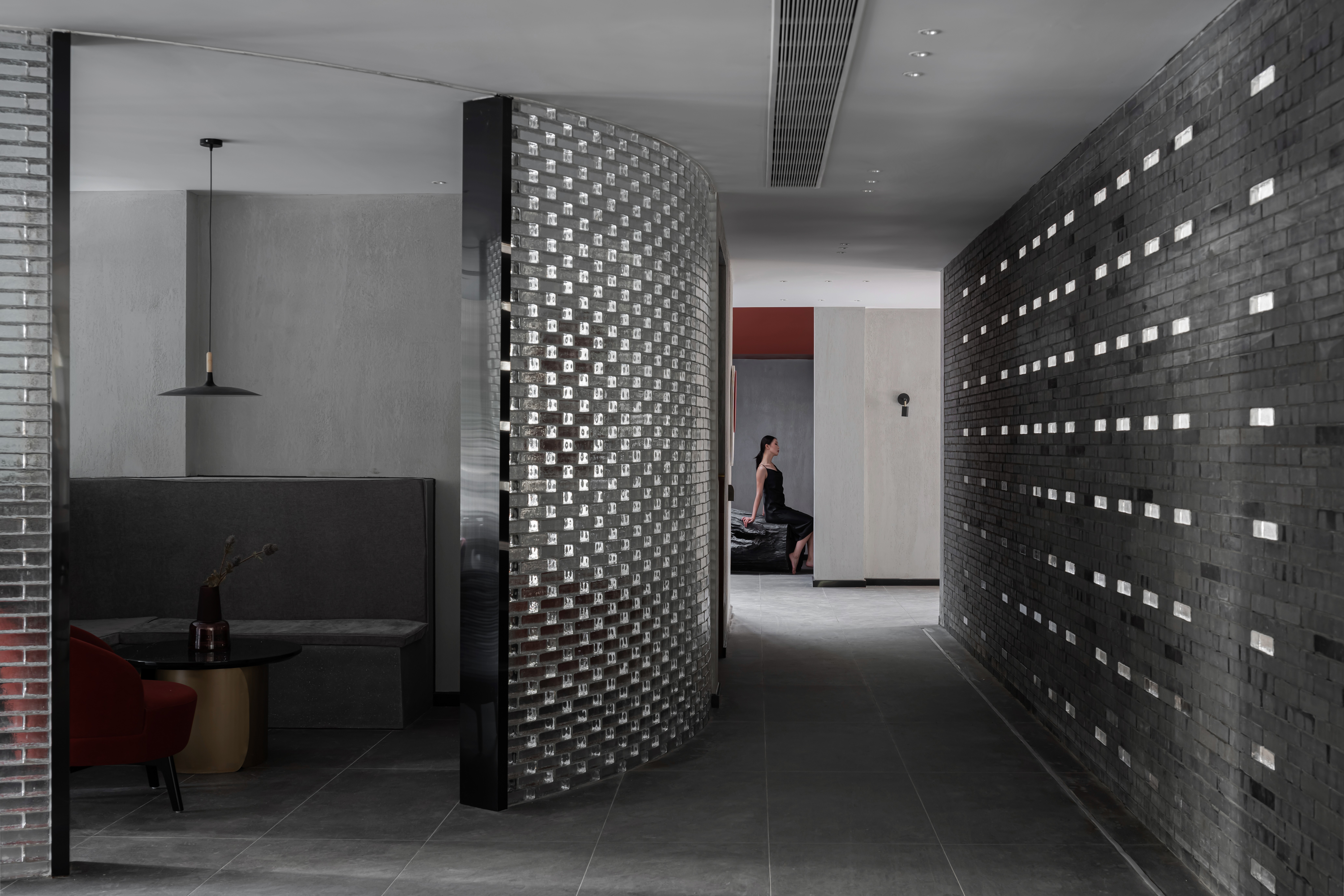 空间意境:在空间的设计过程中,客户希望有更多的元素能够吸纳不同年纪段的客户群体,以提高此商业空间的营收。我们采用了比较传统的中国故宫红,以及青砖等传统装修材料。另外使用了玻璃砖与少量的金属,让整个空间有一种传统与现代的沟通对话感。