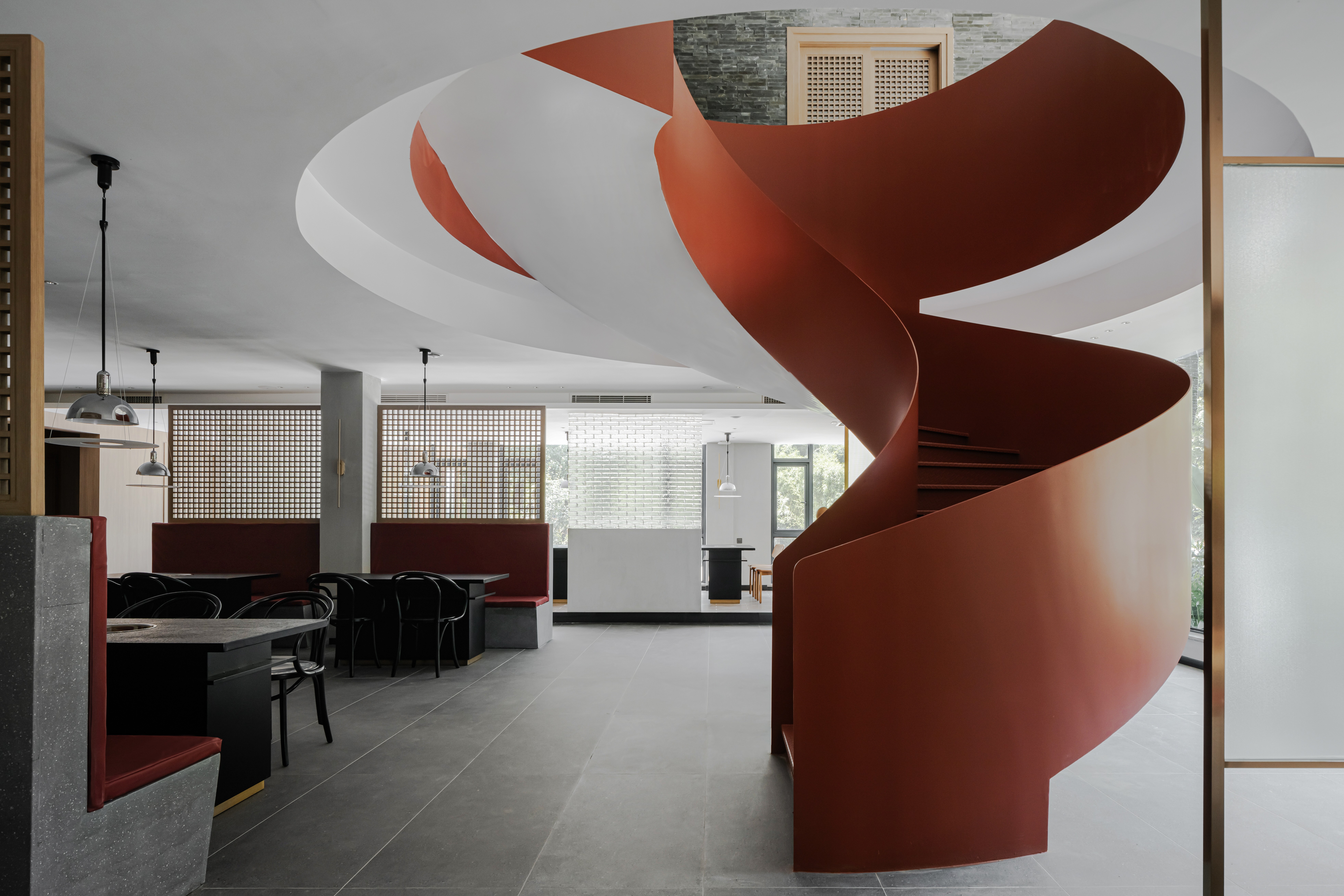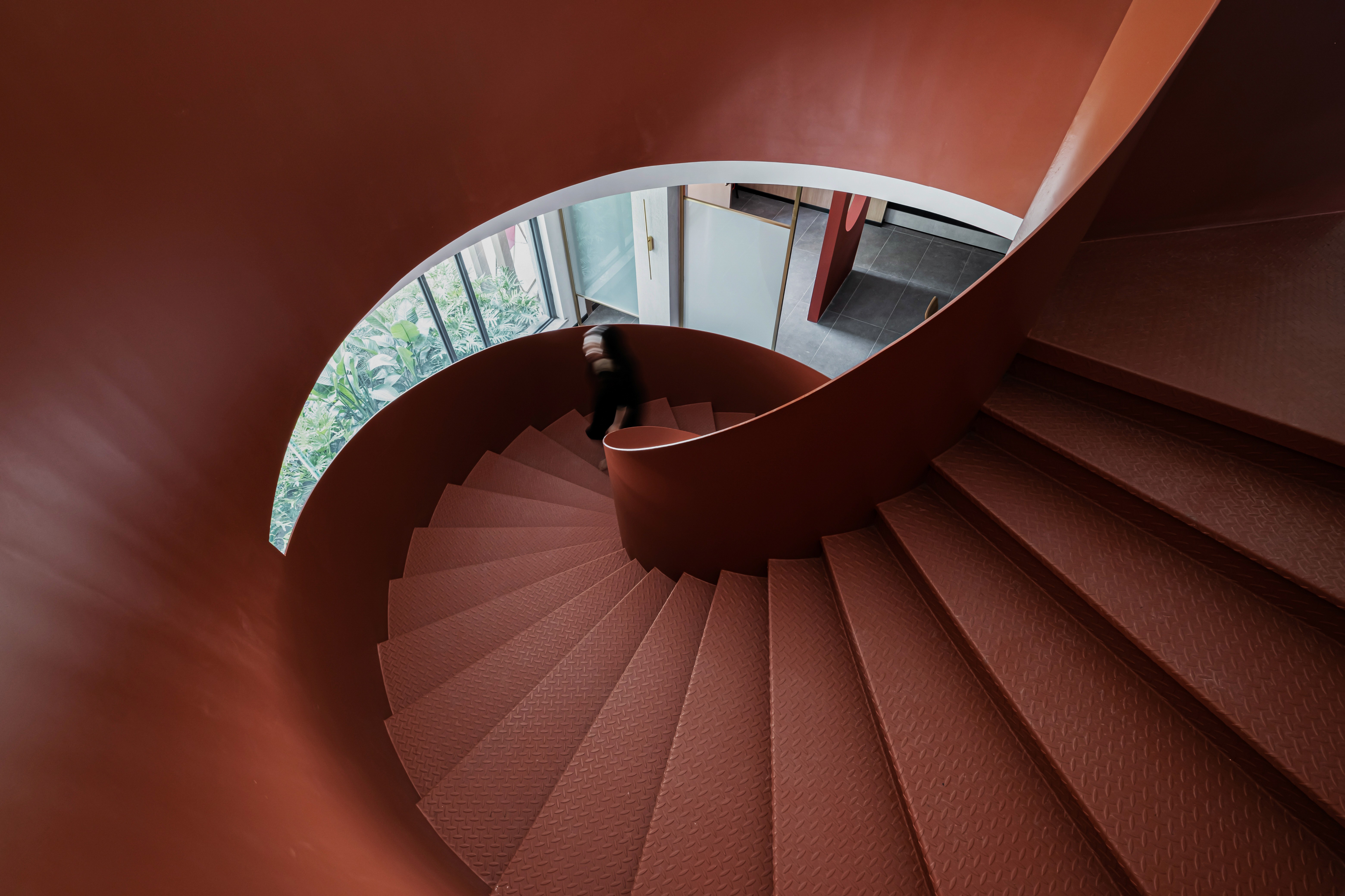 从上往下看,旋转楼梯仿佛一朵盛开的花朵,绚丽绽放,点缀着建筑空间,永不凋谢。