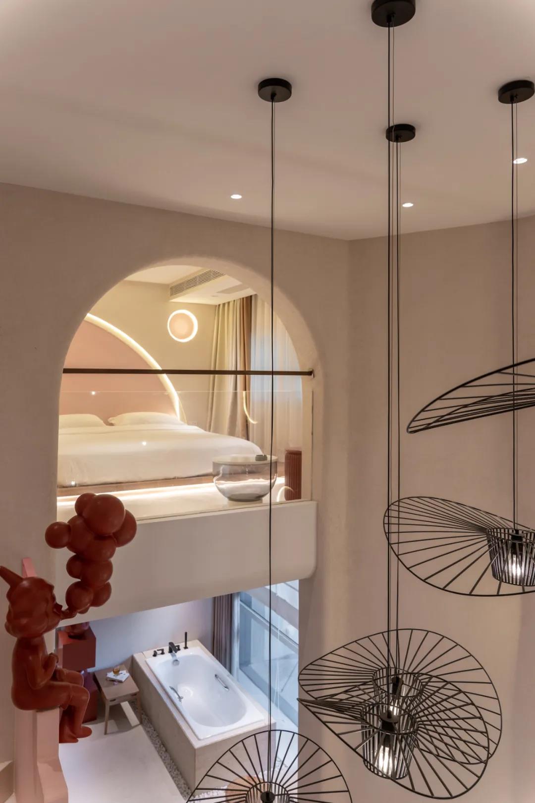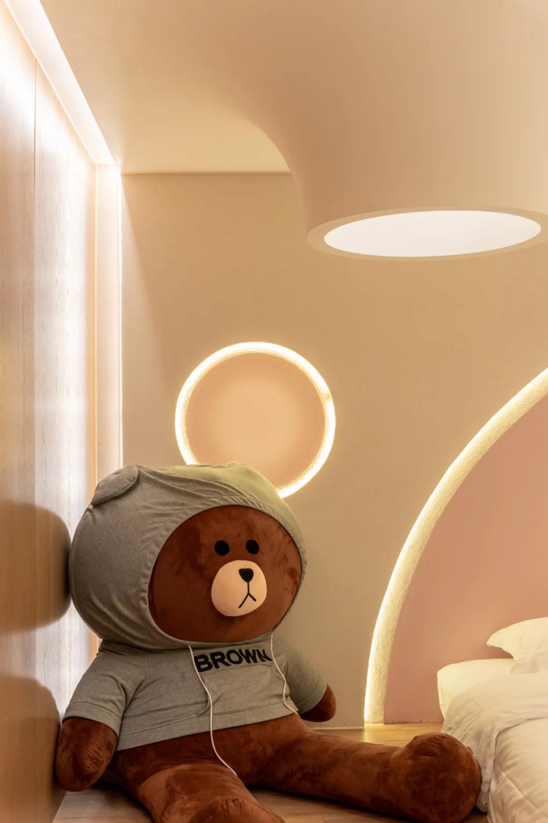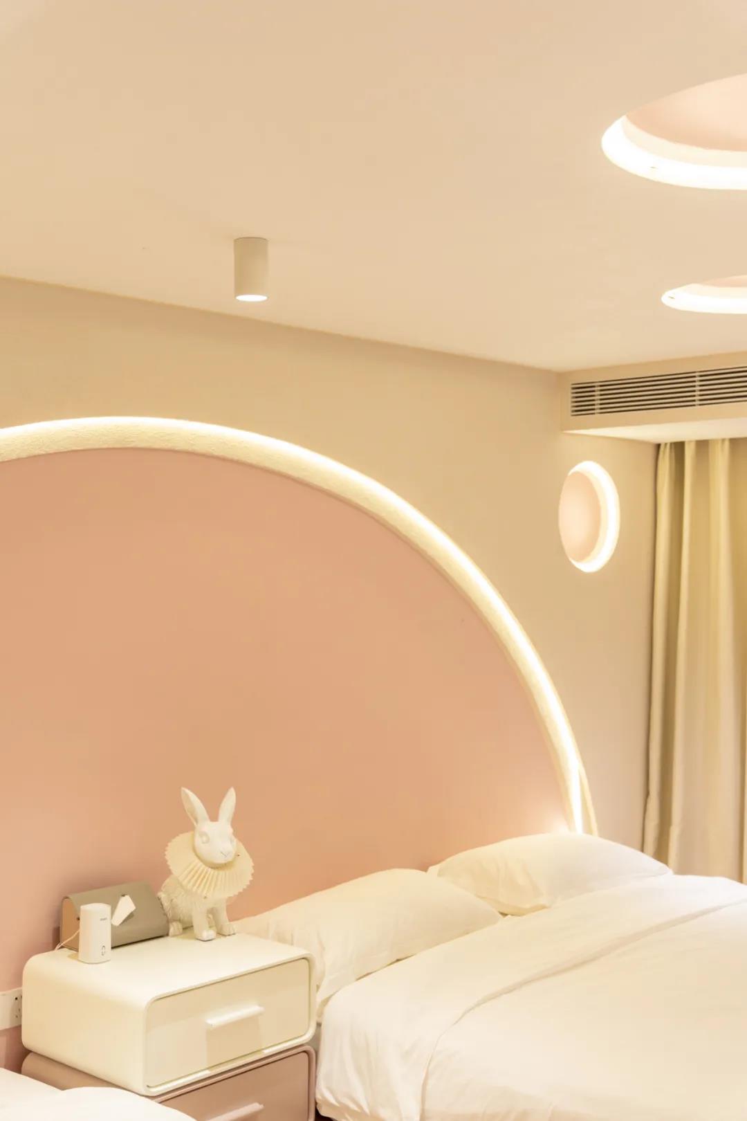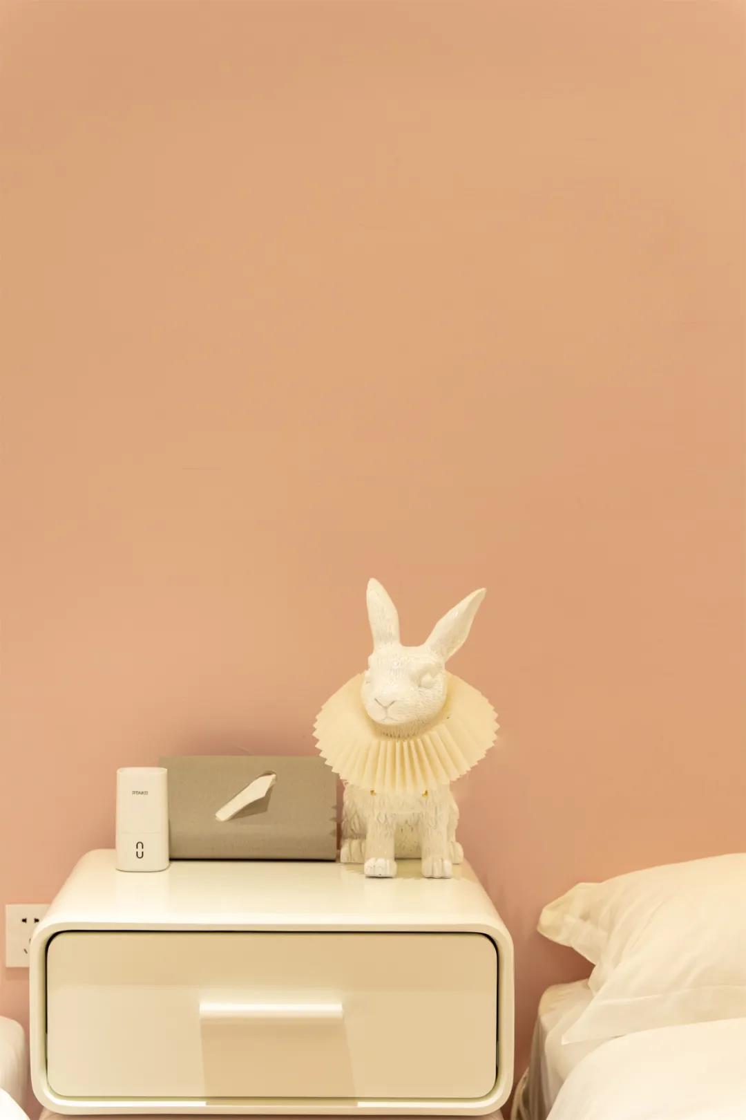 卧室外的拱门增加了仪式感,床头的装饰像是从爱丽丝梦游仙境里跑出来的白兔先生,融入梦幻的灯带,仿佛要跳进每一个人幸福的梦里。