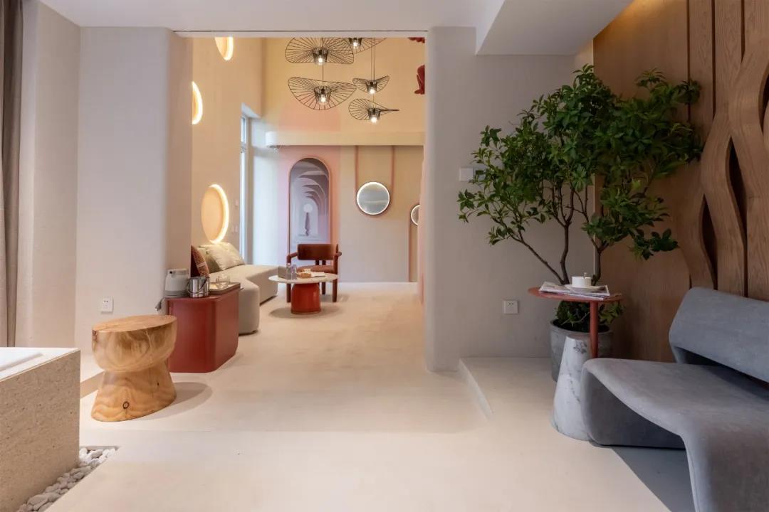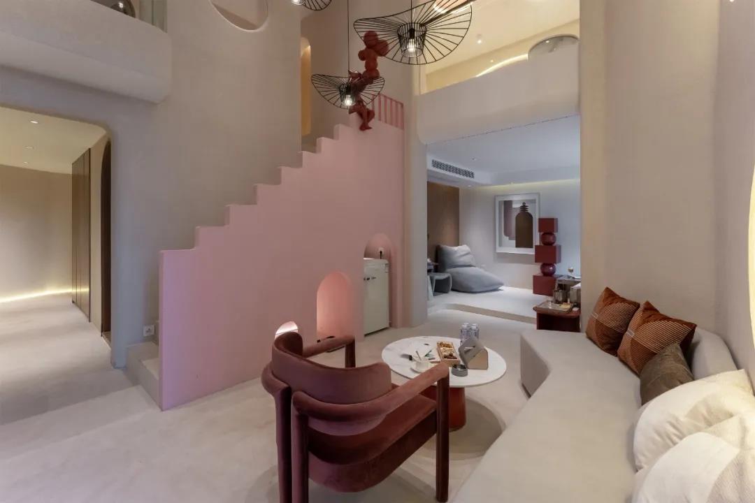 户型2总面积94㎡,设计师从空间形态、材质、光影、营造未来神秘空间,以“未知、好奇、探索”主线构建一个不仅舒适而且乐趣横生的空间。整个空间的特点是温柔的色调和简洁的建筑线条,起居室整个空间戏剧性,纯粹通过体积和几何来实现。