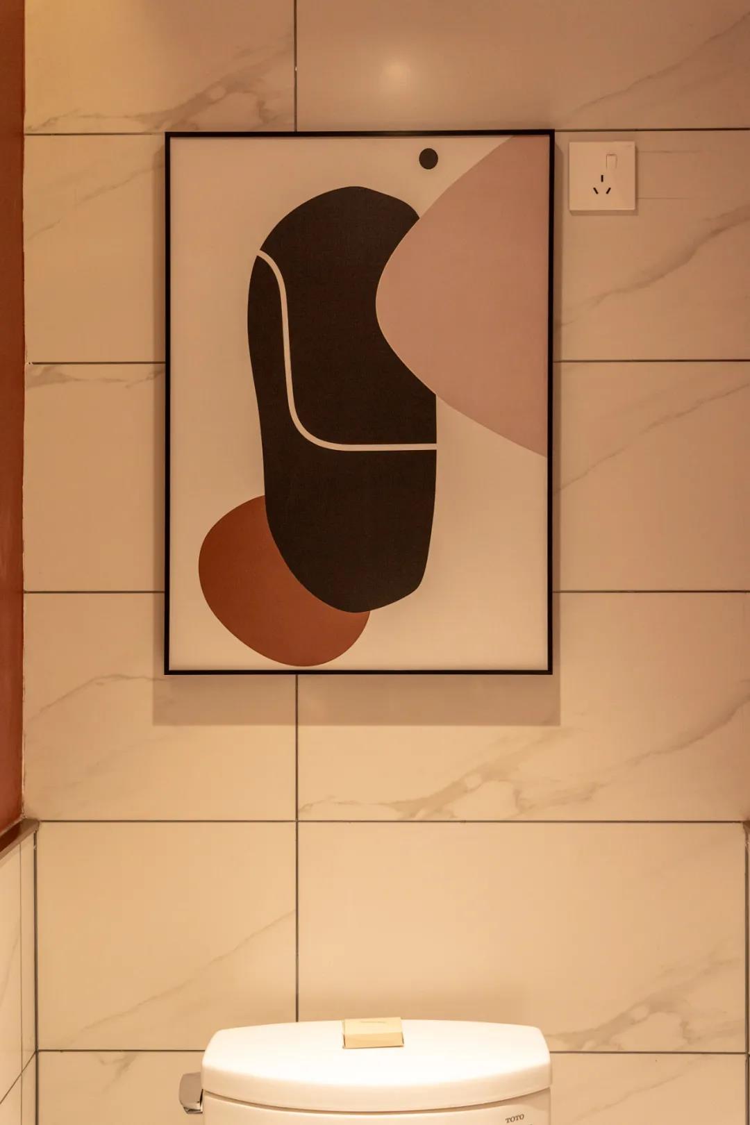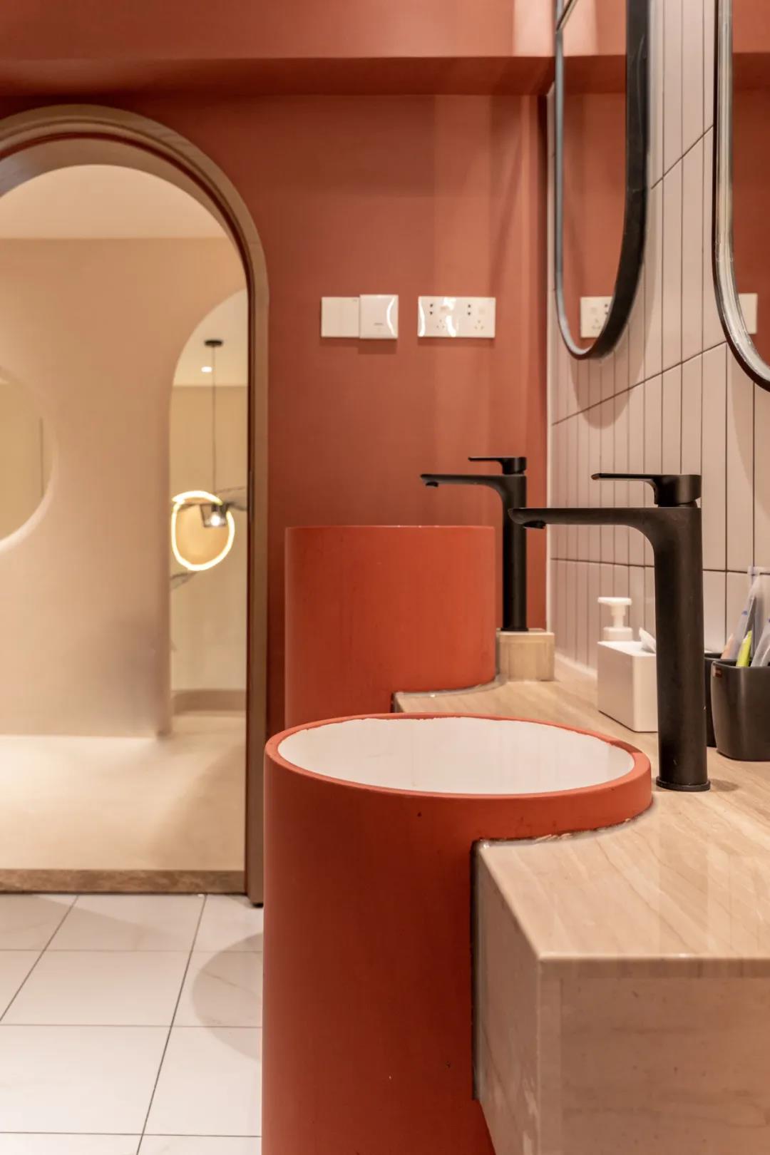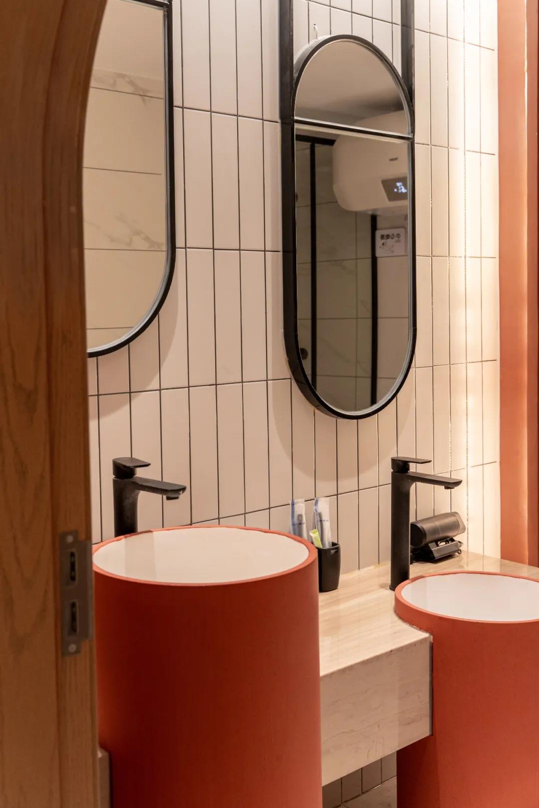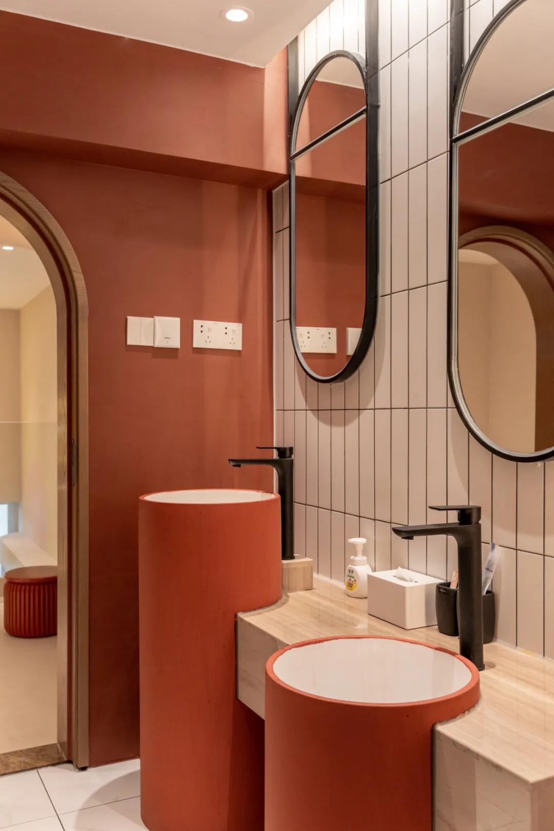 有趣的几何元素不论在哪个空间都是不可缺少的,洗浴室的镜面、储物柜、洗手池都有着圆润的边框,看起来十分招人喜欢。