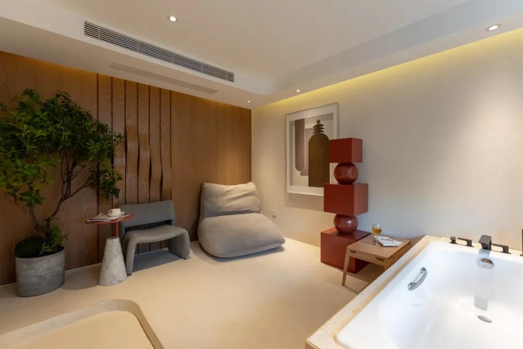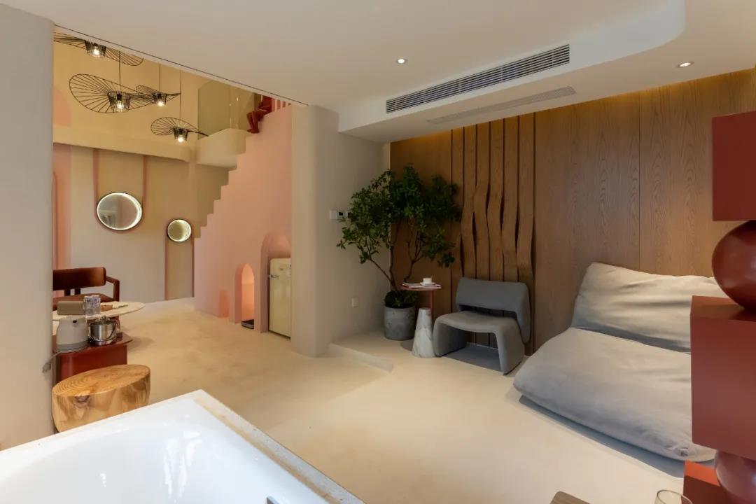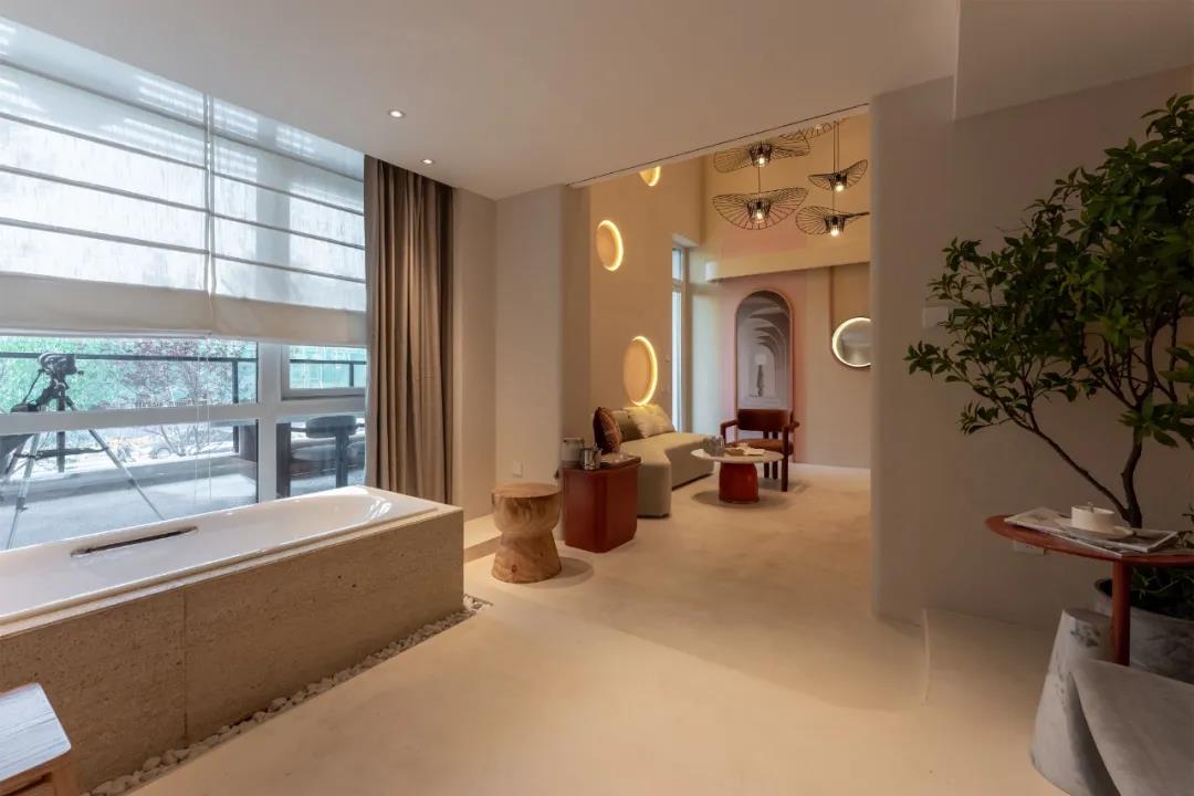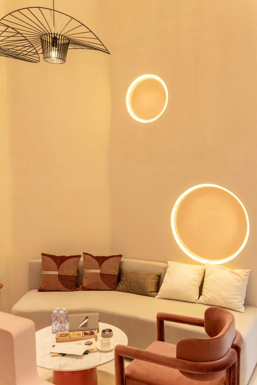 墙面上镂空的环形隐藏光源,配合壁画给人一种神秘而无限延伸的视觉,整体空间在梦与真实之间完美切换,不论是色彩还是营造的氛围来看,都非常的大气。