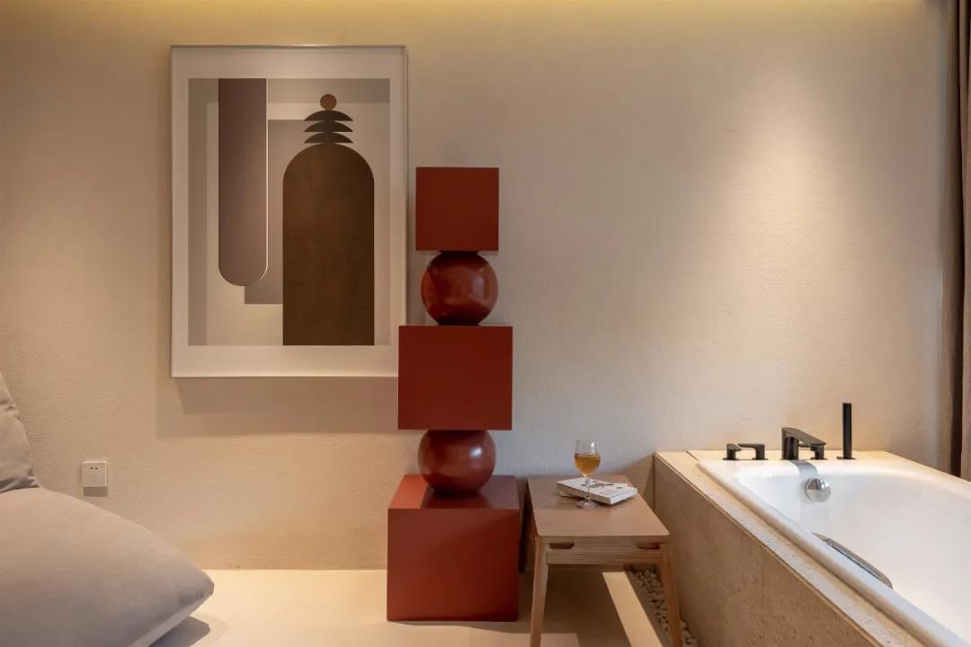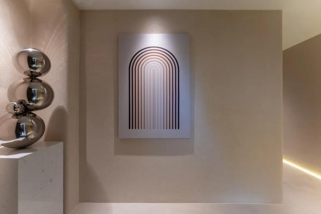无论是墙面的装饰,还是整个走廊,用质感搭建了不同的几何结构,狭长而有棱角,构建出视觉错觉,设计师用空间和视觉开了个“玩笑”。