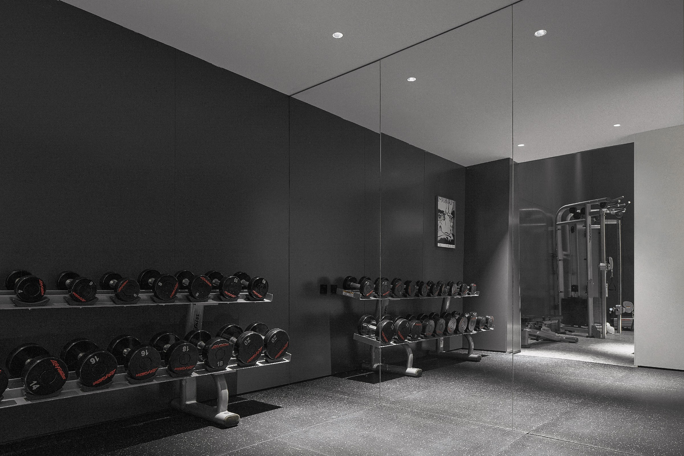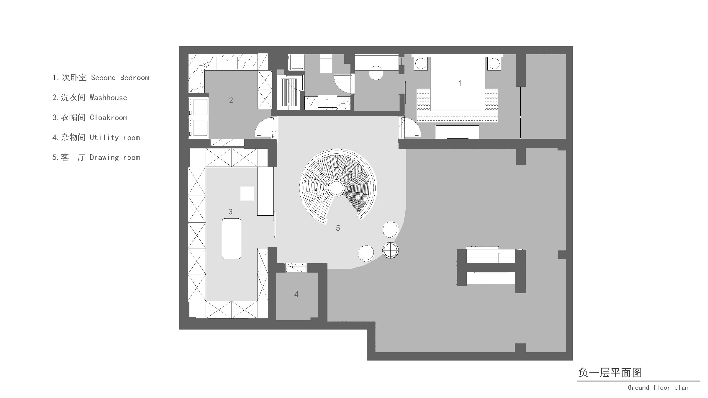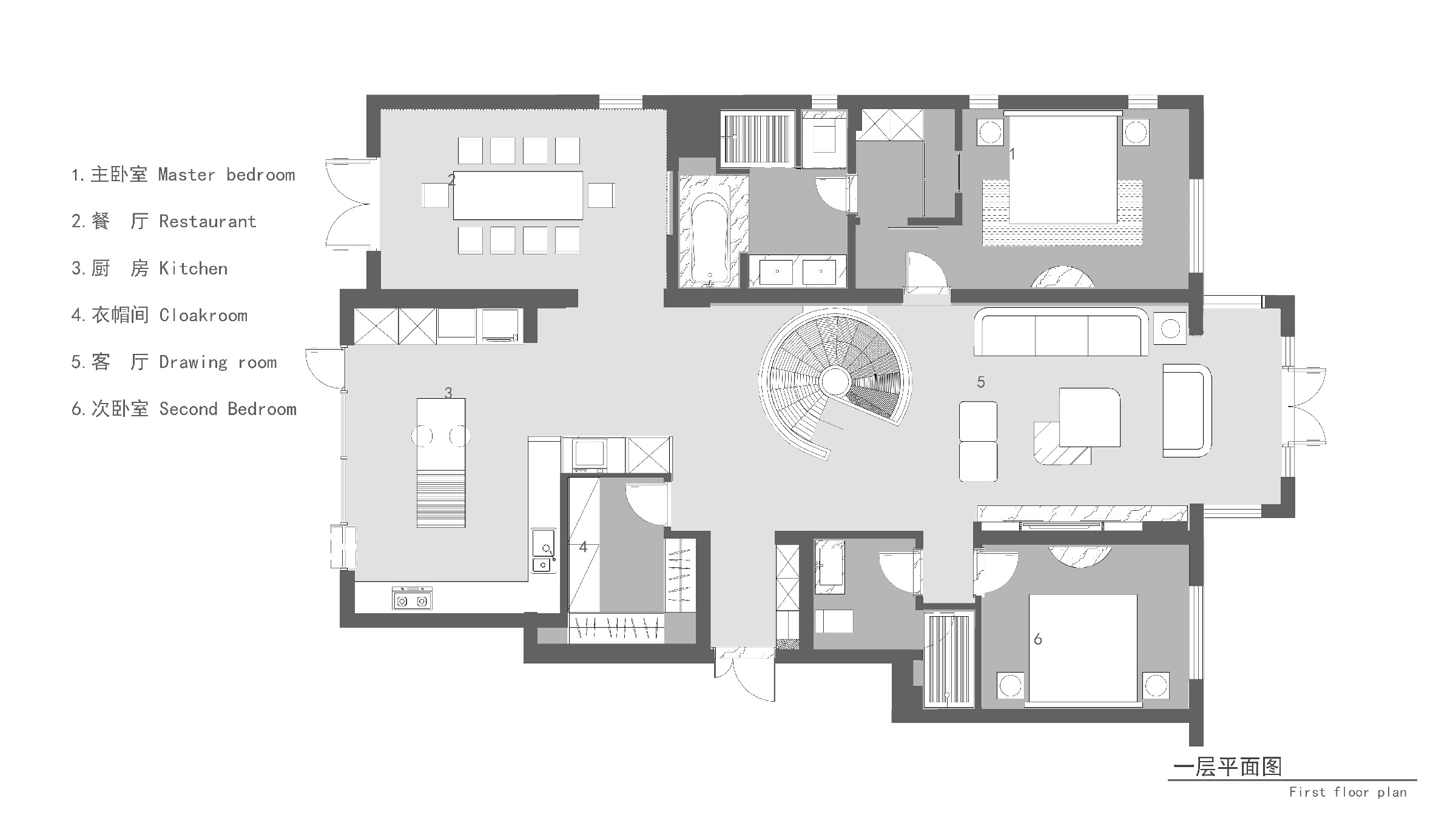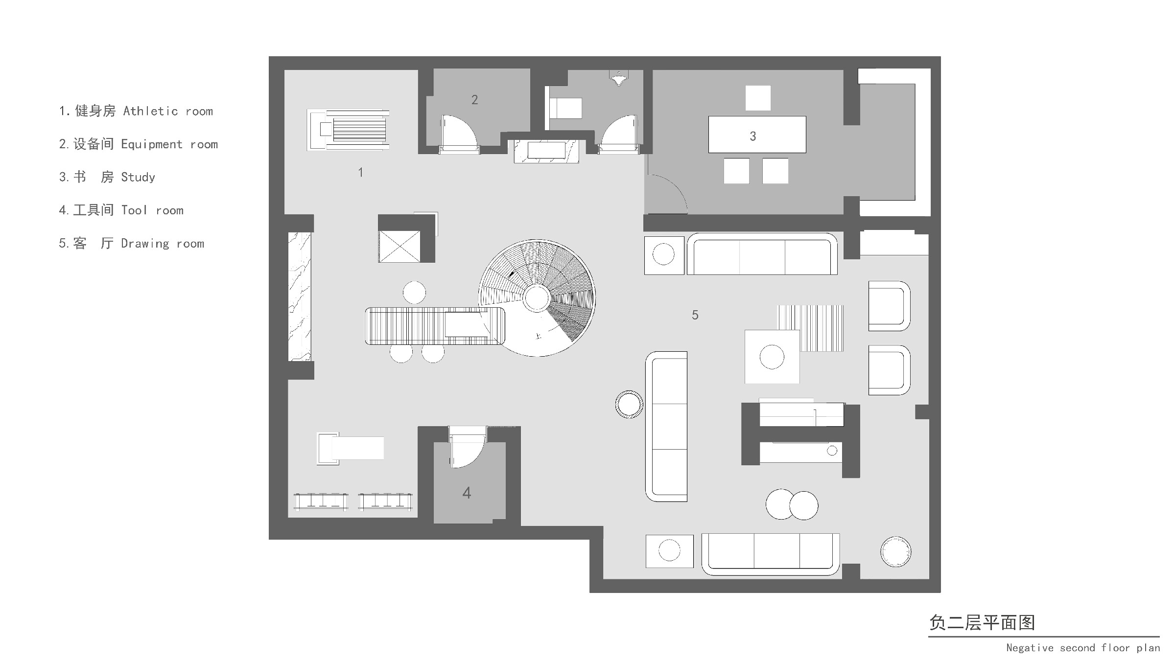 负一、二层是业主面对自我独处空间,更重要的是构筑精神世界。以艺术楼梯为核心,健身区、书房、会客厅、水吧区、环绕排布,建立空间秩序,实现顶级酒店般的居住体验。