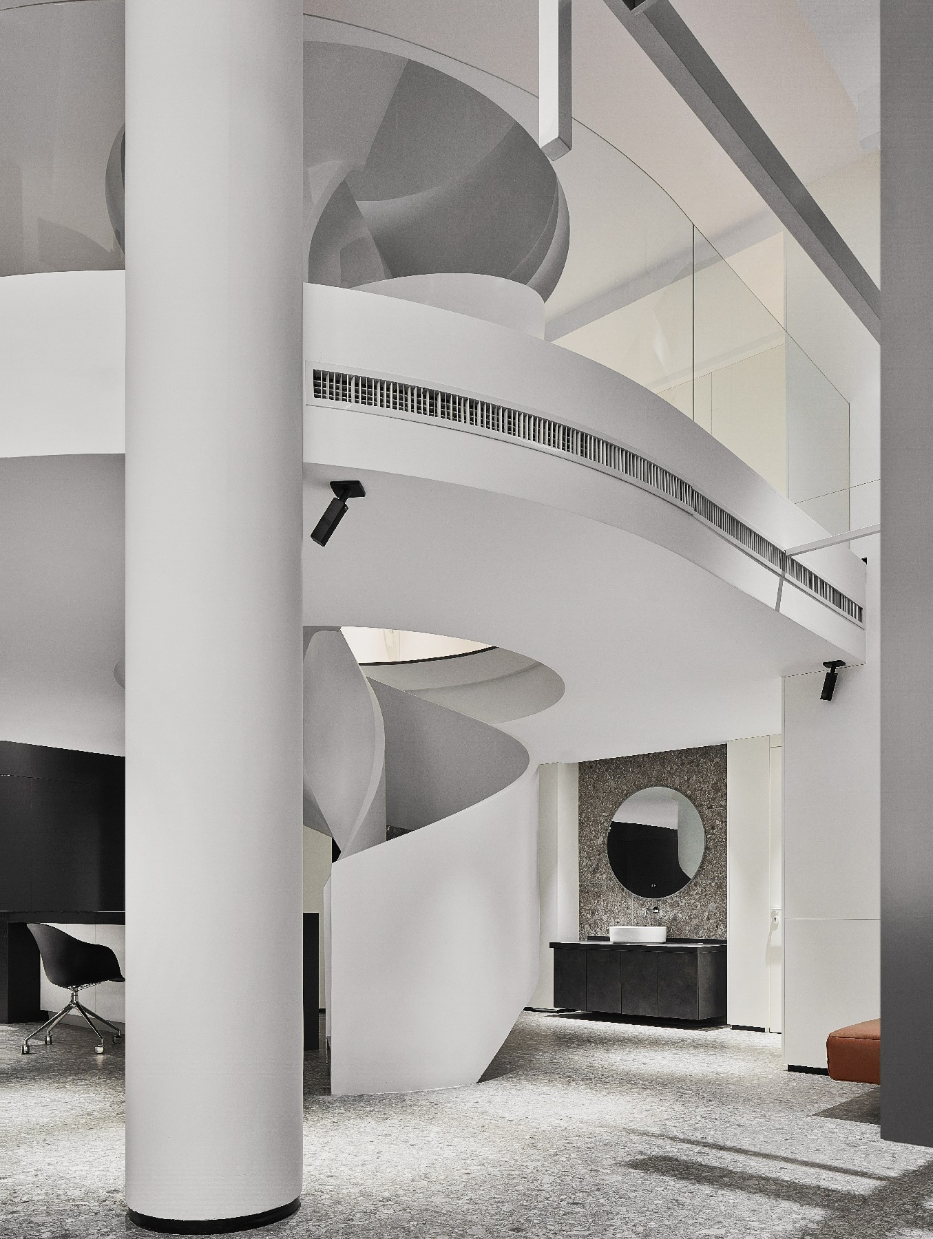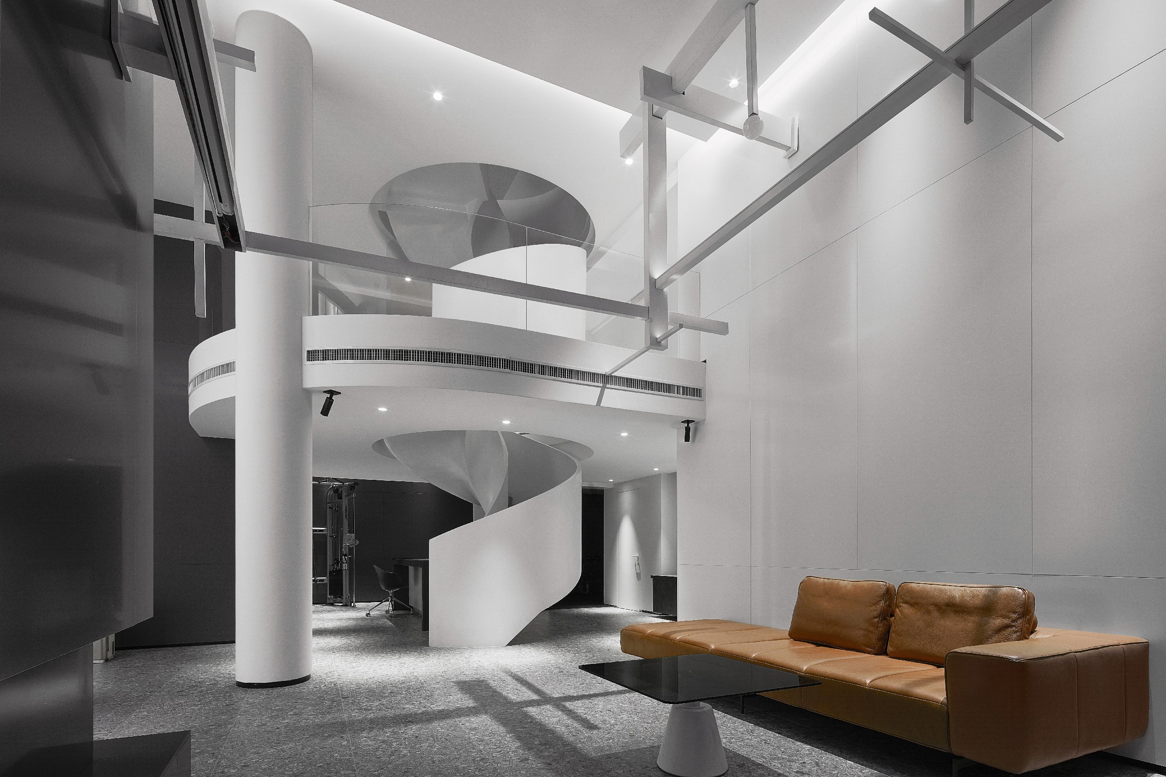 旋转楼梯形成类似DNA螺旋的造型,获得一种盘旋感,联通了本身分离的一层二层,强化了整体视觉张力。