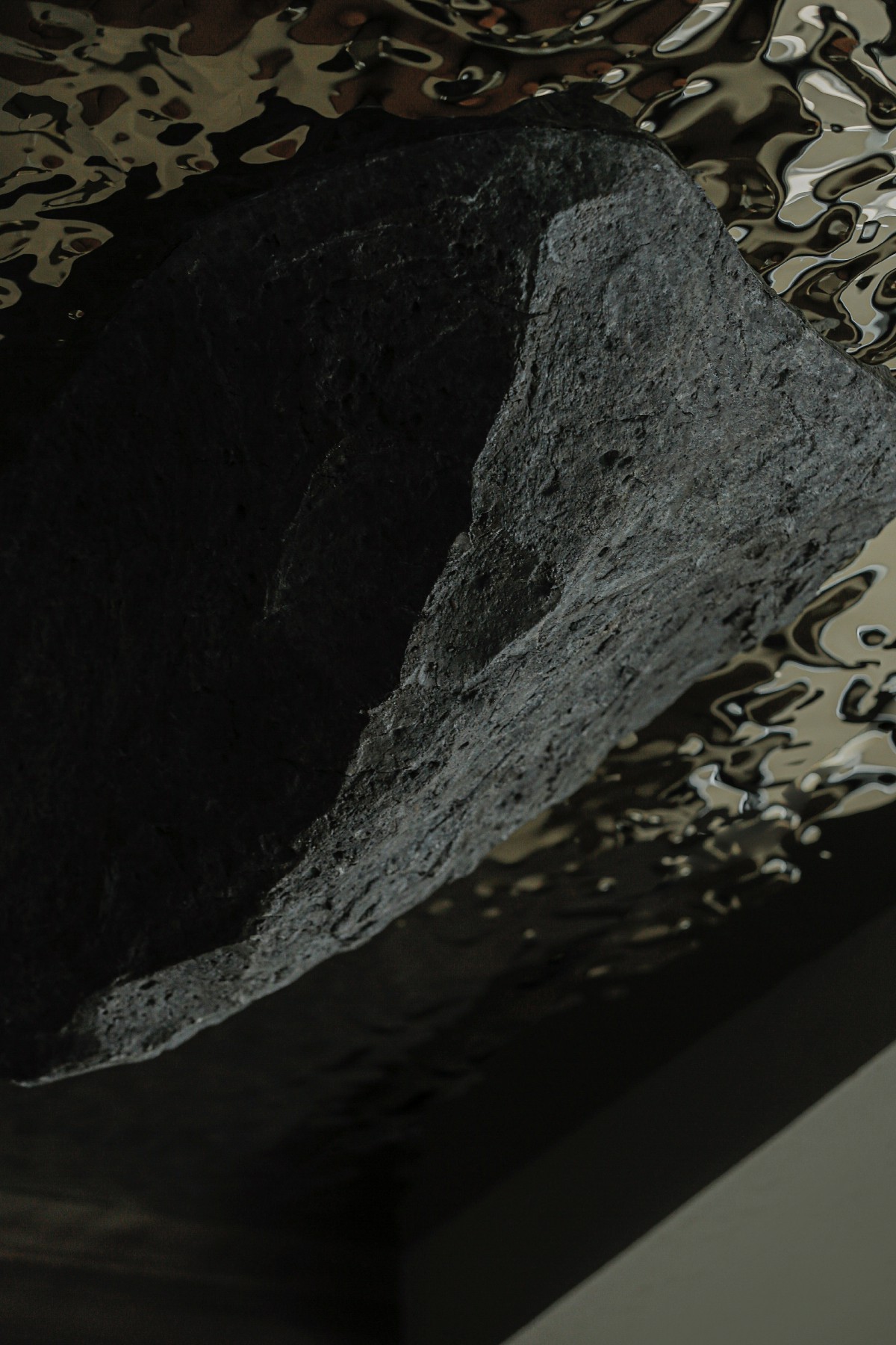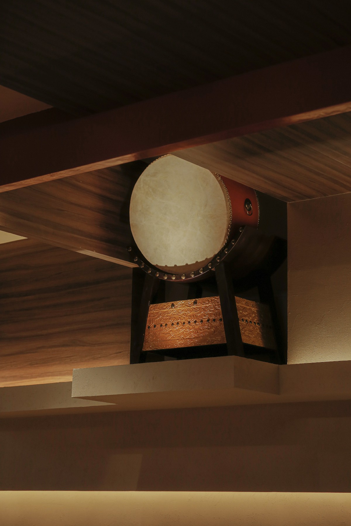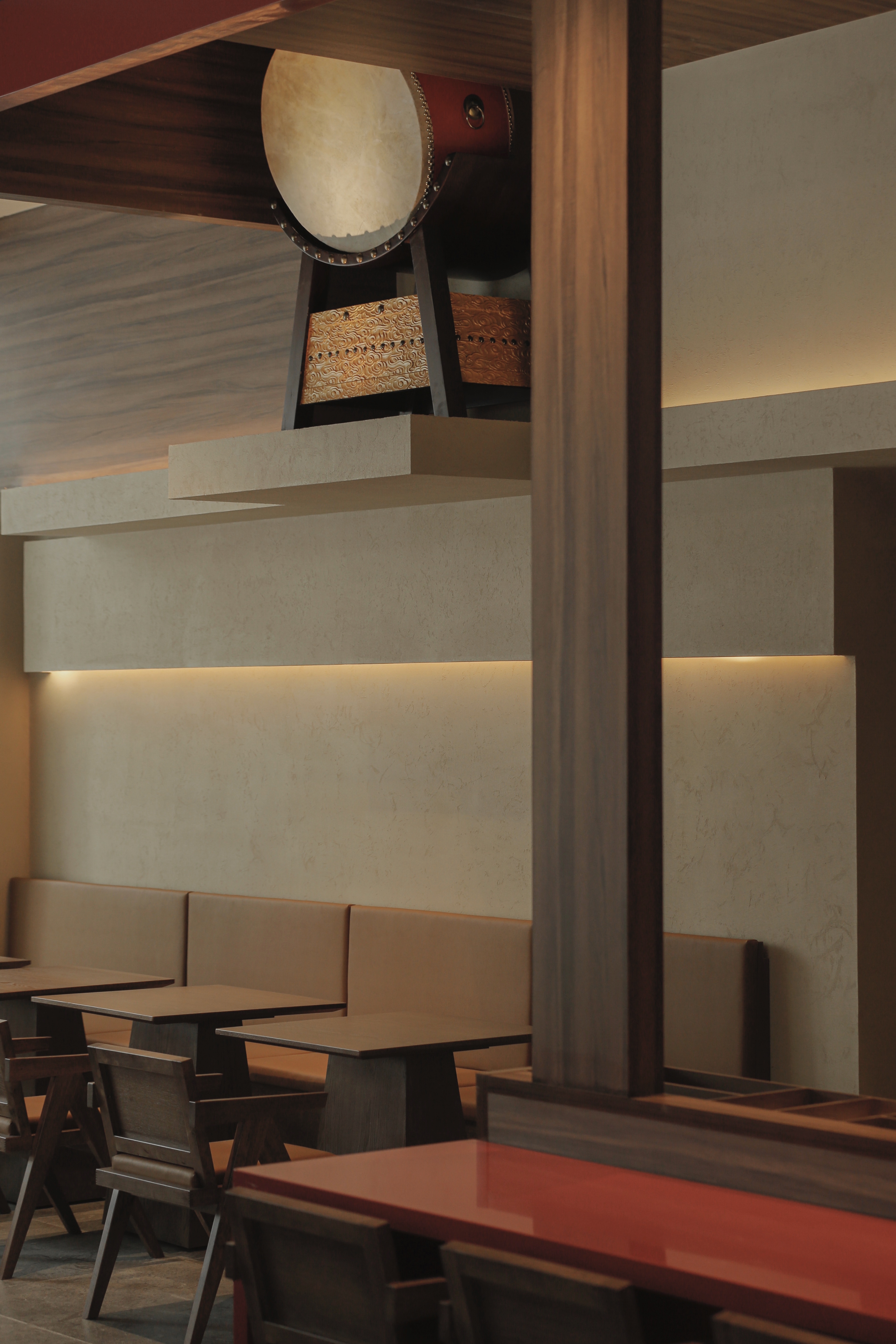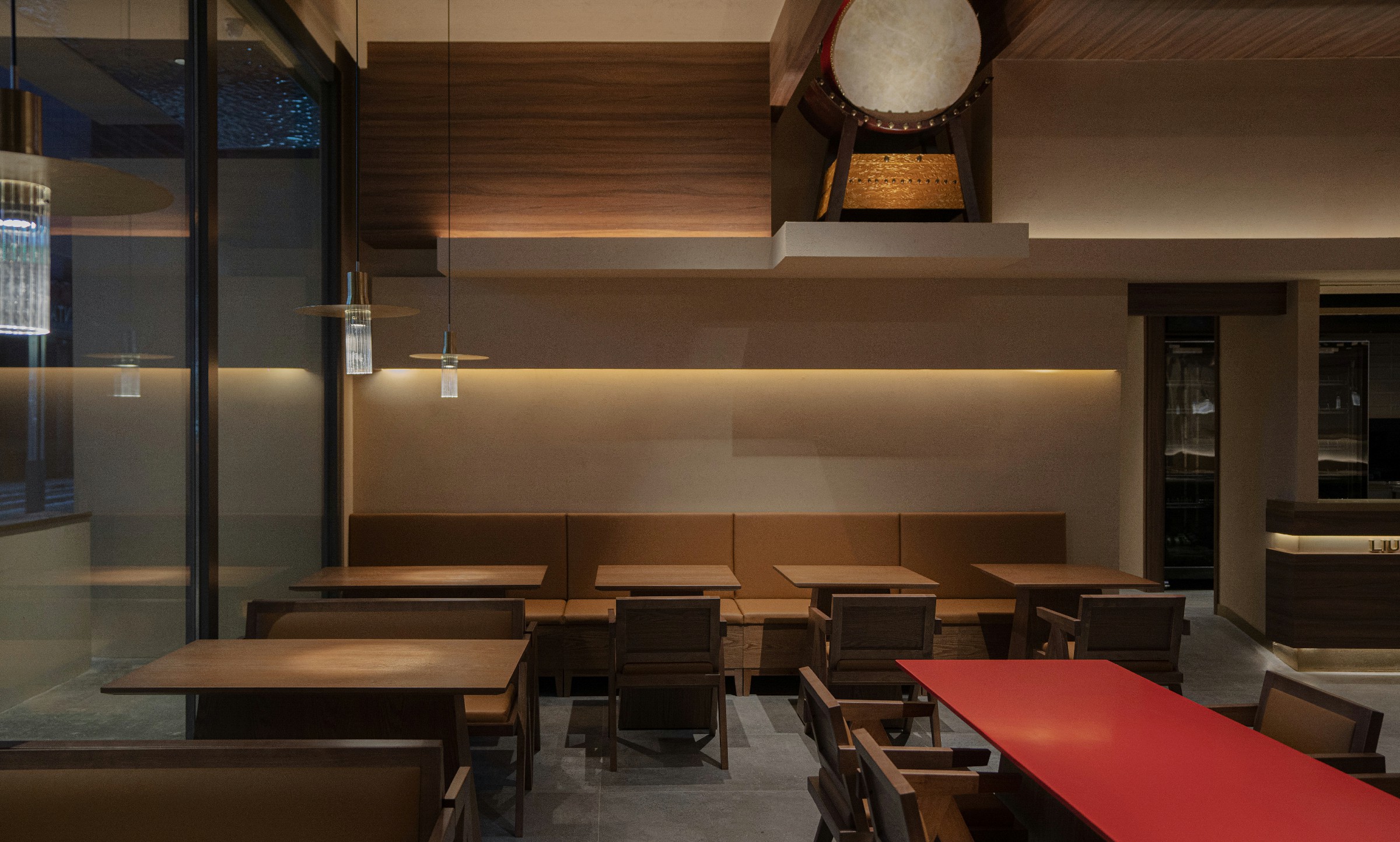 室内设有象征着陕北元素的红腰带、红腰鼓,石榴花自由呼吸,取一瓢奔腾汹涌的黄河水,浅浅地倒映在天花,都市人来来往往的身影被揉碎在镜面中。