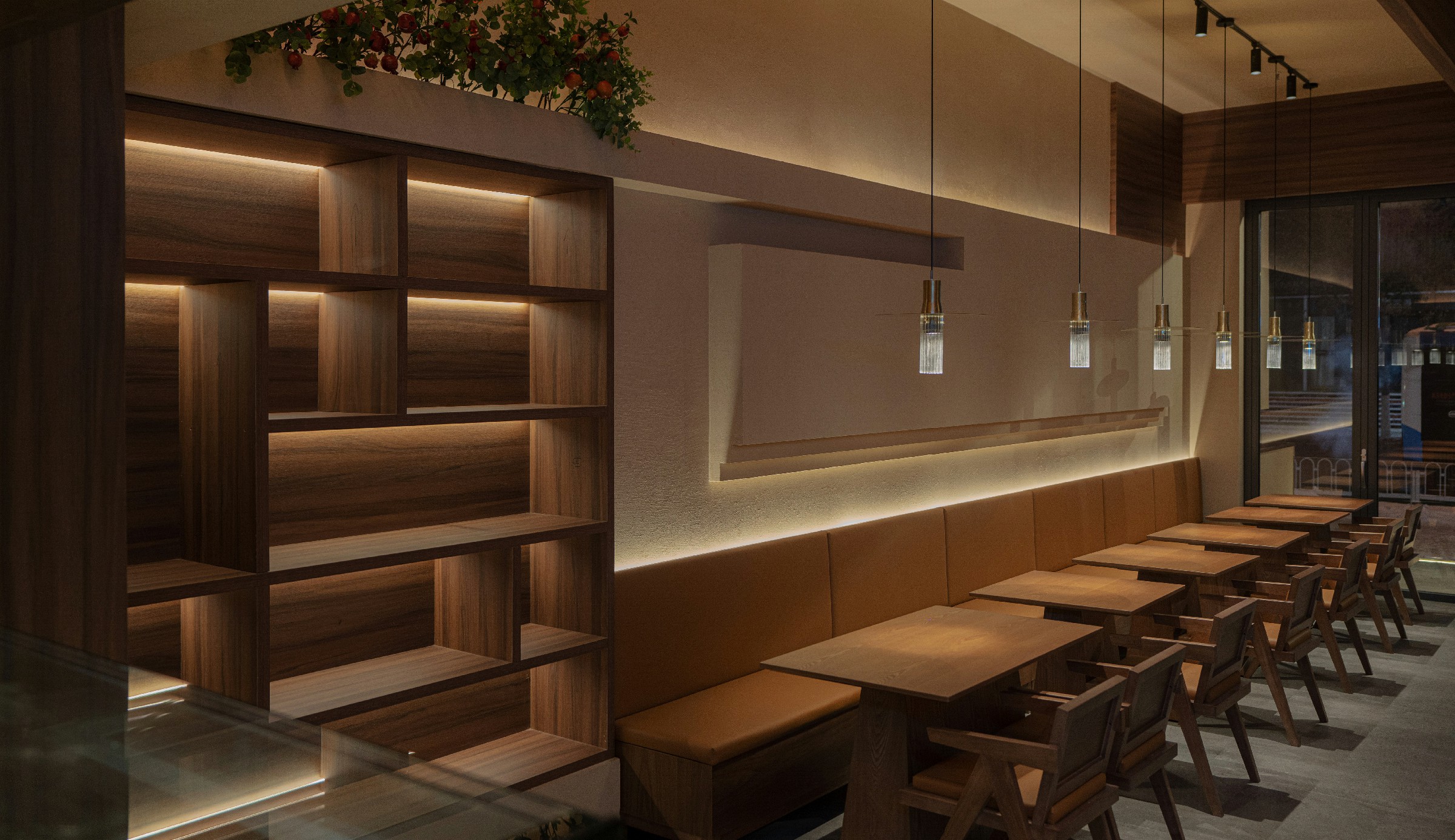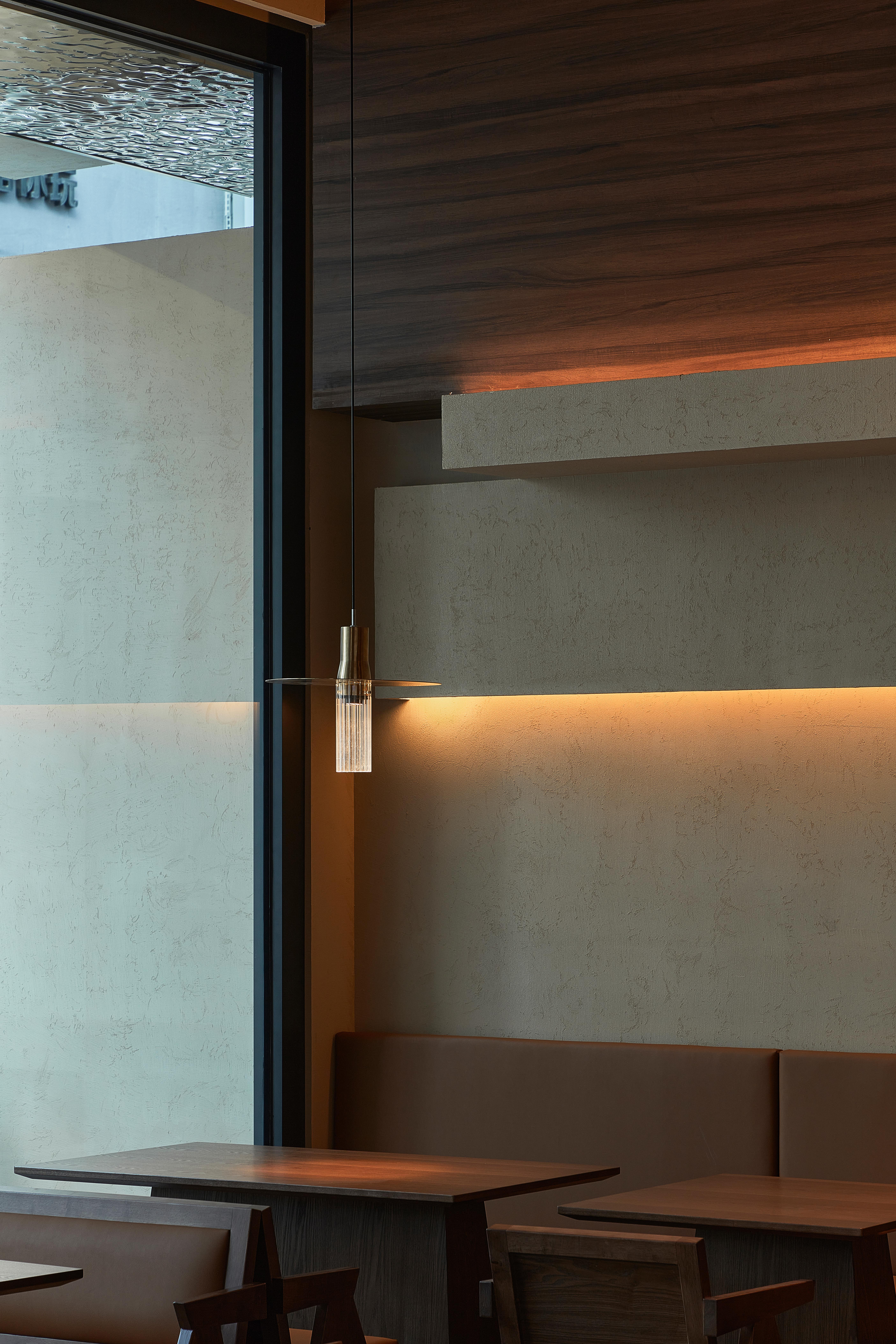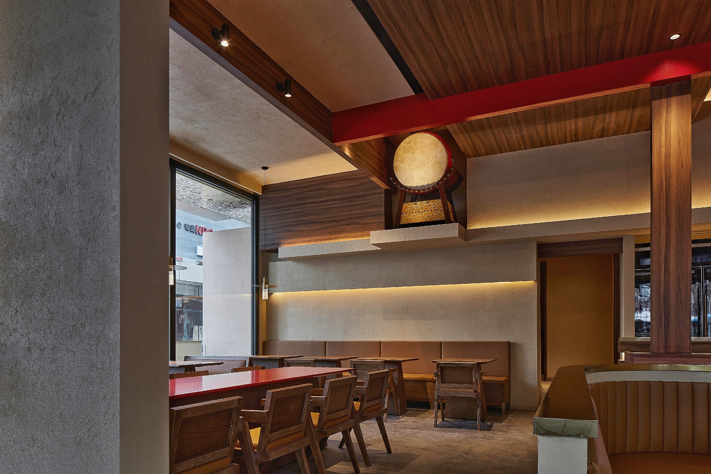 巨幅落地玻璃窗,可完全敞开,神奇地创造出一片衔接室内的灰空间,这一项目的半室内半灰空间的气质,刻画出北方气候下对夏夜街边美食生活的趣味探索,实现了一种里外互通、模糊而美好的“愉悦”意境。