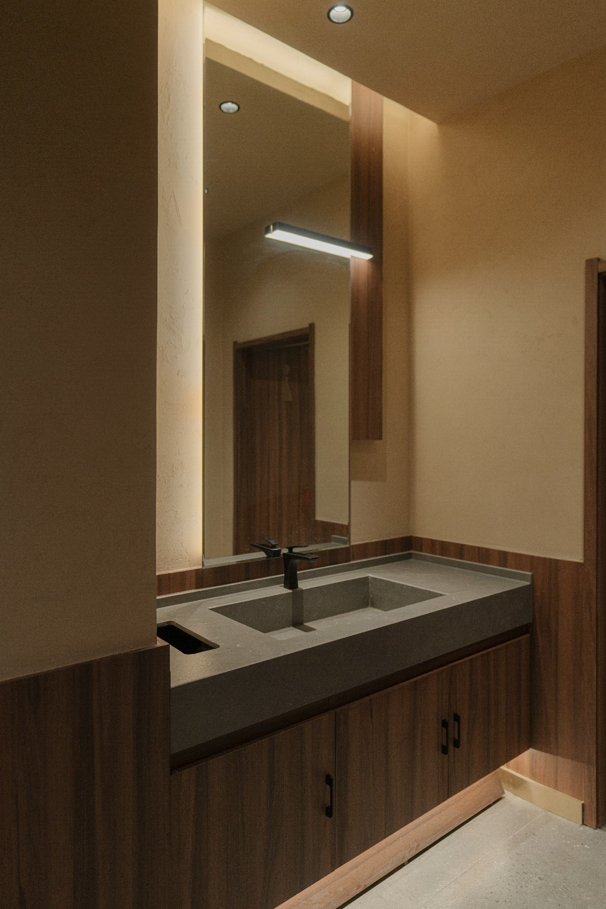室外常用的砂岩、金属板、石材和木材也应用在室内,借此来弱化室内外的分界,强化统一性与相对性,可自动开合的落地玻璃门充当了“交错界面”。