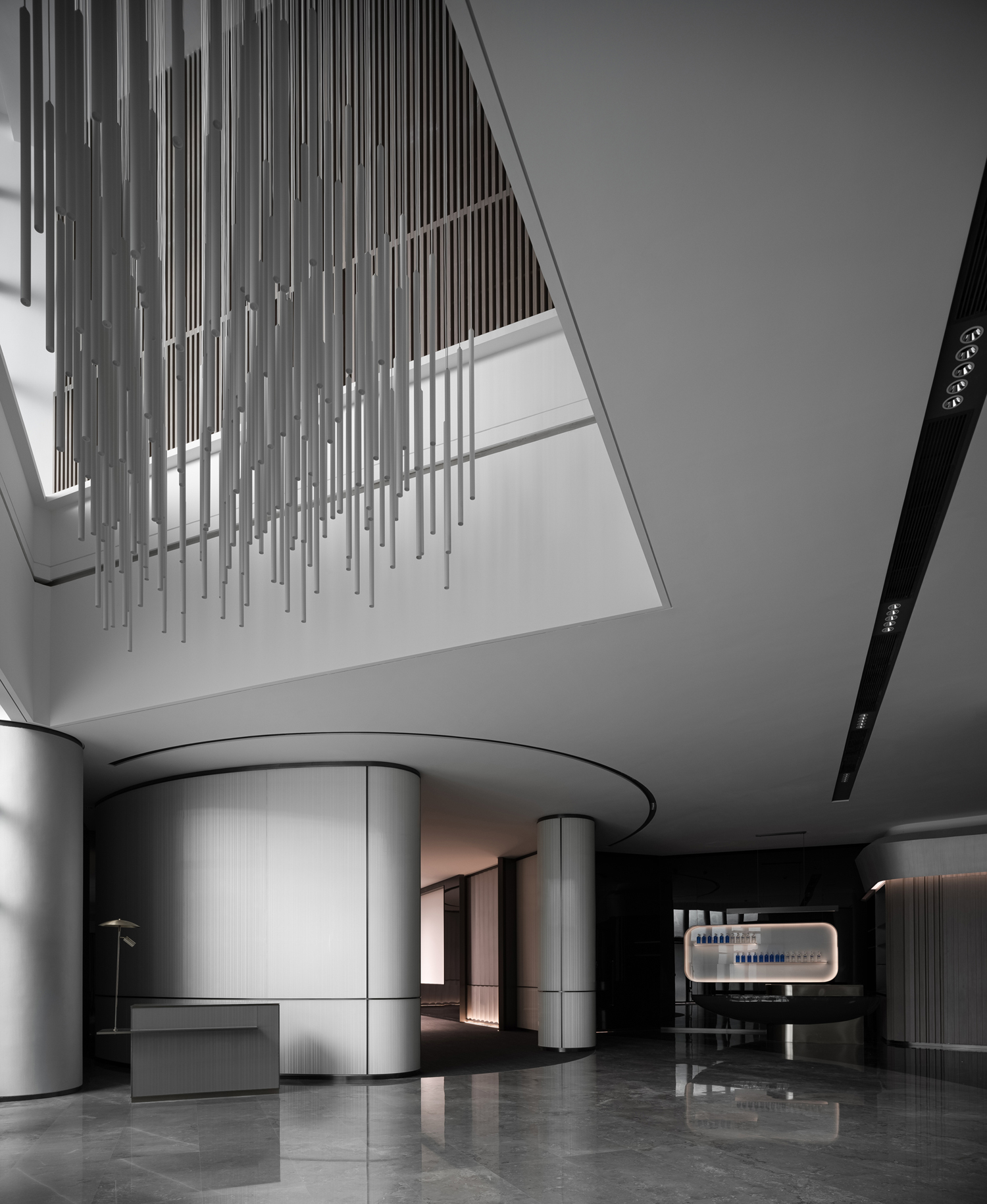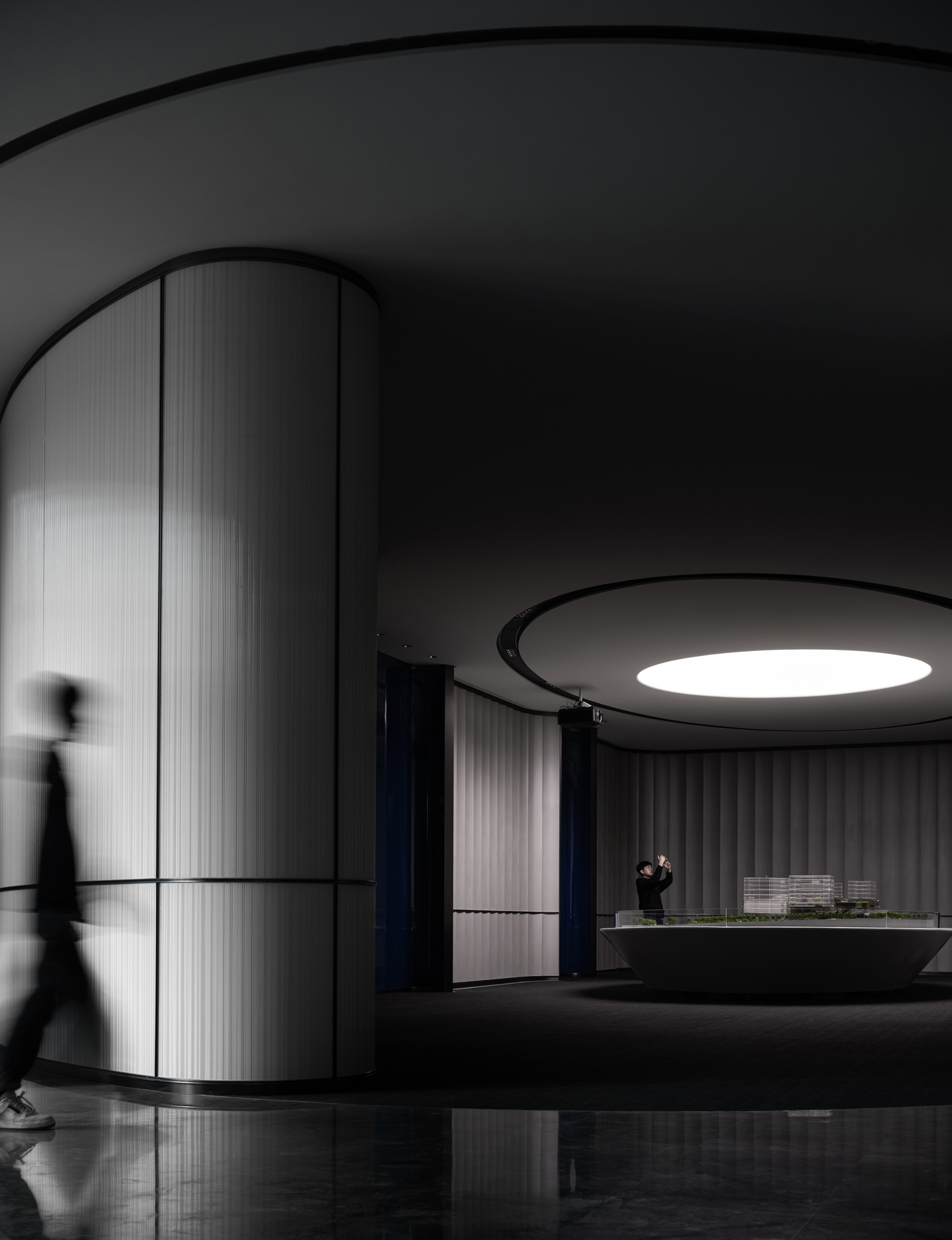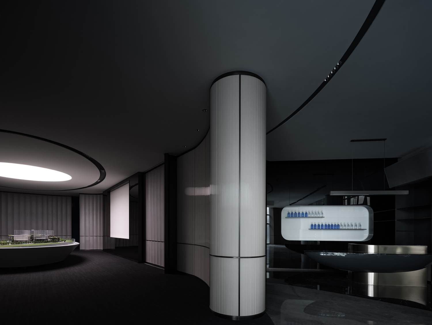 空间布局:本项目处于负一层,对于自然光线的引入,有着更多技巧上的要求,设计师利用直穿顶层的中空,将光自然引入室内,整个光明的空间形态立刻呈现。入口处采用挑空设计,空间极具尺度感和延展性,艺术吊灯悬垂而下,营造出强烈的视觉冲击感,引导到访者去探寻、发现和感知。接待台后方的沙盘区,采用半围合式的结构和通透的玻璃材质,弱化了区域间的边界,又保留了独立性,弧形墙面形成流畅,自由的行走动线,给予空间灵动,变化的韵律之美。