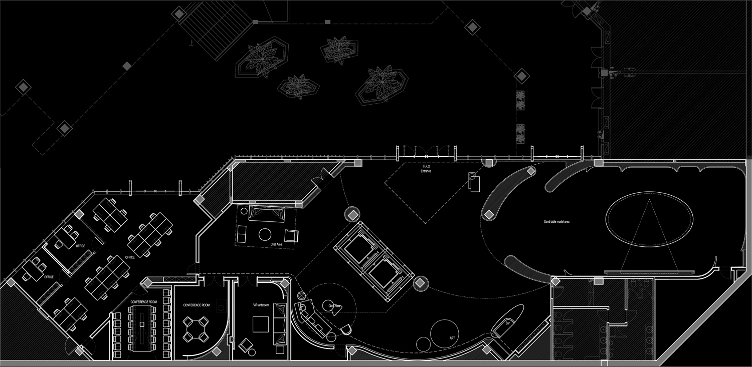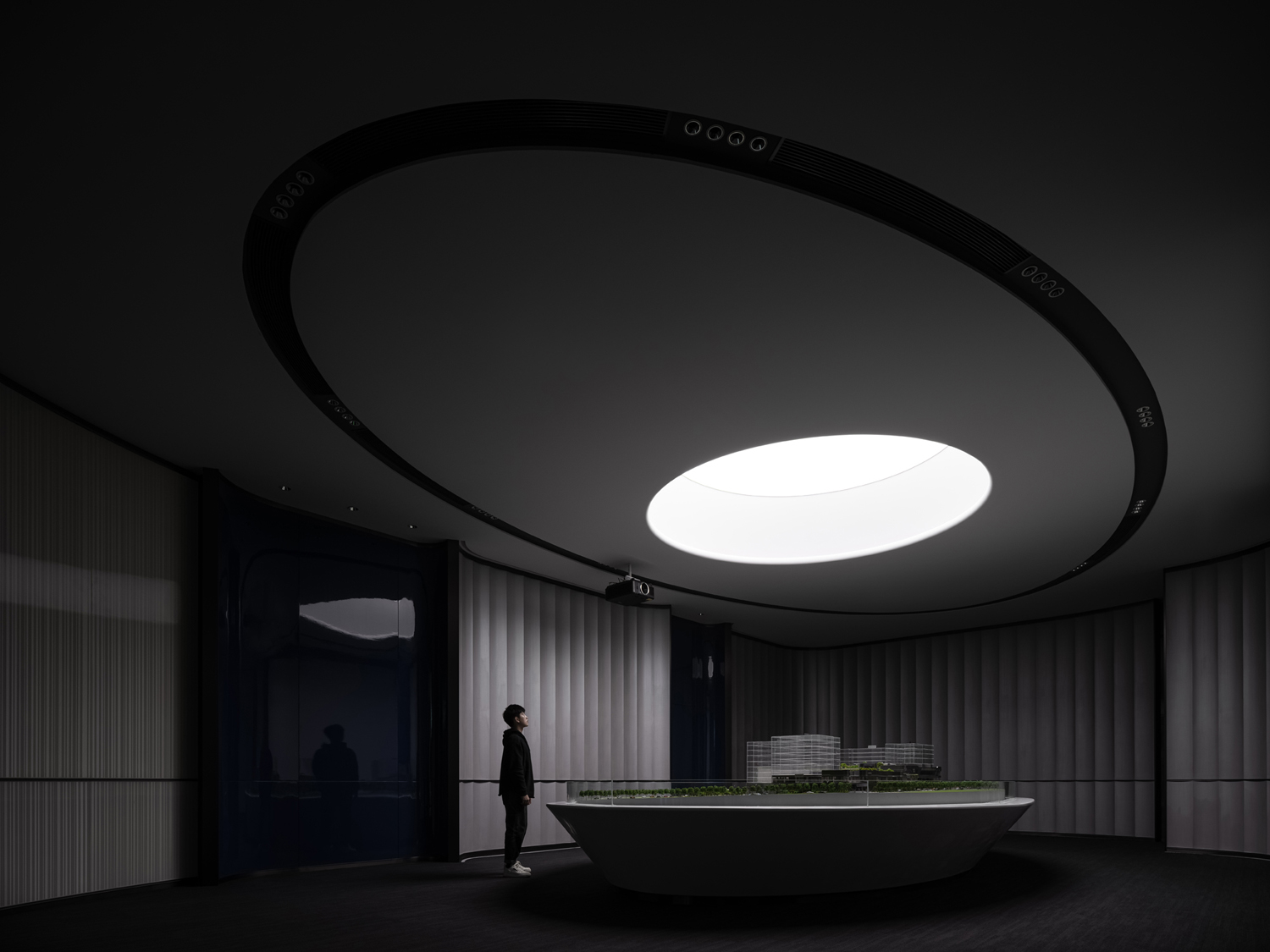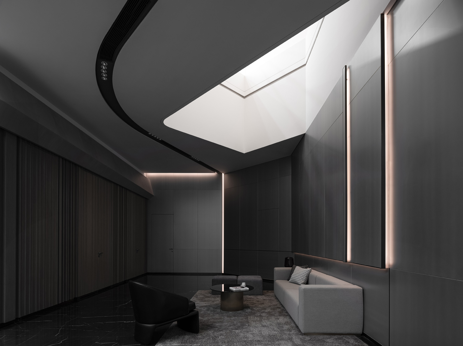 空间布局:本项目处于负一层,对于自然光线的引入,有着更多技巧上的要求,设计师利用直穿顶层的中空,将光自然引入室内,整个光明的空间形态立刻呈现。入口处采用挑空设计,空间极具尺度感和延展性,艺术吊灯悬垂而下,营造出强烈的视觉冲击感,引导到访者去探寻、发现和感知。接待台后方的沙盘区,采用半围合式的结构和通透的玻璃材质,弱化了区域间的边界,又保留了独立性,弧形墙面形成流畅,自由的行走动线,给予空间灵动,变化的韵律之美。