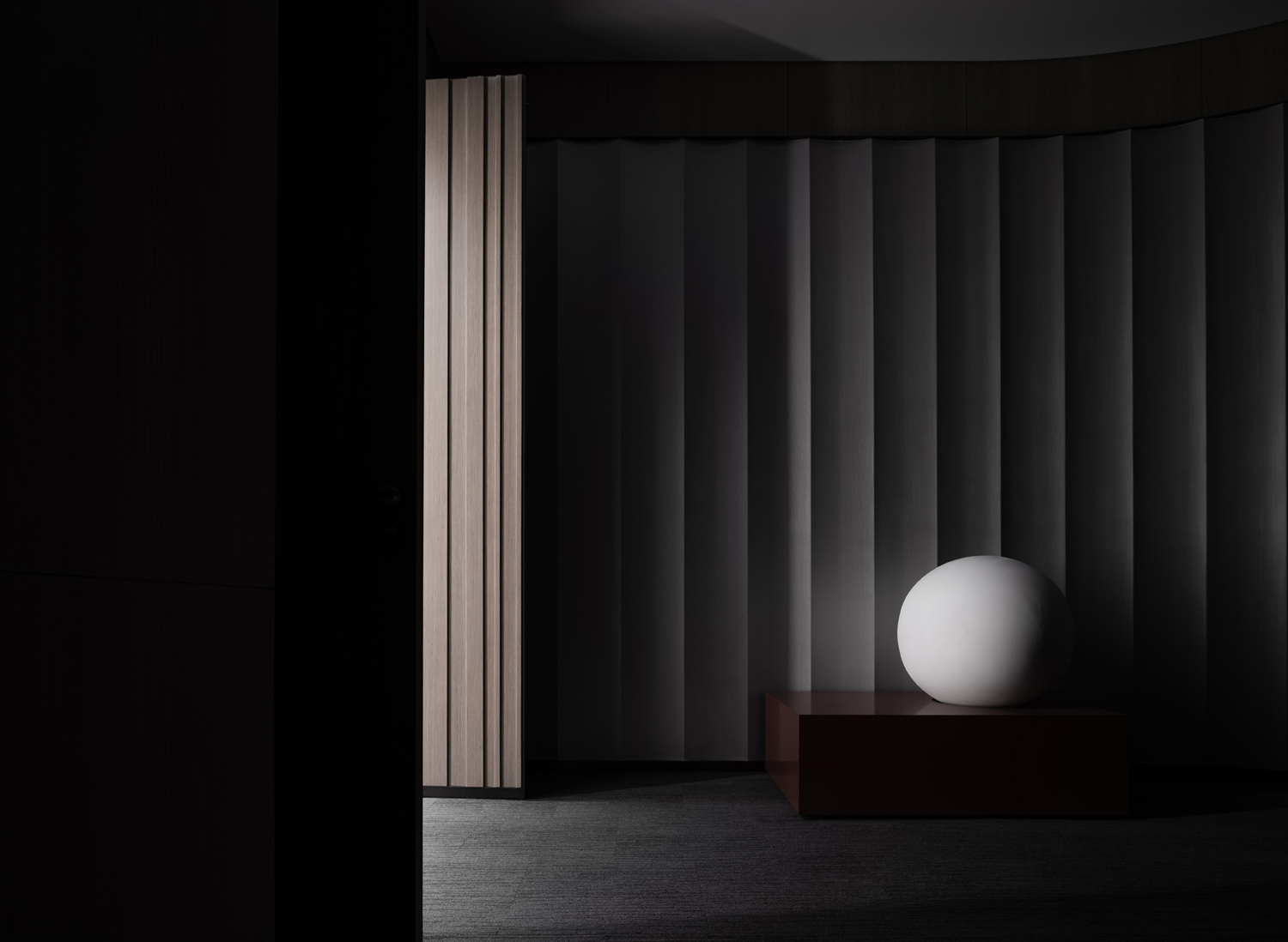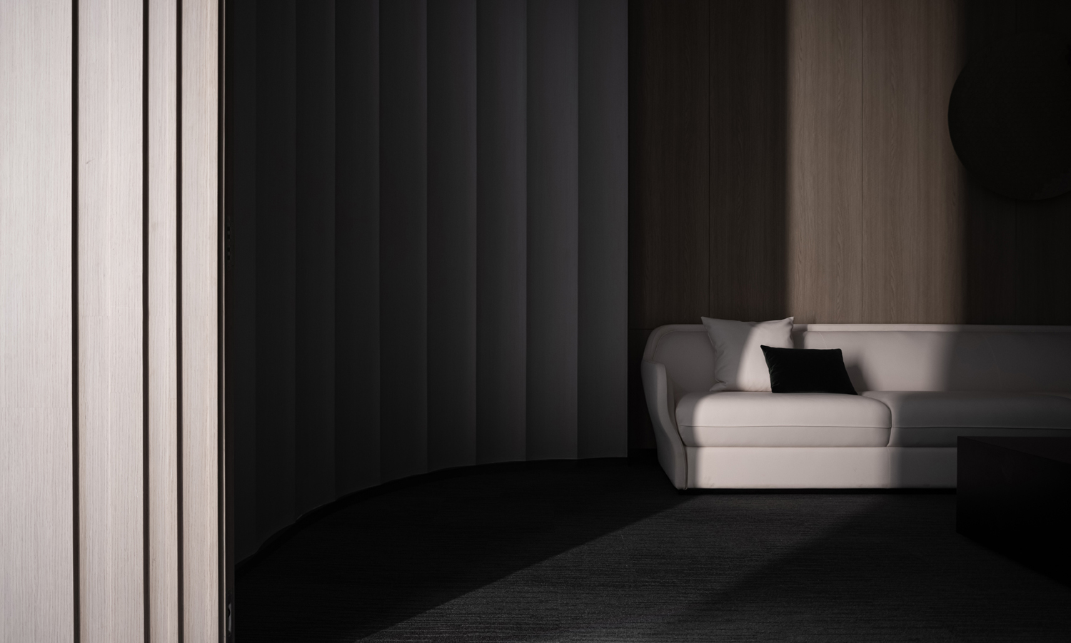 不管是前庭,沙盘区或洽谈区域的墙面处理,虽然材质或色调不尽相同,但都使用竖条形态,且有序连贯的处理手法,强化所处空间的整体及一致性。