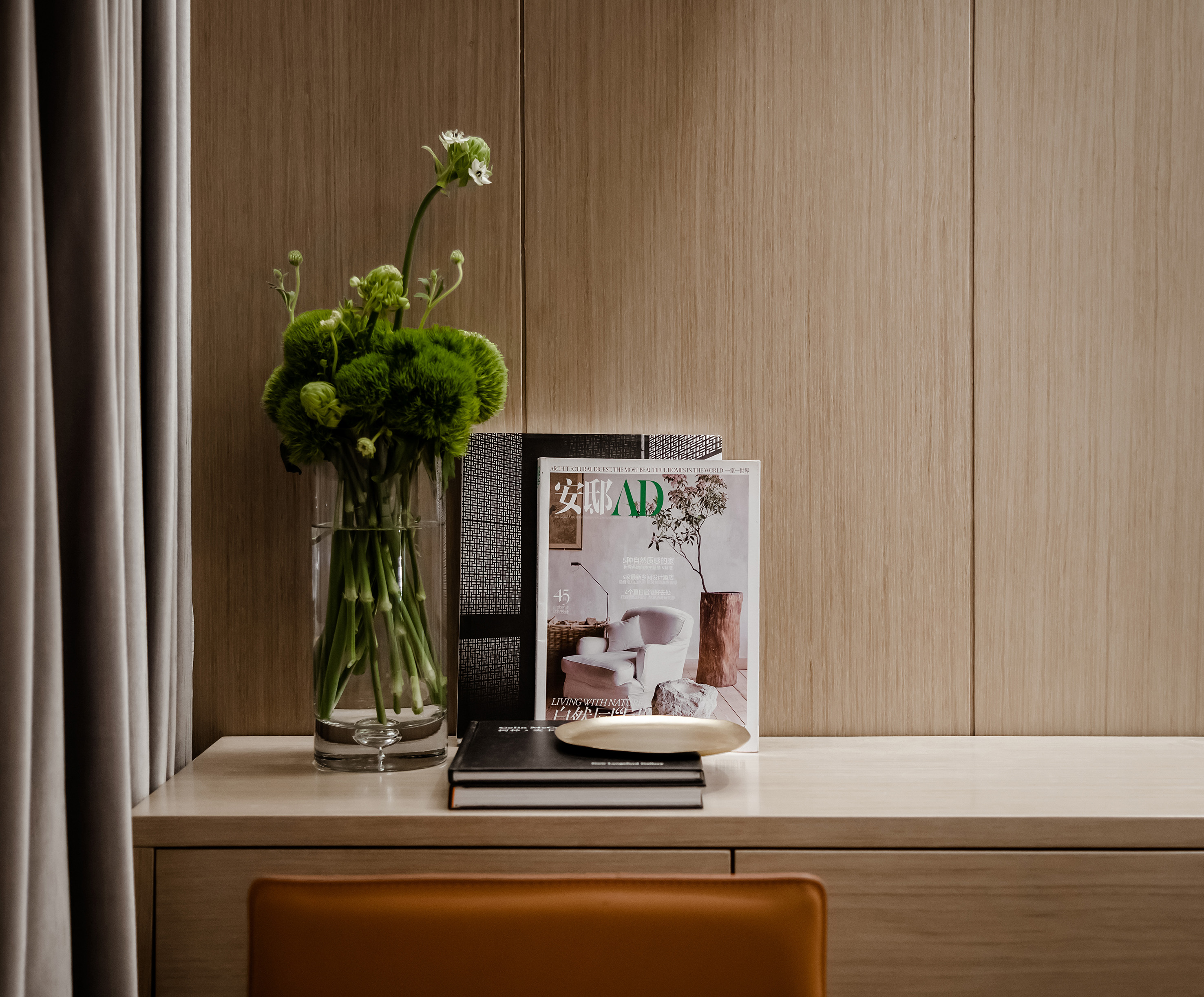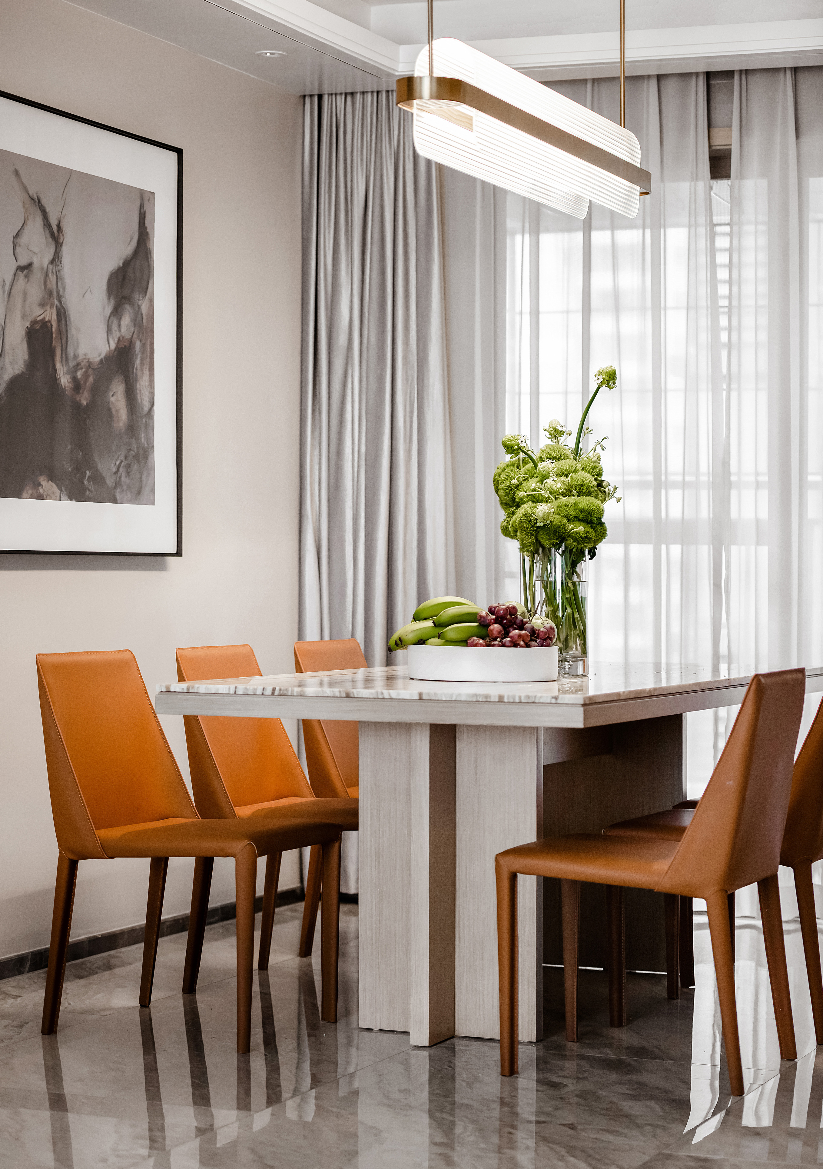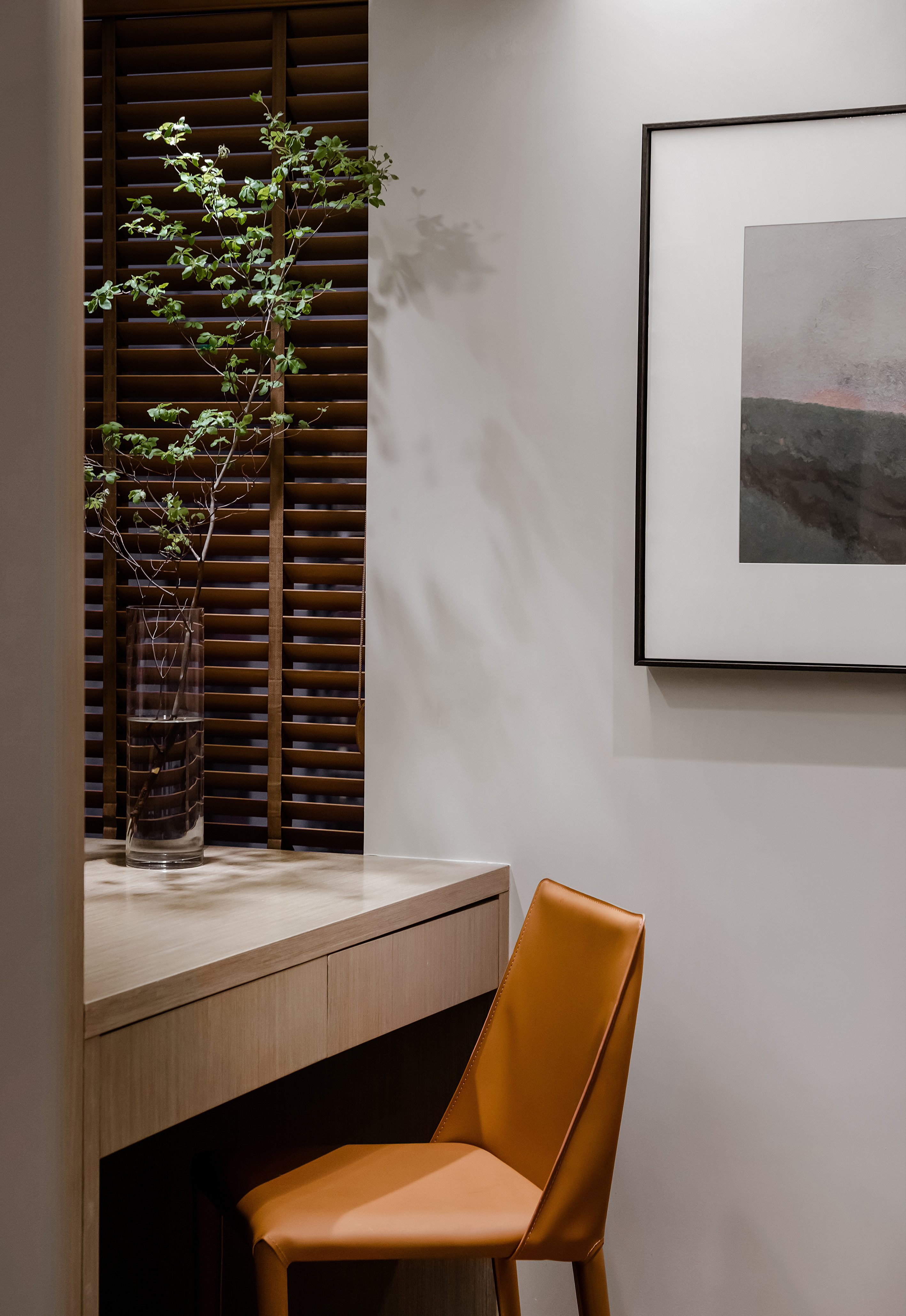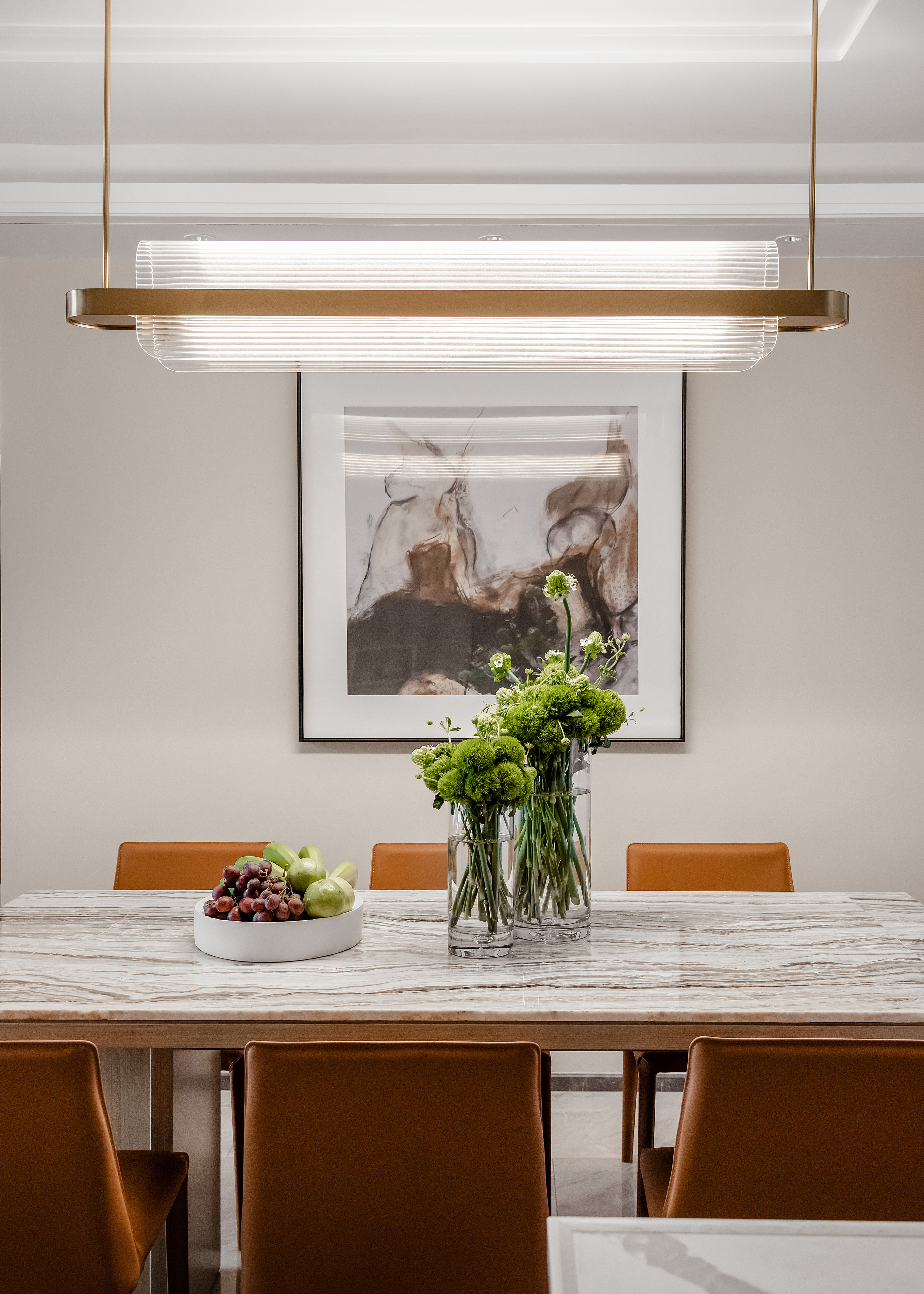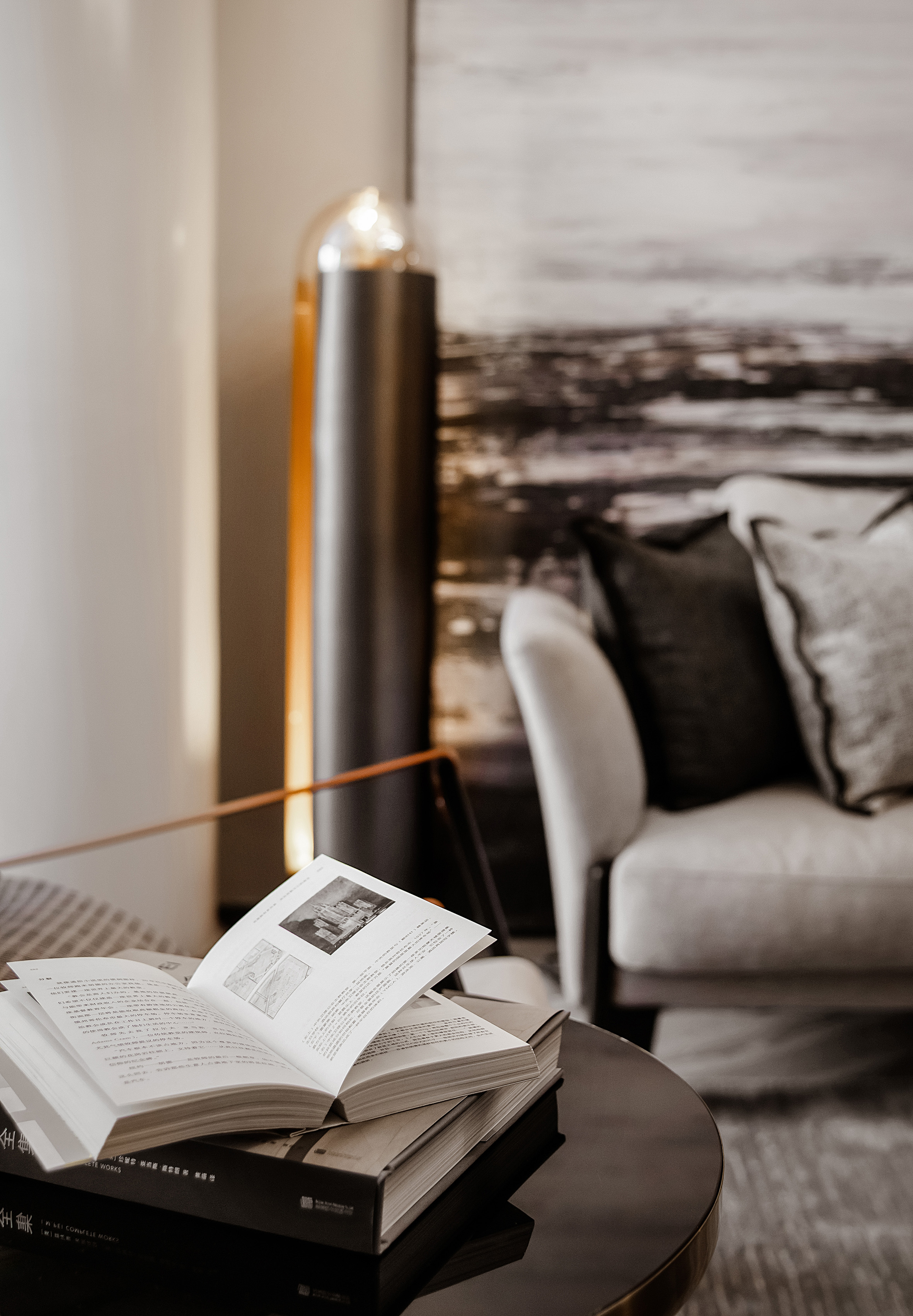 软装设计充分考虑了硬装的空间条件,如何让软装与空间更加融合与贴切,设计师从空间形态到色彩关系,从空间线条到材质变化等诸多方面,强调空间的细腻变化与对比;从家具的单品设计到灯具造型的甄选,从独立艺术家的瓷器配搭到挂画的艺术氛围烘托,营造出了既有格调而又不失情趣的家居空间。