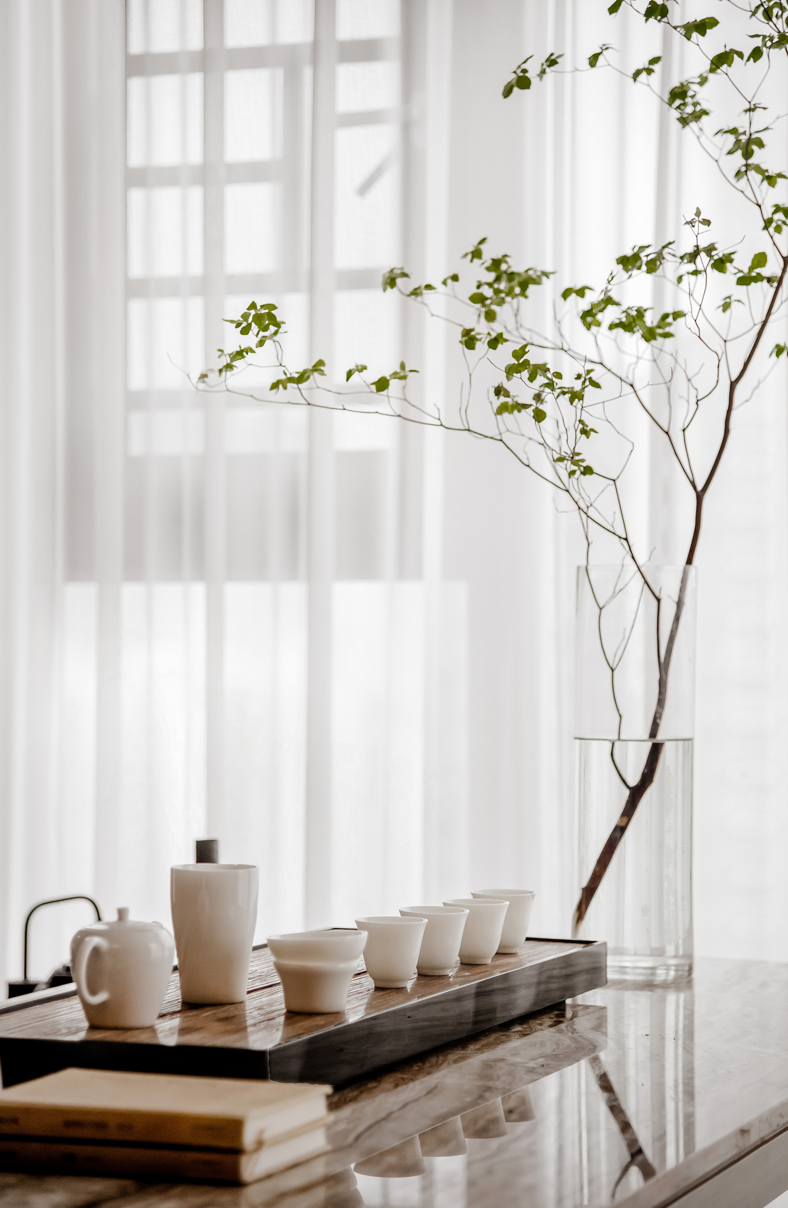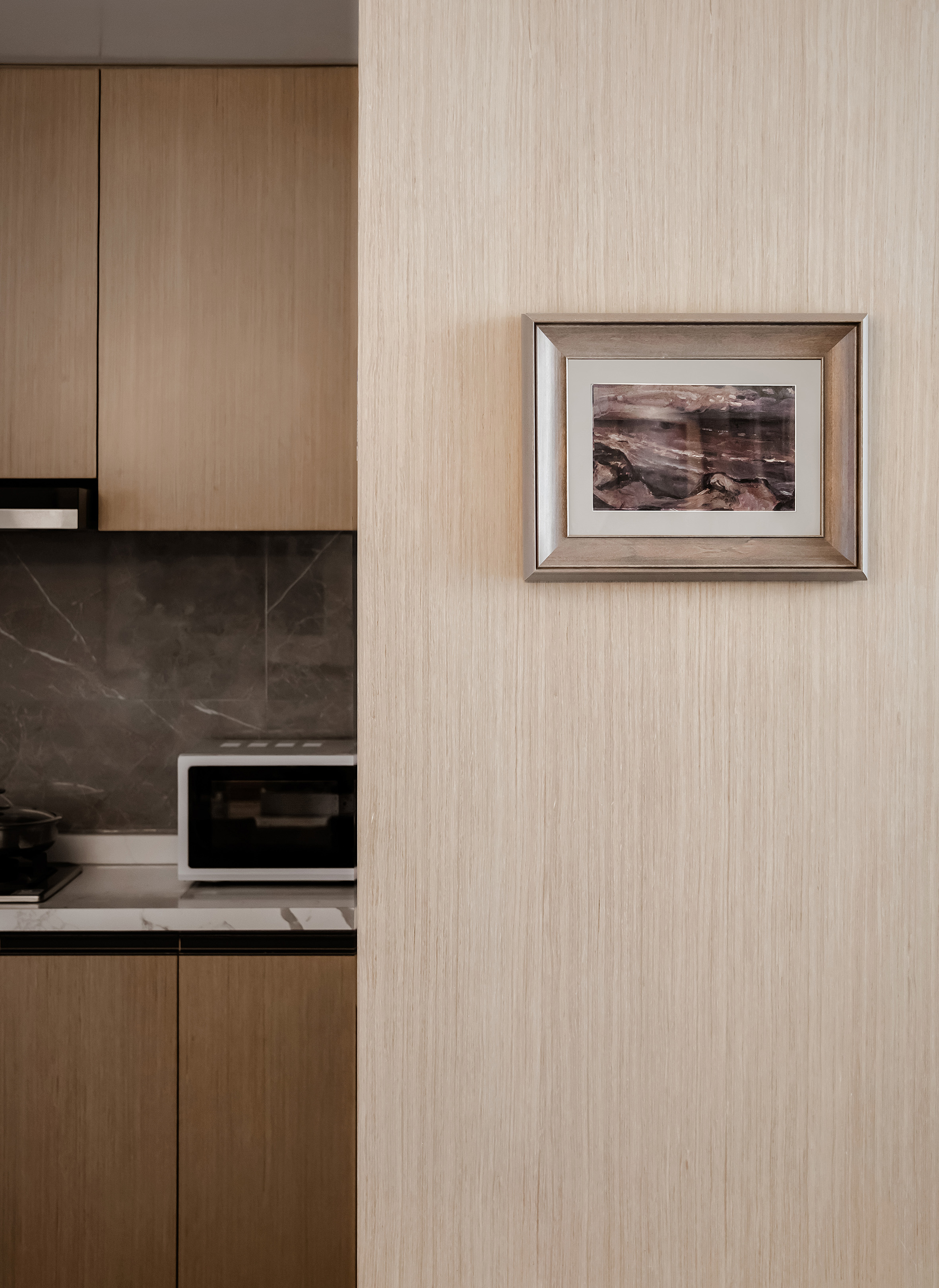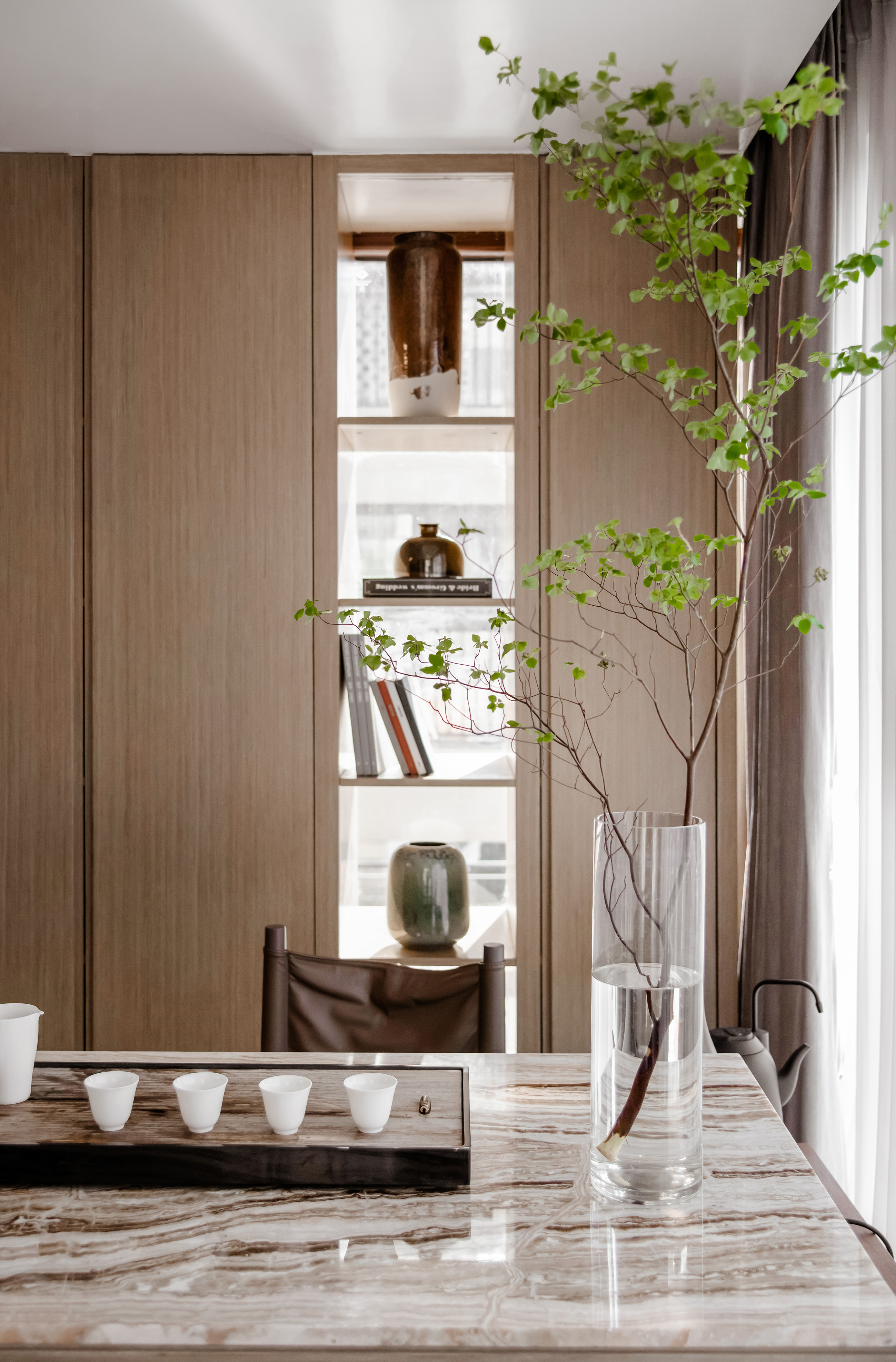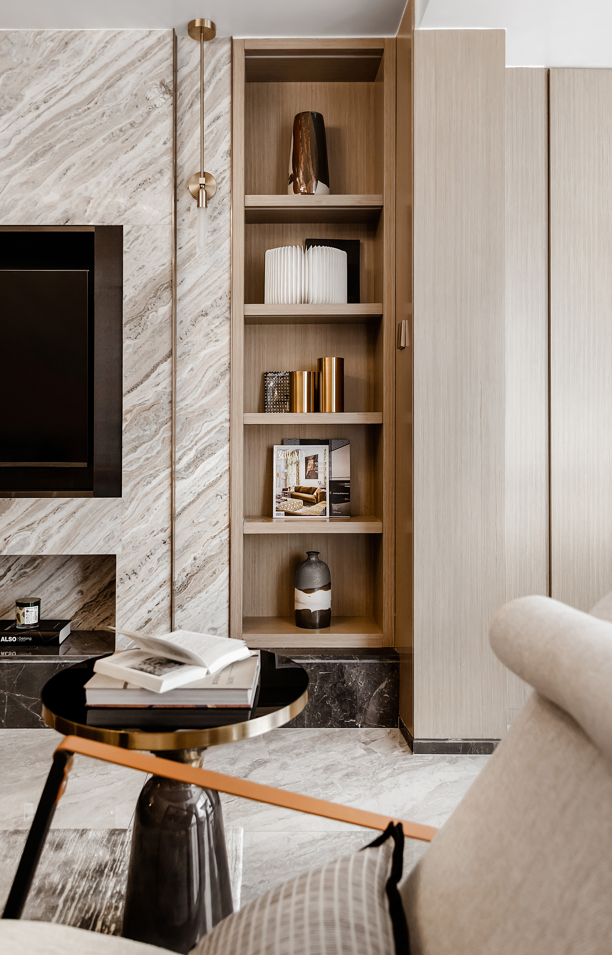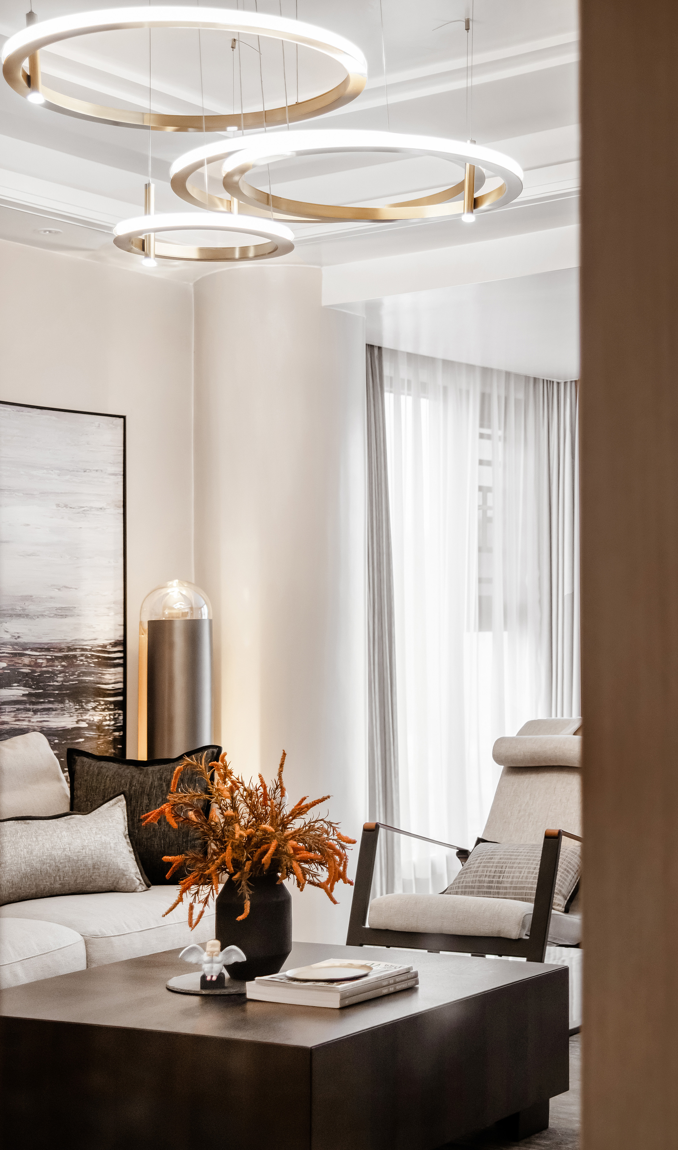 软装设计充分考虑了硬装的空间条件,如何让软装与空间更加融合与贴切,设计师从空间形态到色彩关系,从空间线条到材质变化等诸多方面,强调空间的细腻变化与对比;从家具的单品设计到灯具造型的甄选,从独立艺术家的瓷器配搭到挂画的艺术氛围烘托,营造出了既有格调而又不失情趣的家居空间。
