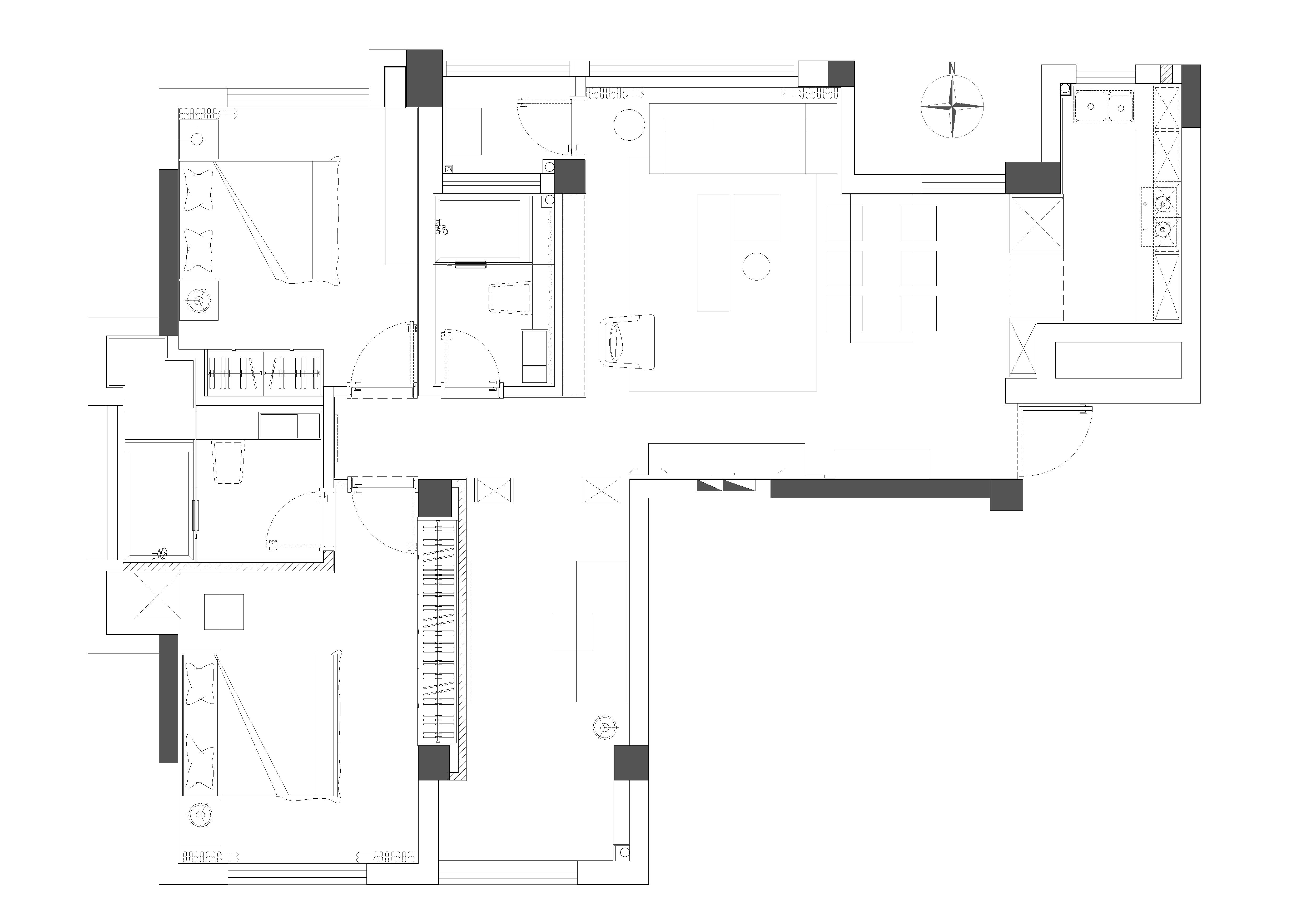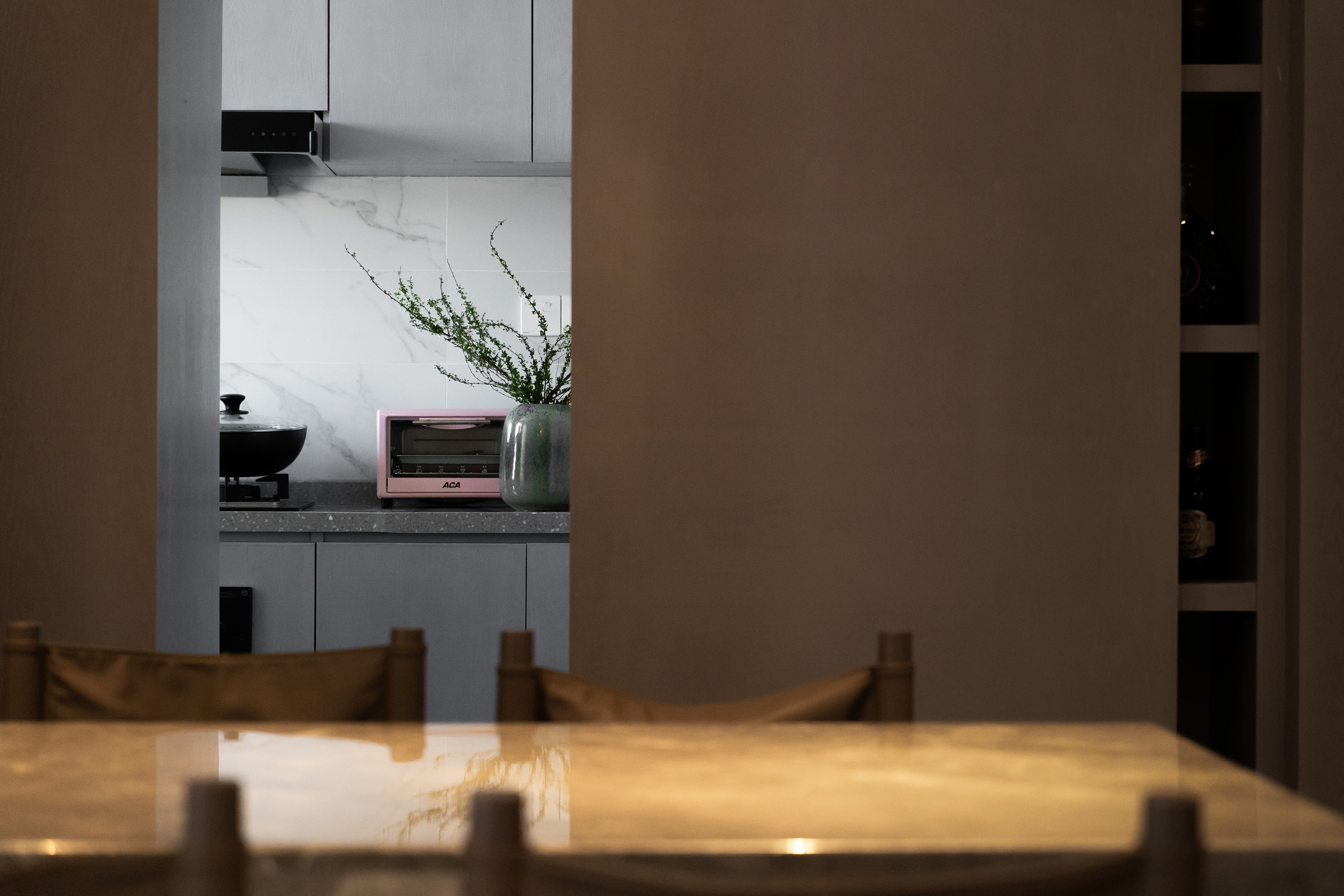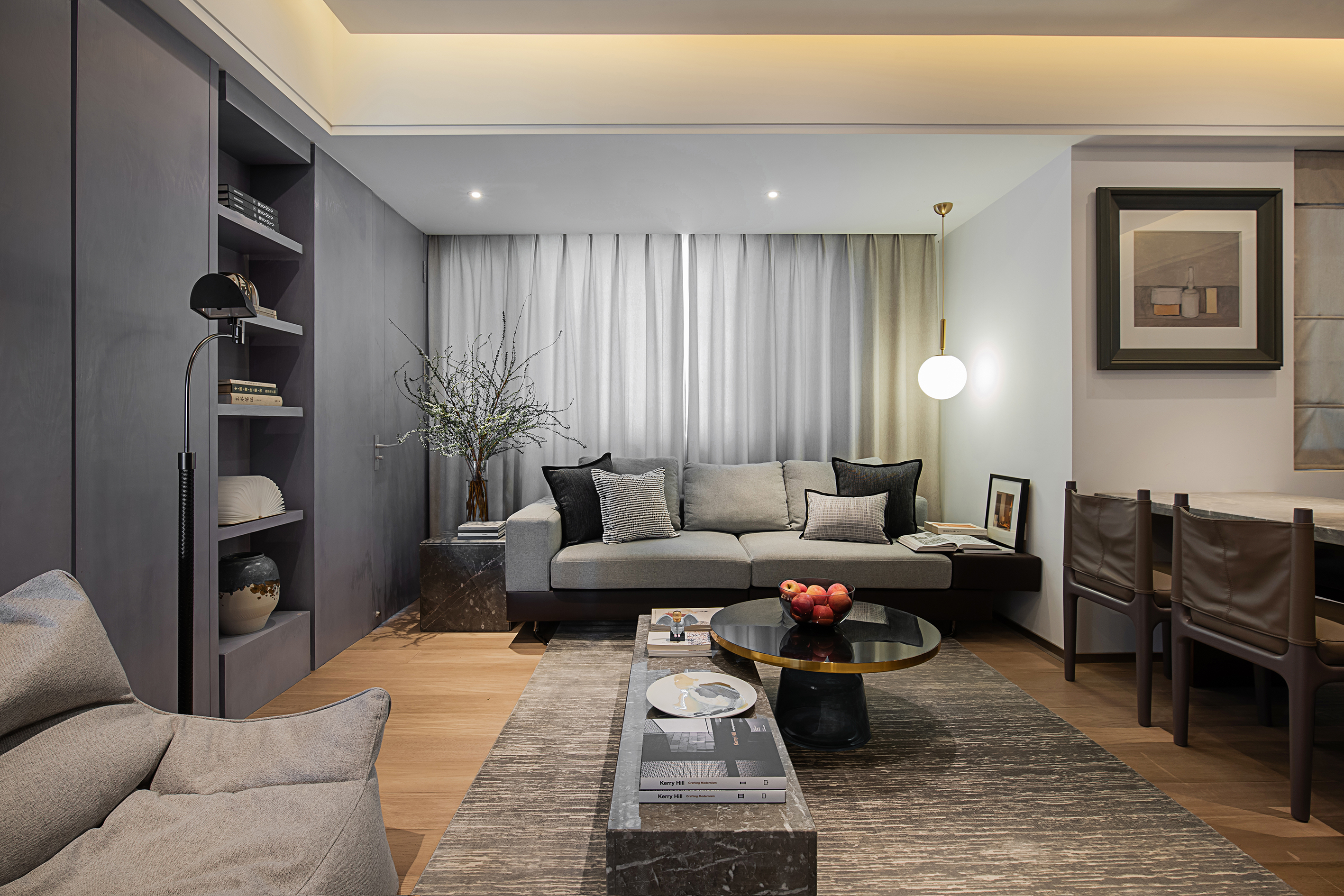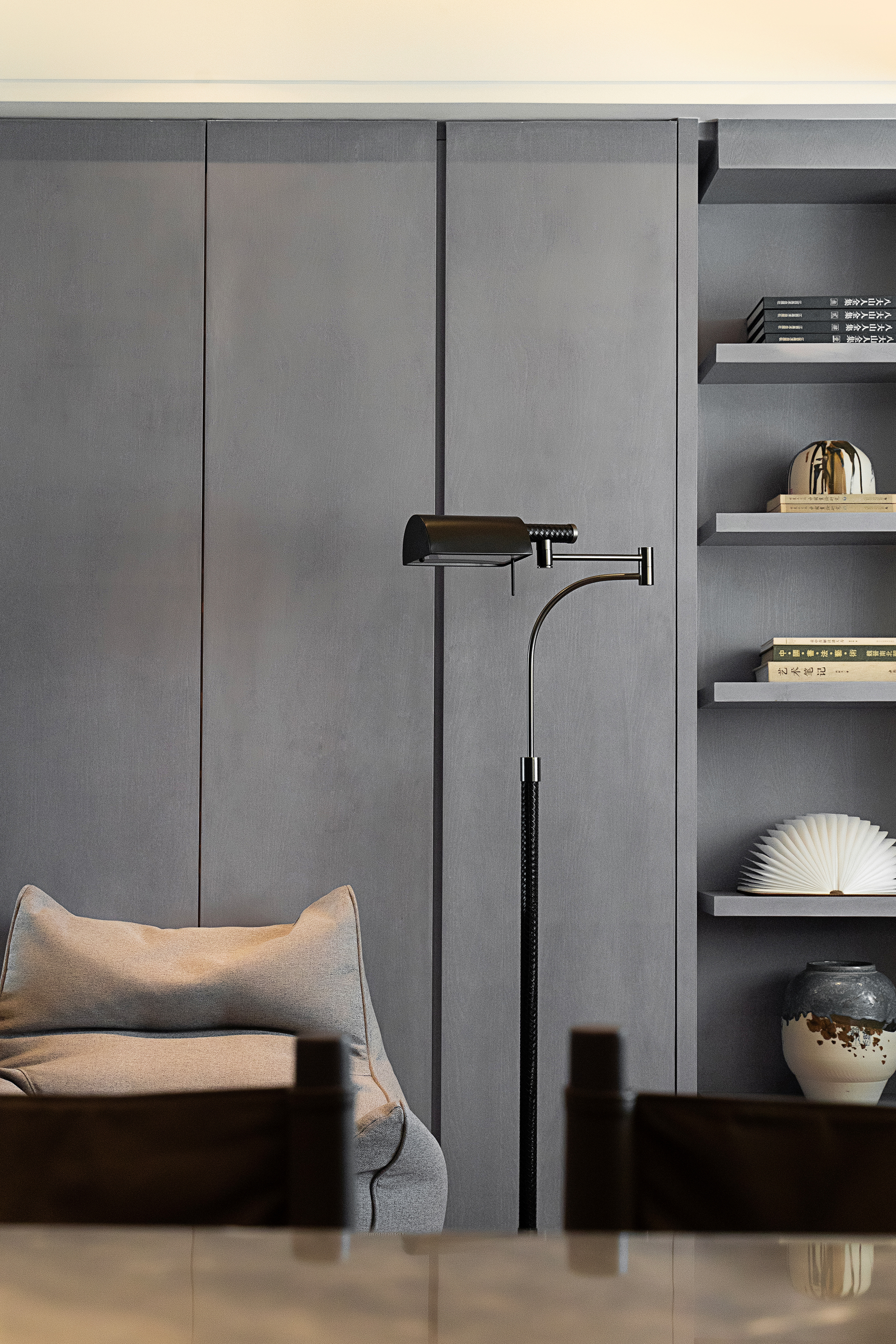 空间布局:原有室内建筑条件空间与空间之间错位、功能尺度局限以及楼板梁位交错底下,在在规划梳理中,希望能规避现有建筑问题,将原有的室内建筑条件成空间设计成属于这个空间特有的个性与优点。将室内空间的错位表现空间的虚实,体现空间的通透,将空间的疏密关系表现于软硬装之间,使得室内的秩序更加井然有序,空间色彩主要以灰色主导下的色彩关系,整个室内的虚实、疏密、色彩关系形成了这个空间特有的个性与质朴的气质,文质彬彬的同时也具有内心想要创新的个性。