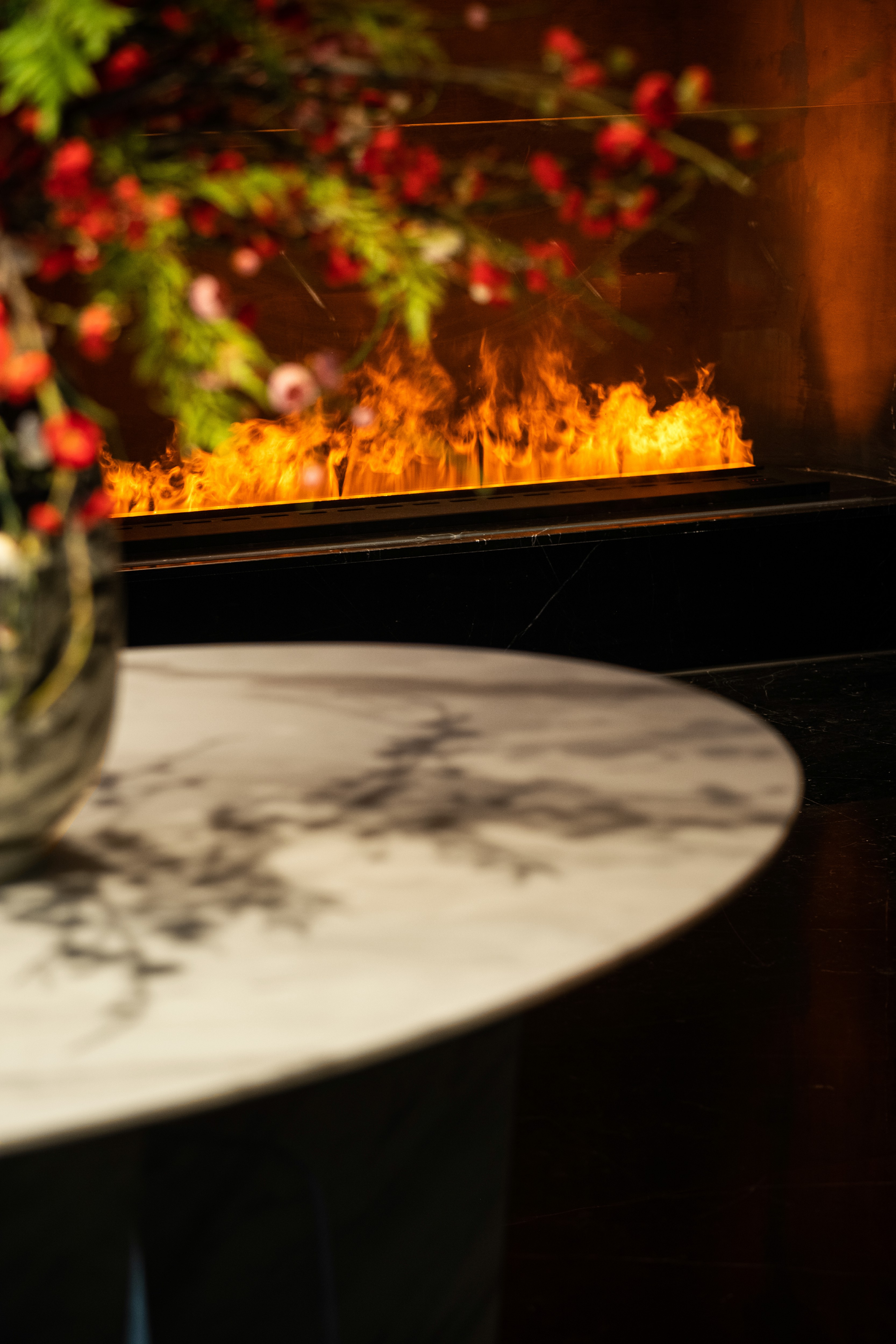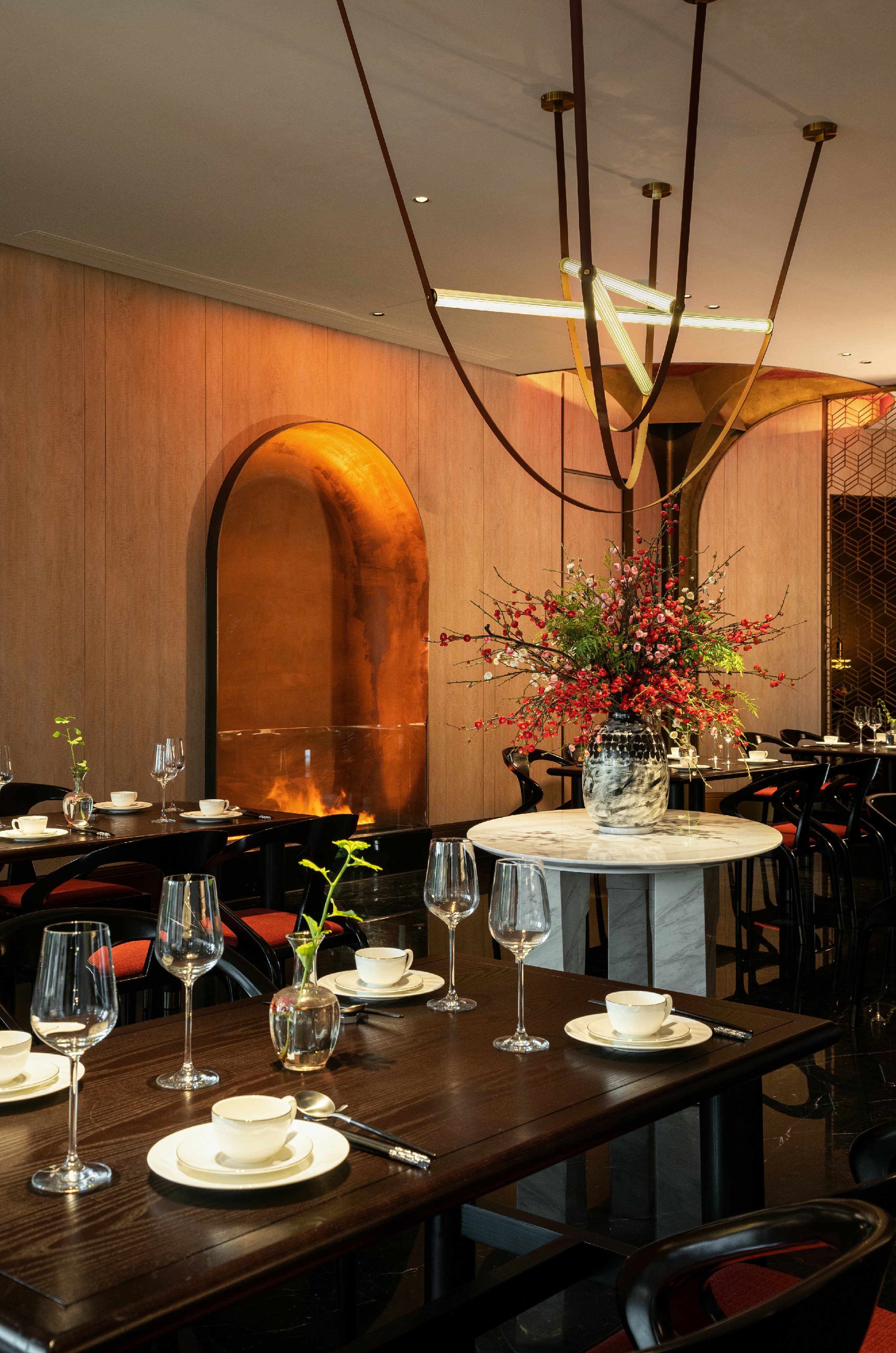 南京民俗好探梅,历六朝至今不衰。大厅以梅表形,设八处散座,通过梅花的色彩、纹样、构成调动食客“匝路亭亭艳,非时裛裛香”的交互感官,展开丰富想象,构建空间功能、动线、尺度和亲密关系。墙壁拱形开槽内置蒸汽炉火,质朴的轮廓和色泽在空间里肆意增长,衍生围炉赏梅的场景式体验。杯盏中的茶香,烟火里的美味,将所见之处烘染得极具氛围感。 -