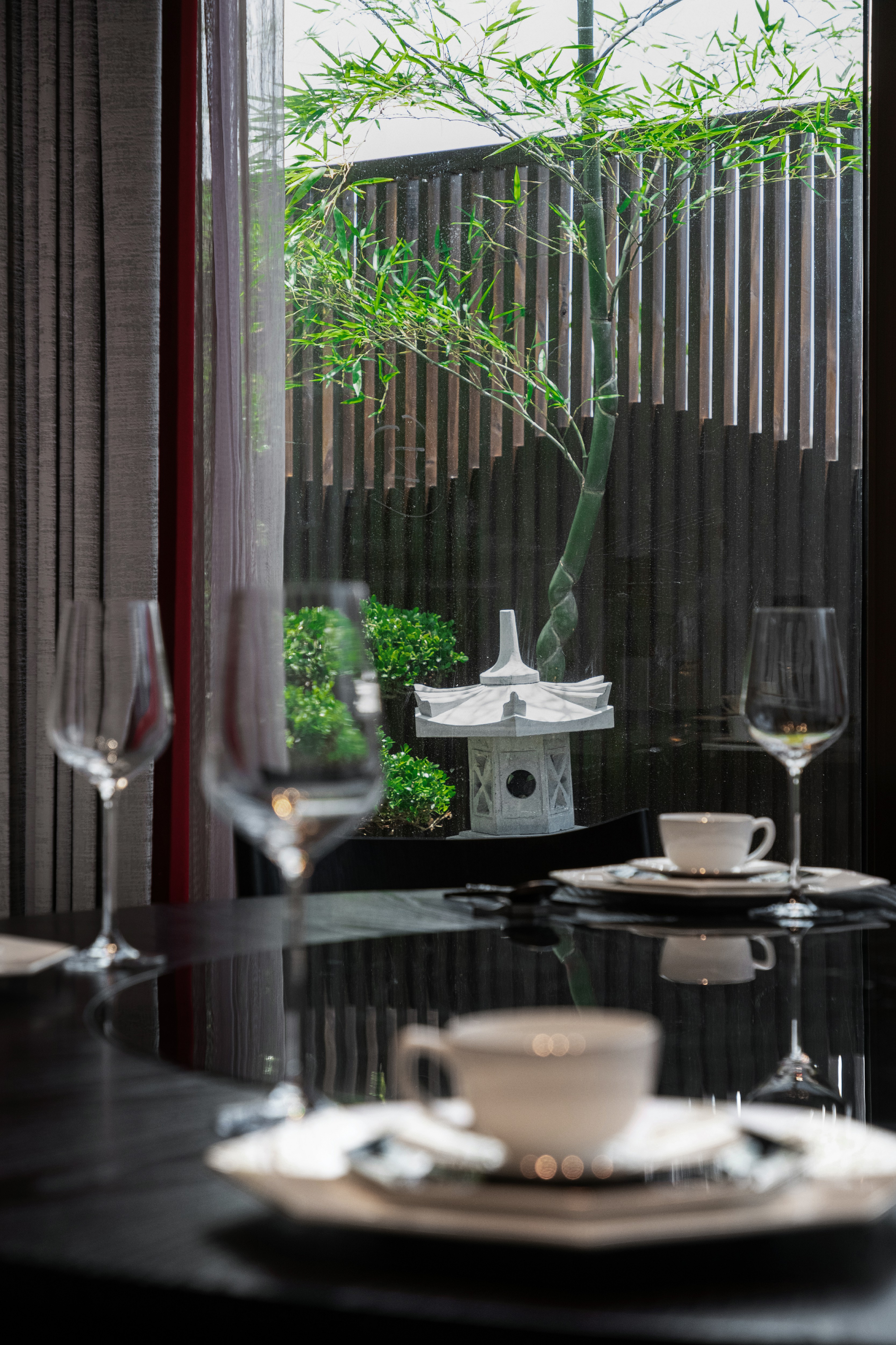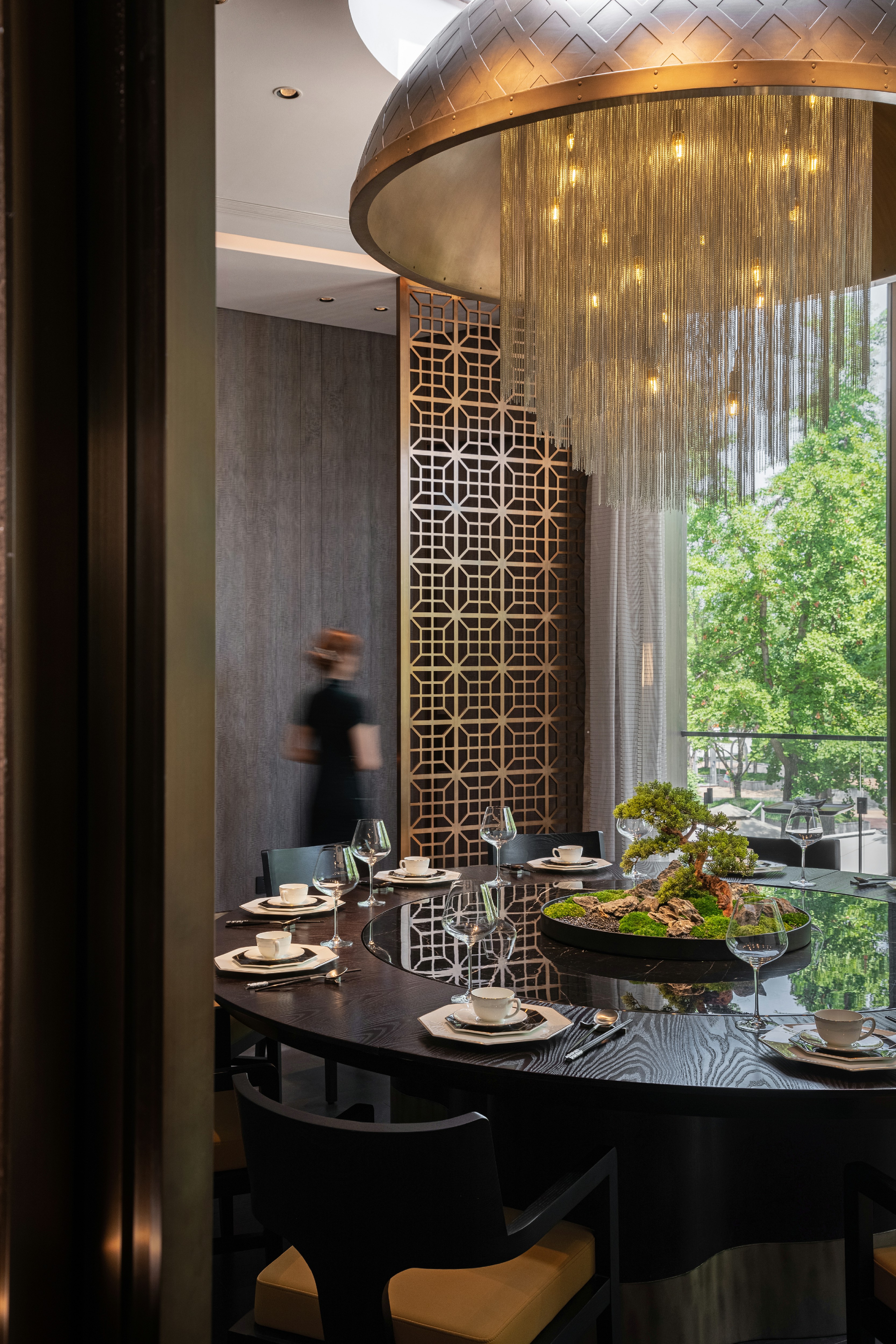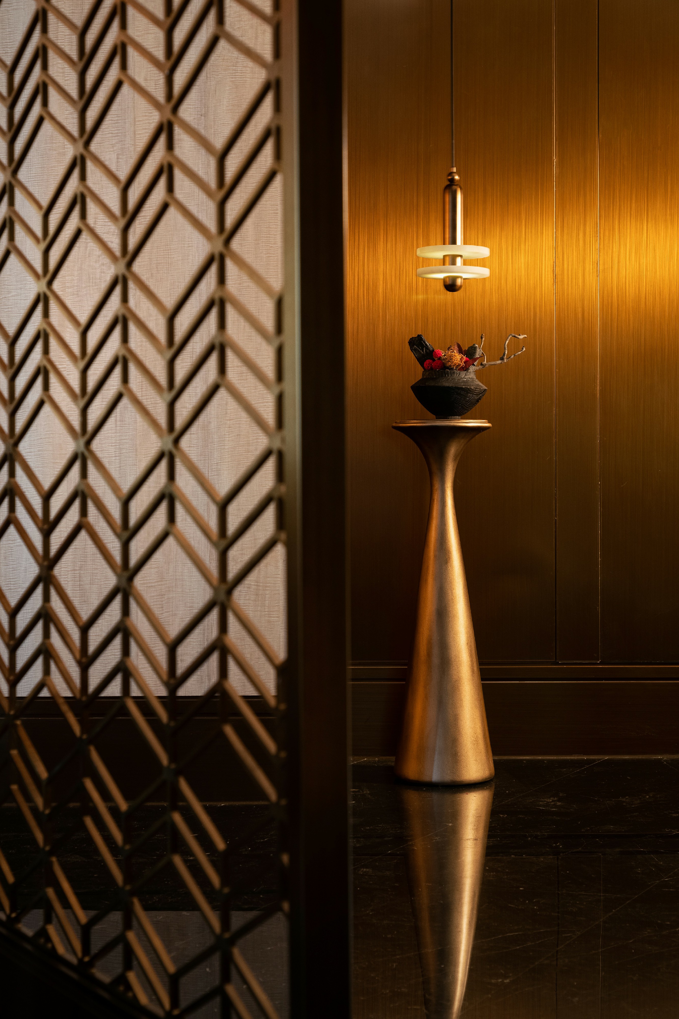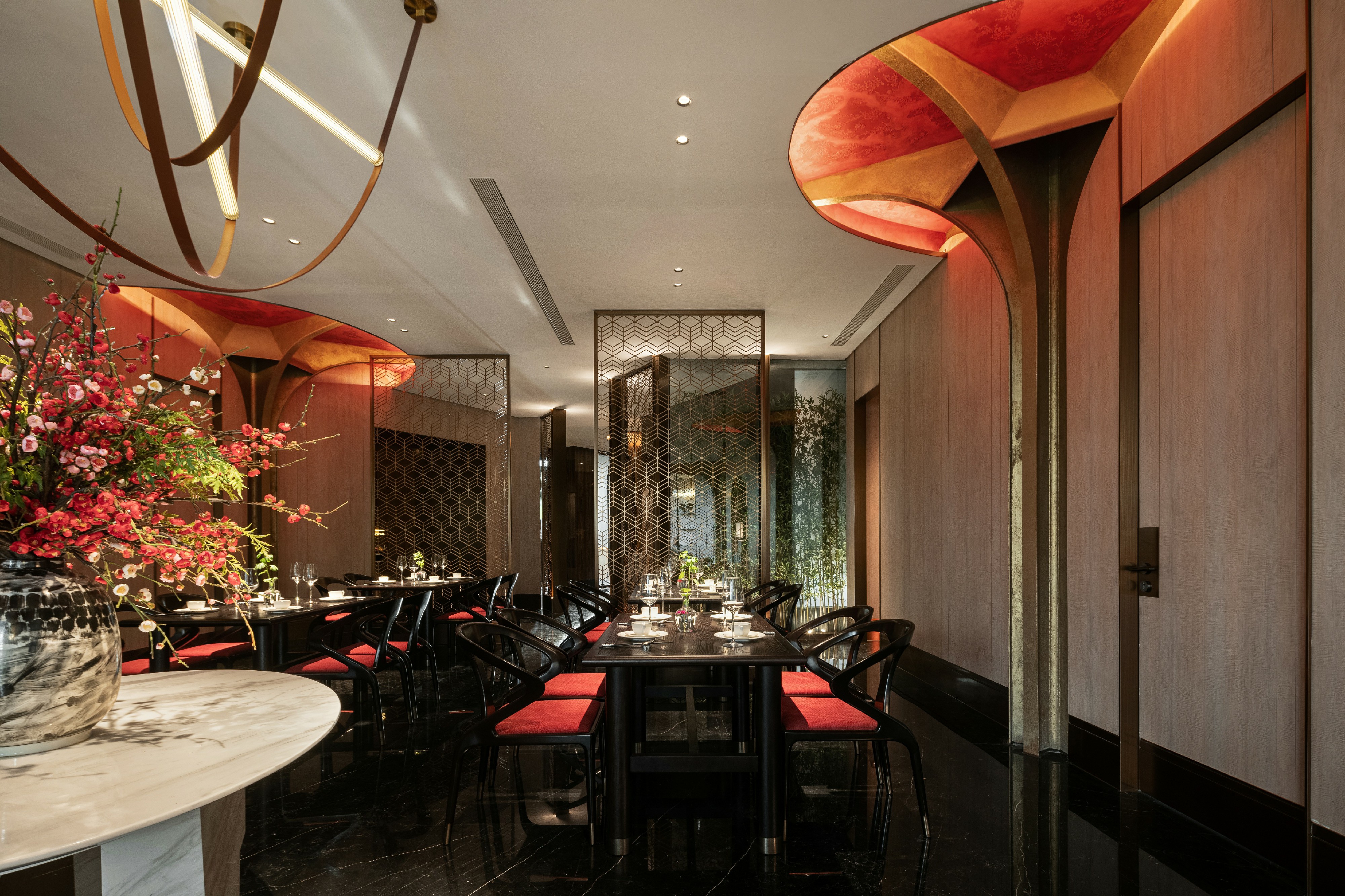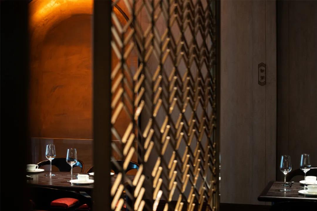 进入前厅,竹元素映入眼帘,或连横成壁或摇曳疏朗,空间由此完成内与外的转换及过渡。前厅与大厅之间置入镂空花格屏风,围合不同区域边界,隔中有透,虚中有实,令食客自然联想细腻幽微的形色光影。