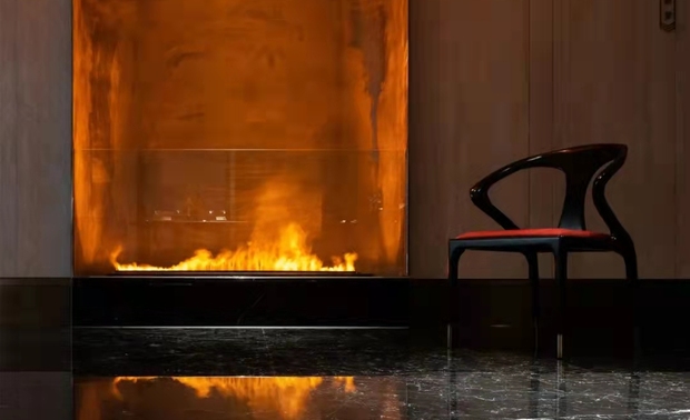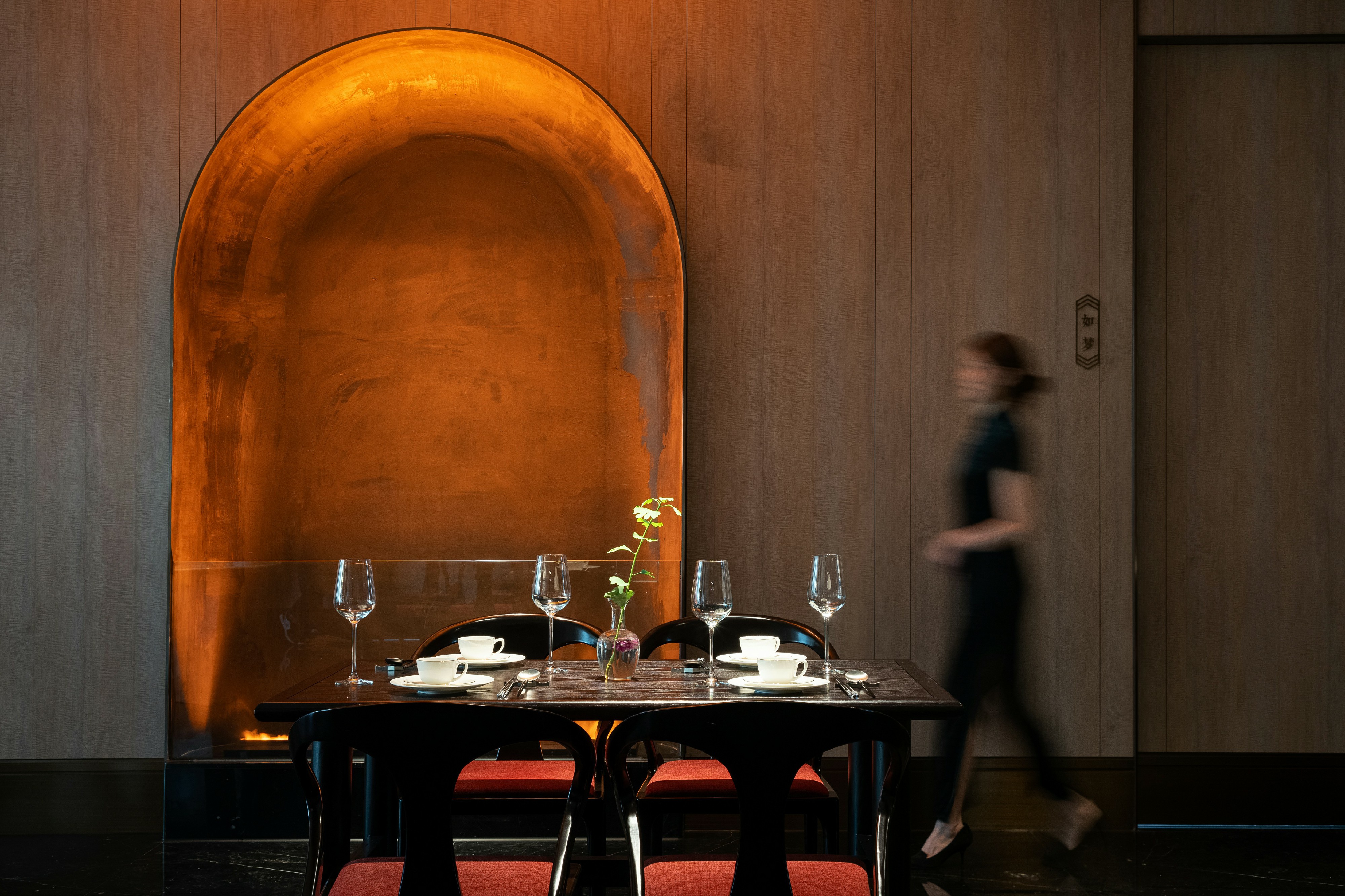 “乘鸾著色,疾蝇误拂,不及羲之醉墨。”该包厢以东晋二王书法为灵感,展开抽象的泼墨意境,空间犹如墨色与水色的融合,浸染、晕裂、皴法,以此体现遒媚多姿、神情骨秀的艺术风神。
