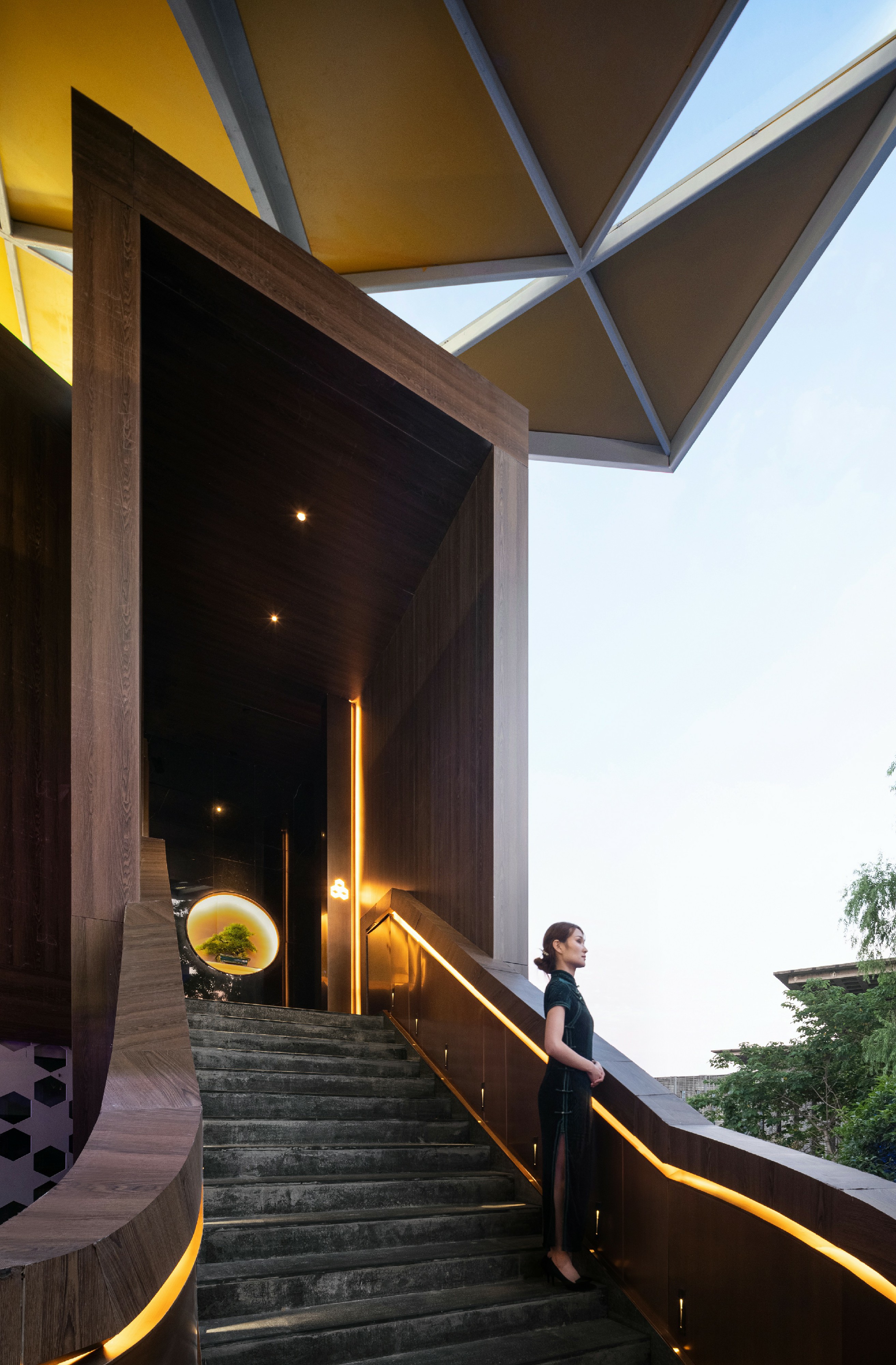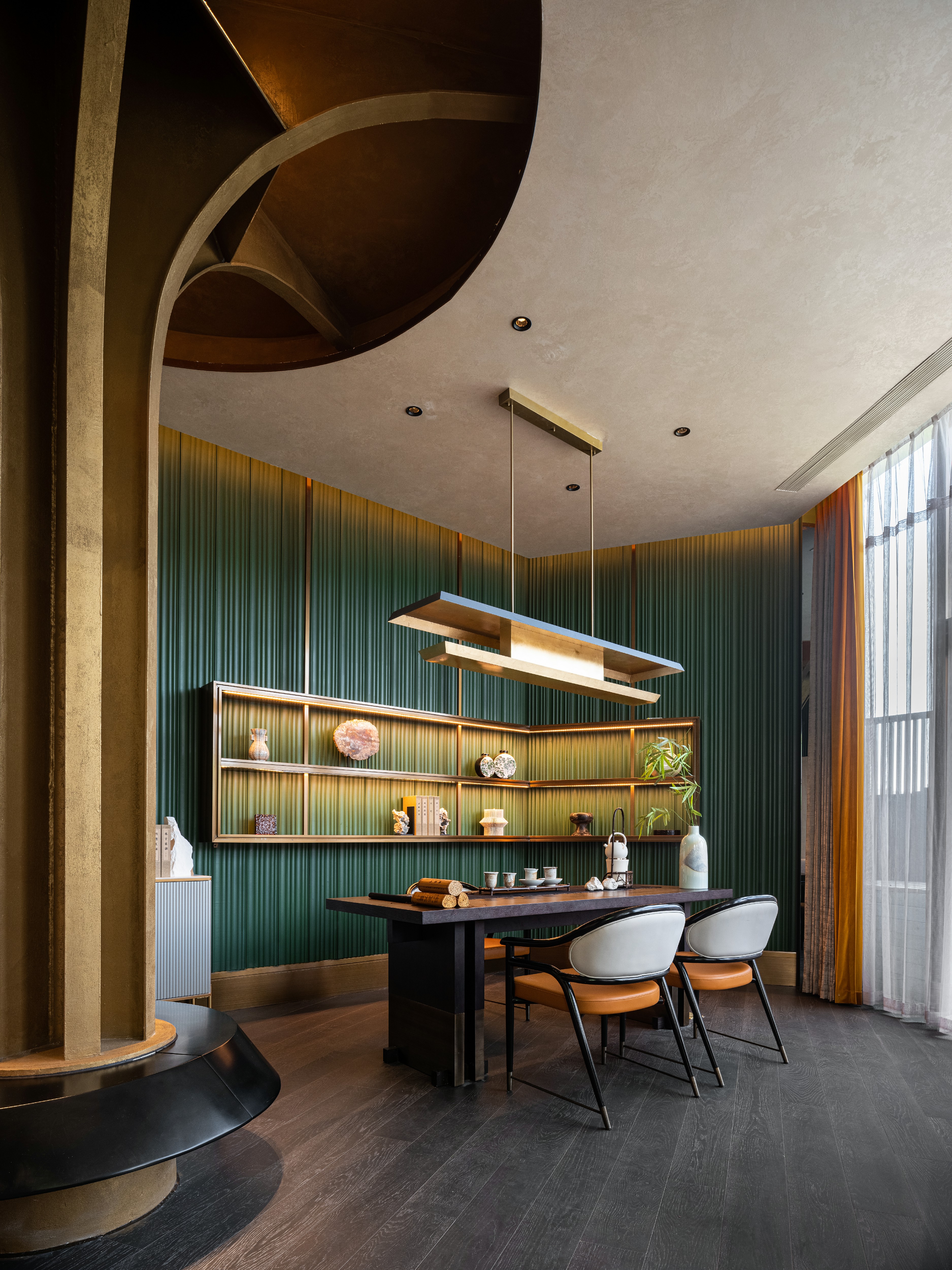 楼梯形态犹如半开的盒子,包裹着曲径通幽、延绵而往的古典意象渐至二楼。宏大门头暗合“酾酒临江”开阔气象,尽头以松柏端景,刻画方达文雅的魏晋性情,同时寄寓迎客之意。