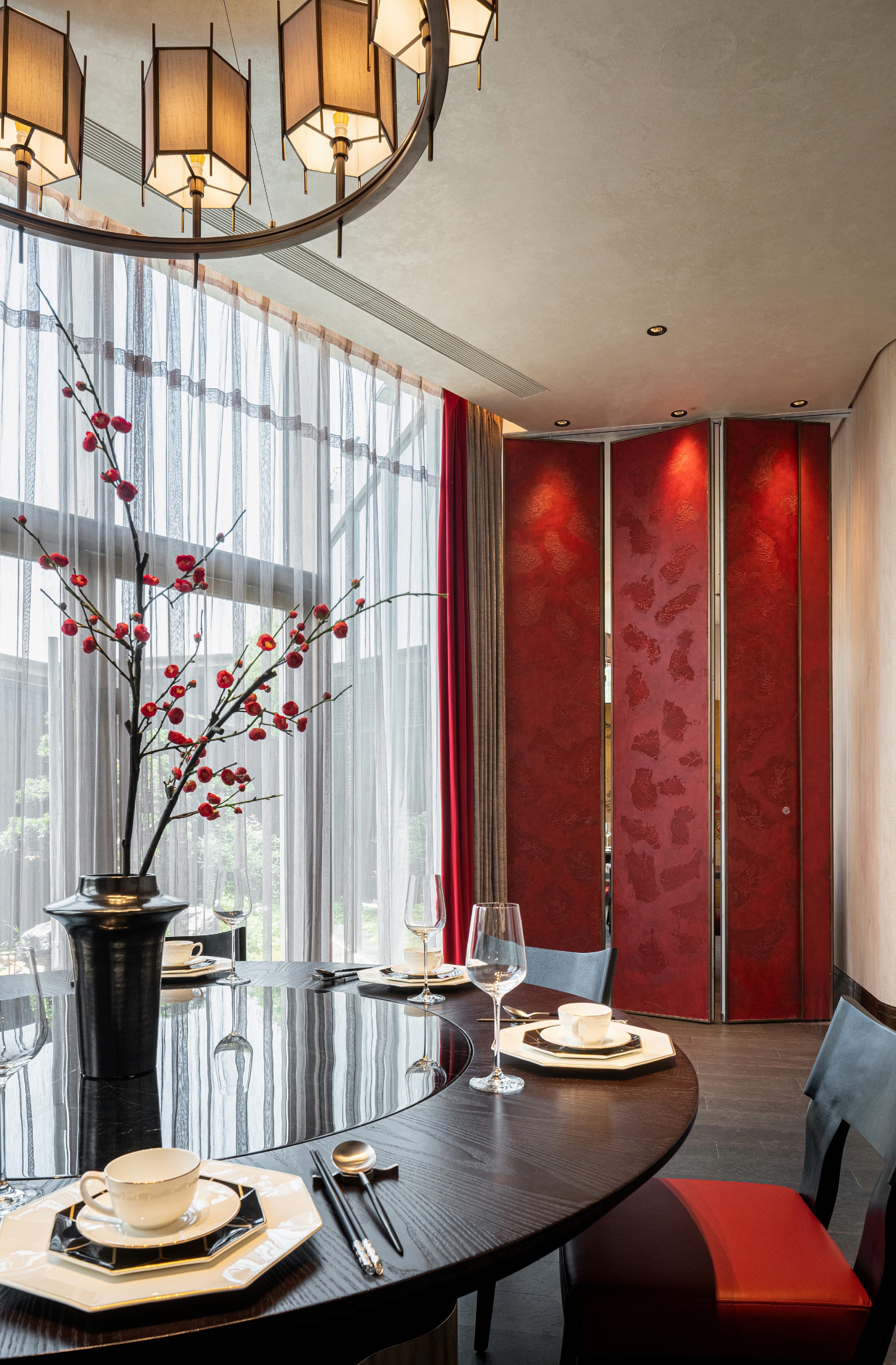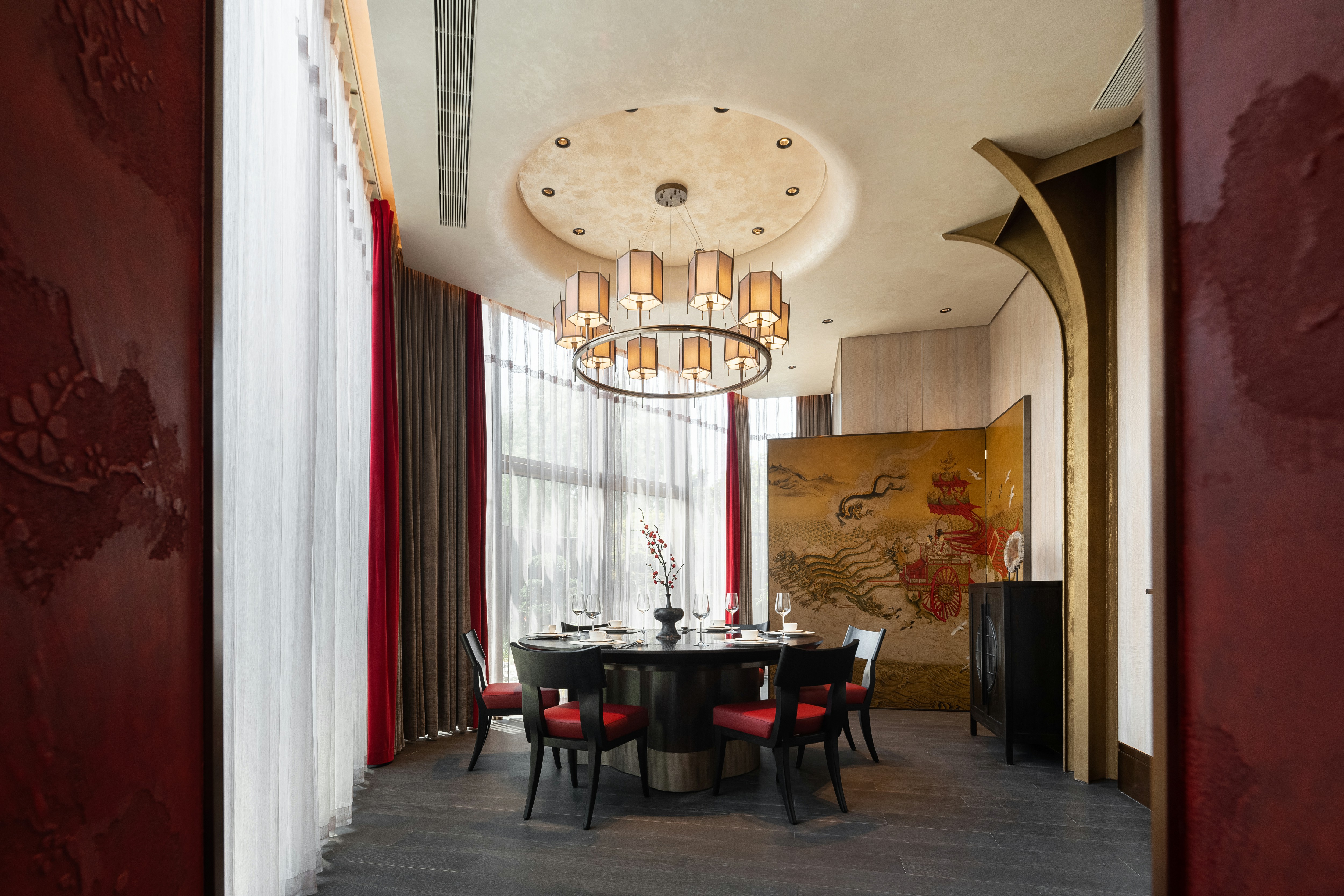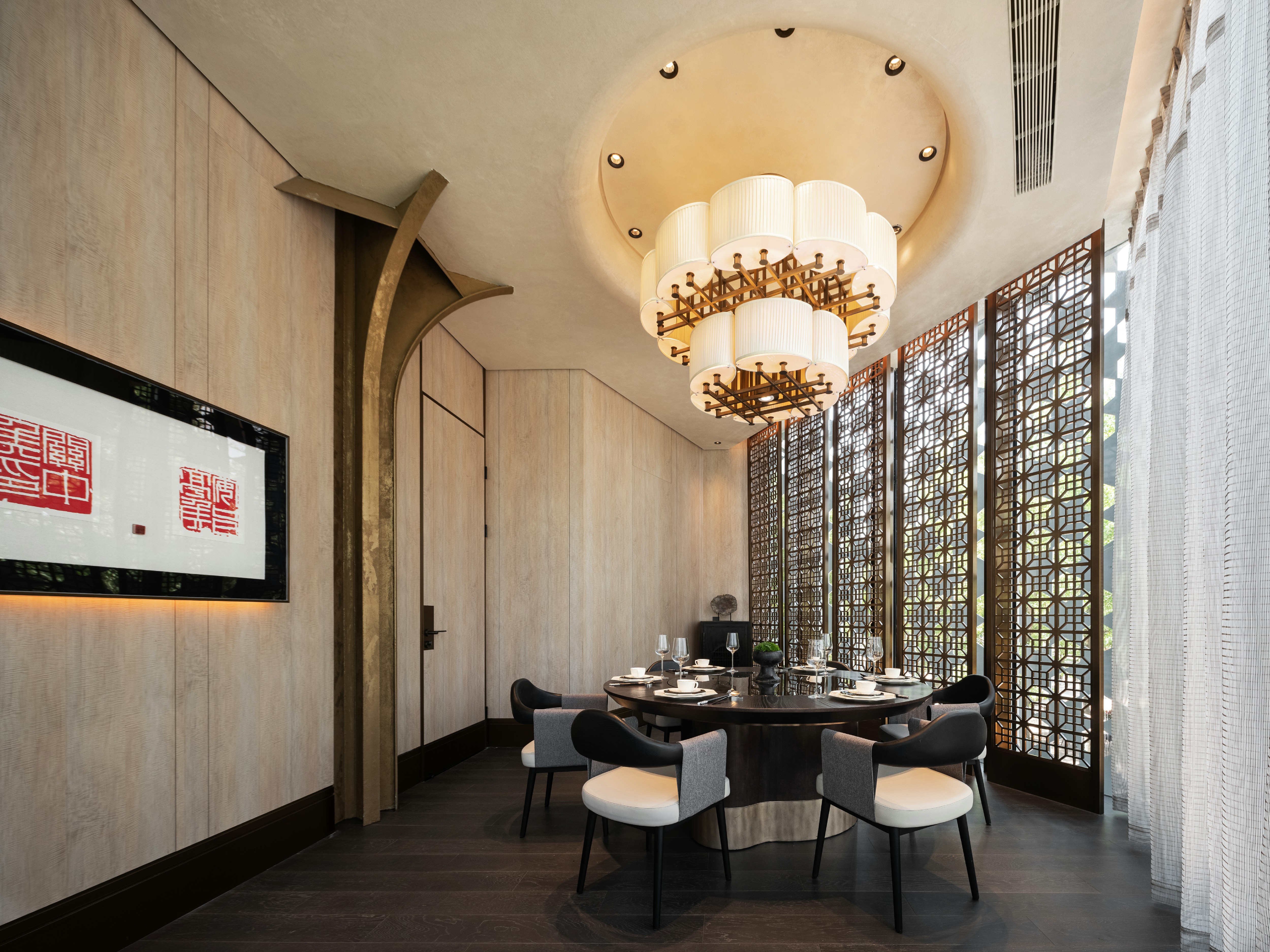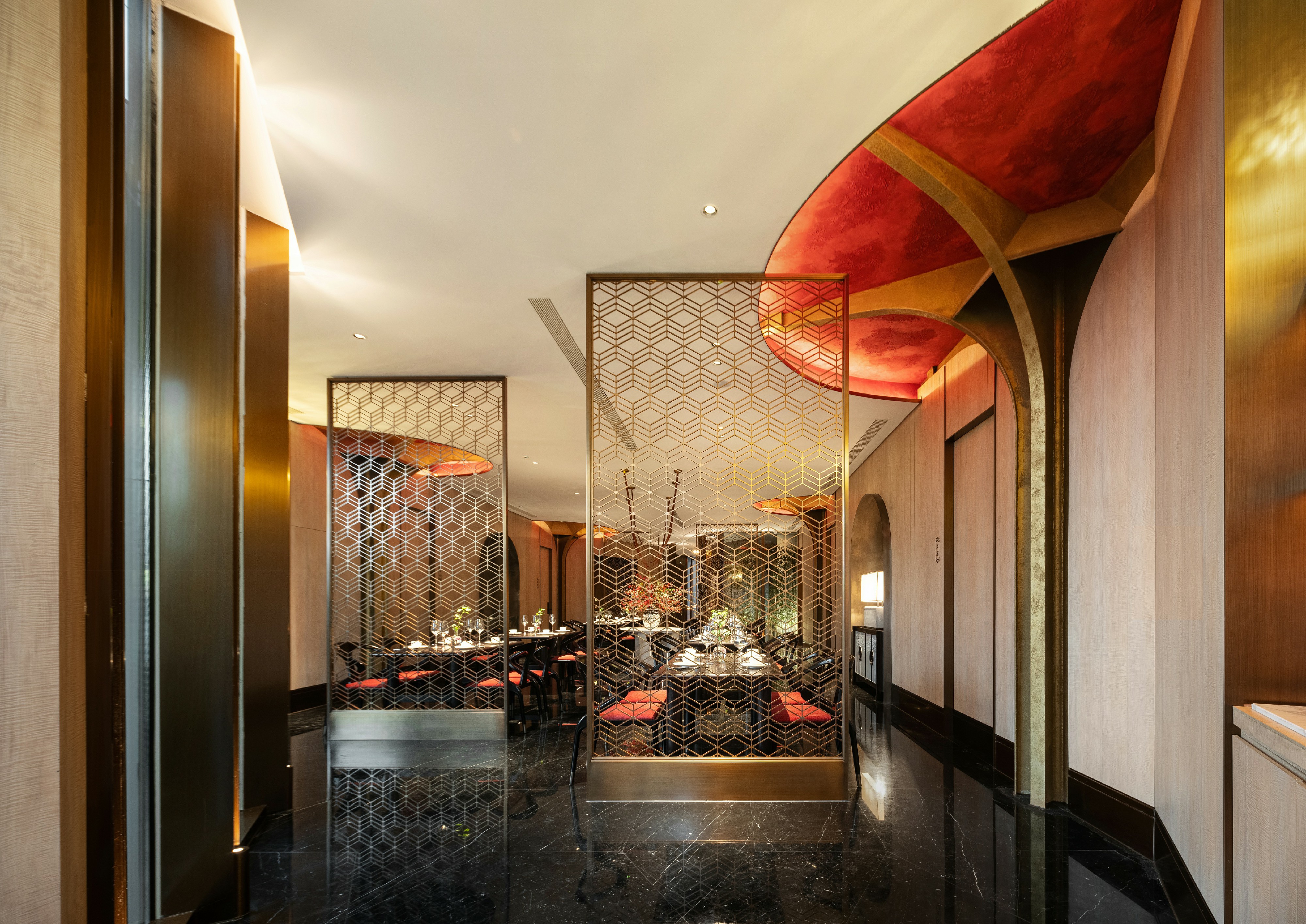 瓦当作为六朝重要的建筑构件,不复秦汉时期富丽堂皇,却仍是历史长河中不可或缺的一环。设计师选取瓦当作为该包厢主题,定格餐厅文化的地域性和时间性。一盏朱红折屏将两处包厢灵活分隔开来,应需而用,既可合二为一,也供独立使用。