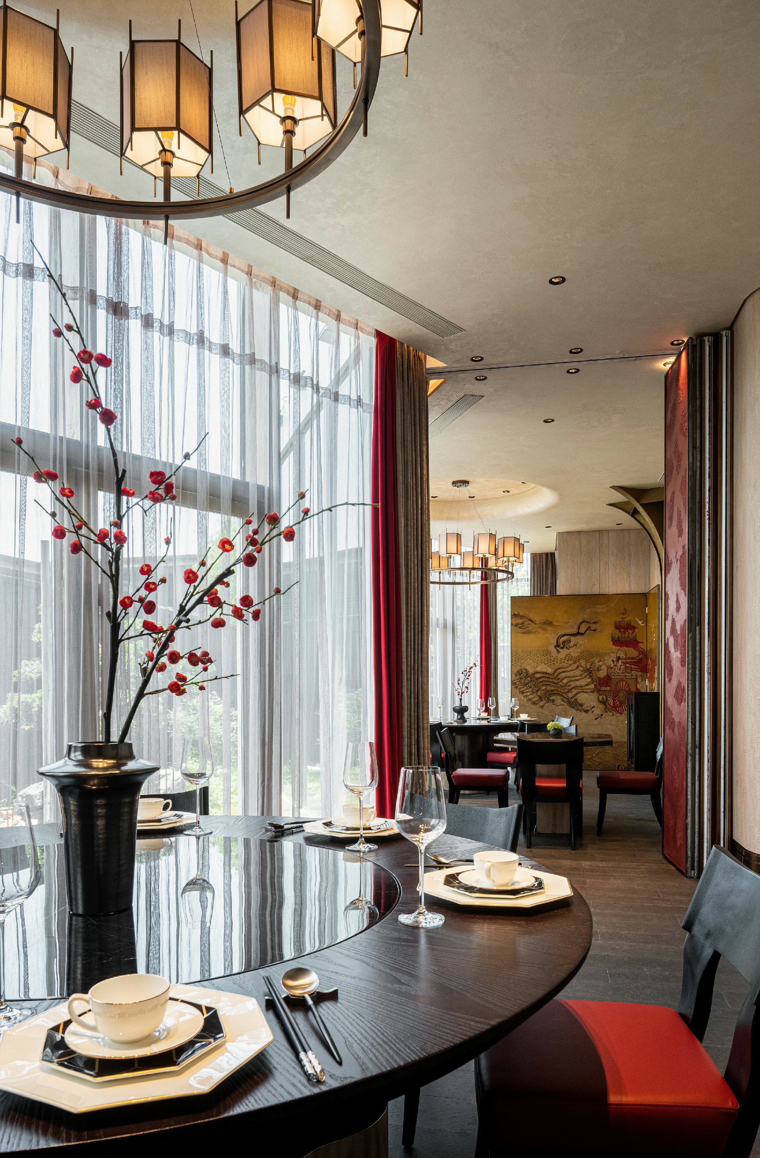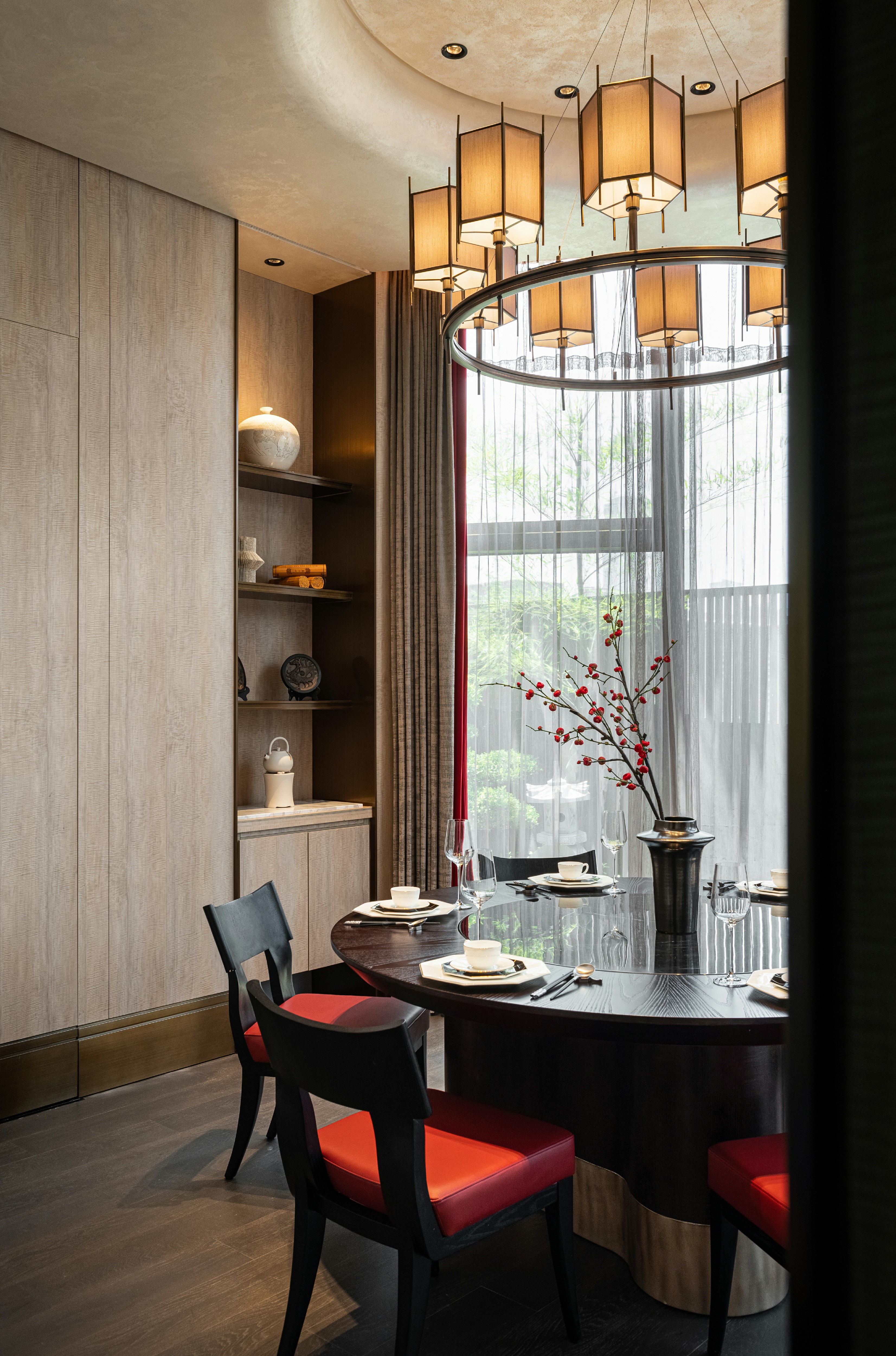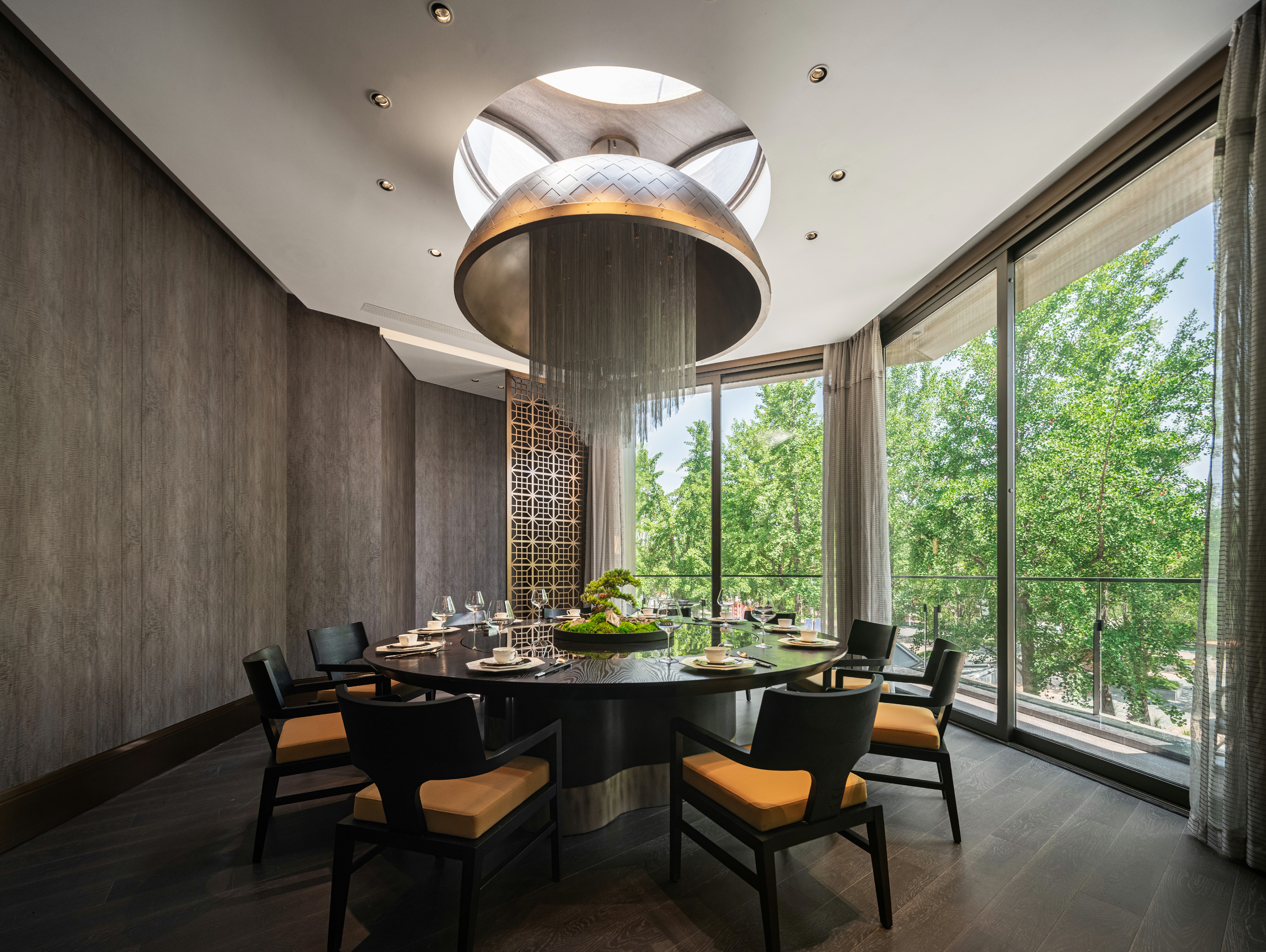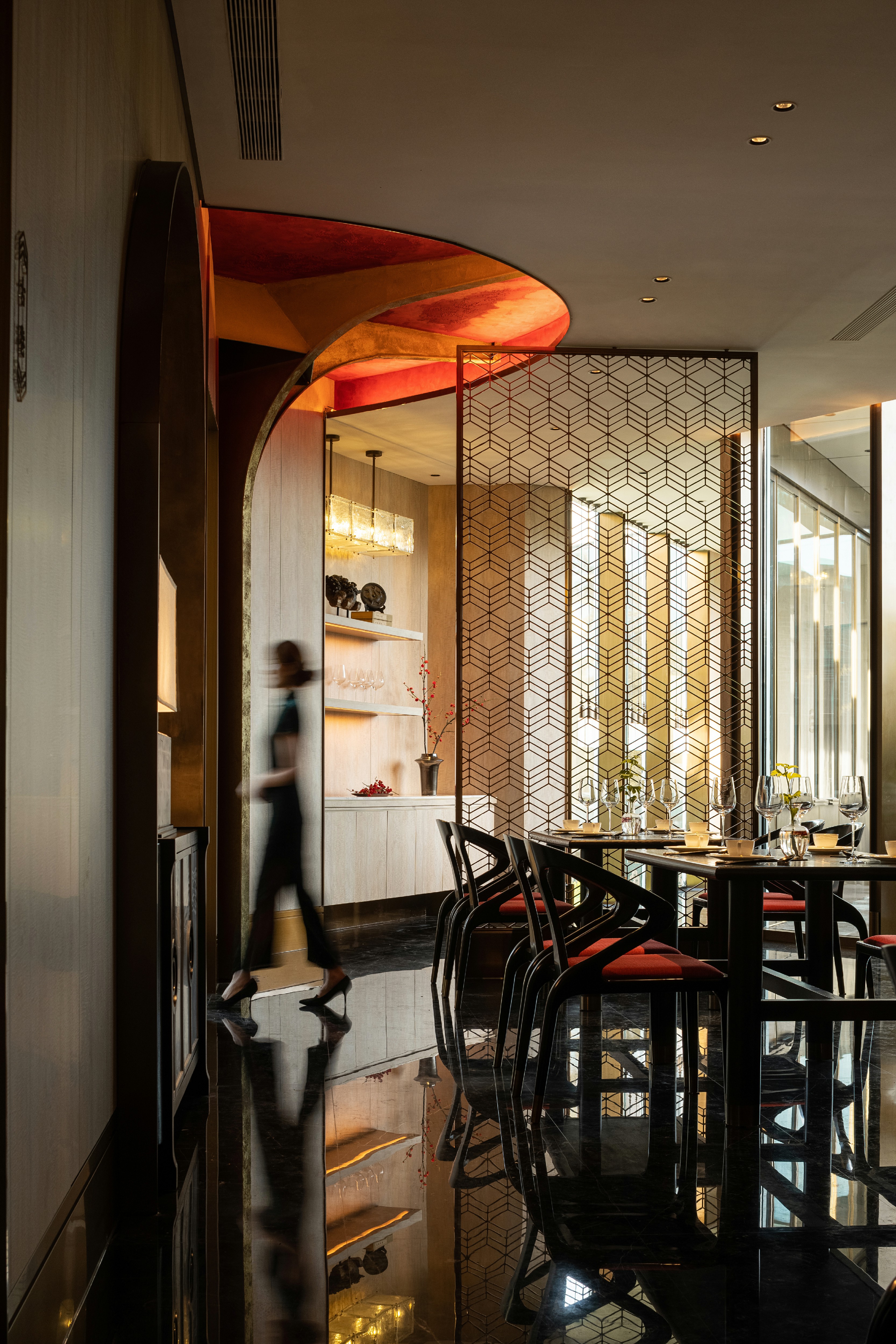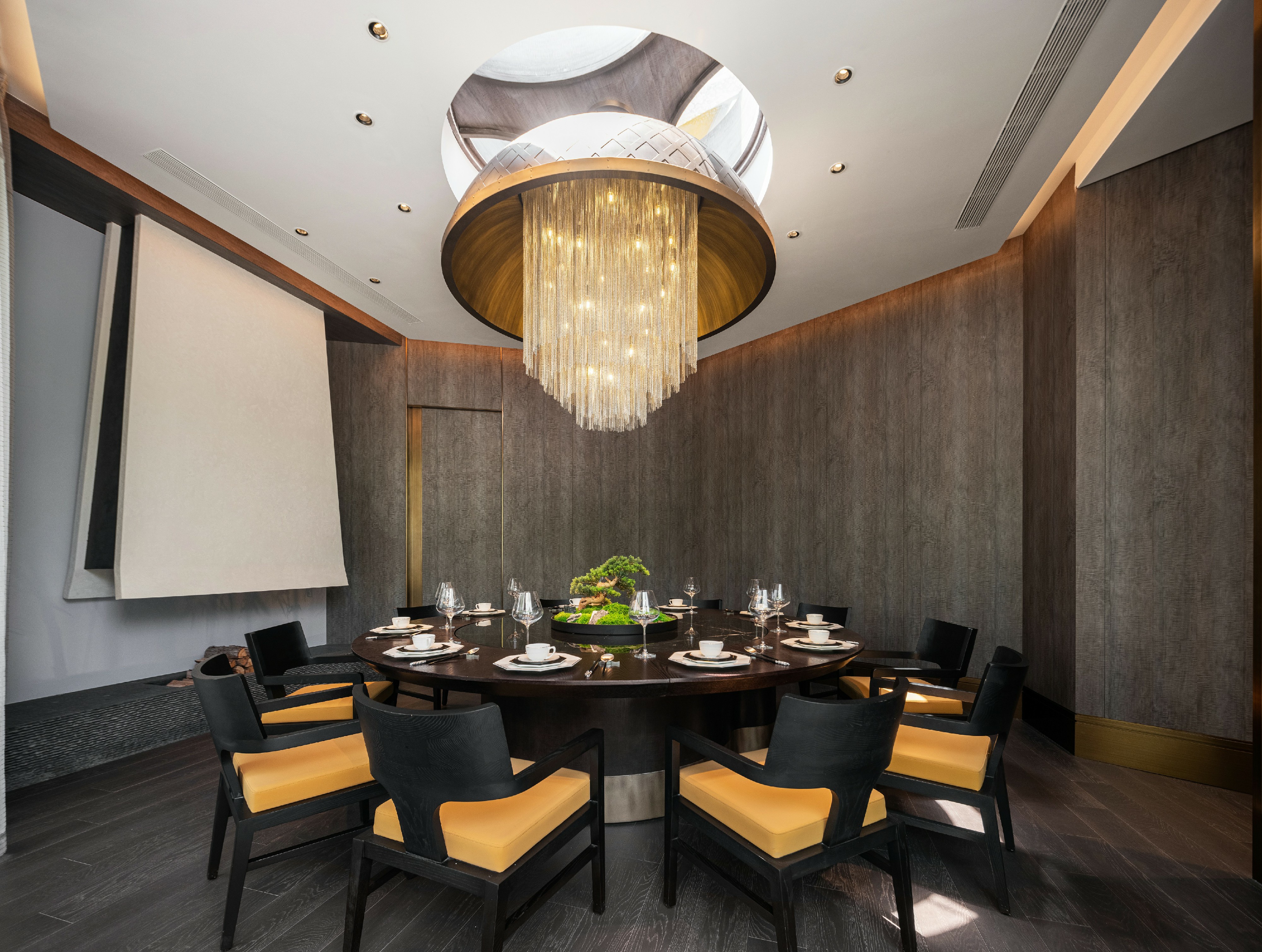 瓦当作为六朝重要的建筑构件,不复秦汉时期富丽堂皇,却仍是历史长河中不可或缺的一环。设计师选取瓦当作为该包厢主题,定格餐厅文化的地域性和时间性。一盏朱红折屏将两处包厢灵活分隔开来,应需而用,既可合二为一,也供独立使用。