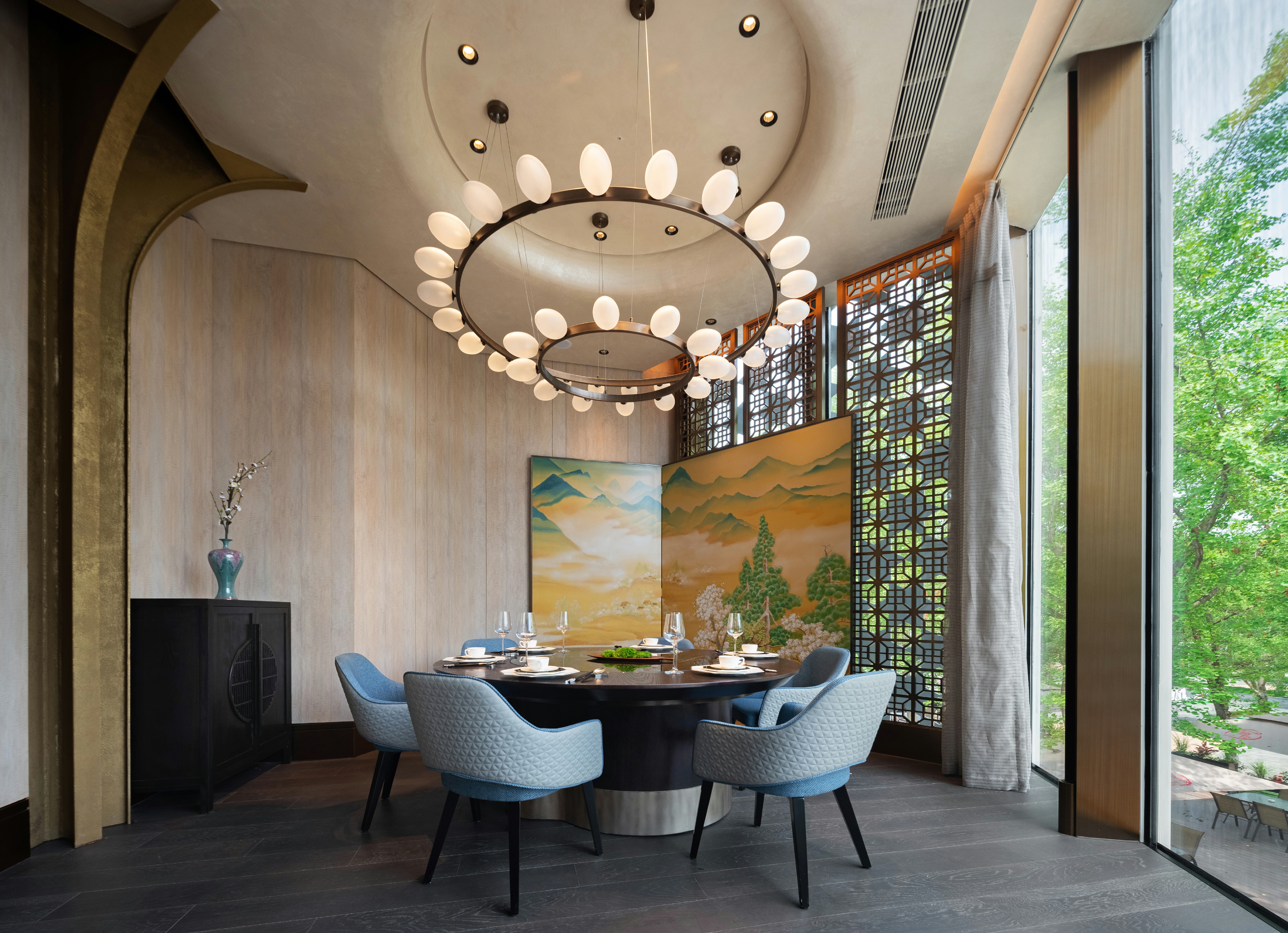 设计团队基于在地性思考,通过室内建筑的方式剖析空间、光影、材质、细节,融人文装置、艺术设想和场景体验于一体,围绕餐桌之上,展开一场关于六朝风物的浪漫叙事。 -