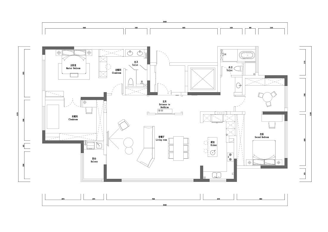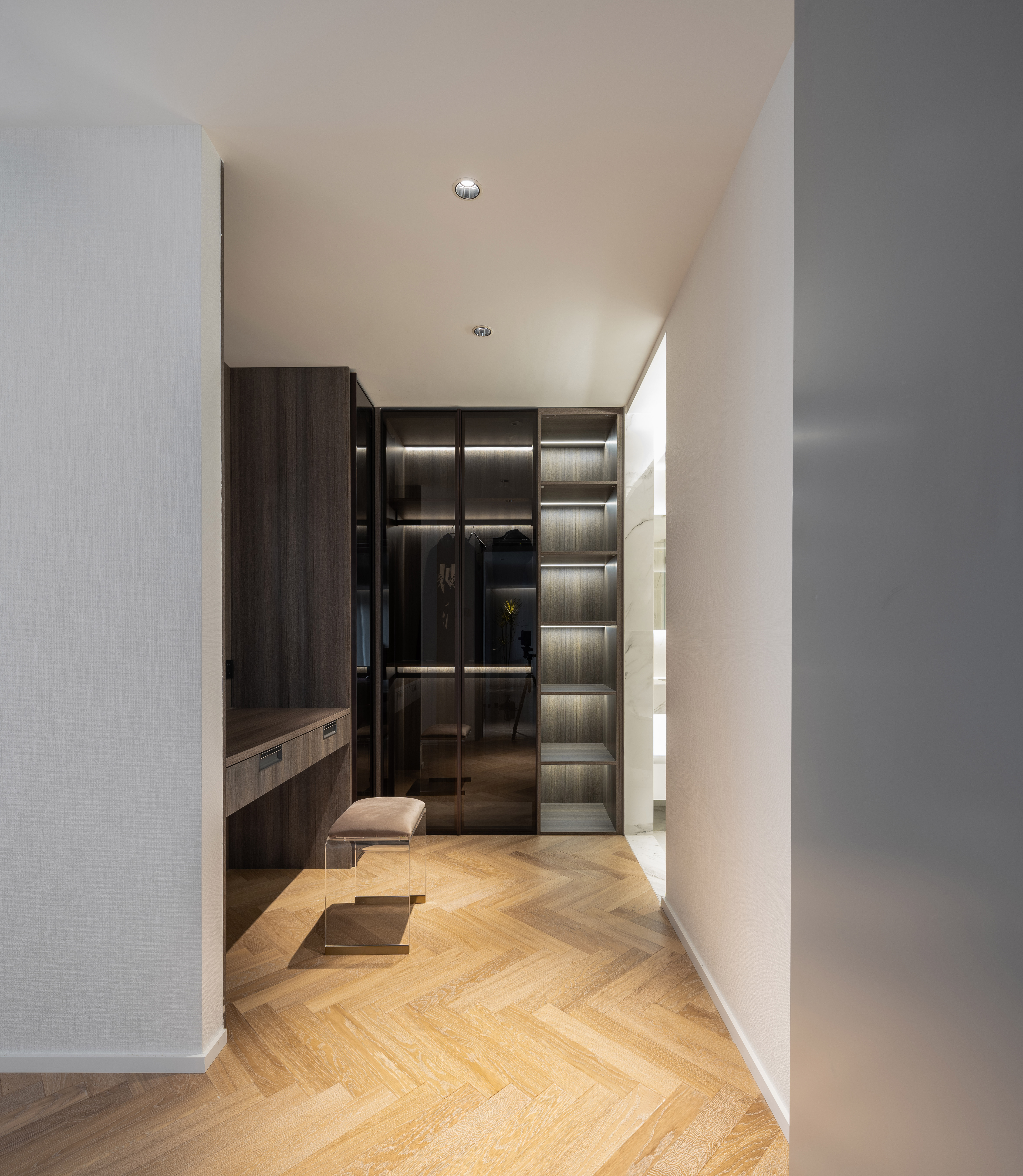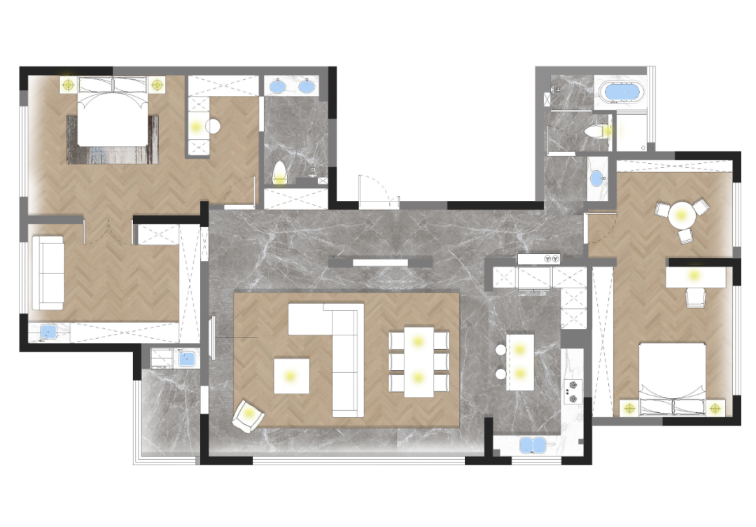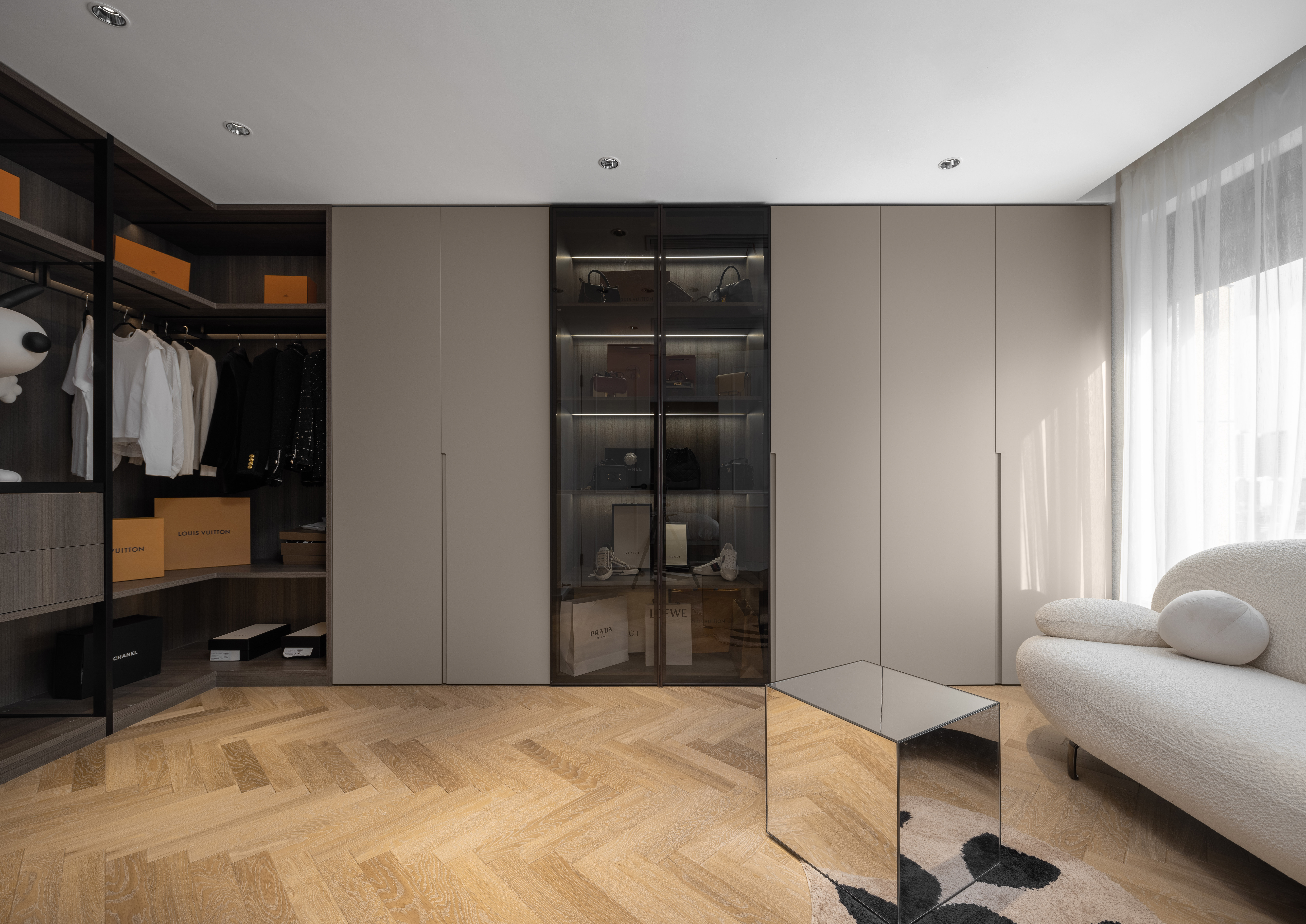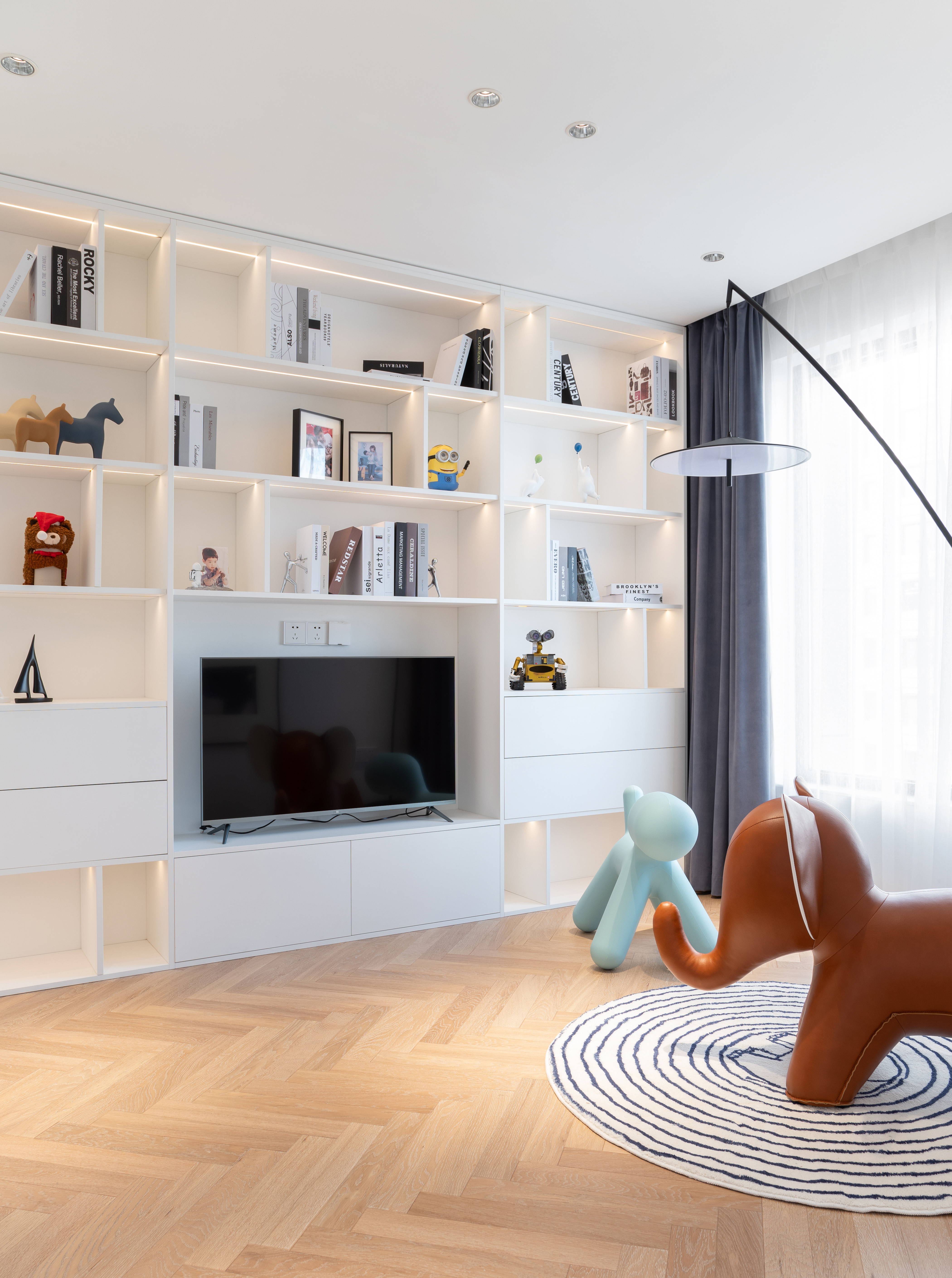 利用隔墙和长虹玻璃隔断,为缺失门厅的原始户型构建了一个全新的入户区域。同时,打通景观阳台,纳入共享空间,为更优的采光、视野和空间感加成。考虑到改造后局部梁过低的原始问题,以弧形巧妙优化顶面。局部人字拼花地板围合客餐厅地面,极具当代气息的Natuzzi真皮沙发、coconodic微笑椅和BoConcept带补充桌面的餐桌坐镇空间,辅之以潮流灯饰、色彩器物,让个人审美呼之欲出。咖色大砖连接起秉性各异却又一脉相承的不同空间。开放式的阔绰厨房和岛台让烹饪、烘焙等厨房之事成为一件家人们都愿意参与的活动,饭香、菜香无形却有影,一家人为香而忙、闻香而聚,不亦乐乎。将闲适最大程度赋予生活。将原始的四个卧室改造成两个大的套间,这也是主家前期和我们沟通过想要呈现的效果。我们为喜欢购物的女主人和男主人各自配备了步入式衣帽间和独立衣帽间,主卧背景以胡桃木色饰面与白色波浪装饰板相结合,质朴又温柔。卧室角落处是女主人最新拔草的Samsung The Serif,是电视更是艺术品,堪称绝美。卫浴空间是卧室、书房的延伸, 是释放生活压力的快乐天堂。分离式卫浴充满酒店式风情。无缝设计的一体式台盆,简约大气,搭配整整一面的超大浴室镜,可以满足男女主人同时段的洗漱需求。双开门的设计让推门步入的动作变得十分有仪式感,门后亦藏着另一个世界。走颜值路线的杂志架、触感舒适的羊羔毛沙发,这里不仅是女主人变美丽的私密后台,更是慵懒午后的居心地。儿子房套间,采用孩子最喜欢的蓝白配色。BoConcept LUGANO简约的外观与利落的木制框架让这款现代床为卧室带来平和宁静之感。舒适的床头面料,是妈妈的安心之选。最令人羡慕的当属套间里的活动区了,语言能力极强的小主人可以在这里热情招待他的好朋友们。定制型的书柜,容量巨大,让更多的绘本和玩具被妥善安置。充满野趣的钓鱼灯下,小主人呼朋唤友,或围桌或席地,一定是最快乐的时光。