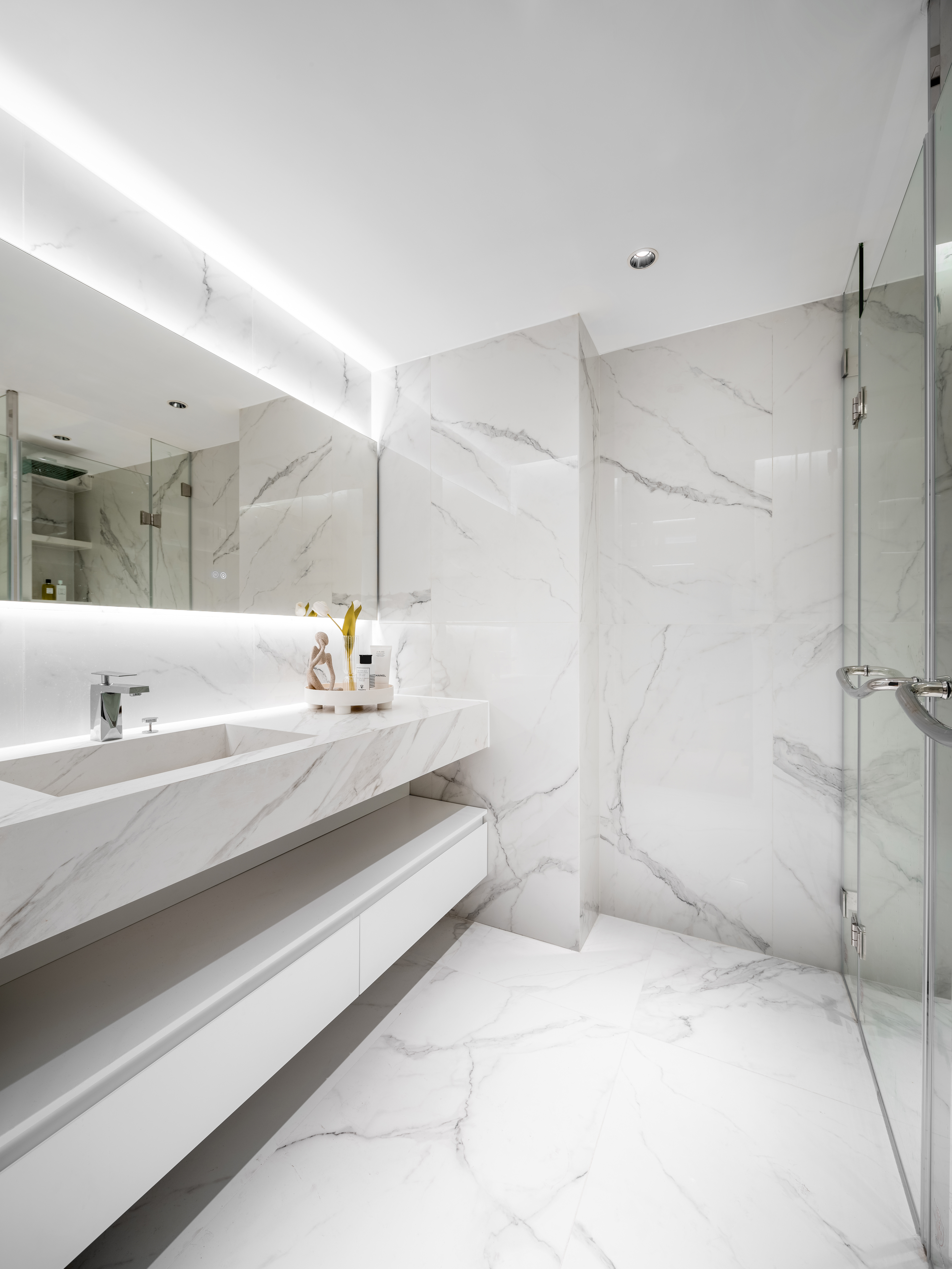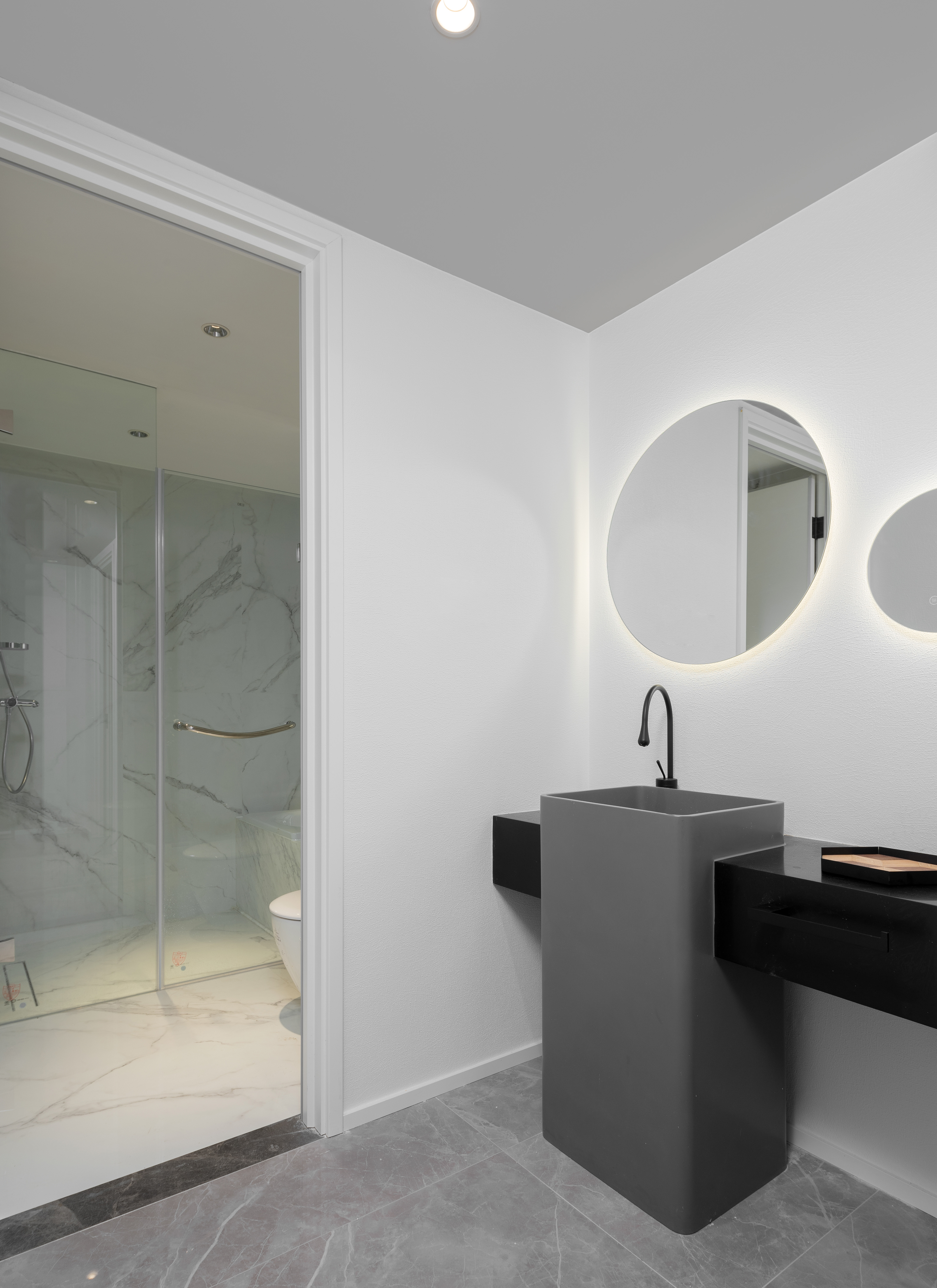 空间布局:利用隔墙和长虹玻璃隔断,为缺失门厅的原始户型构建了一个全新的入户区域。同时,打通景观阳台,纳入共享空间,为更优的采光、视野和空间感加成。考虑到改造后局部梁过低的原始问题,以弧形巧妙优化顶面。卫浴空间是卧室、书房的延伸, 是释放生活压力的快乐天堂。分离式卫浴充满酒店式风情。