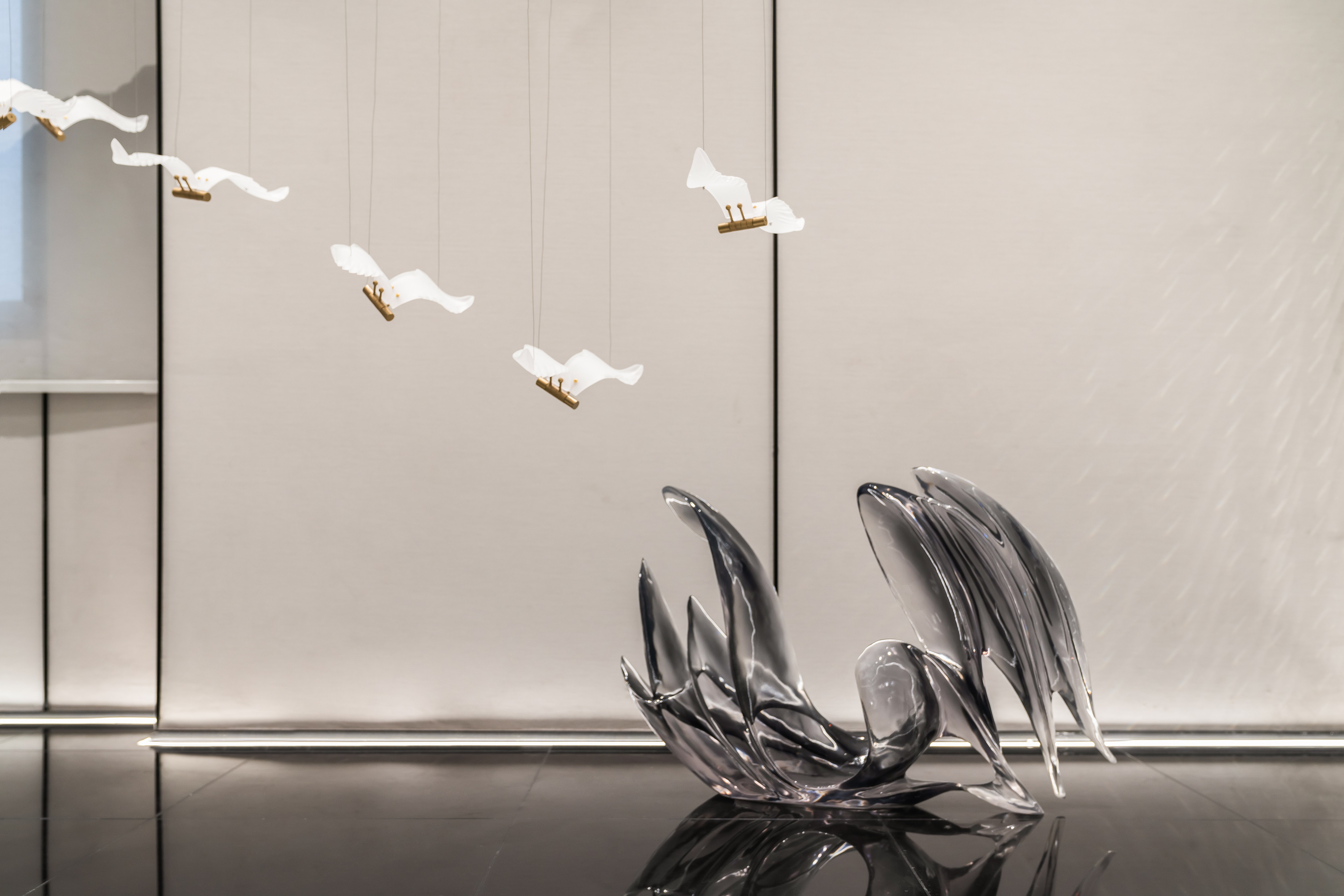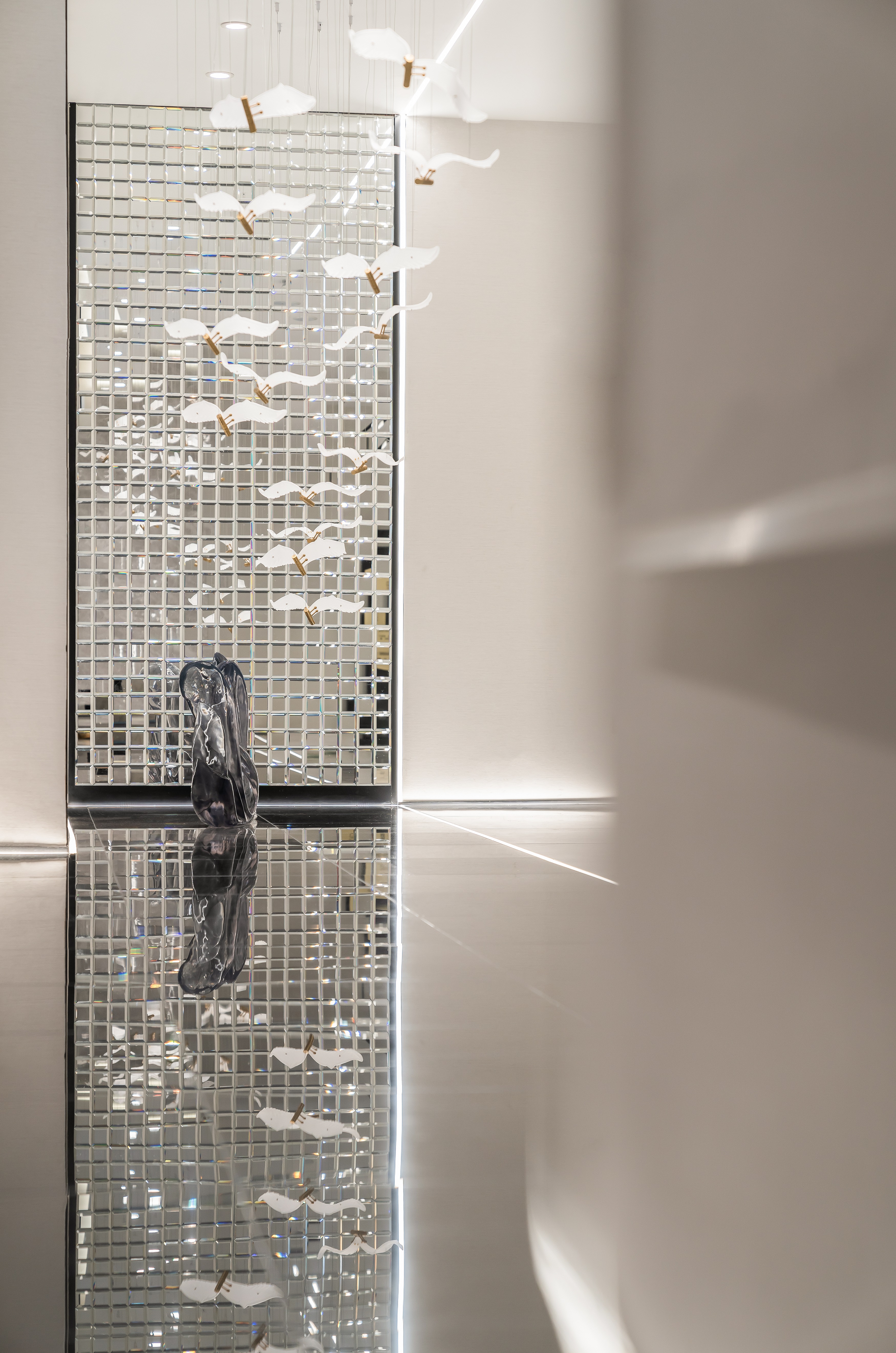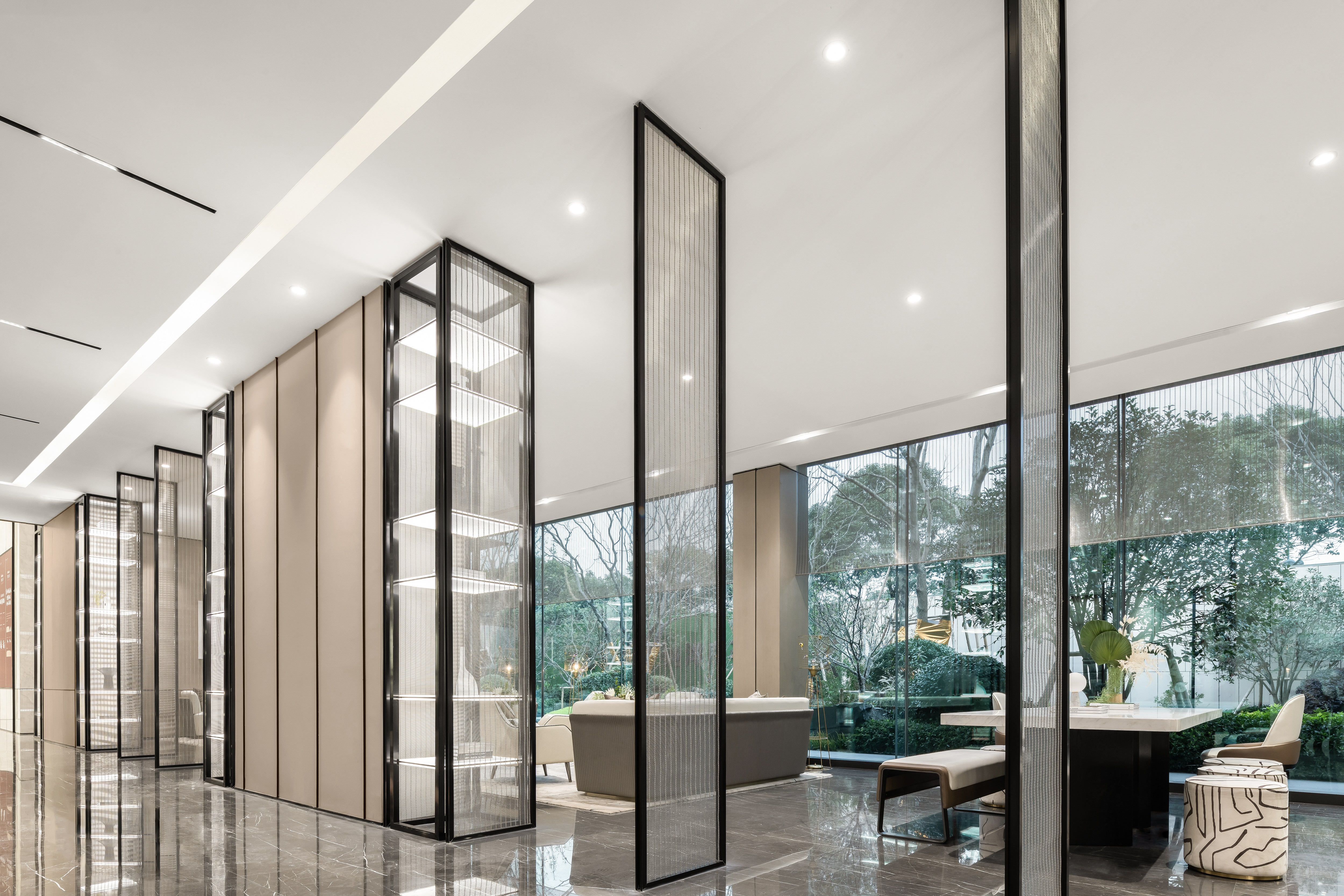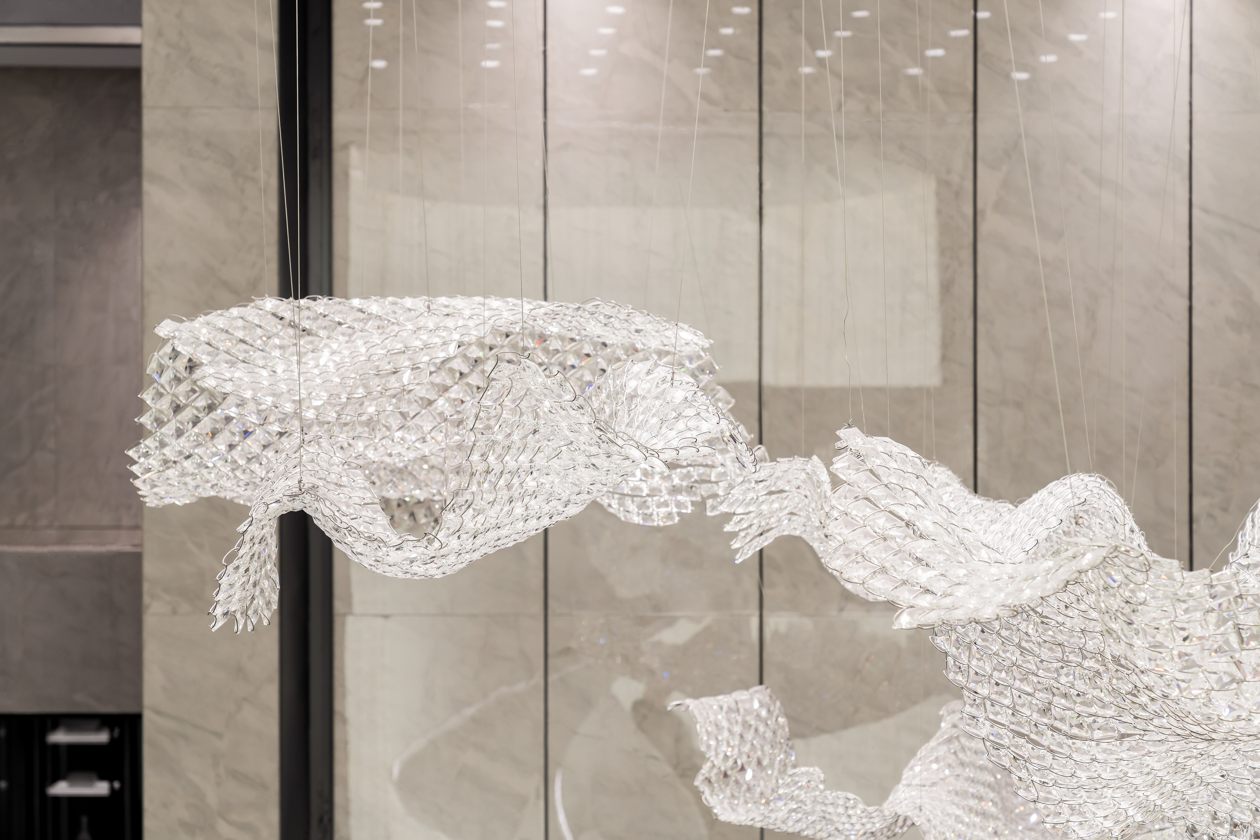 灵动的水波纹形式,玻璃的透明质感,光影的照射下犹如湖面掀起的涟漪, 在阳光下波光粼粼。