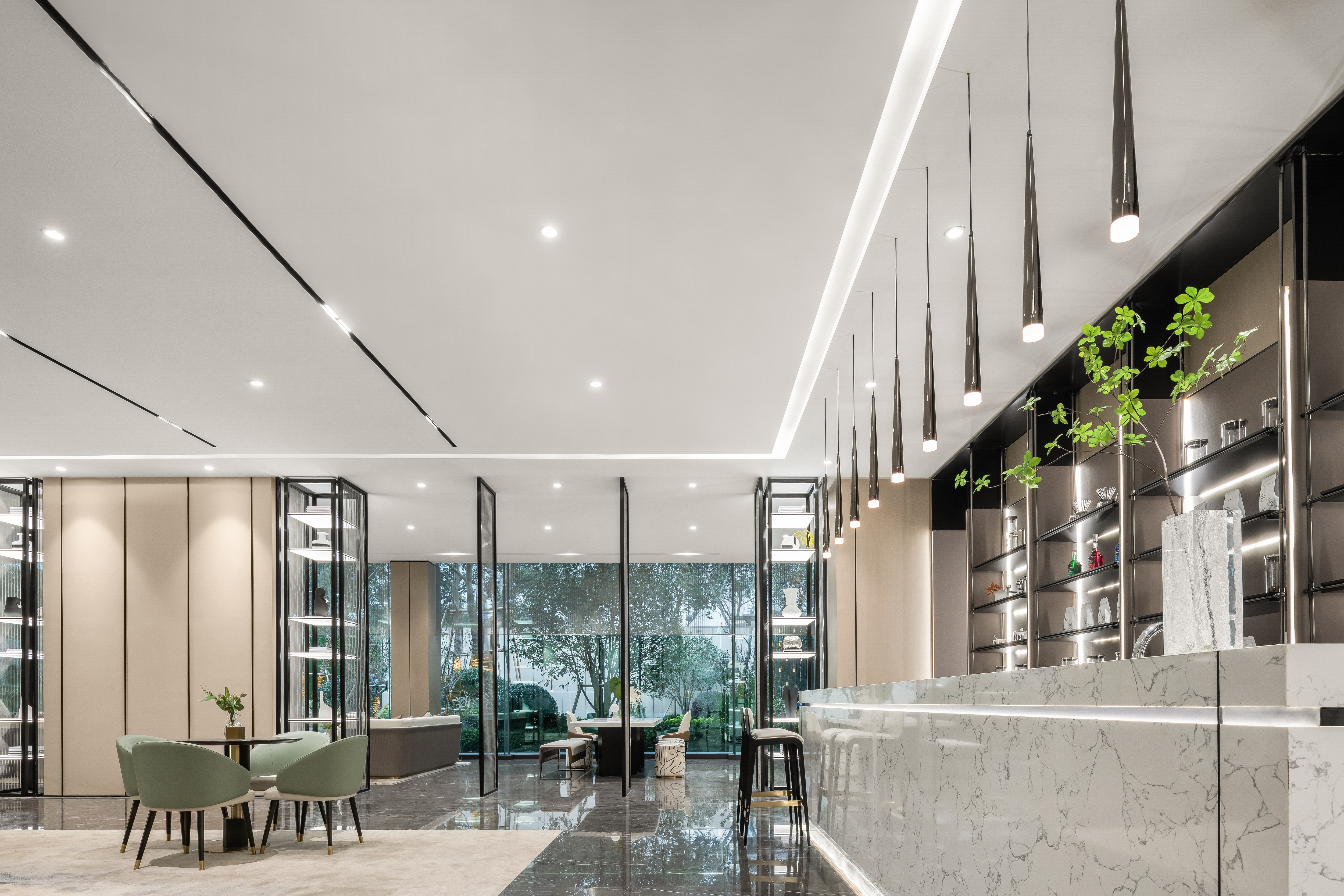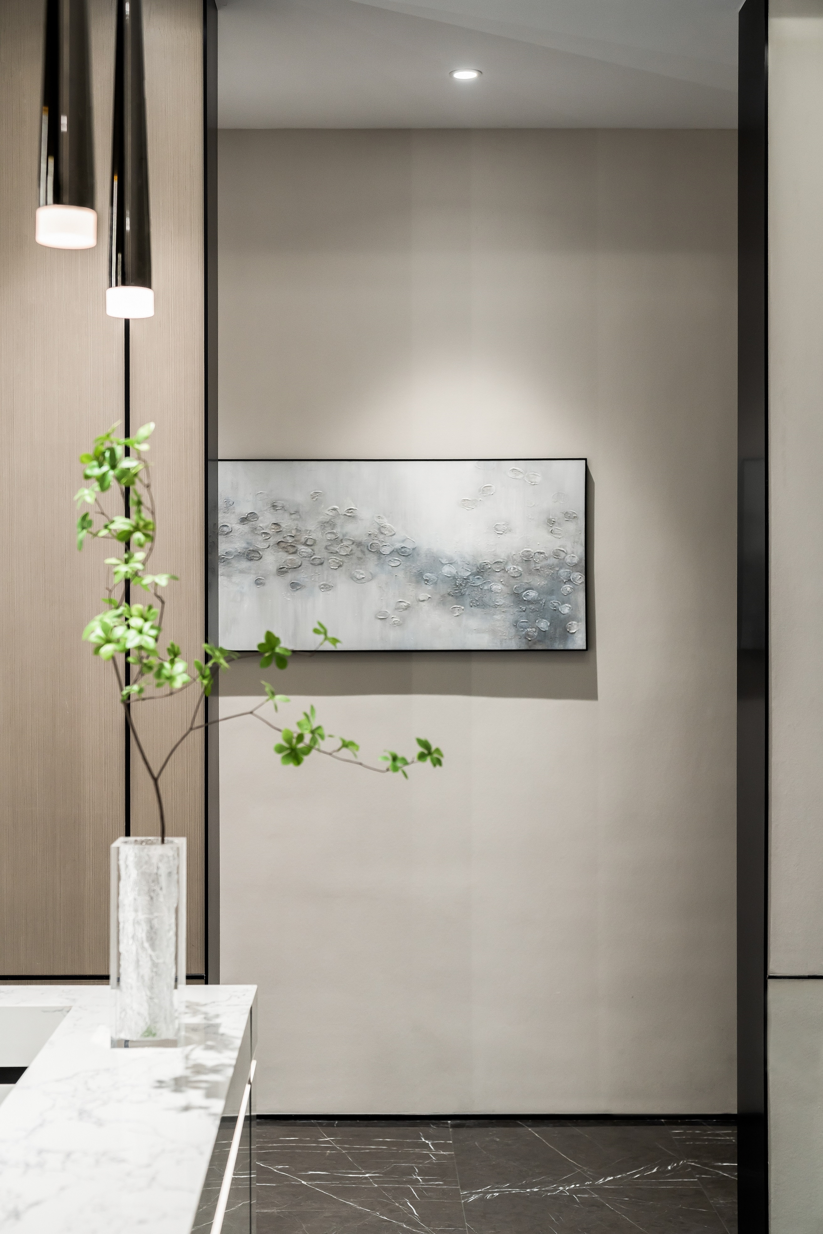 金属表面的制画,与玻璃制灯饰搭配,并用水墨画晕染的手法进行表现,恰如平静的湖面上荡起的一丝涟漪,增强空间书卷气息及雅致氛围。