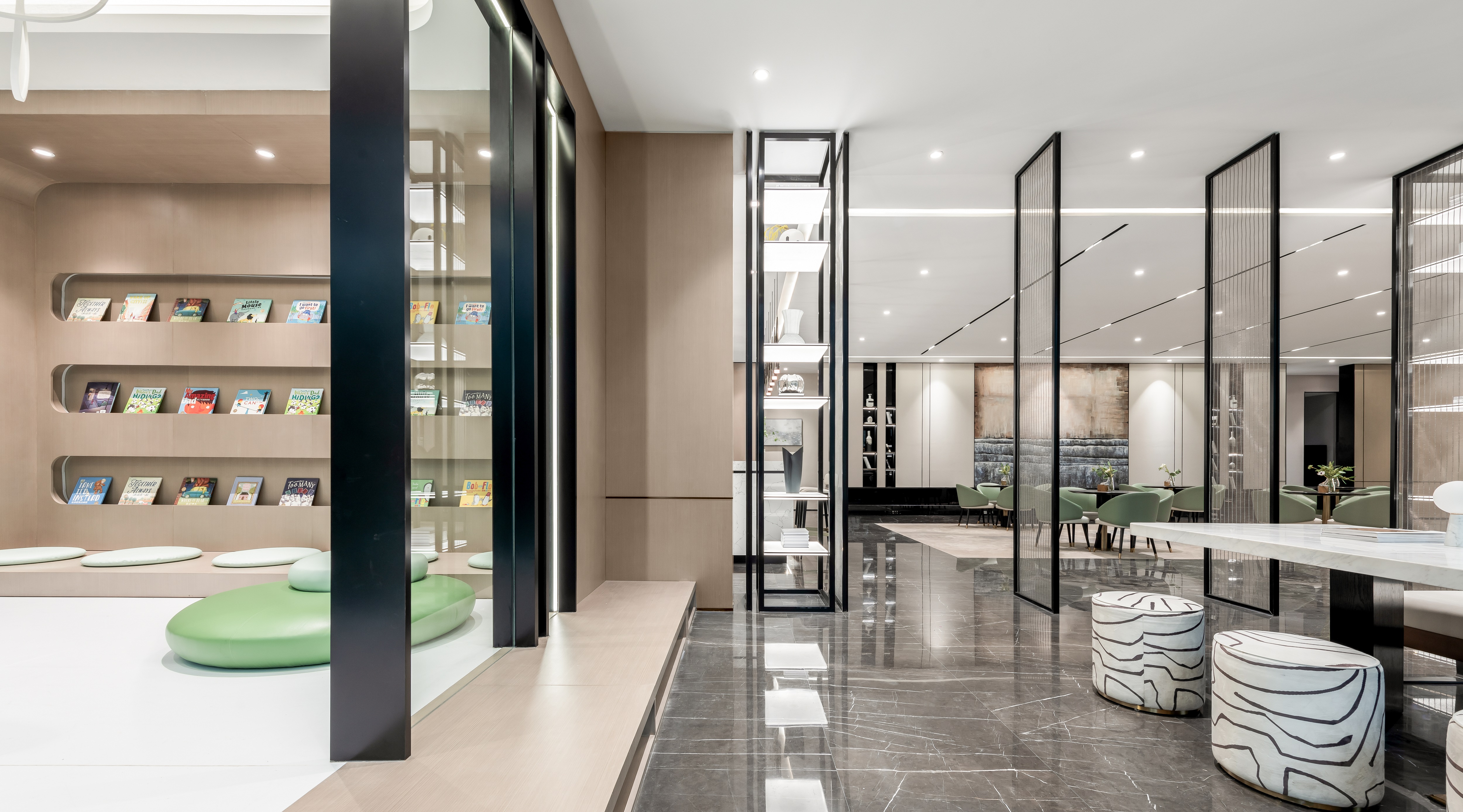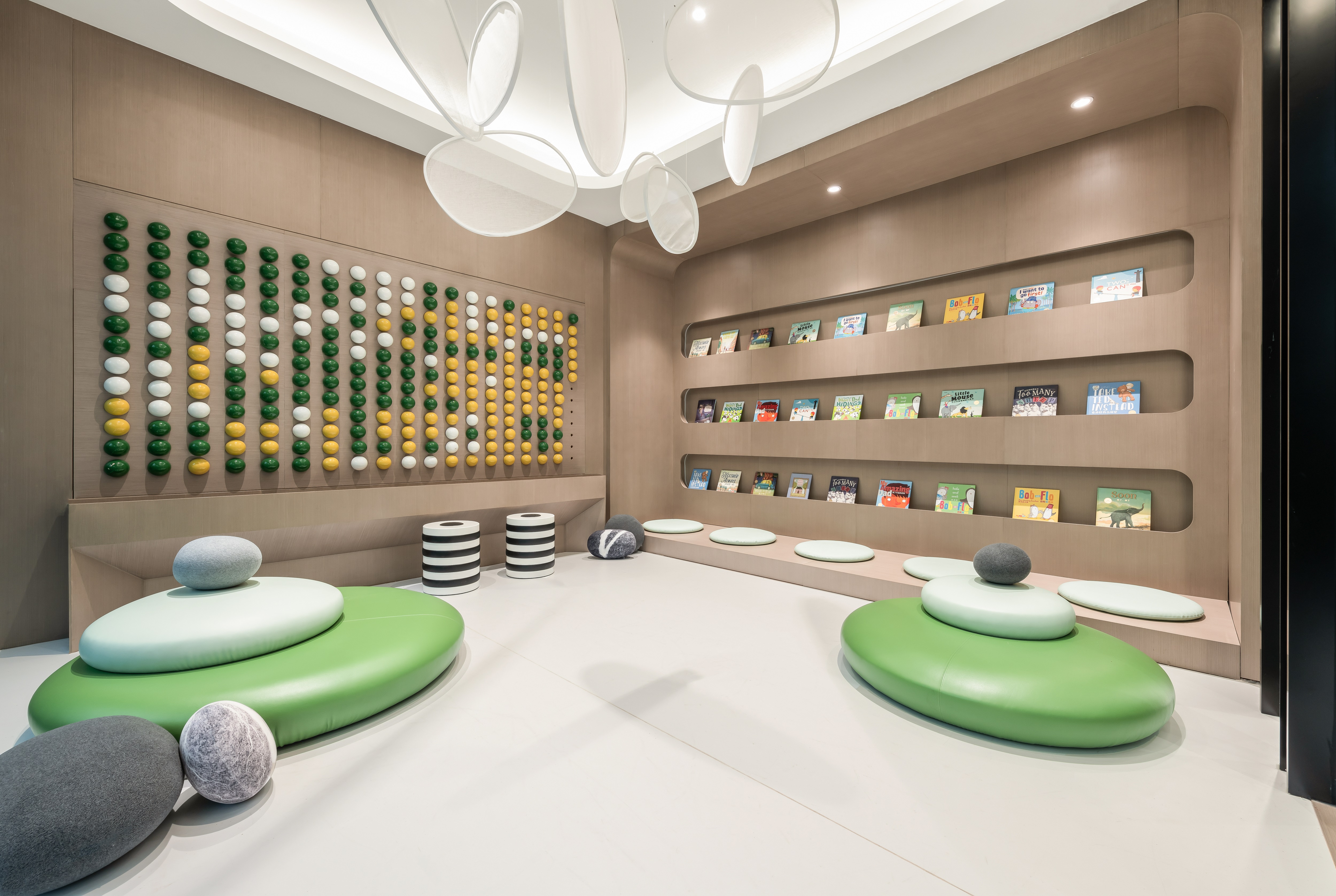 绿色的椭圆形皮质沙发满足了孩子们喜欢席地而坐的天性,整面的书籍为儿童区增添了几分诗书气息。
