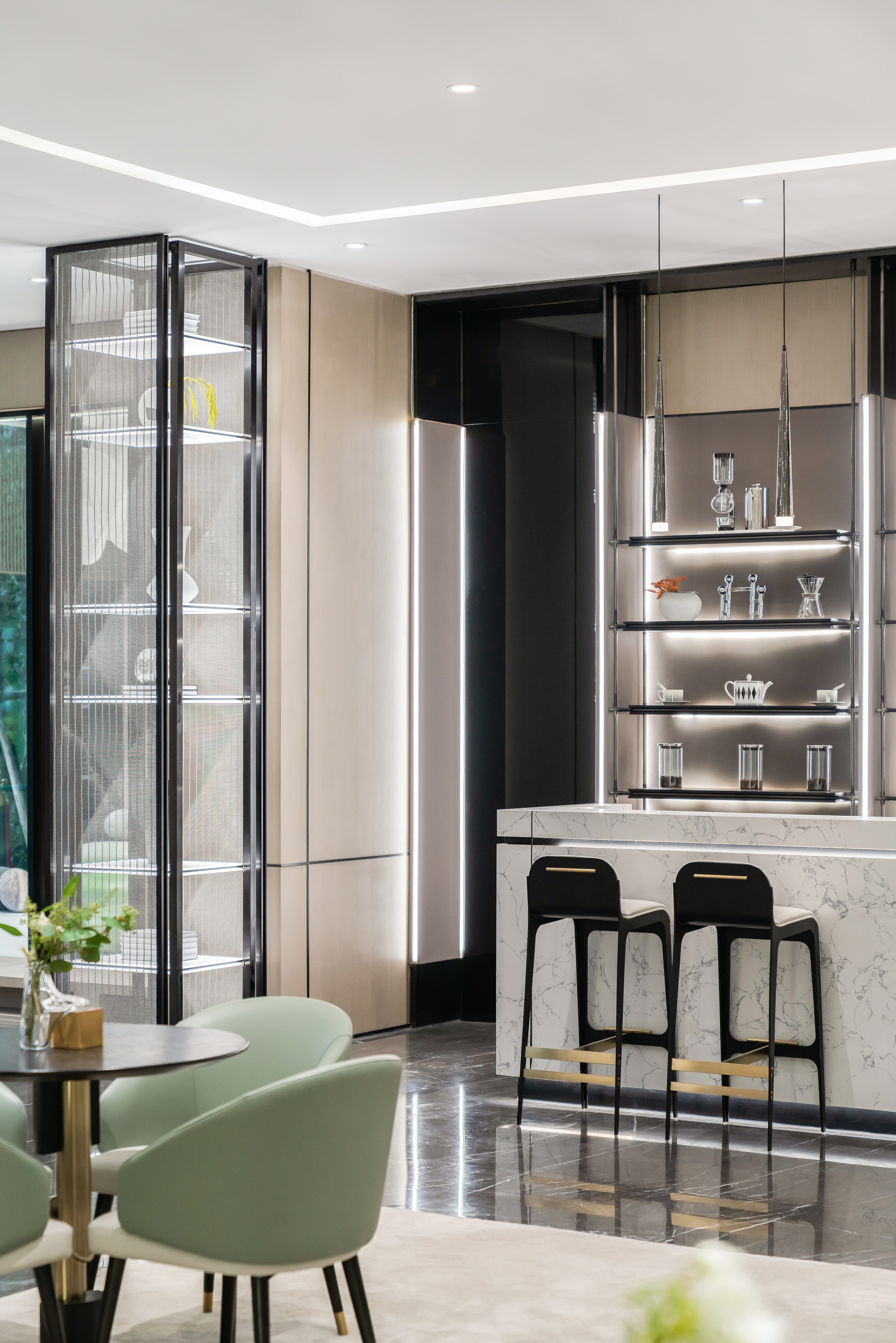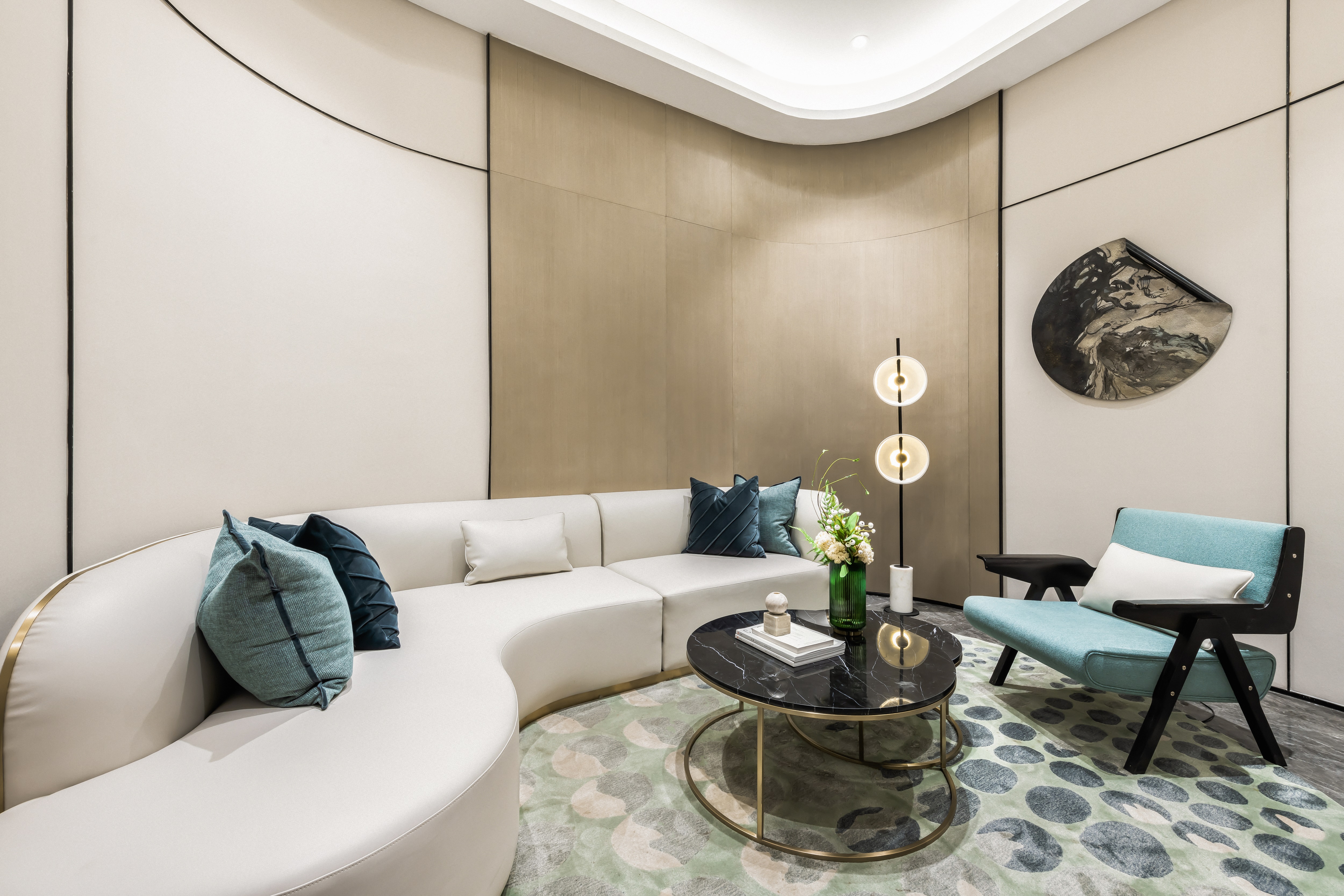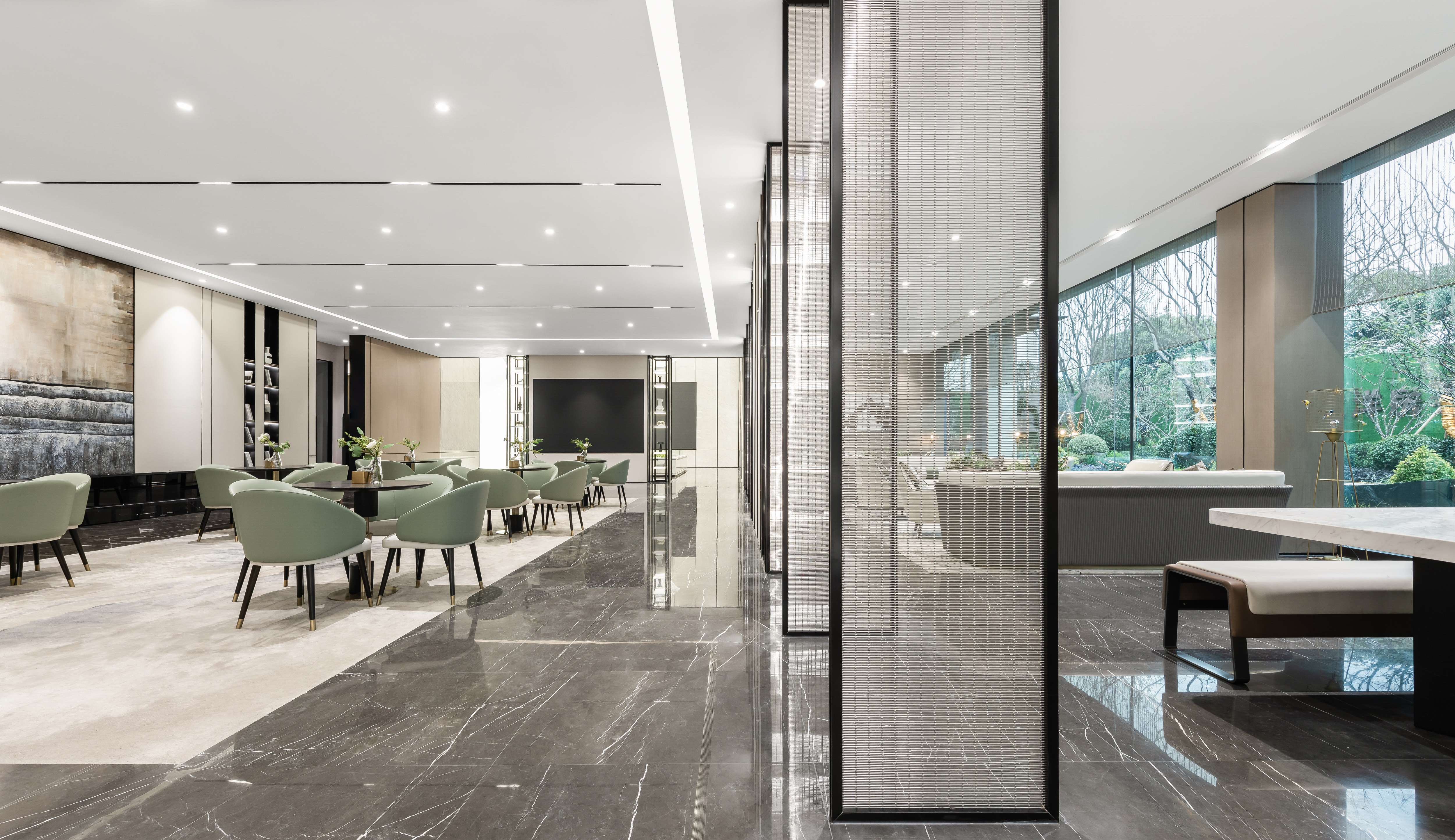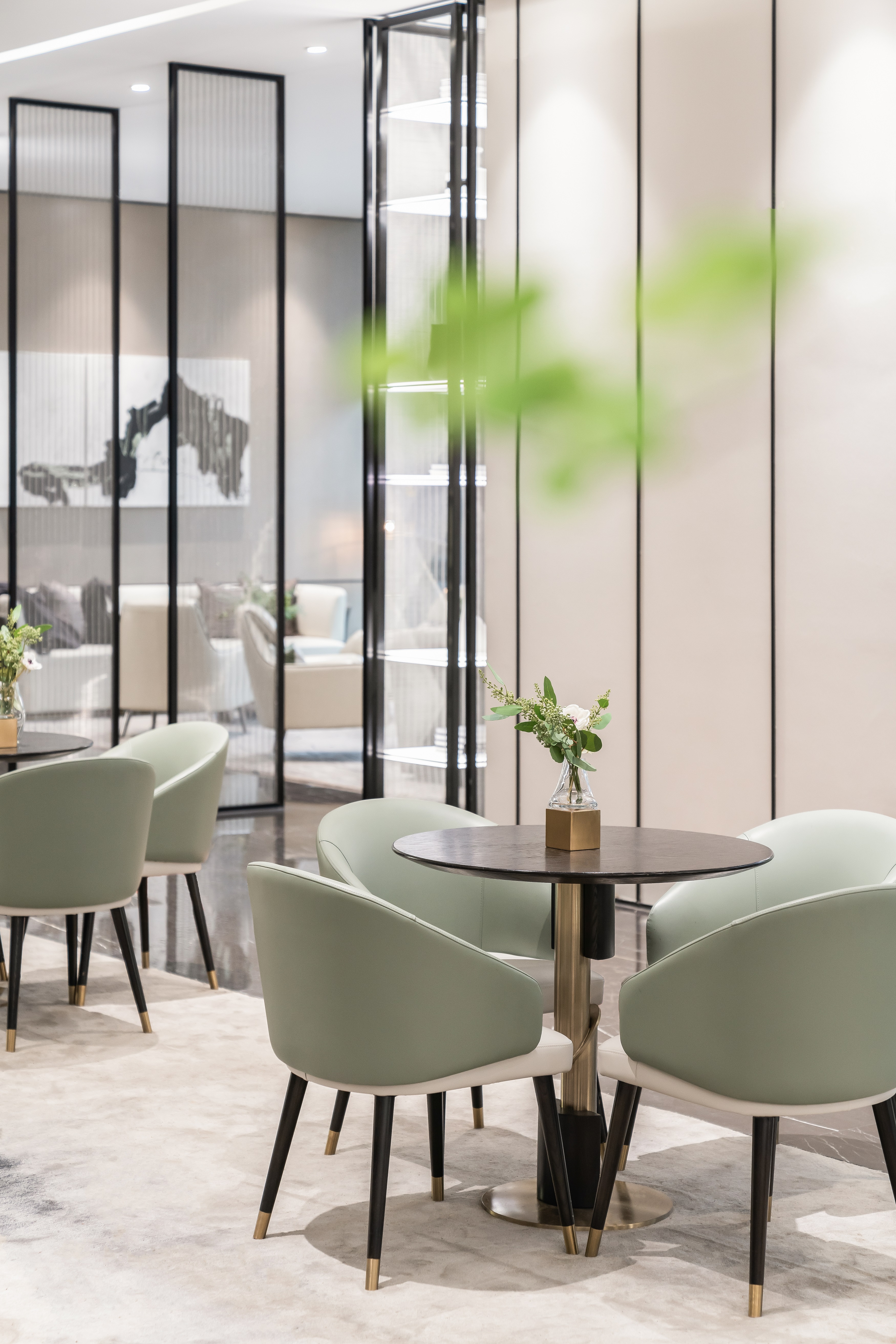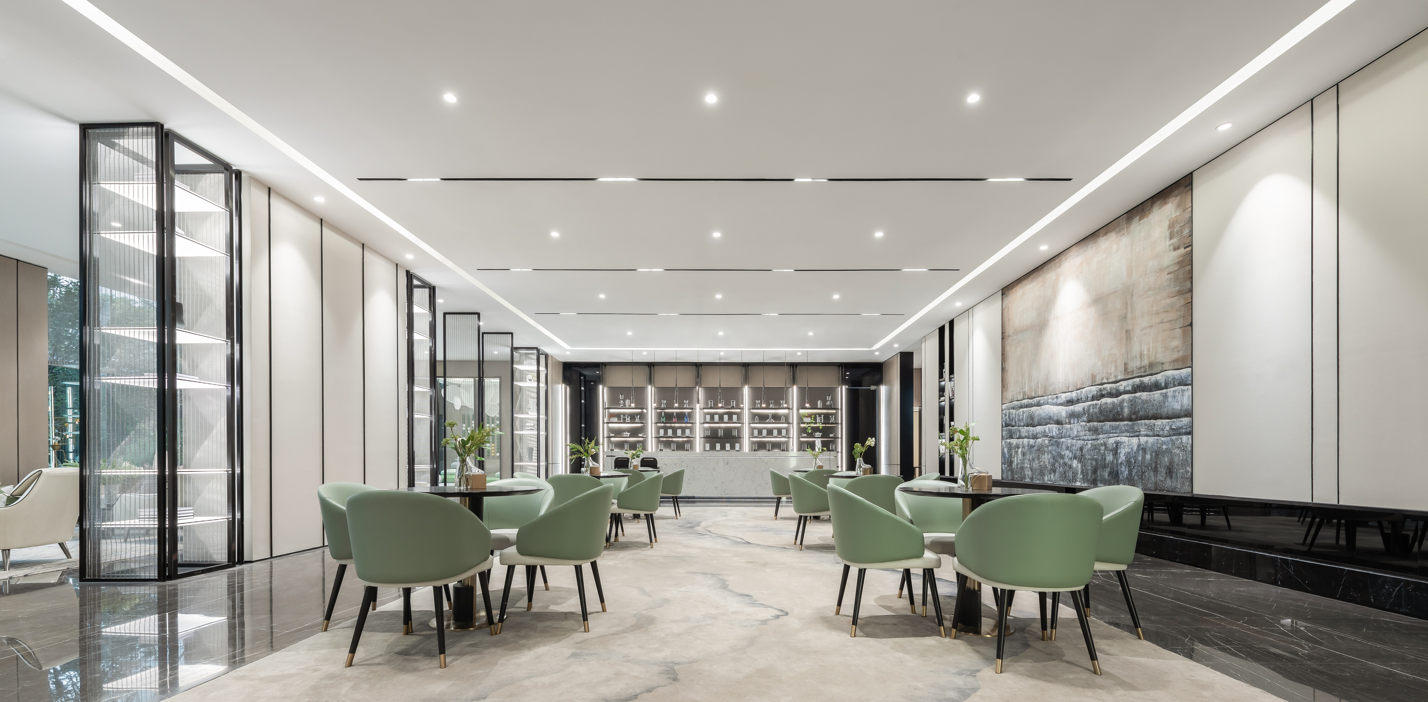 结合整体空间黑白灰的色调,以大地色系为基调,蓝绿色为点缀色,表达空间“淡语皆有味”的意境之美。